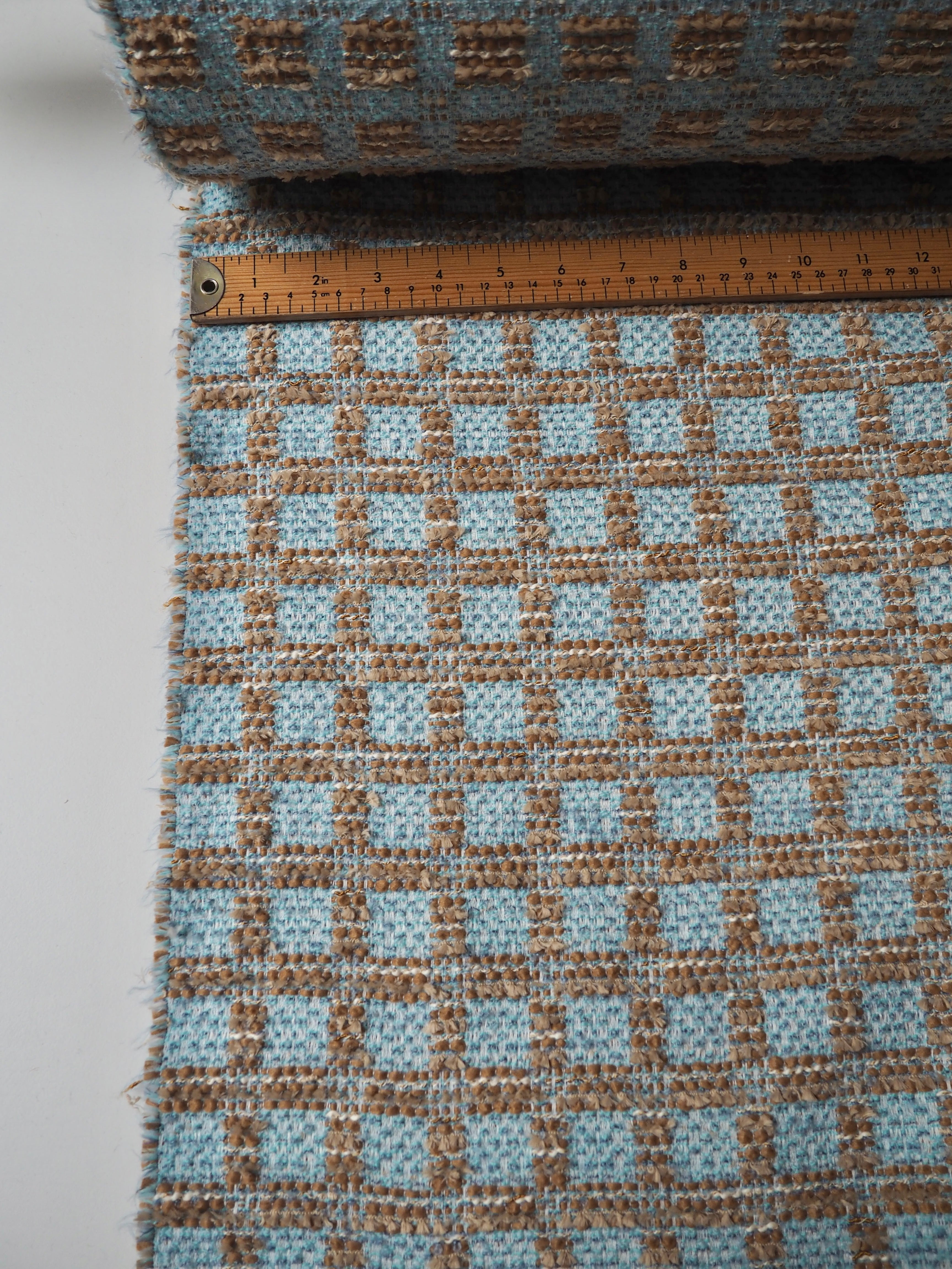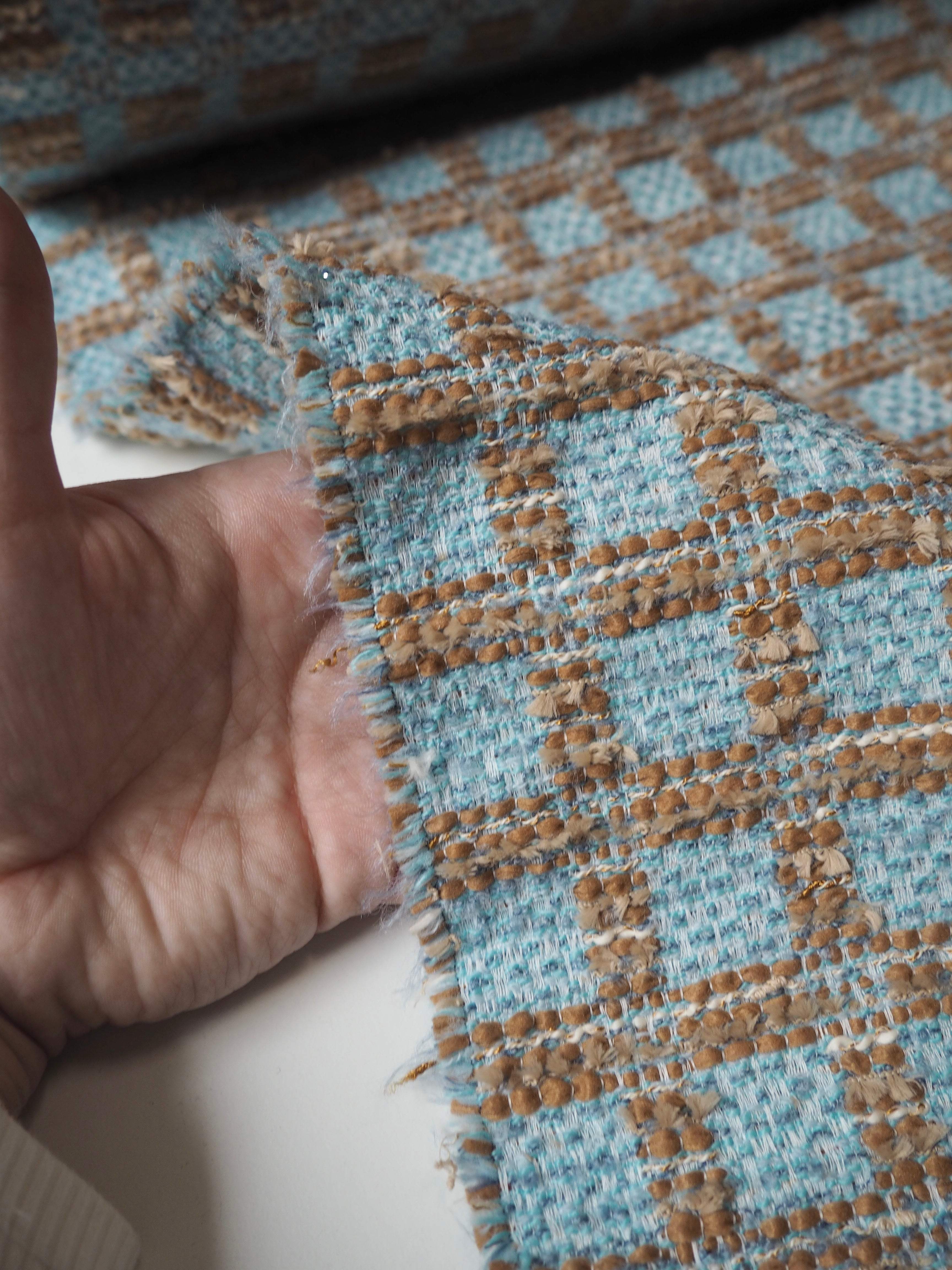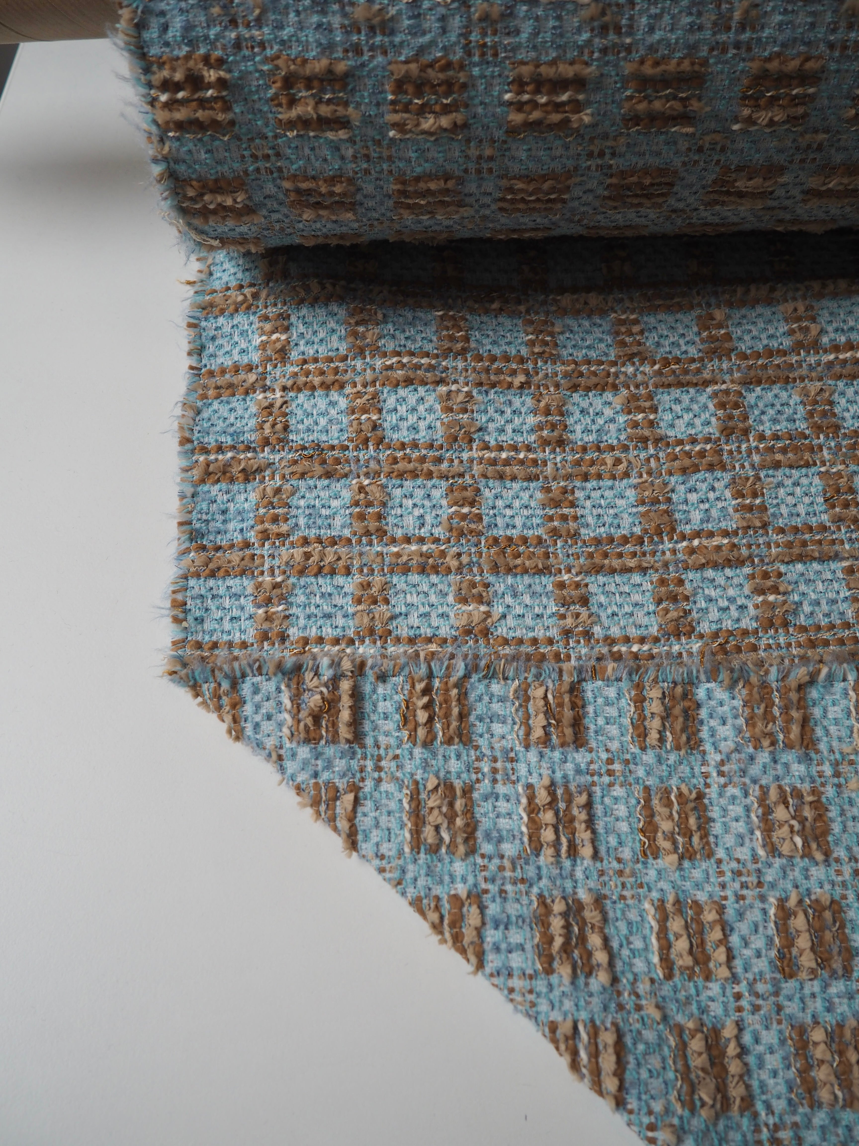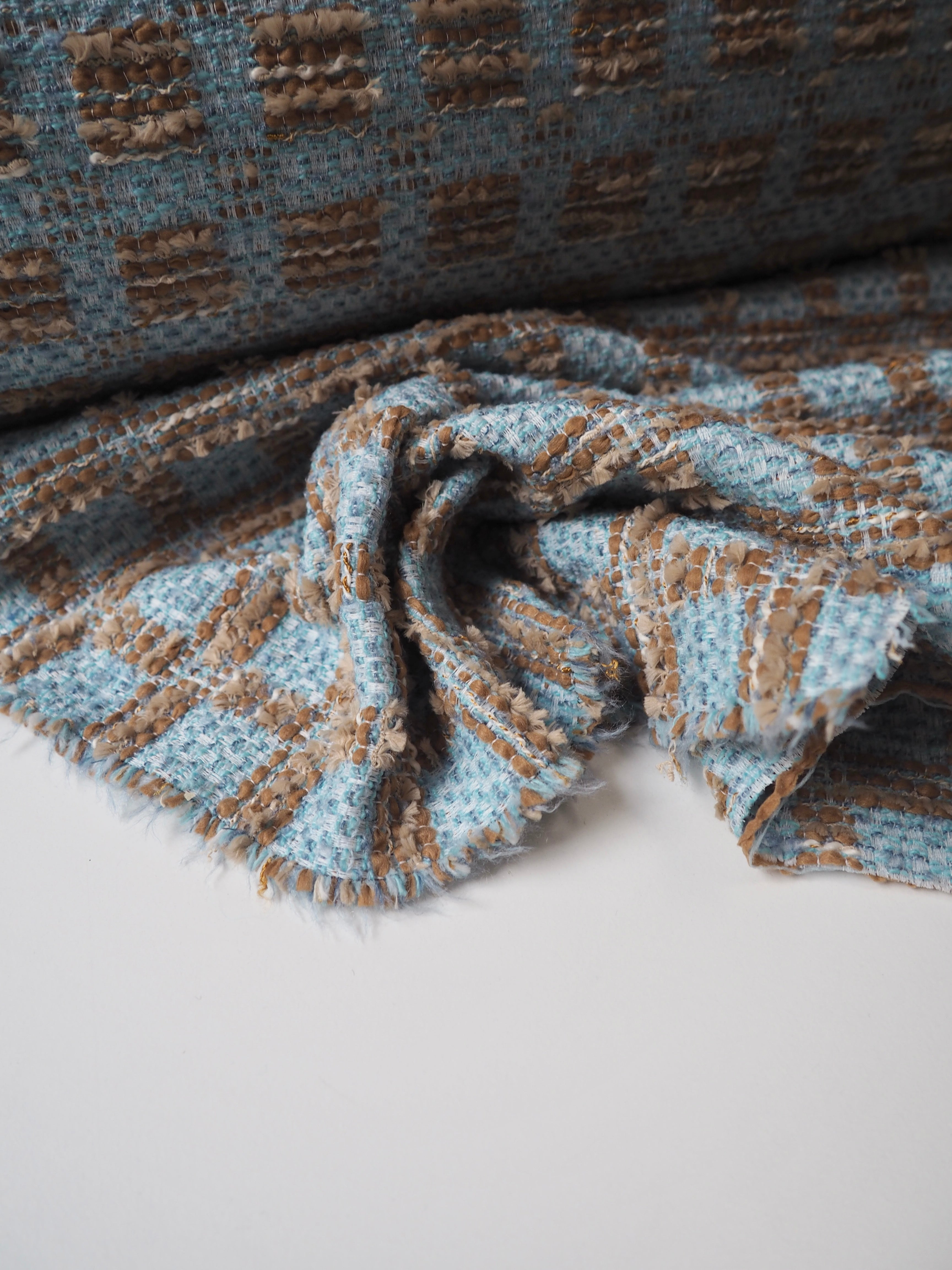 This ex-designer fabric is a bouclé coating. It's a blue and brown check, with a soft handle and quite plush texture. It's lighter weight for a coating, and has a great texture. It's quite warm and has a soft drape. Perfect for a coat, jacket, or cushions!