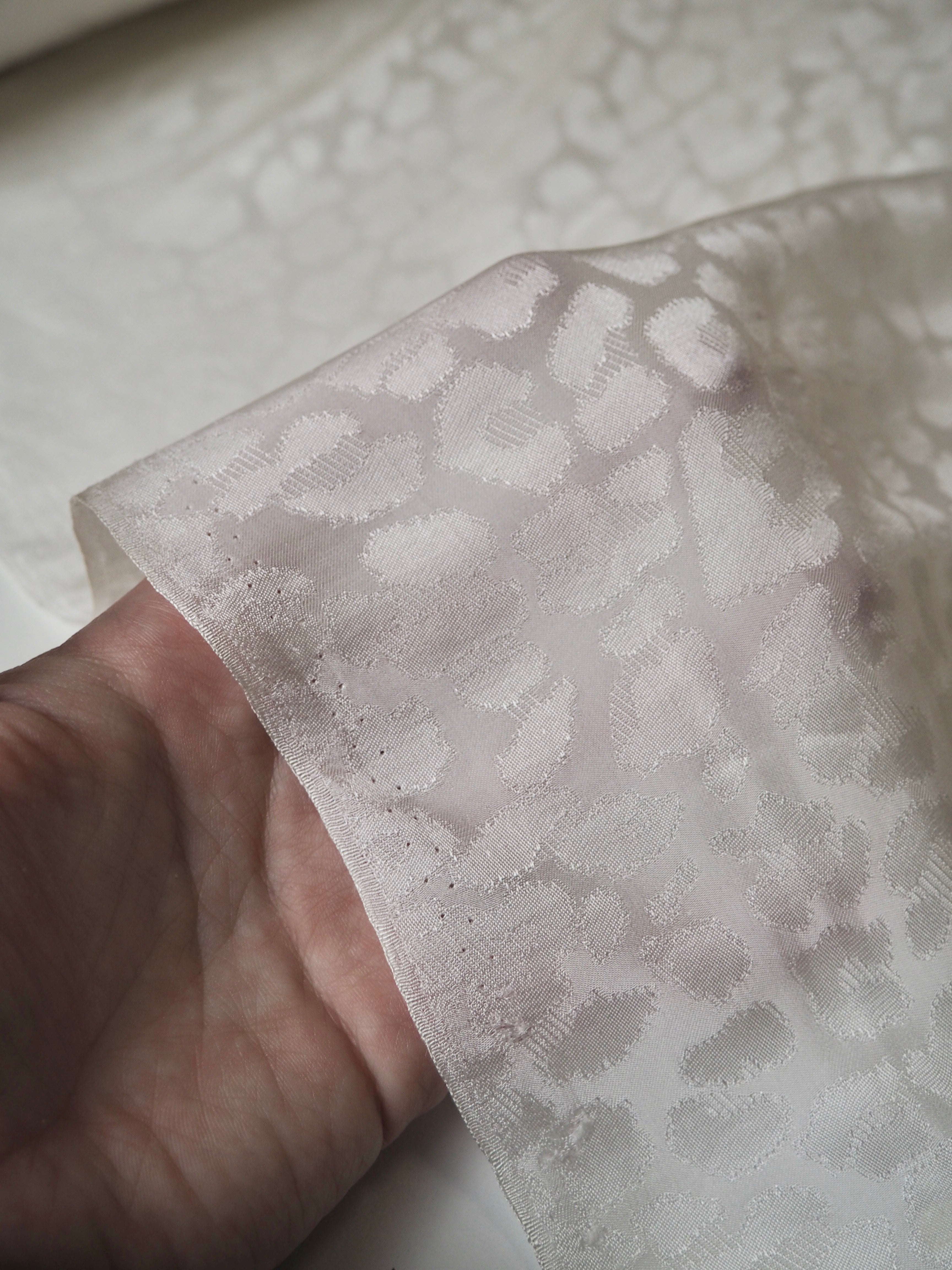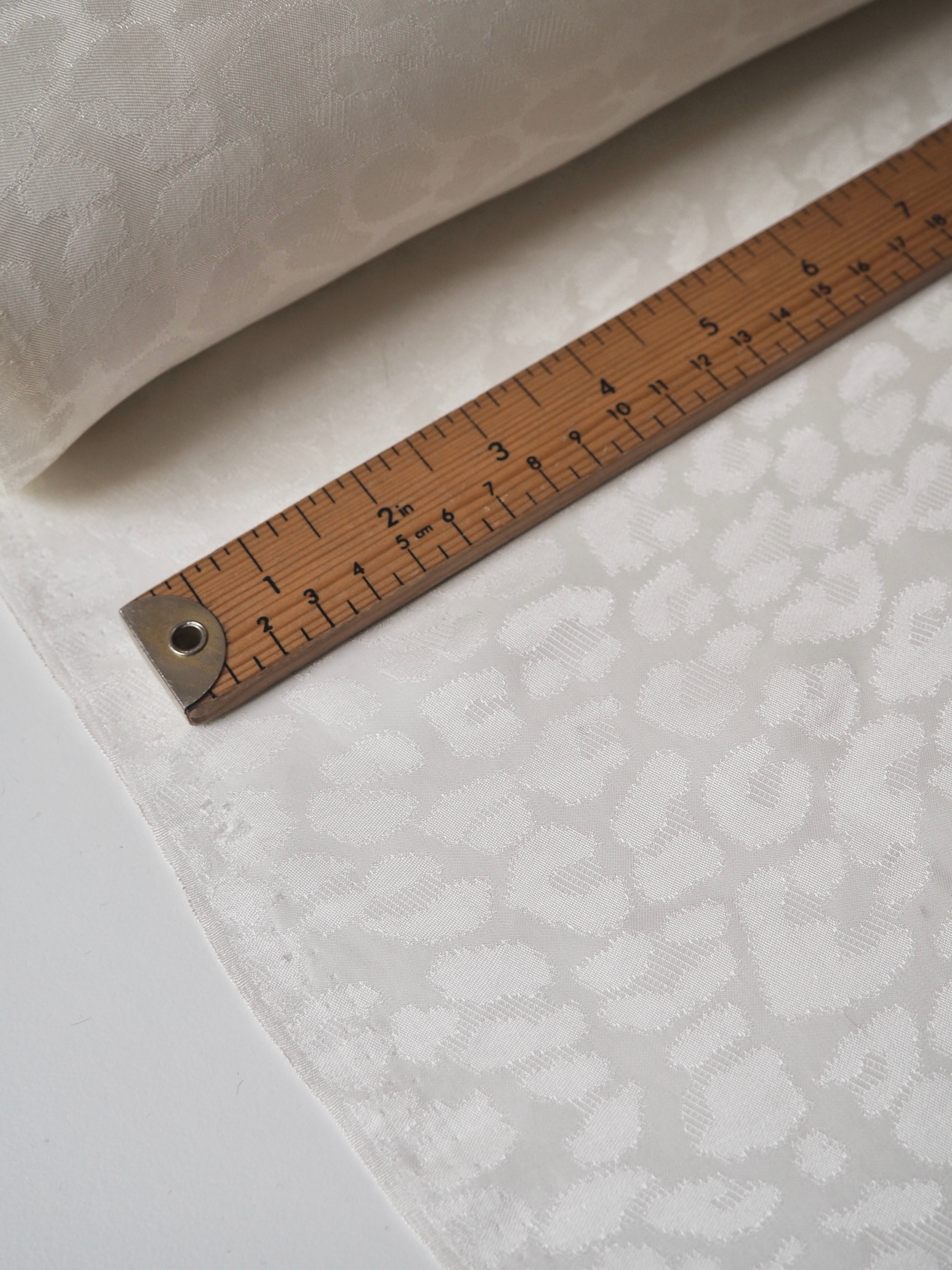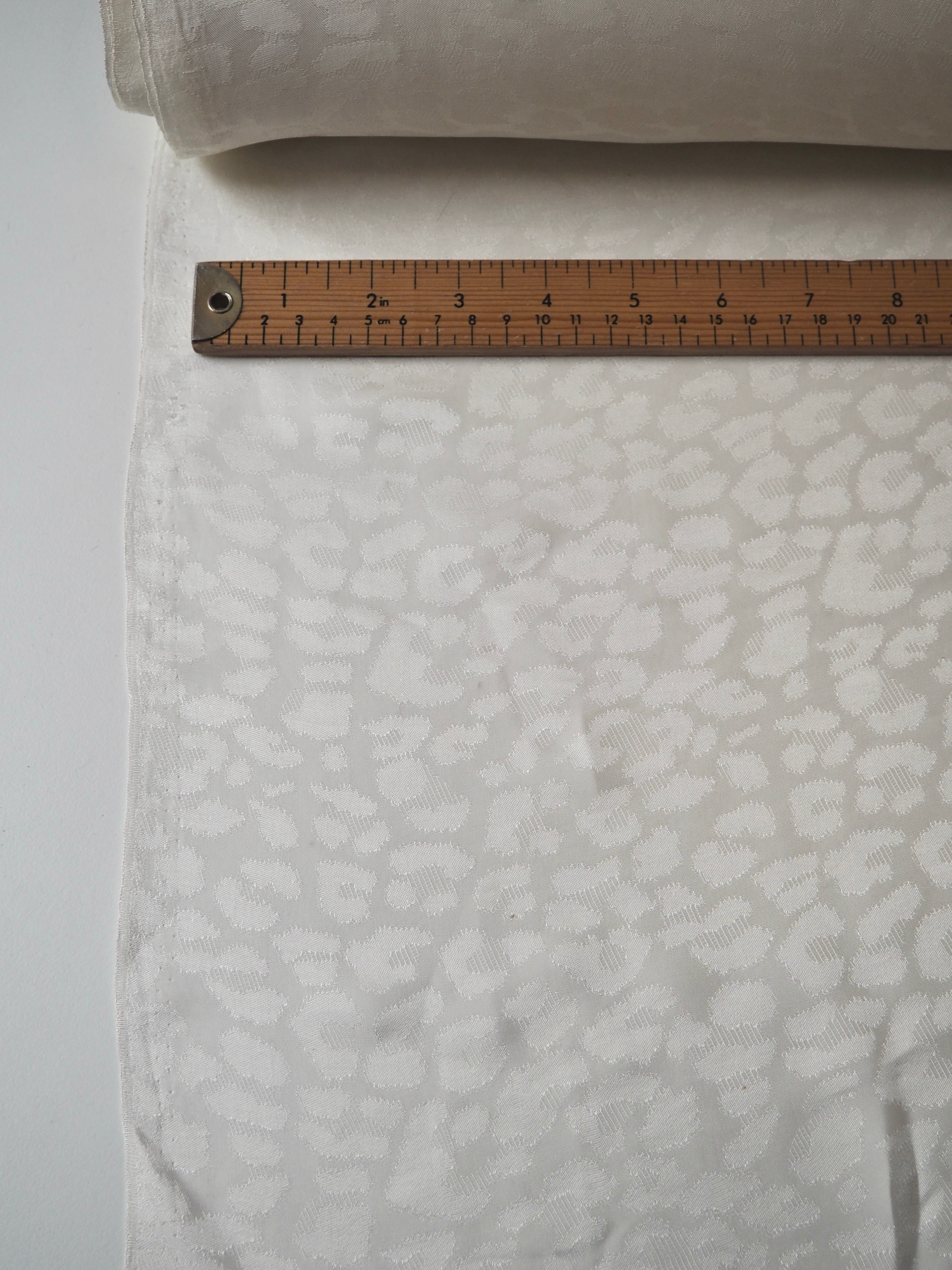 This ex-designer fabric is a leopard jacquard. It's in such a lovely creamy ivory shade, with a leopard pattern woven into the cloth. One side has a bright lustrous satin finish, and the other has a slightly duller side that's just as beautiful. Has a fantastic viscose silky handle! Lightweight with wonderful drape and shiny finish. Slightly sheer due to colour. Incredible movement! Ideal for lining or making a garment both!