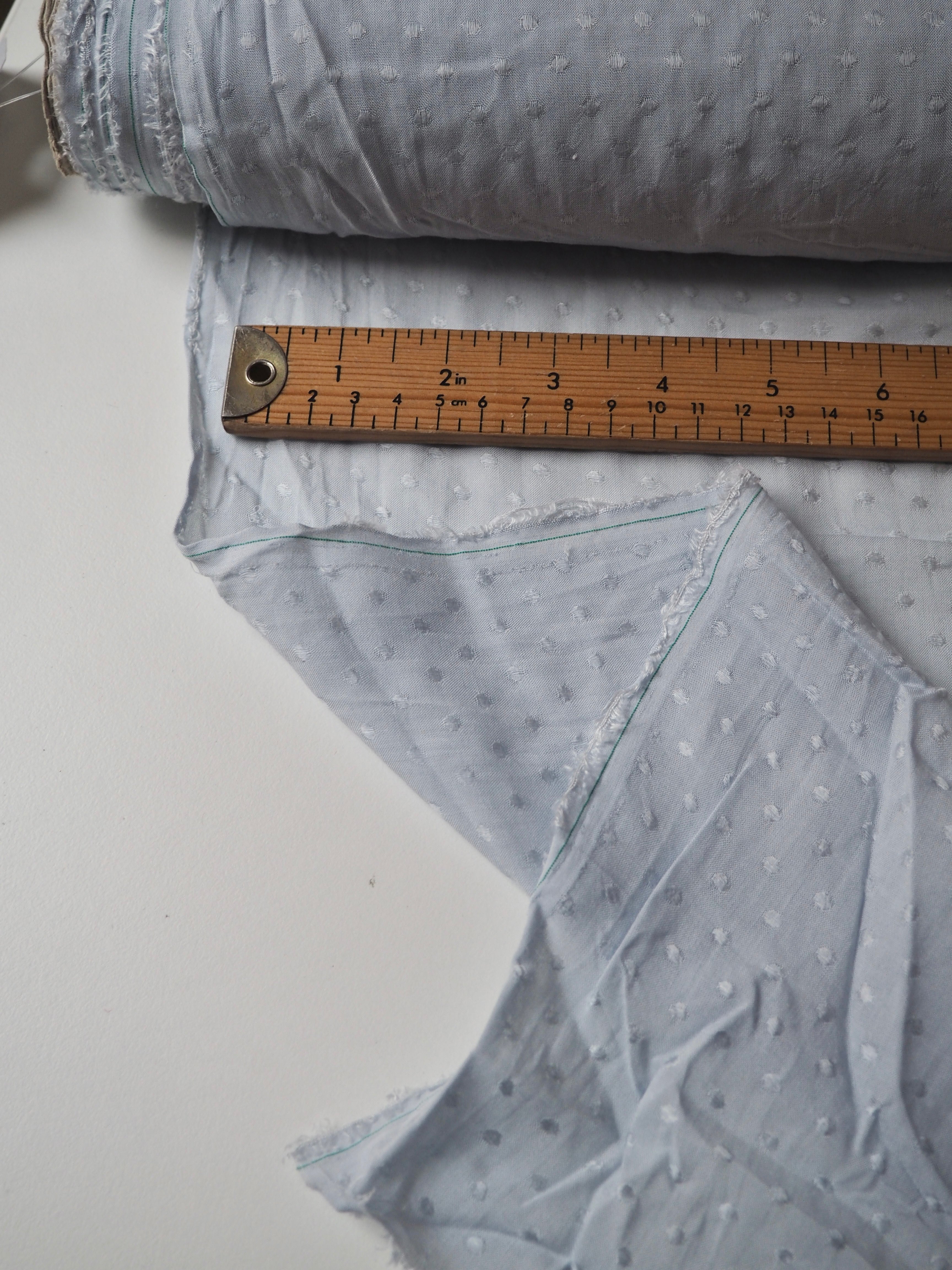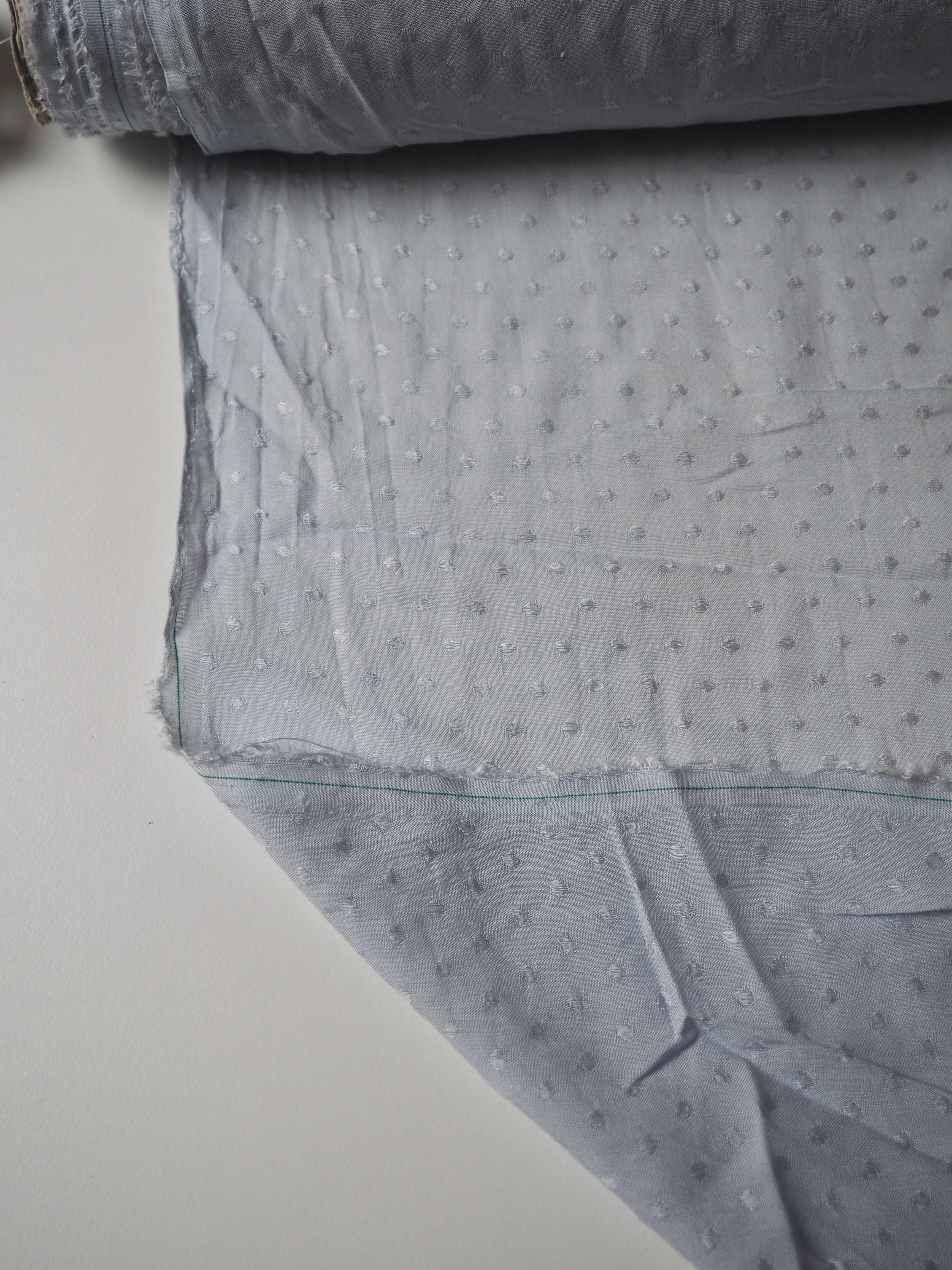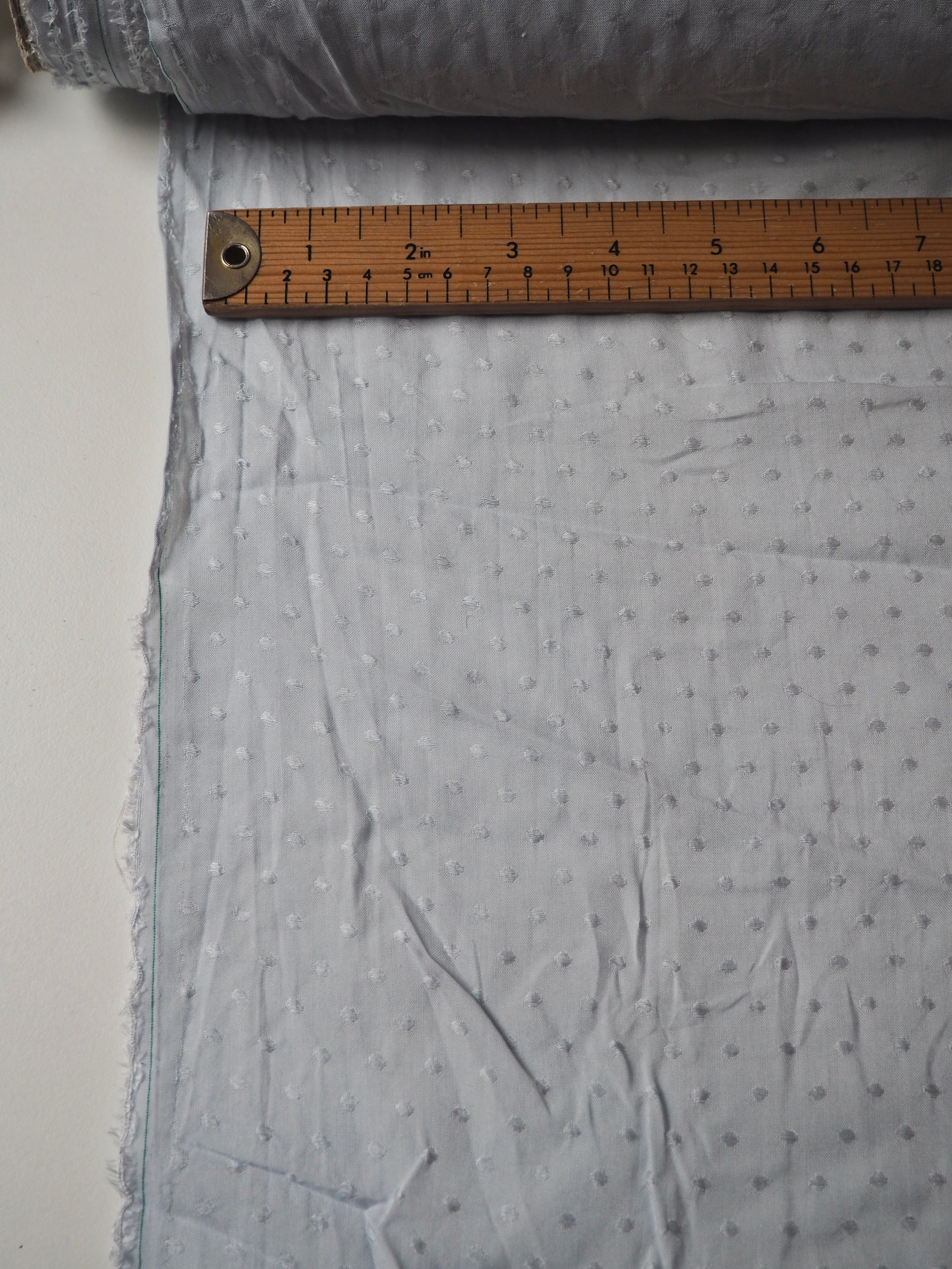 This ex-designer fabric is a viscose jacquard. It's in a lovely light blue shade, with a dotted pattern woven into the cloth. One side has a brighter satin finish, and the other has a slightly duller side that's just as beautiful. Has a fantastic soft handle. Lightweight with wonderful drape and incredible movement. Slightly sheer due to colour. Ideal for lining or making a garment both! Perfect as the "something blue" for a bridal look!