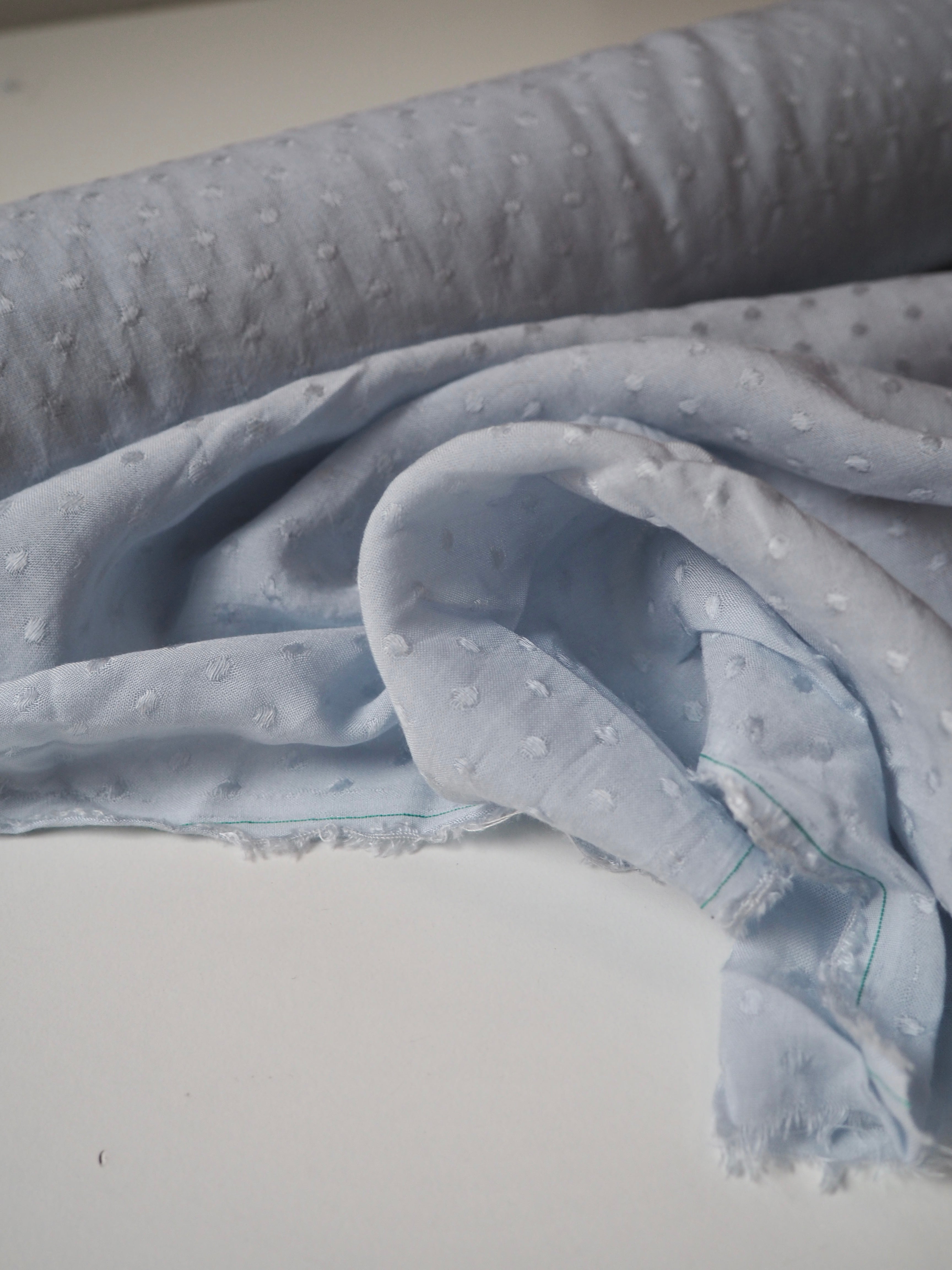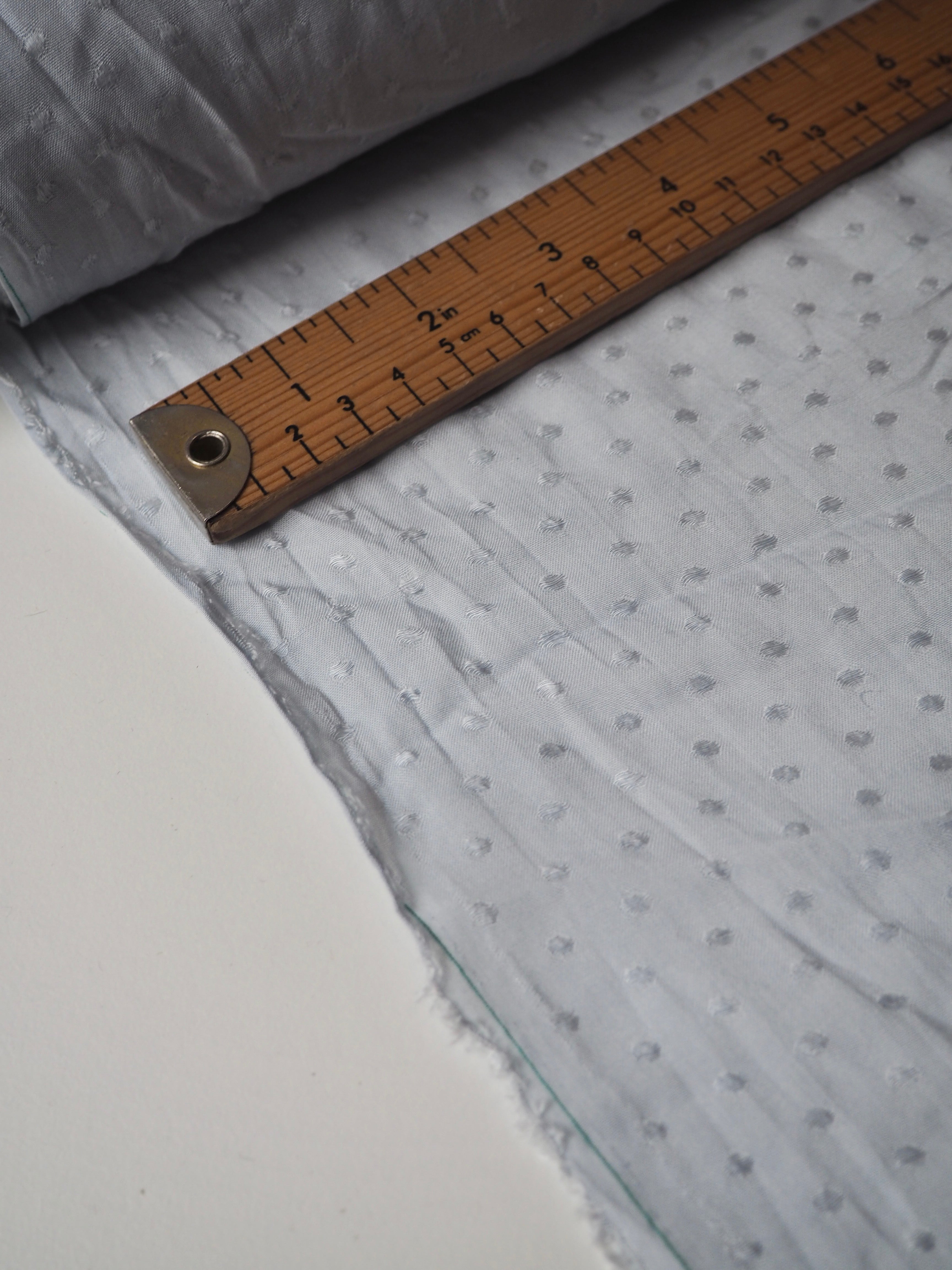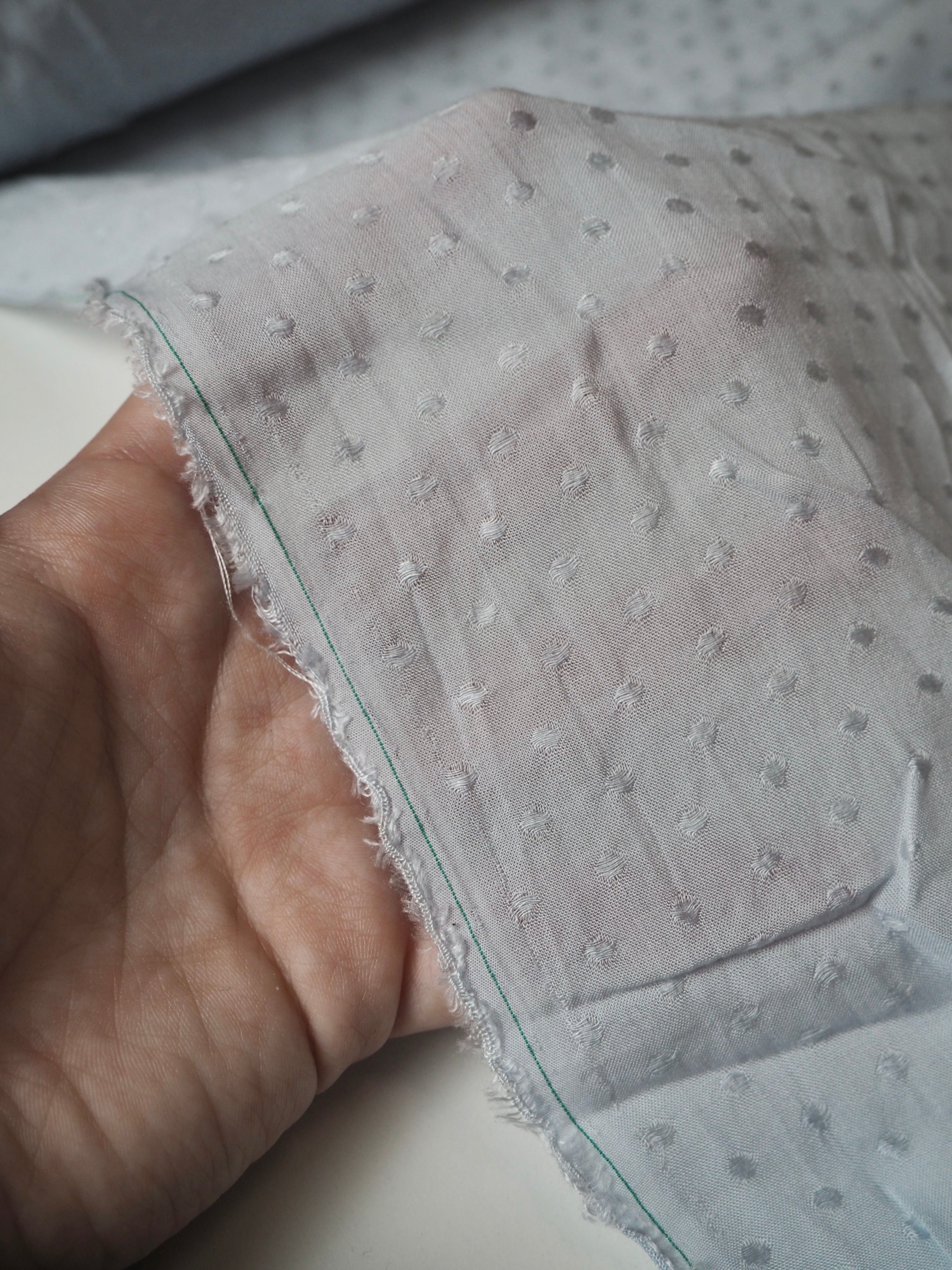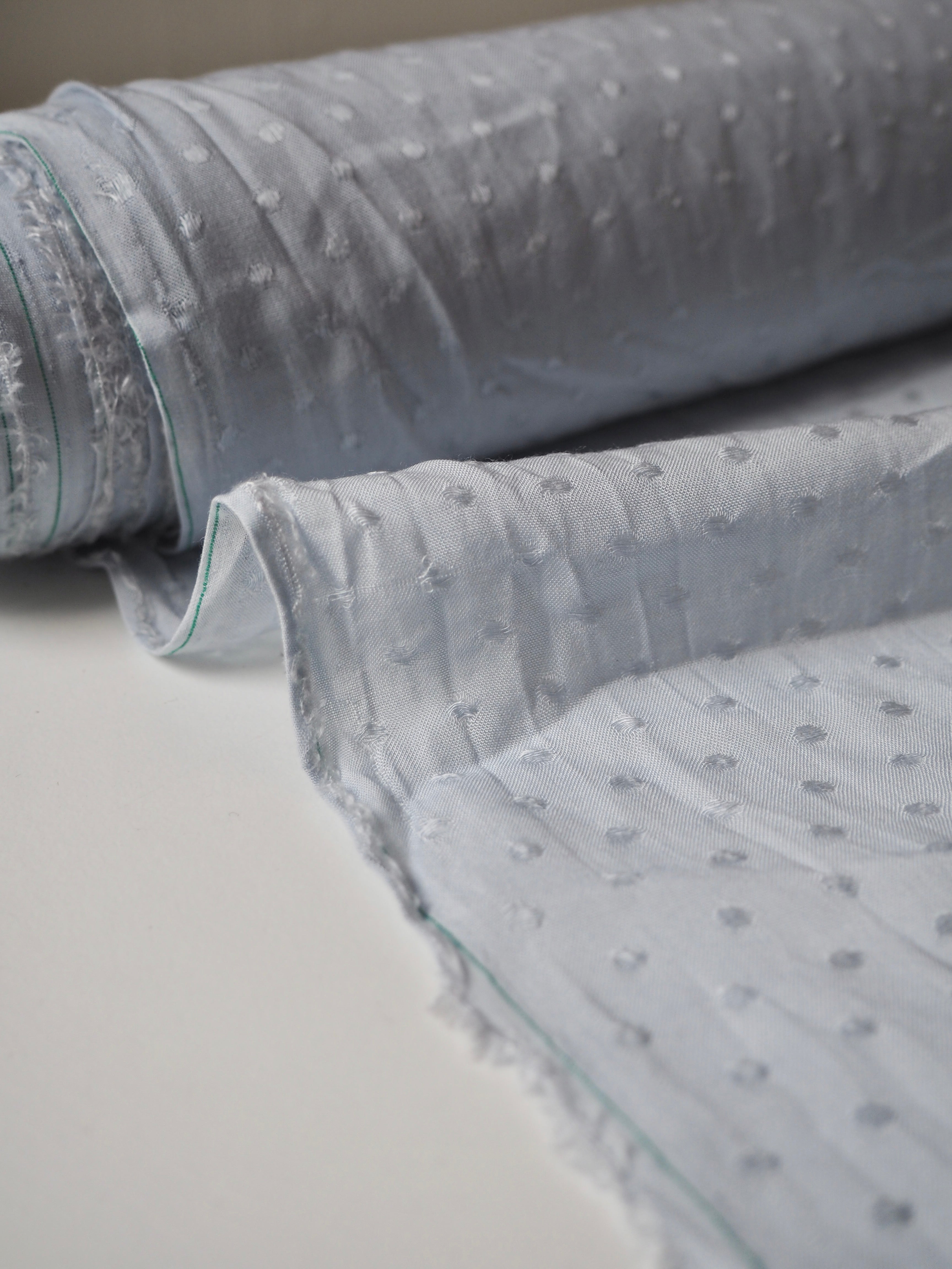 This ex-designer fabric is a viscose jacquard. It's in a lovely light blue shade, with a dotted pattern woven into the cloth. One side has a brighter satin finish, and the other has a slightly duller side that's just as beautiful. Has a fantastic soft handle. Lightweight with wonderful drape and incredible movement. Slightly sheer due to colour. Ideal for lining or making a garment both! Perfect as the "something blue" for a bridal look!