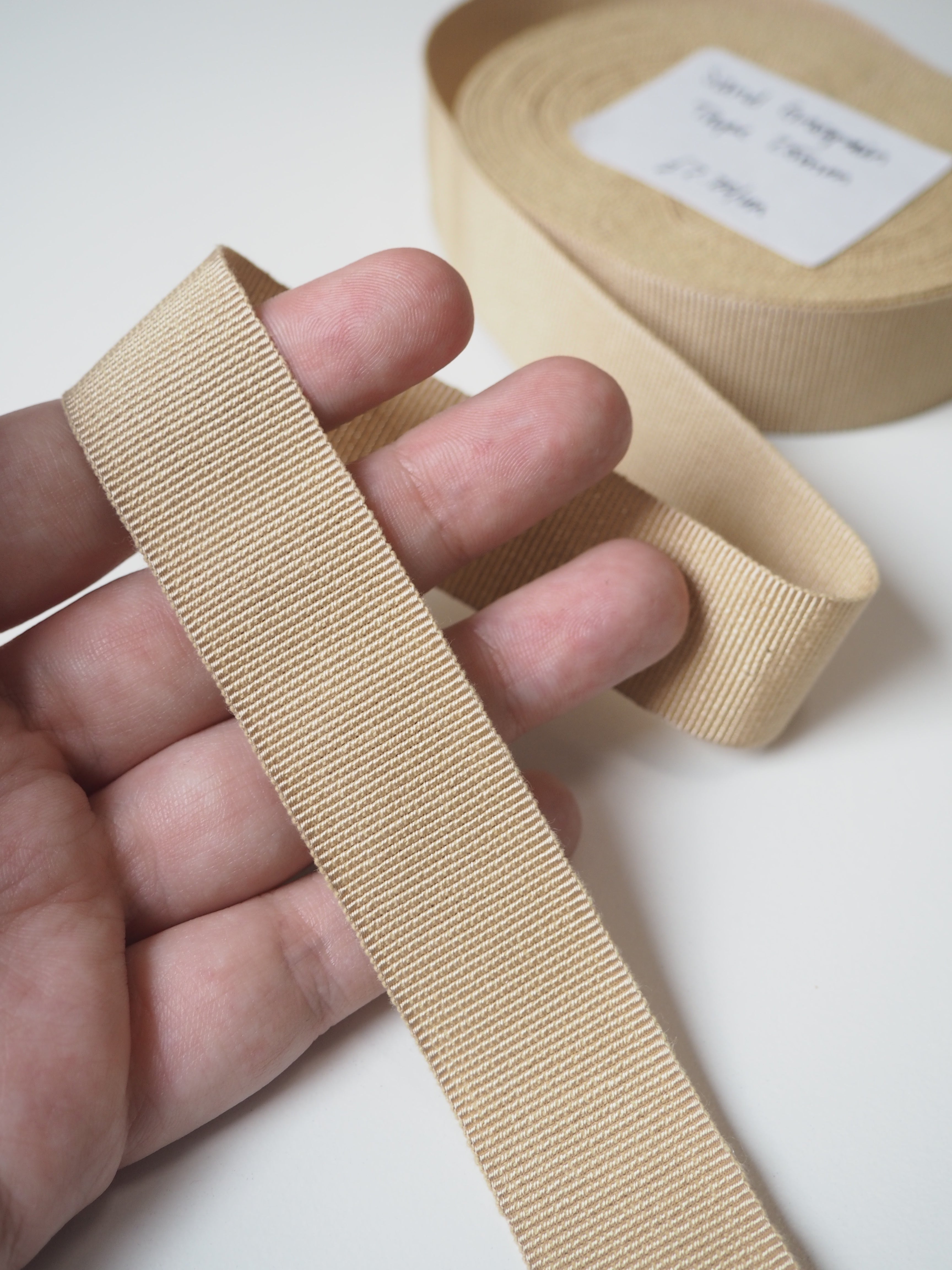 This ex-designer trim is a grosgrain tape. It has a textured weave and is quite sturdy. Satin finish and lovely texture. Great for ties, seam binding, bags, and finishing off projects!