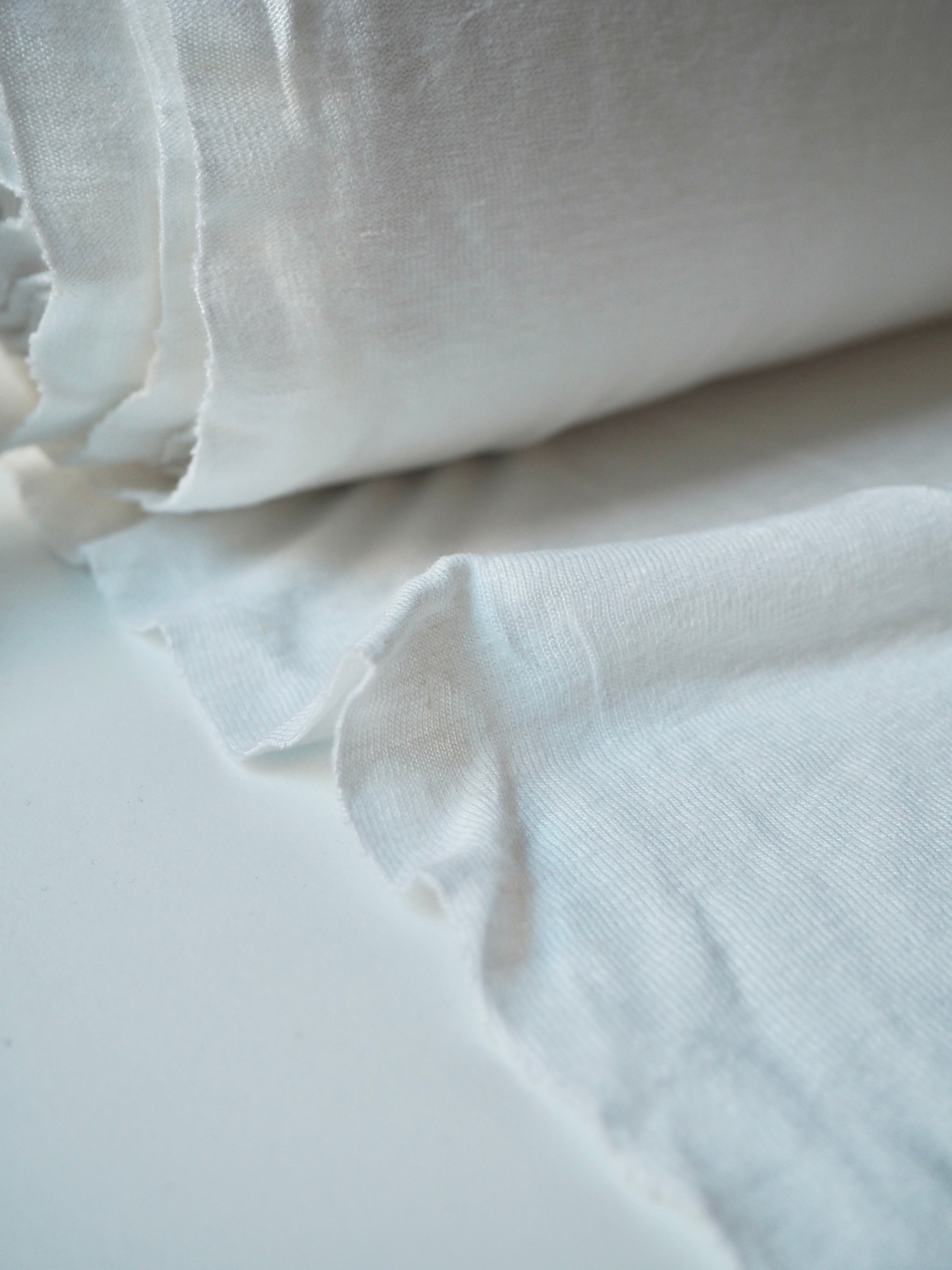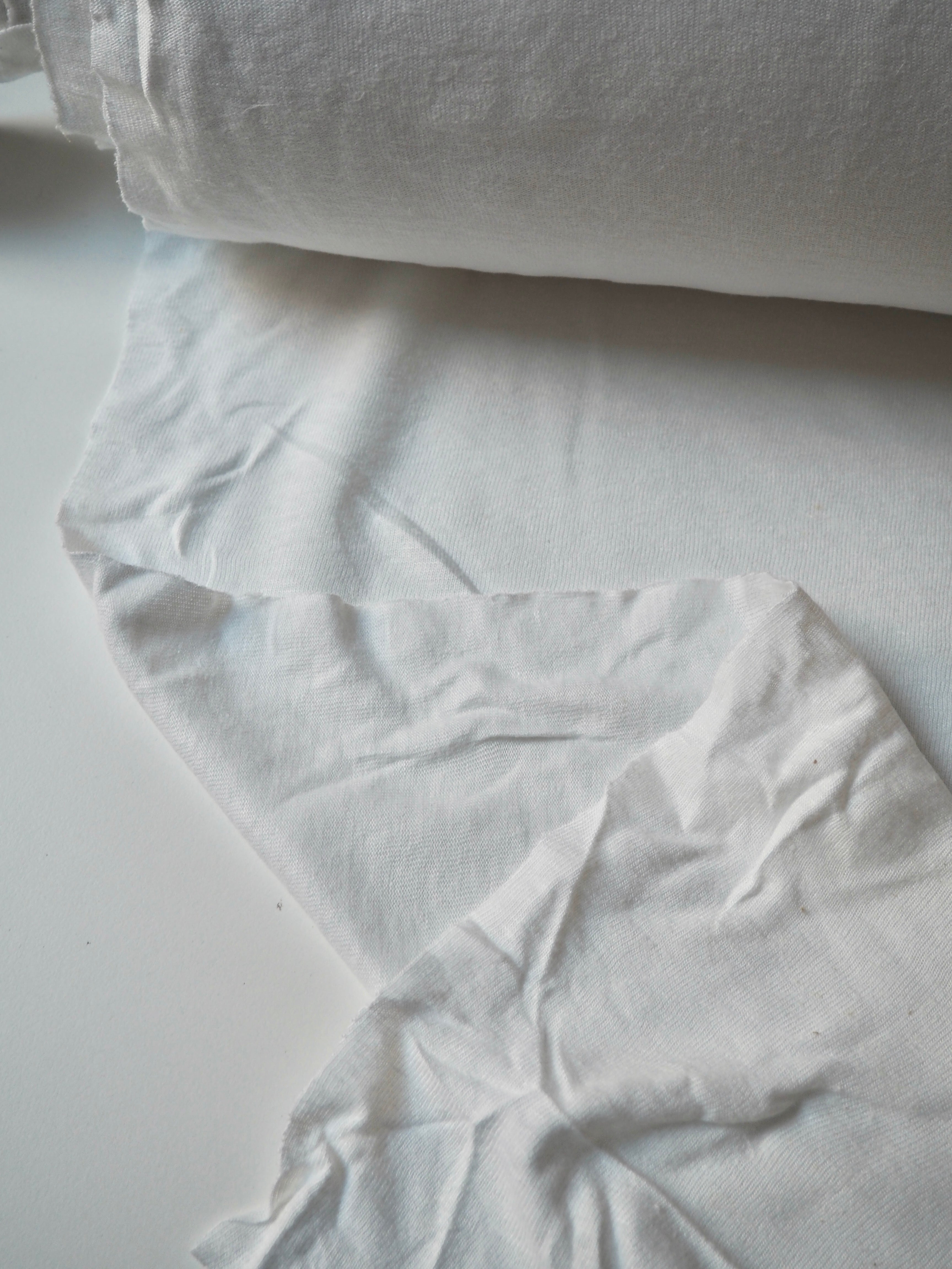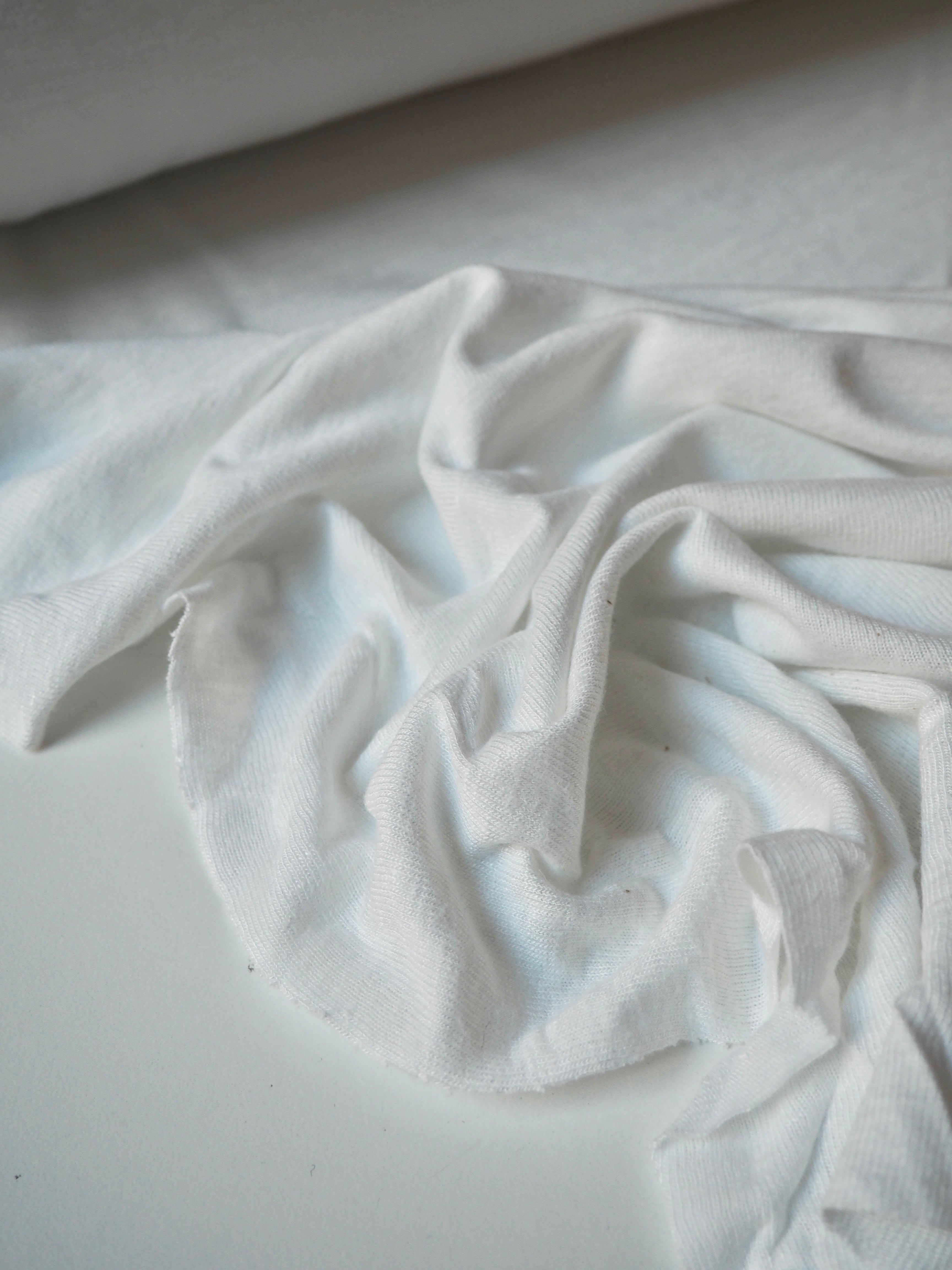 This ex-designer fabric is a cotton jersey. It is lightweight with a light drape. It has a single jersey t-shirt weave with only 5-10% stretch length-ways. It's a brighter white shade with a slight sheen finish. Semi-sheer with a bit more structure than a typical t-shirt jersey. Ideal for everyday basics, would make a great classic t-shirt!