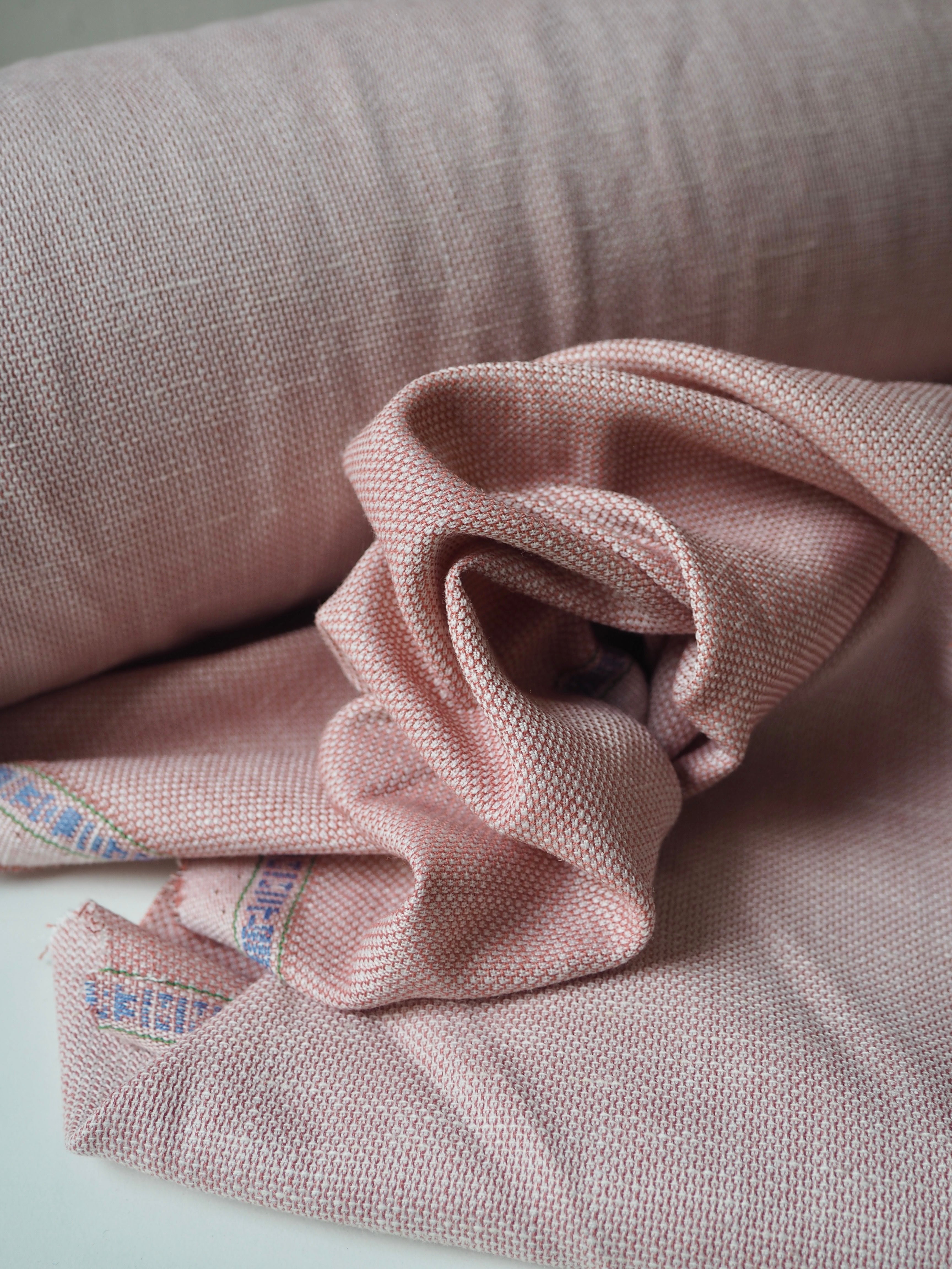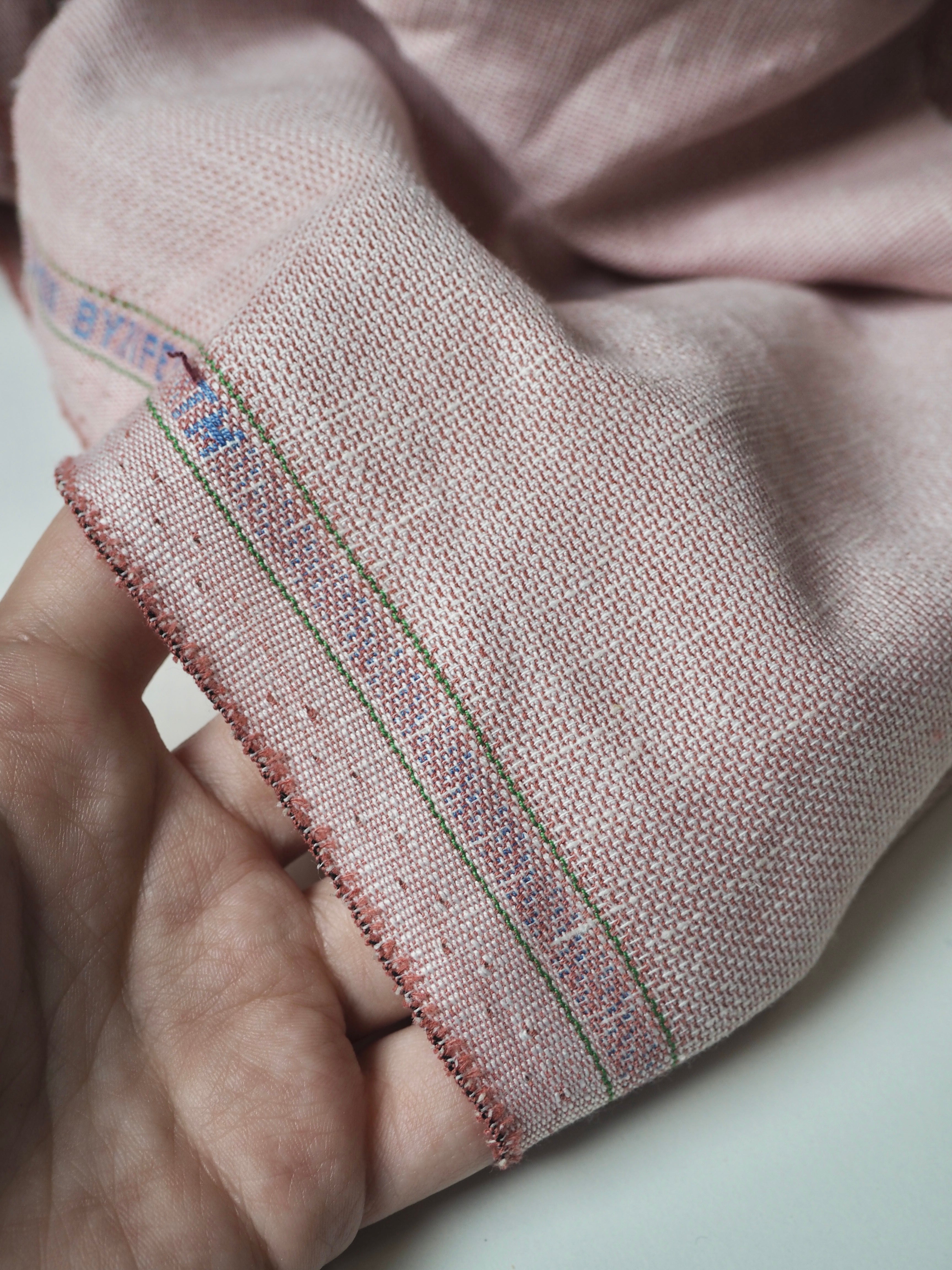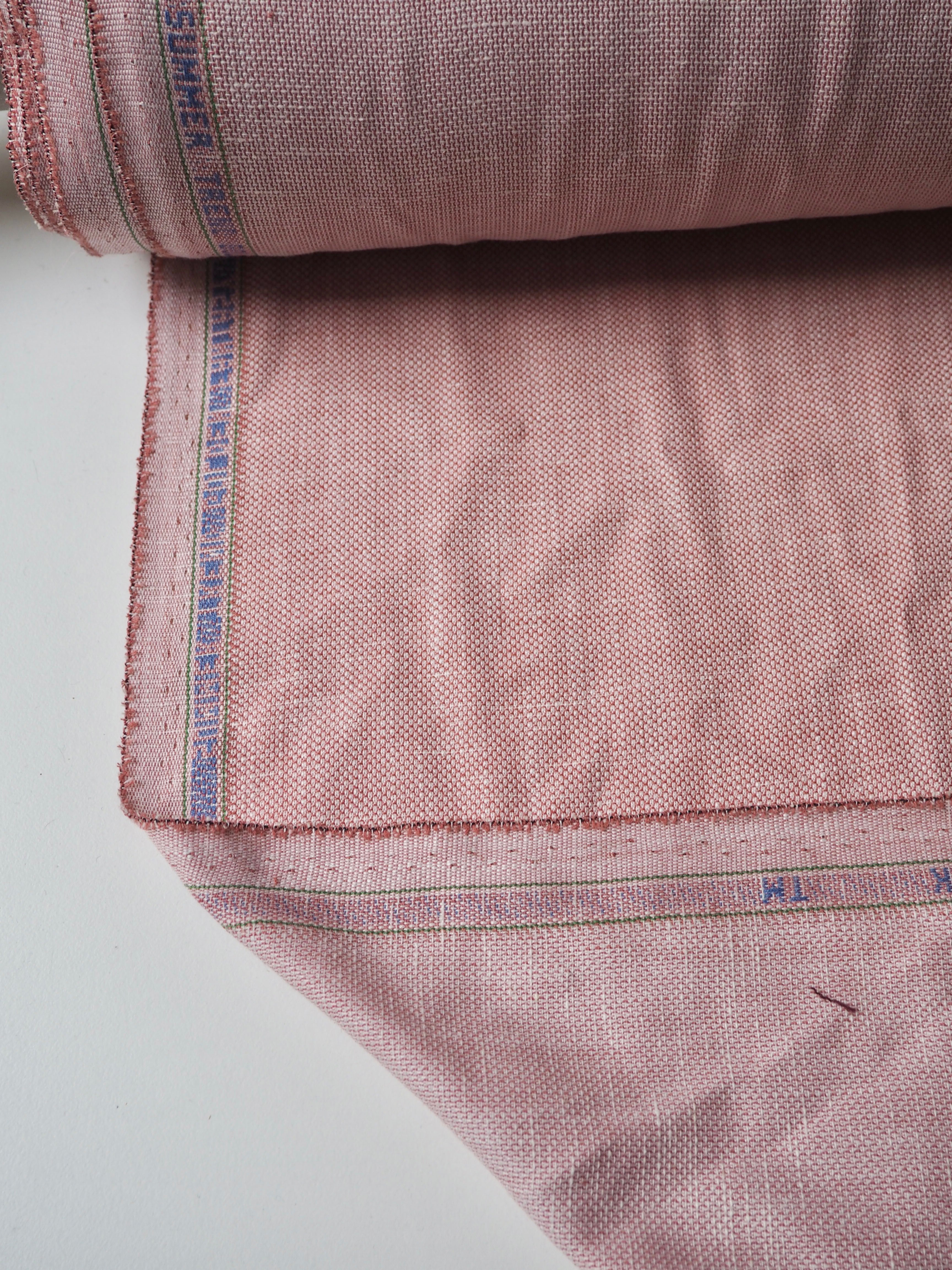 This ex-designer fabric is a suiting. It's in a light pink and white birds-eye weave suiting. It's a linen, polyester, and viscose blend, which gives it a lovely balance of softness, drape, and breathability. Lightweight, with a nice drape and lovely handle. Has a slight sheen finish. Mostly opaque, a little sheer. Either side can be used! Perfect for a relaxed blazer, top, or trousers for warmer climates!