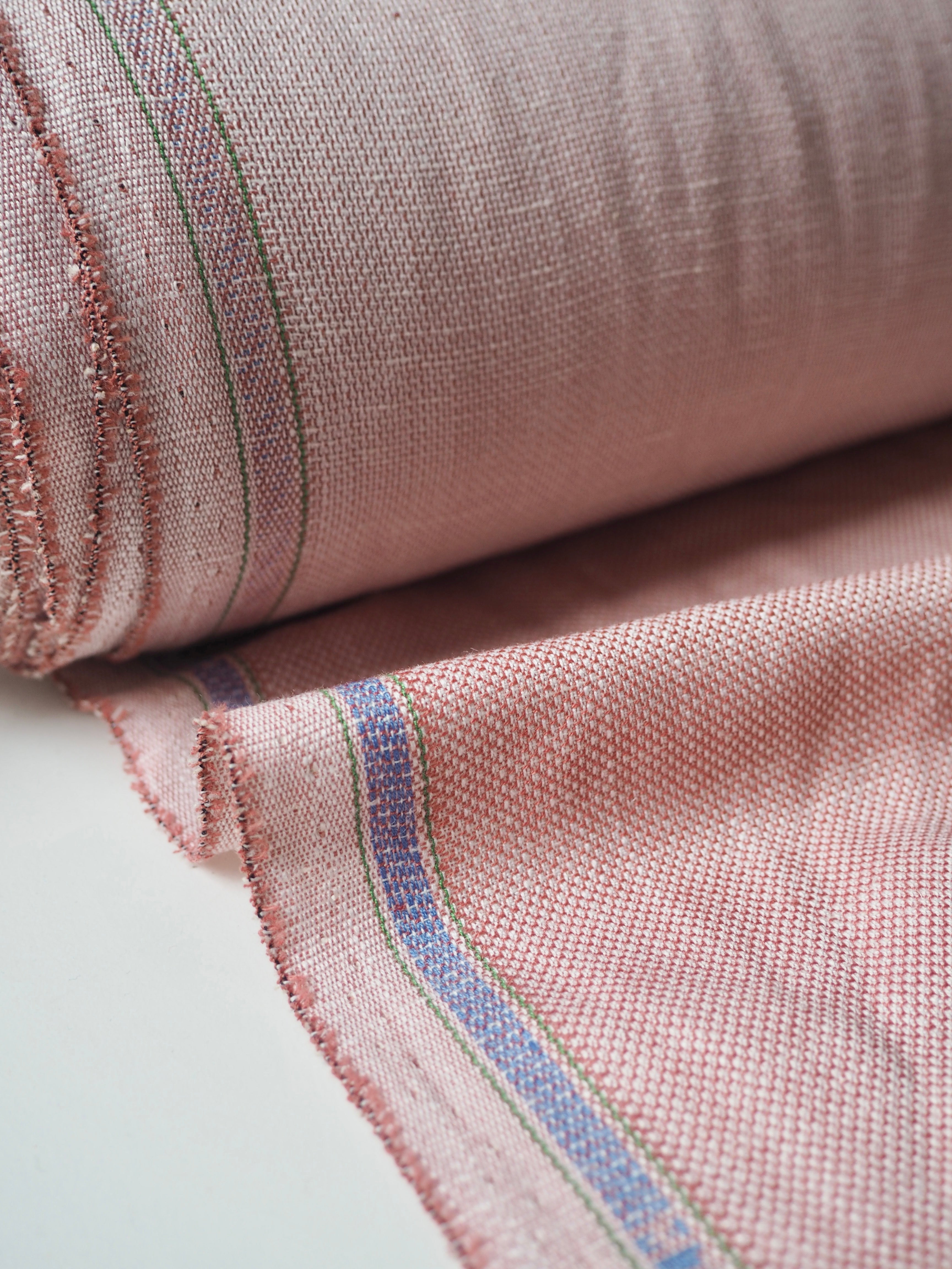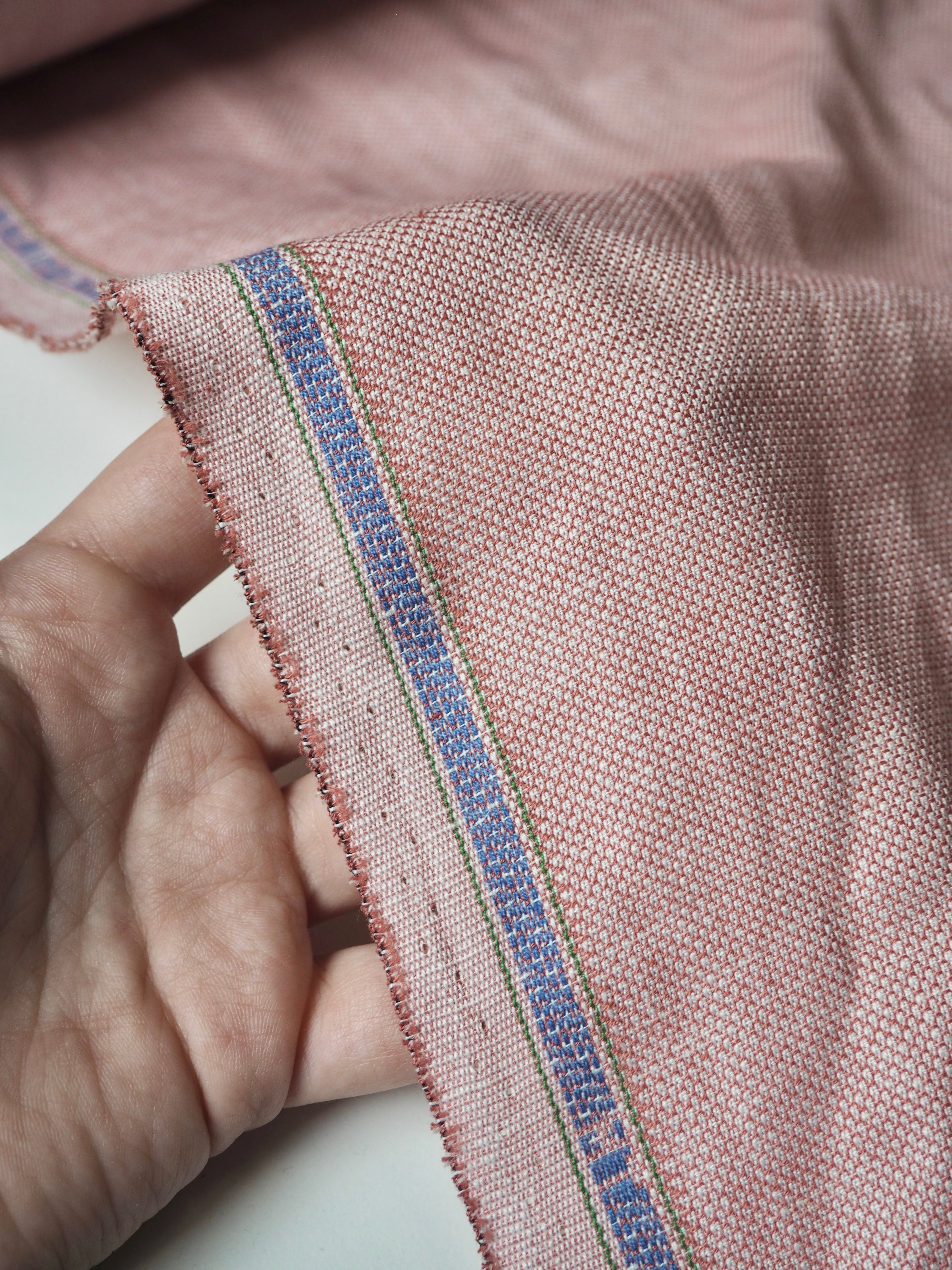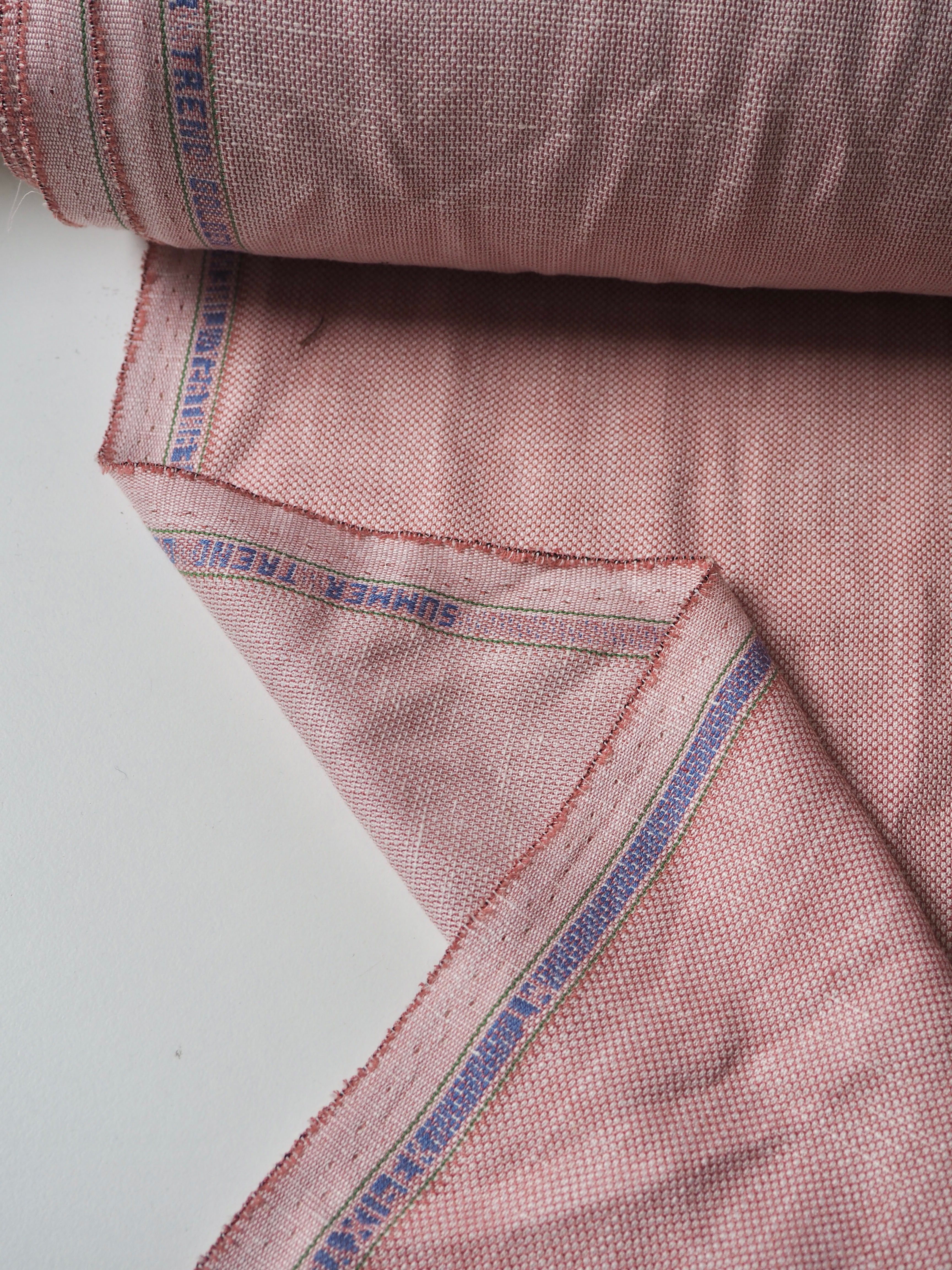 This ex-designer fabric is a suiting. It's in a light pink and white birds-eye weave suiting. It's a linen, polyester, and viscose blend, which gives it a lovely balance of softness, drape, and breathability. Lightweight, with a nice drape and lovely handle. Has a slight sheen finish. Mostly opaque, a little sheer. Either side can be used! Perfect for a relaxed blazer, top, or trousers for warmer climates!