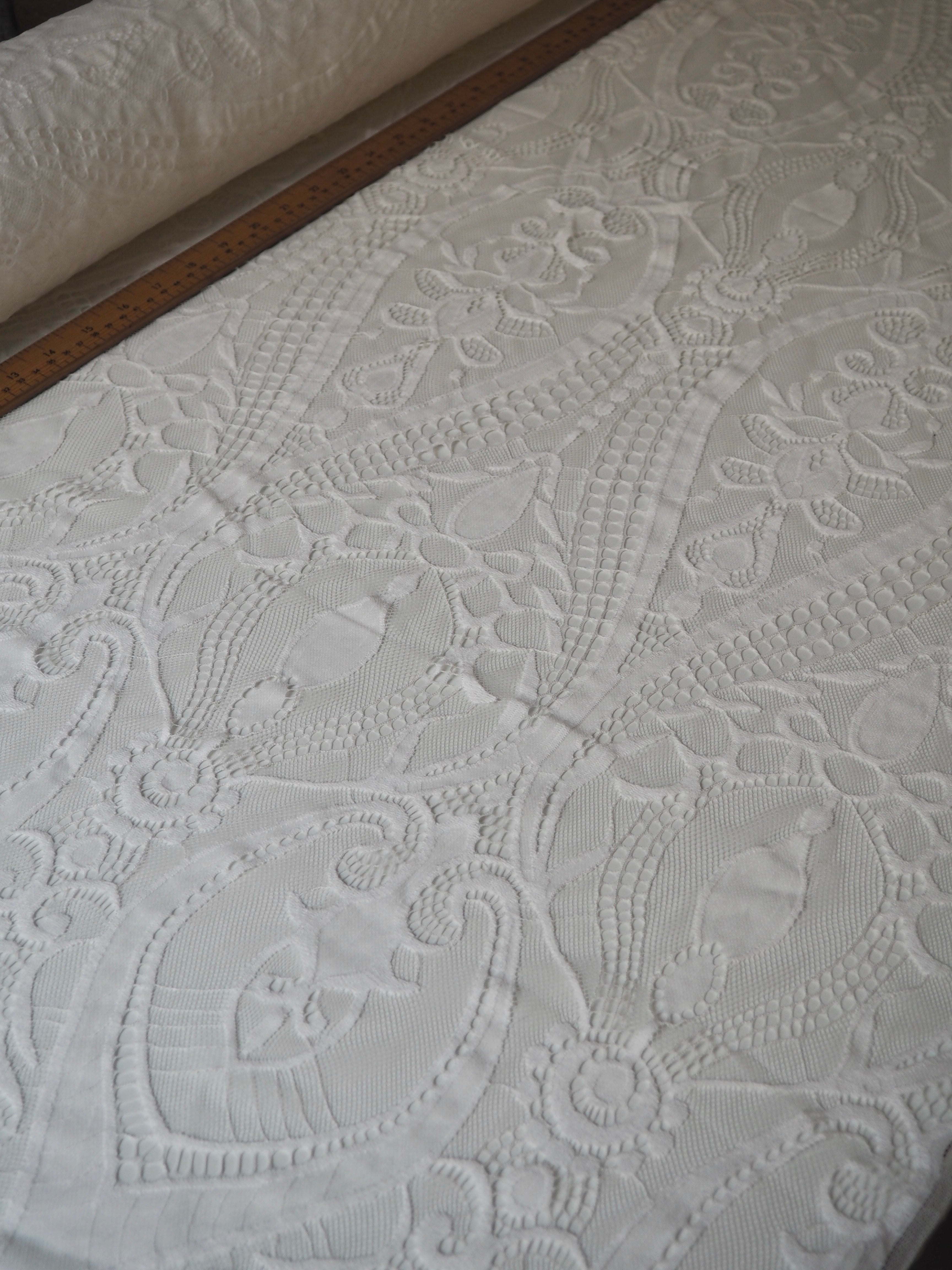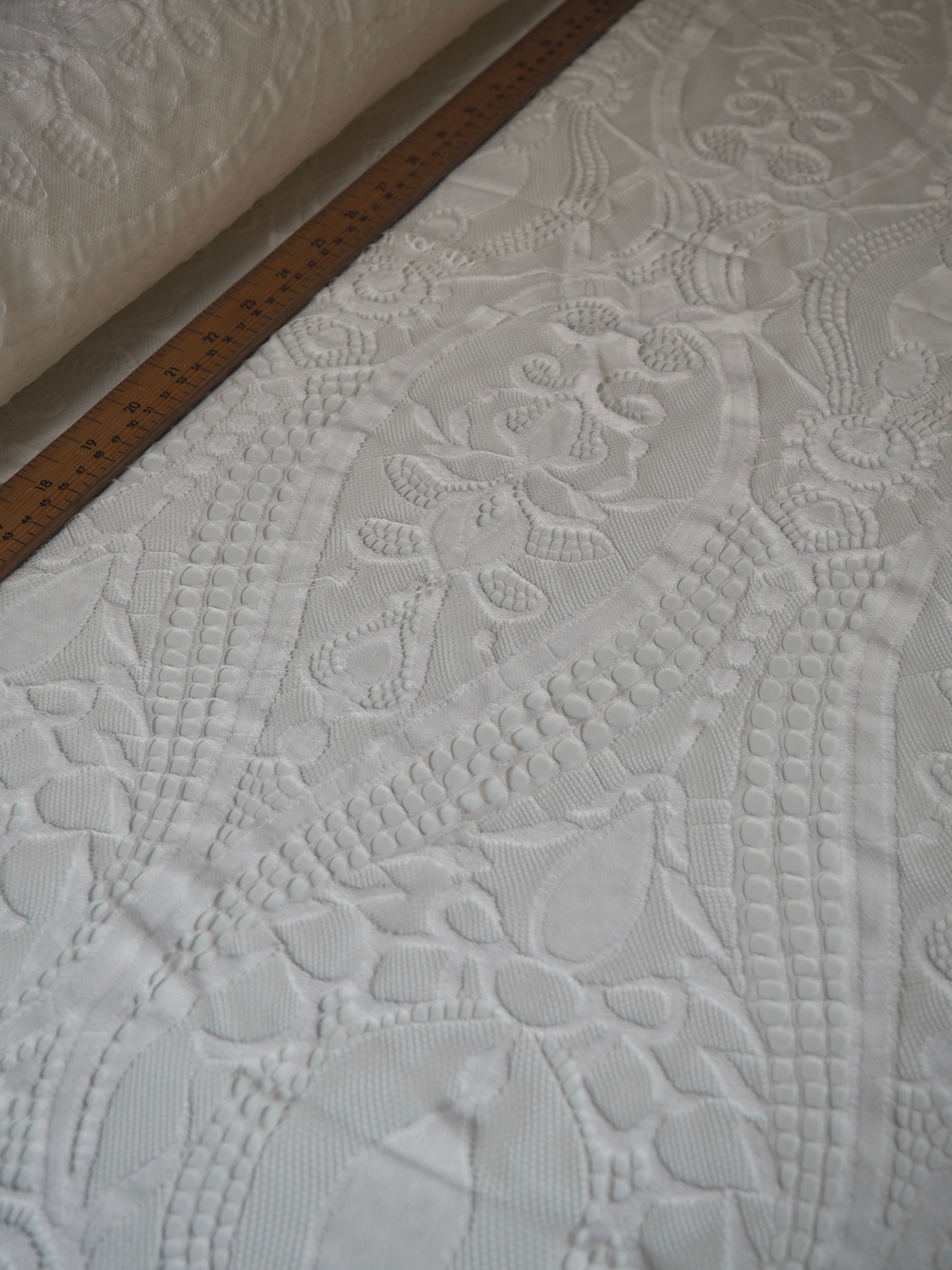 This ex-designer fabric is a lovely lace. It's in a soft white colour. It's soft and has a light sheen finish, with a very large scale scalloping pattern. Finishes with a gentle eyelash scallop on both ends. It has such a lovely drape and handle. Beautiful quality and perfect for bridal or summer tops and dresses! This lace is made in 2-3m pieces so if you order higher volume, your order might be in pieces.