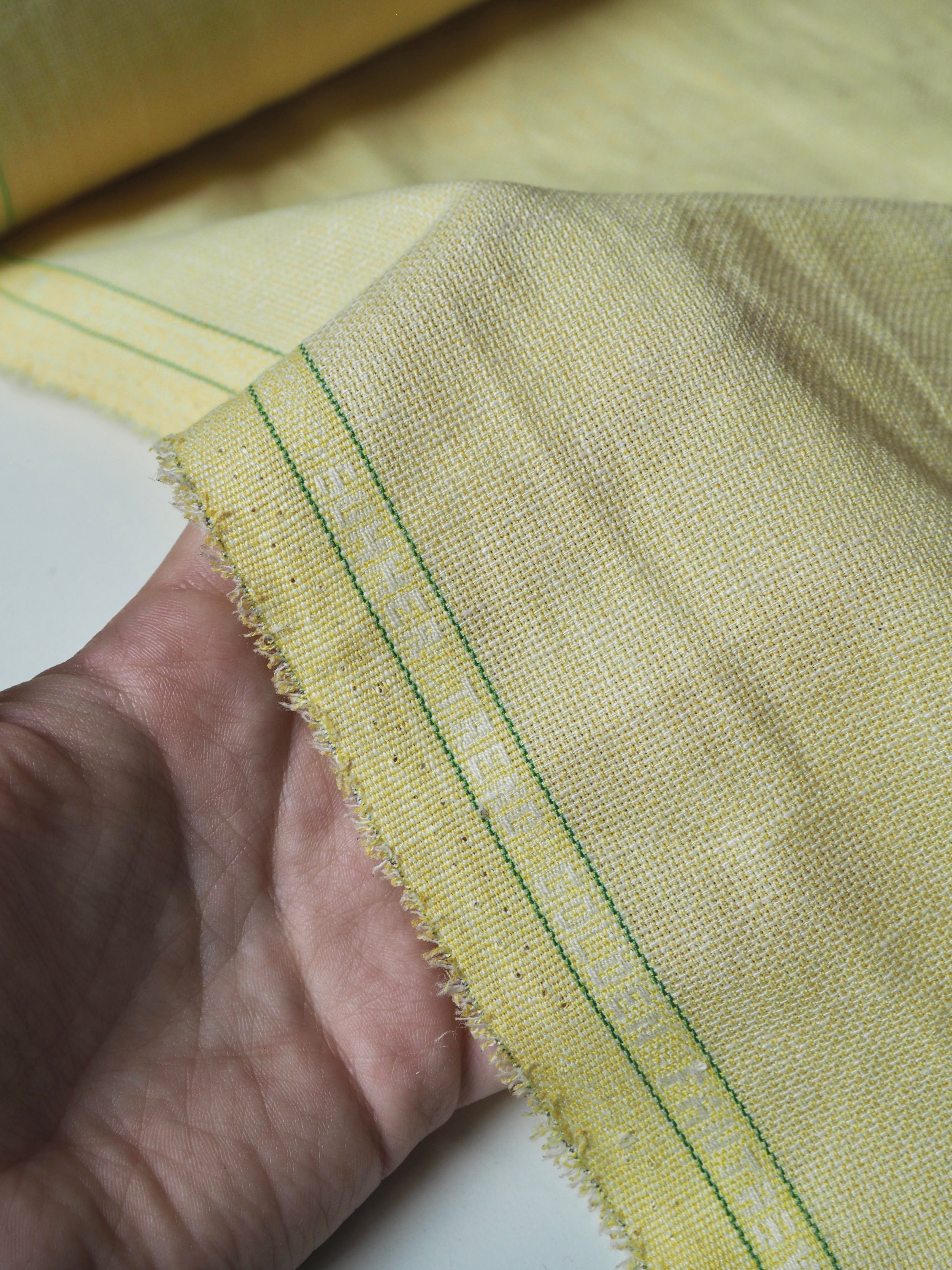 This ex-designer fabric is a suiting. It's in a yellow and white looser weave suiting. It's a linen, polyester, and viscose blend, which gives it a lovely balance of softness, drape, and breathability. Lightweight, with a nice drape and lovely handle. Has a slight sheen finish. Mostly opaque, a little sheer. Perfect for a relaxed blazer, top, or trousers for warmer climates!