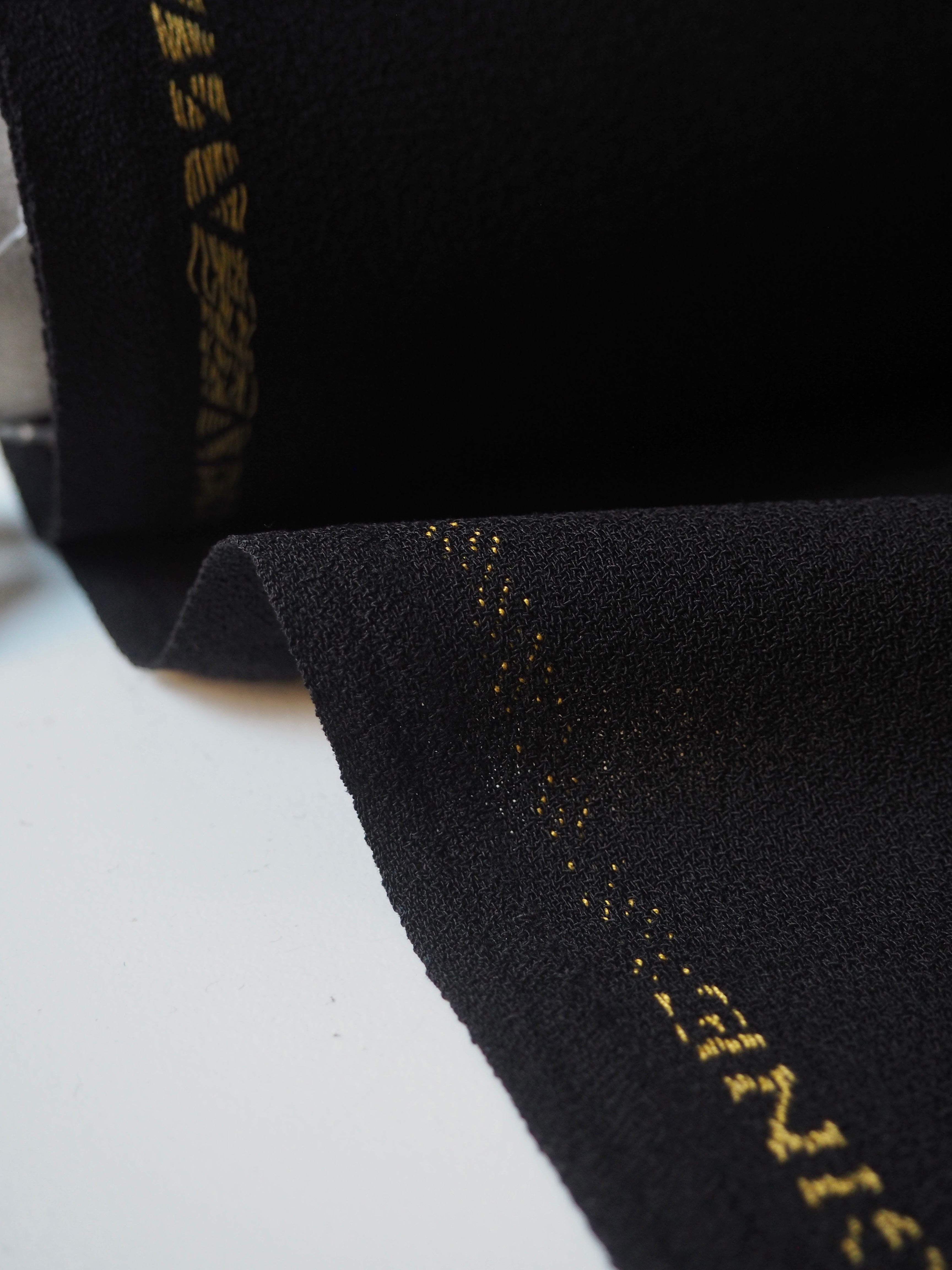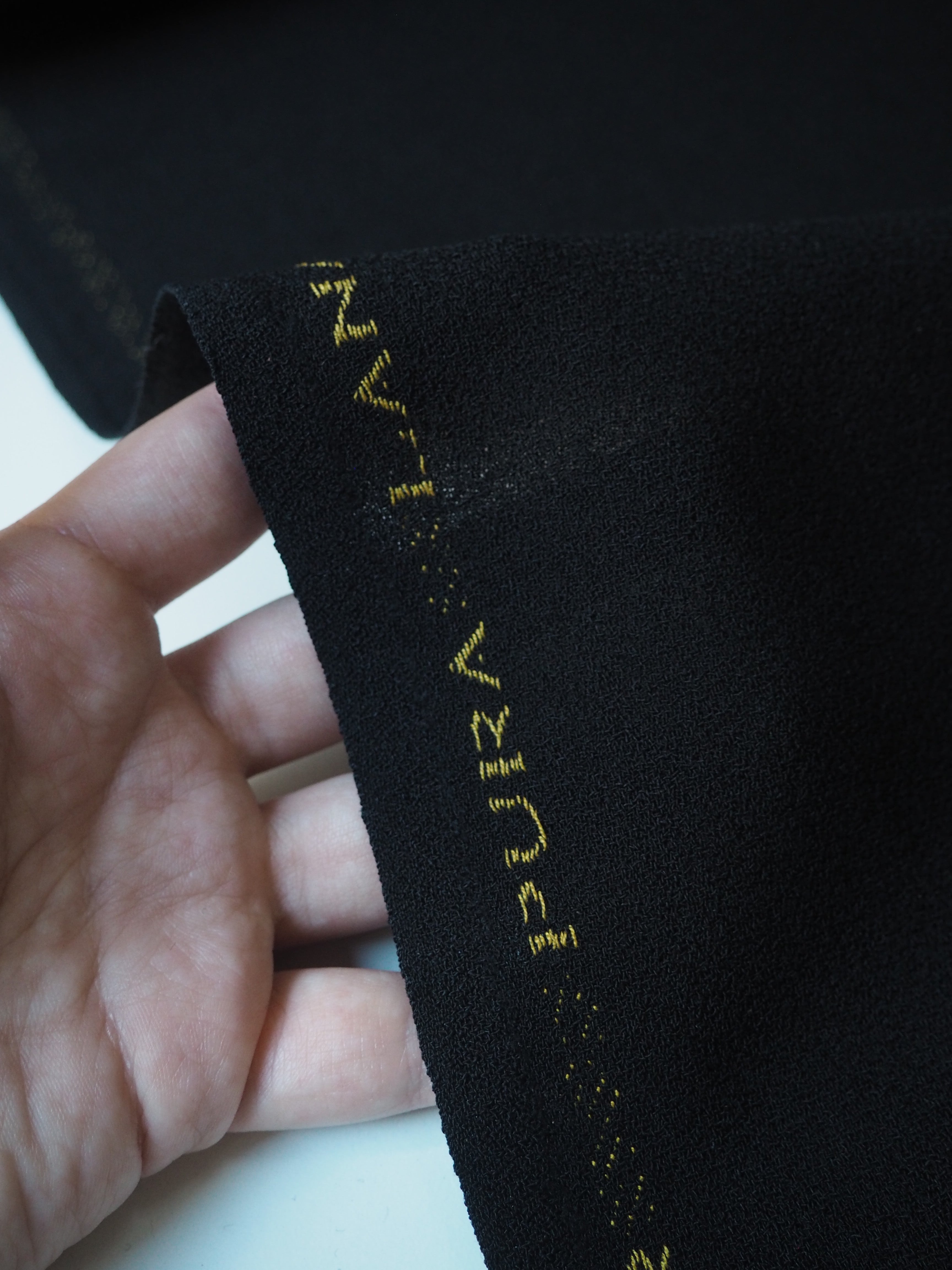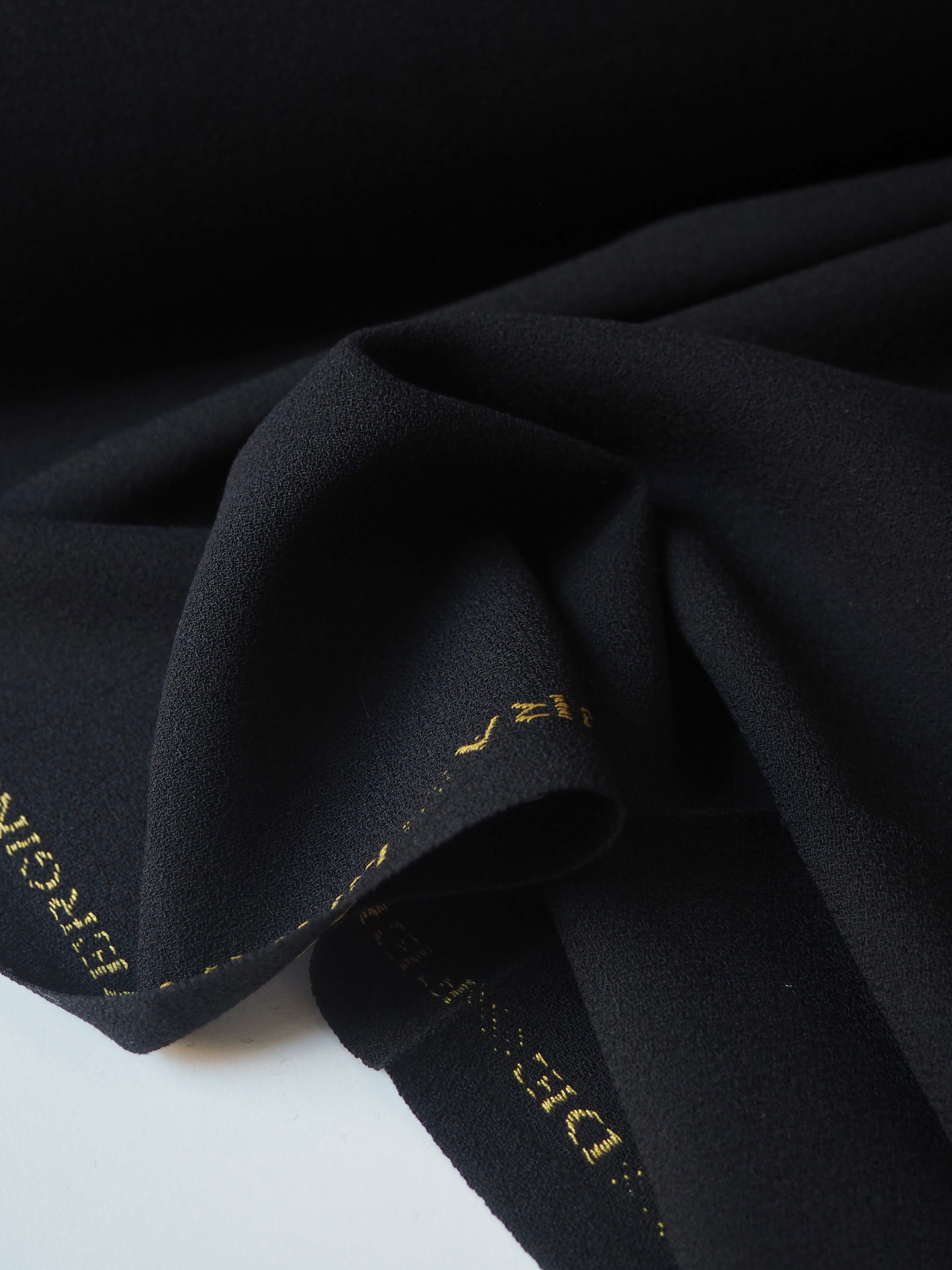 This ex-designer fabric is a wool crepe. It's a beautiful cloth with a sturdy but comfortable weave. It's made of pure wool and feels and looks so luxurious! It has a soft structure and really lovely soft crepe handle. Lightweight, and perfect for tailoring projects. Flexible and has a wonderful drape that makes it so easy to work with! Mostly opaque but lets a little light in. The perfect cloth for a lifetime pair of wide leg trousers!
