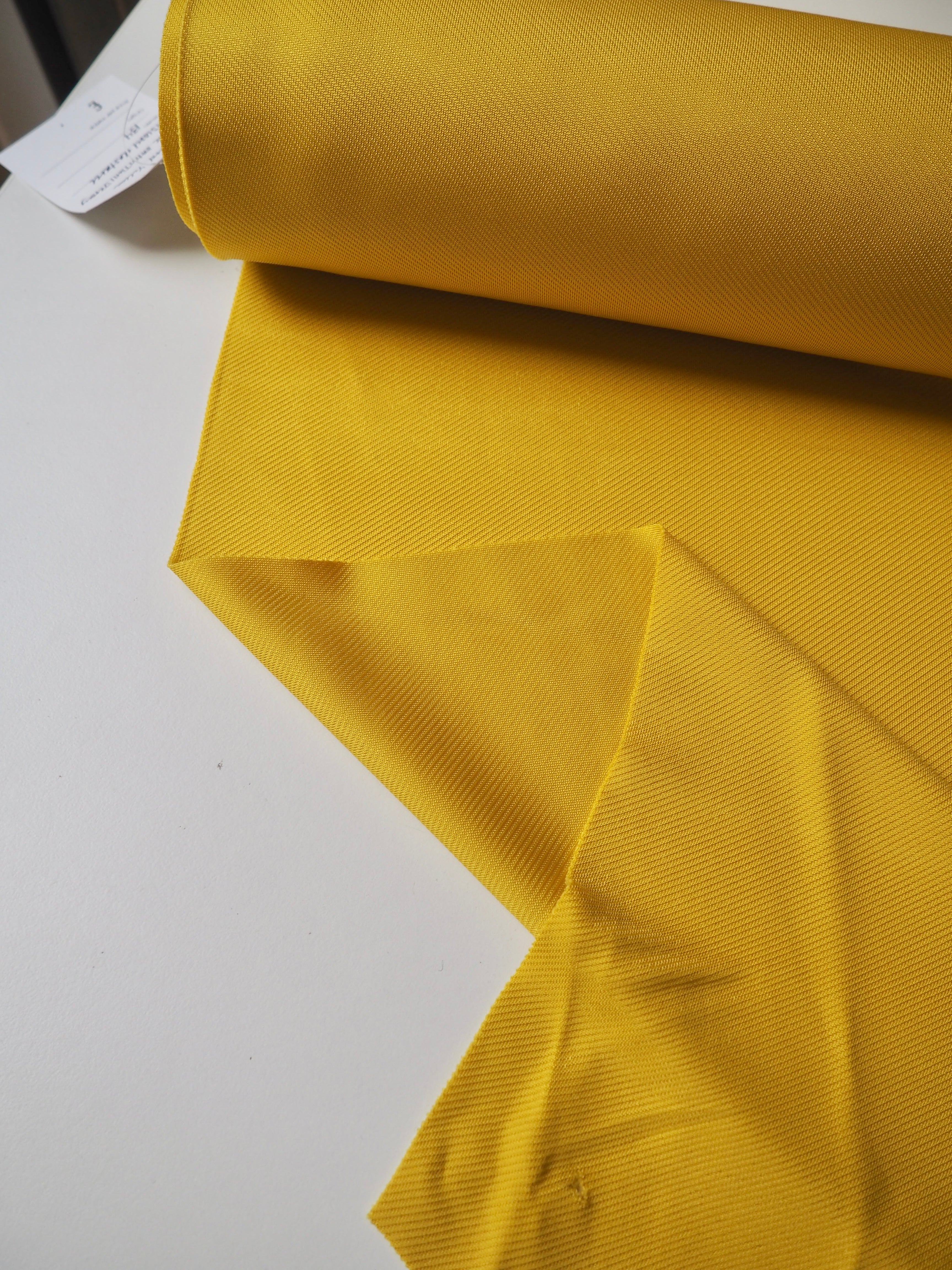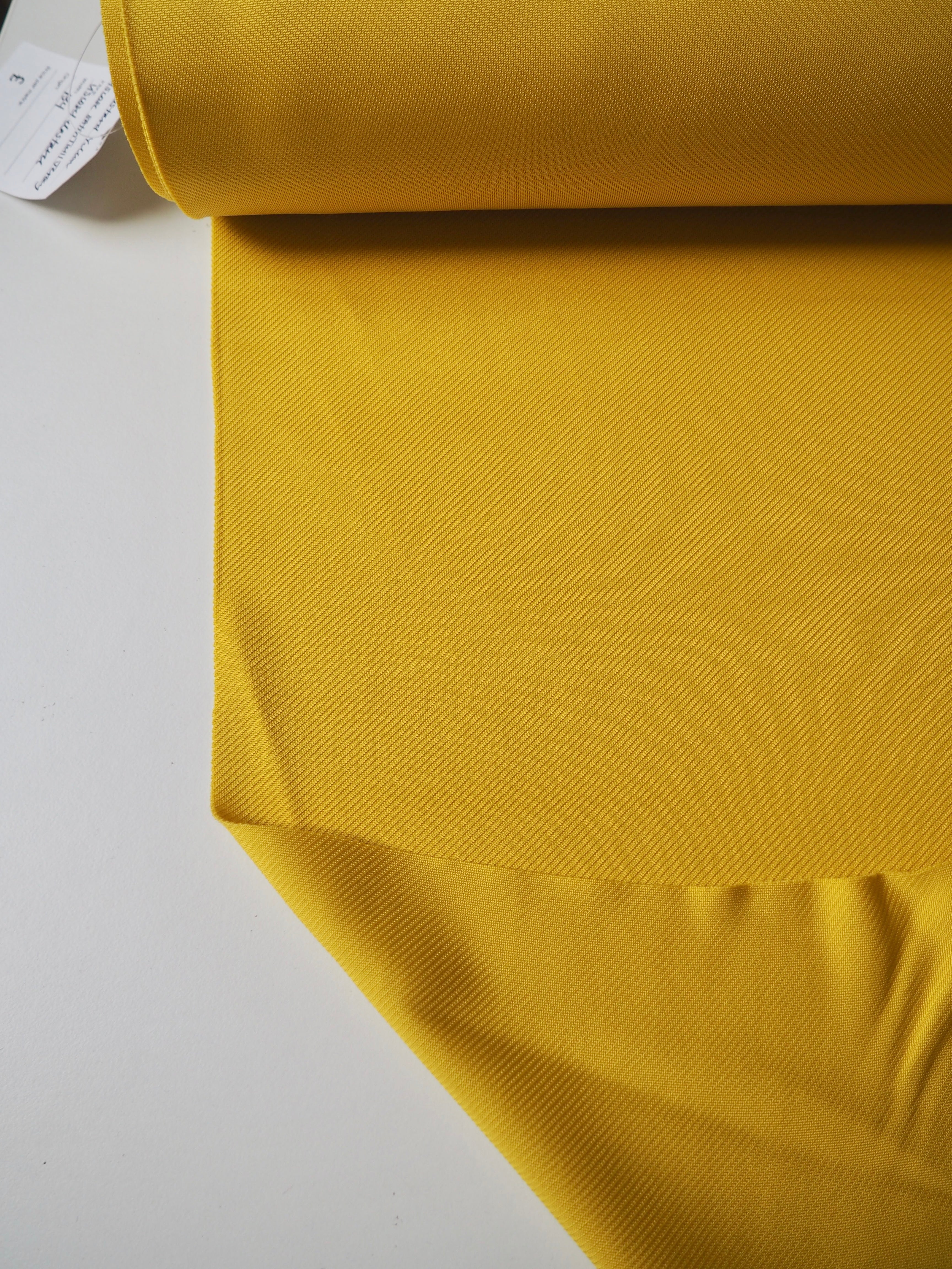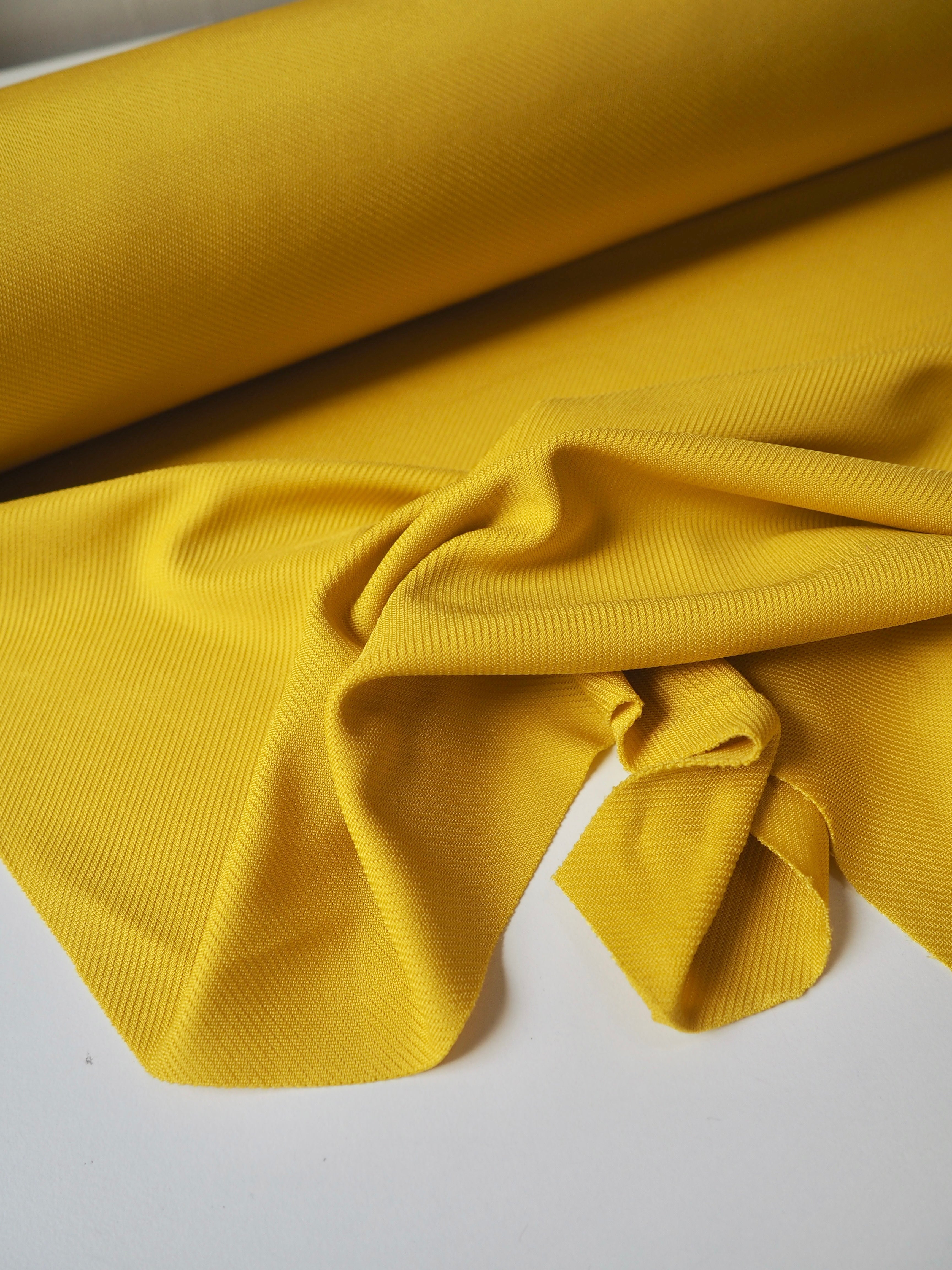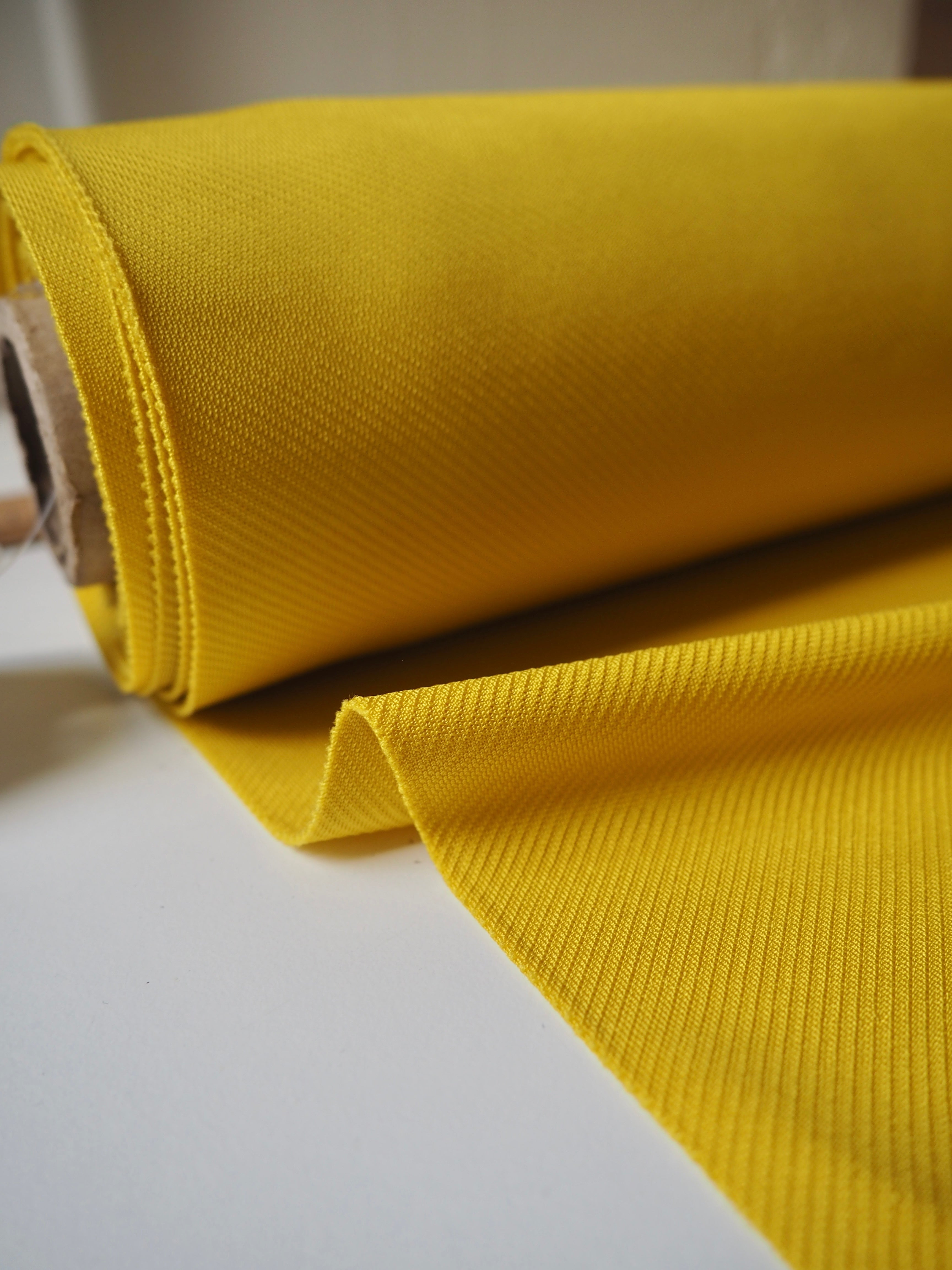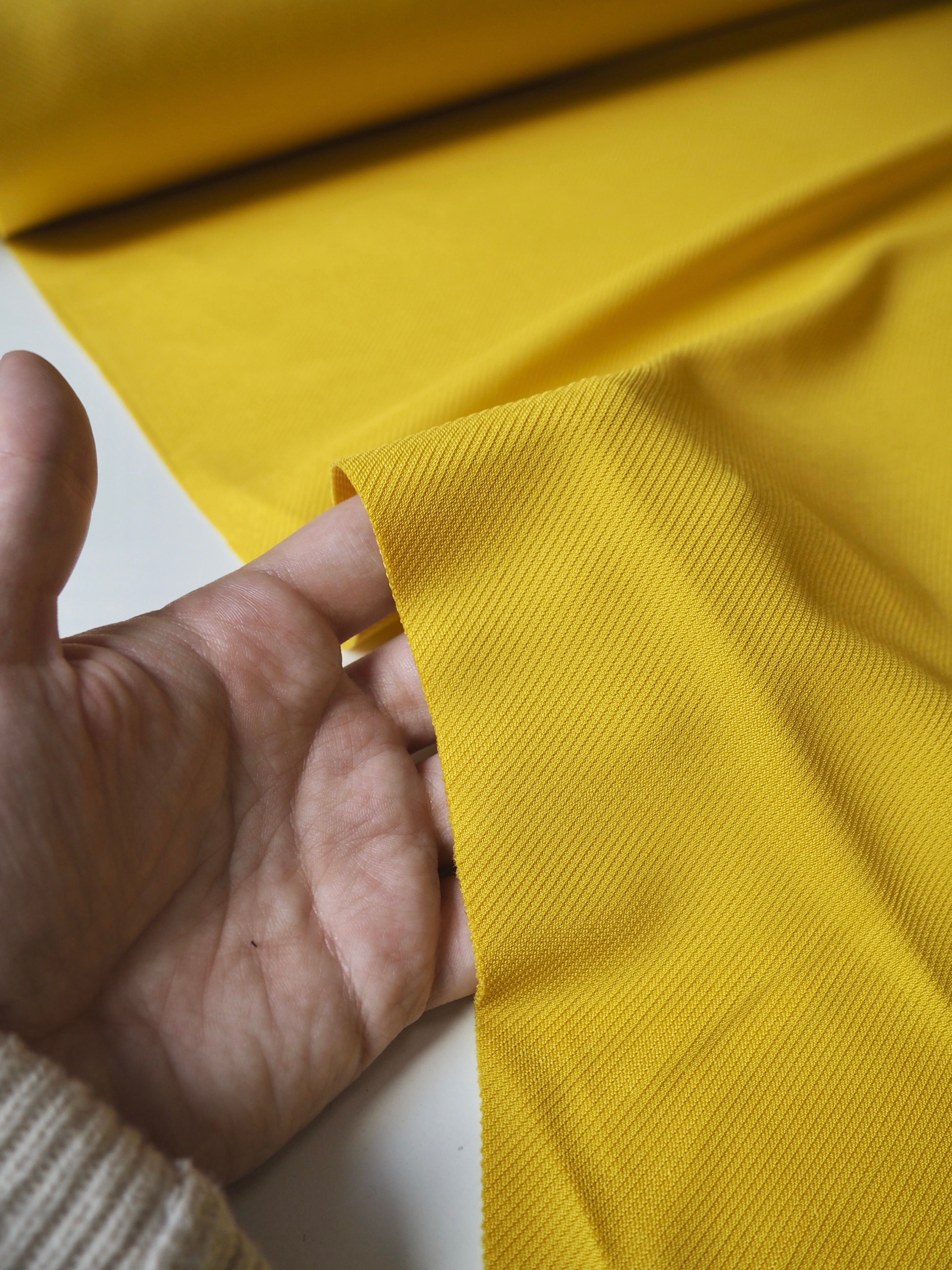 This ex-designer fabric is a jersey. It has a twill knit structure, which gives it an interesting texture and enhanced sheen. Completely opaque, quite slinky, with a lovely finish. Has a great drape and approximately 20% width-ways stretch, and slight length ways stretch. Perfect for an elevated basic!