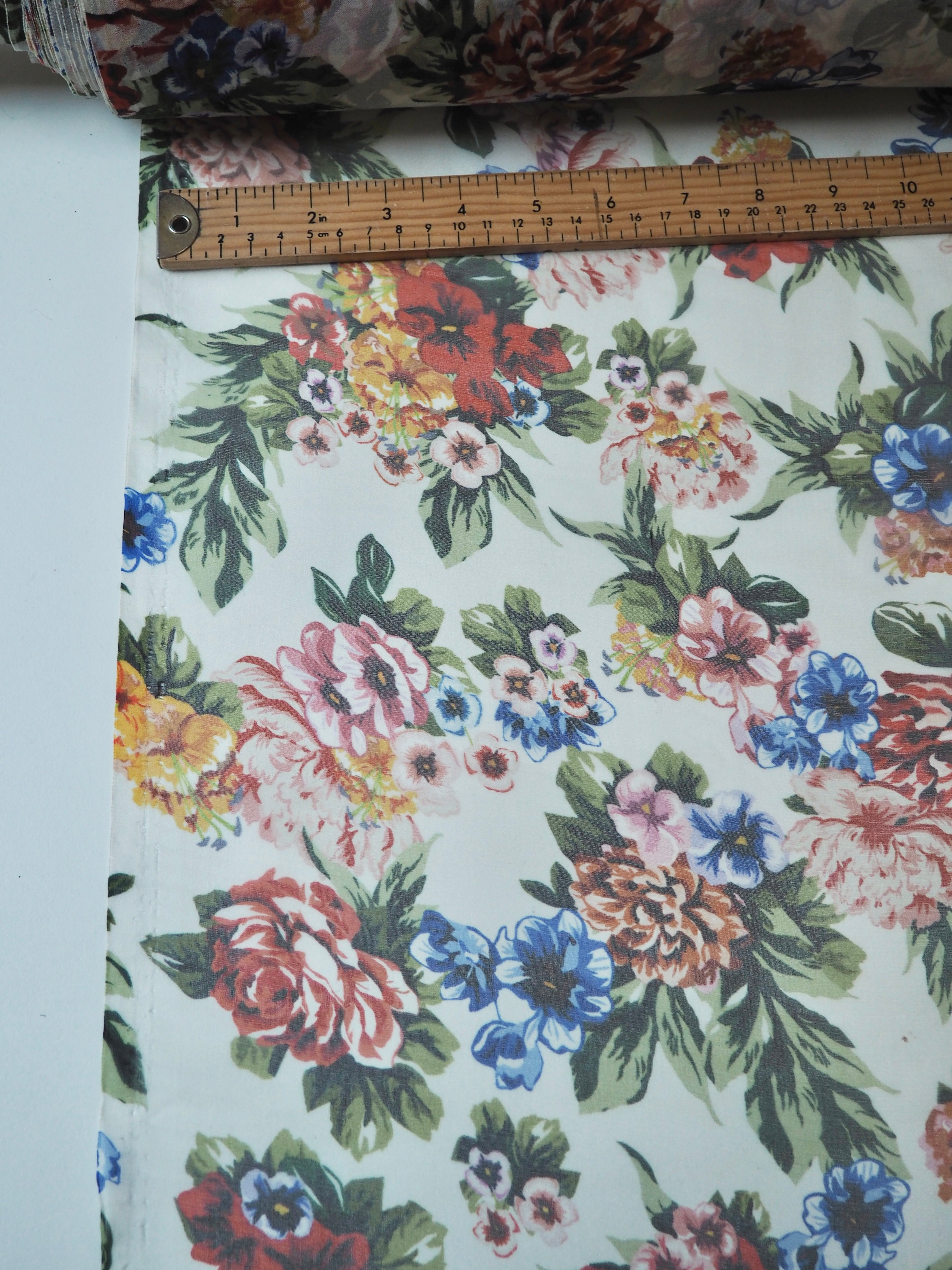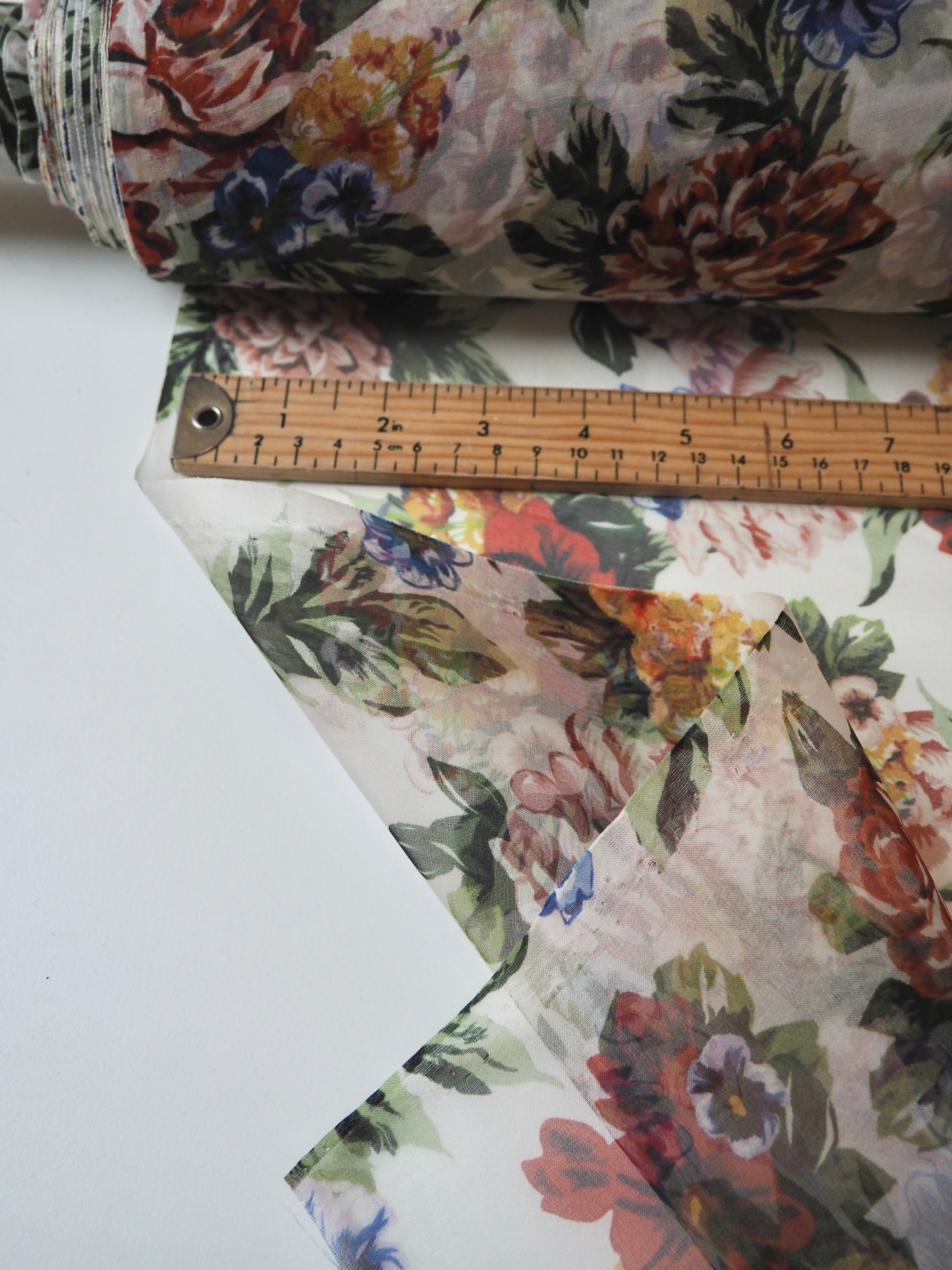 This ex-designer fabric is a silk organza. A bright mix of colours print into flowers on the organza. It was a bespoke print for the London-based designer. It has a beautiful sheen finish that catches the light as it moves. Sheer, with a luxurious handle and lovely structure. Perfect for use in occasion wear, and it stands away from the body really well. Also great for simple tops, sheer scrunchies, and overlays!