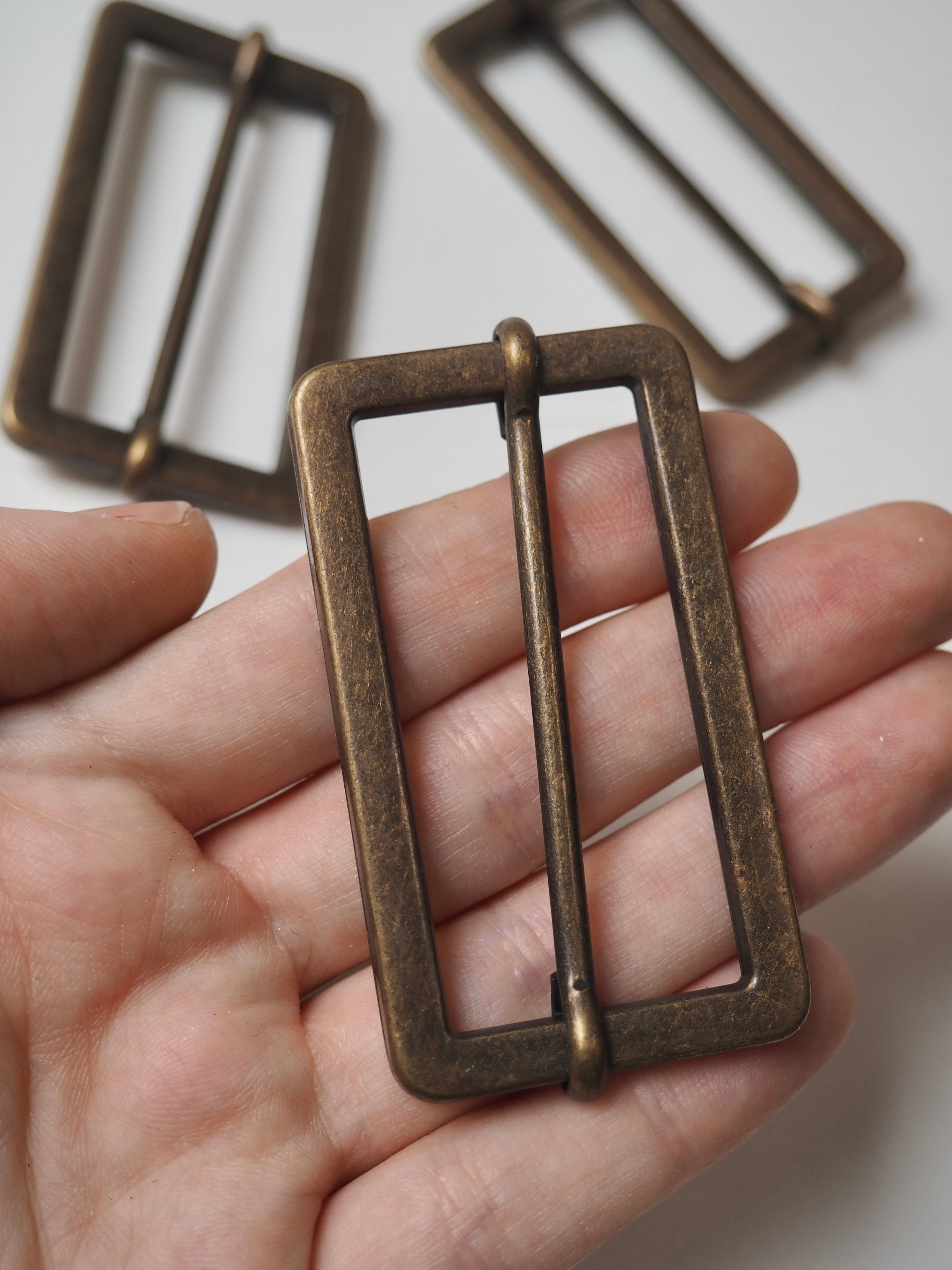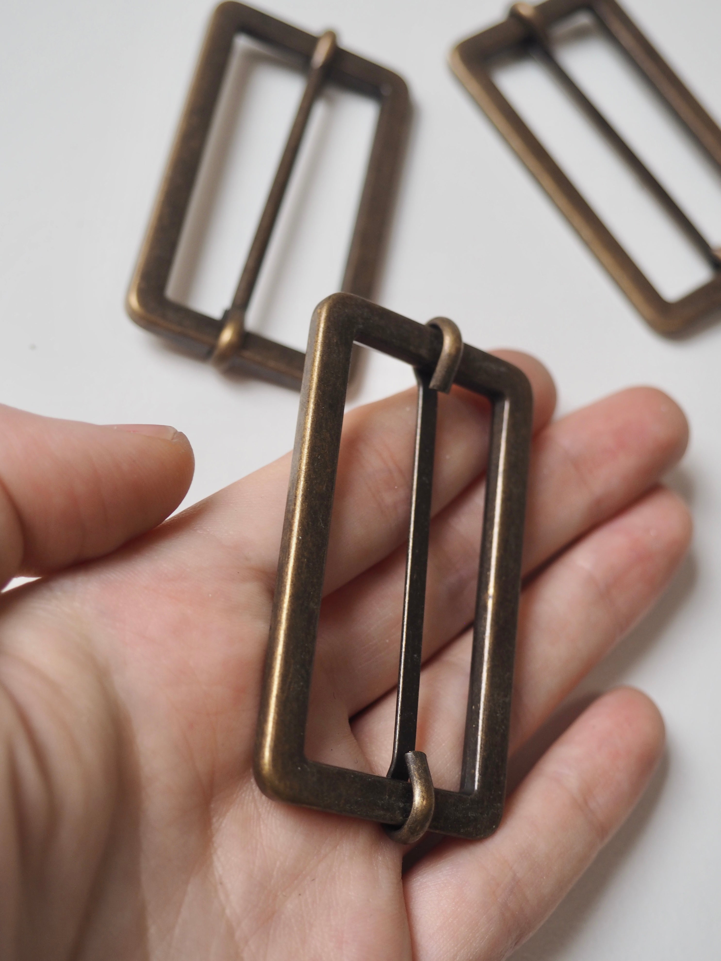 This ex-designer hardware is a slider. It's lightweight and has a sliding central bar for adjustments. They could be used for coats, dresses, jumpsuits, or accessories - they're great for adding an extra detail to your me-mades.