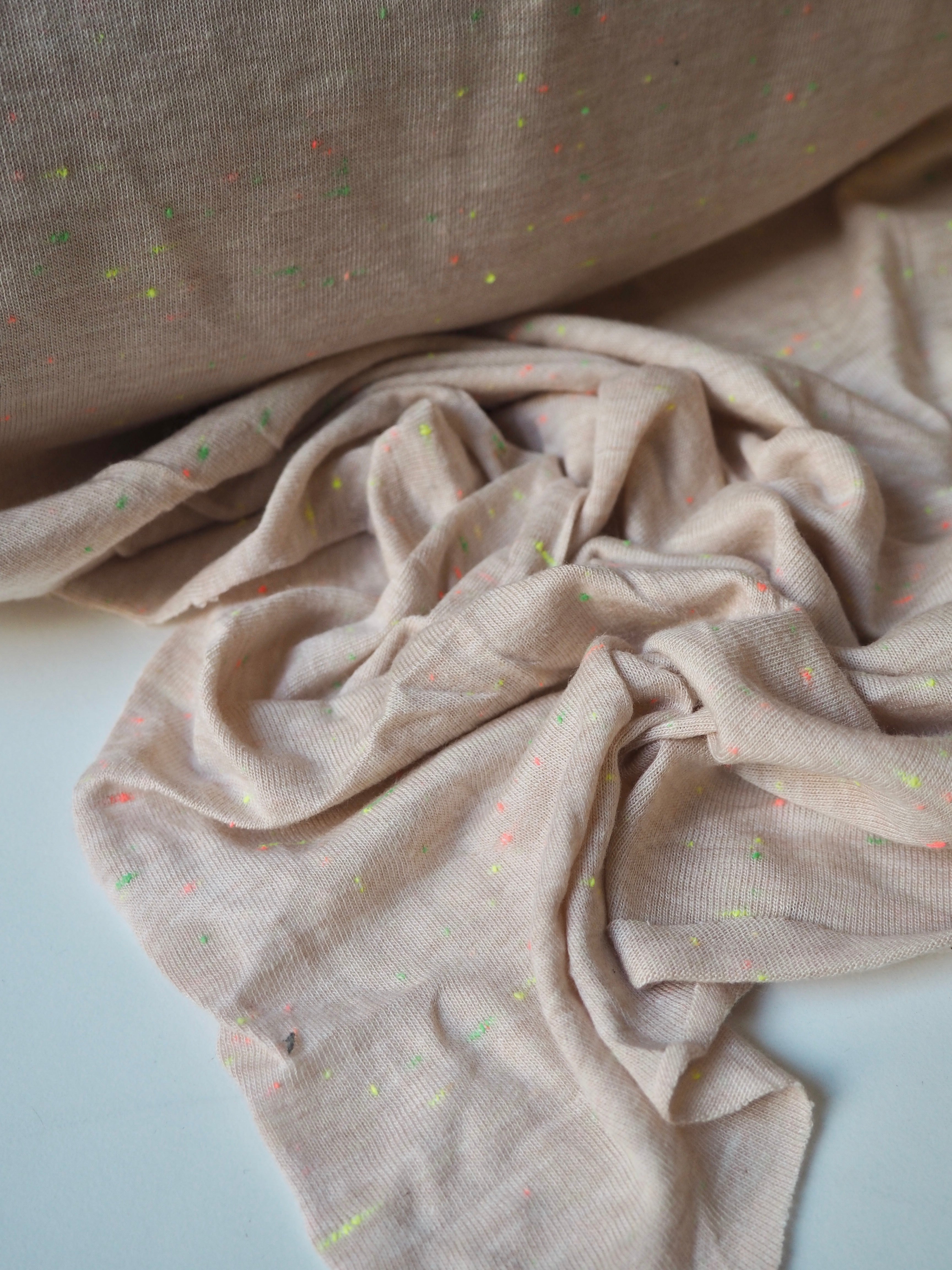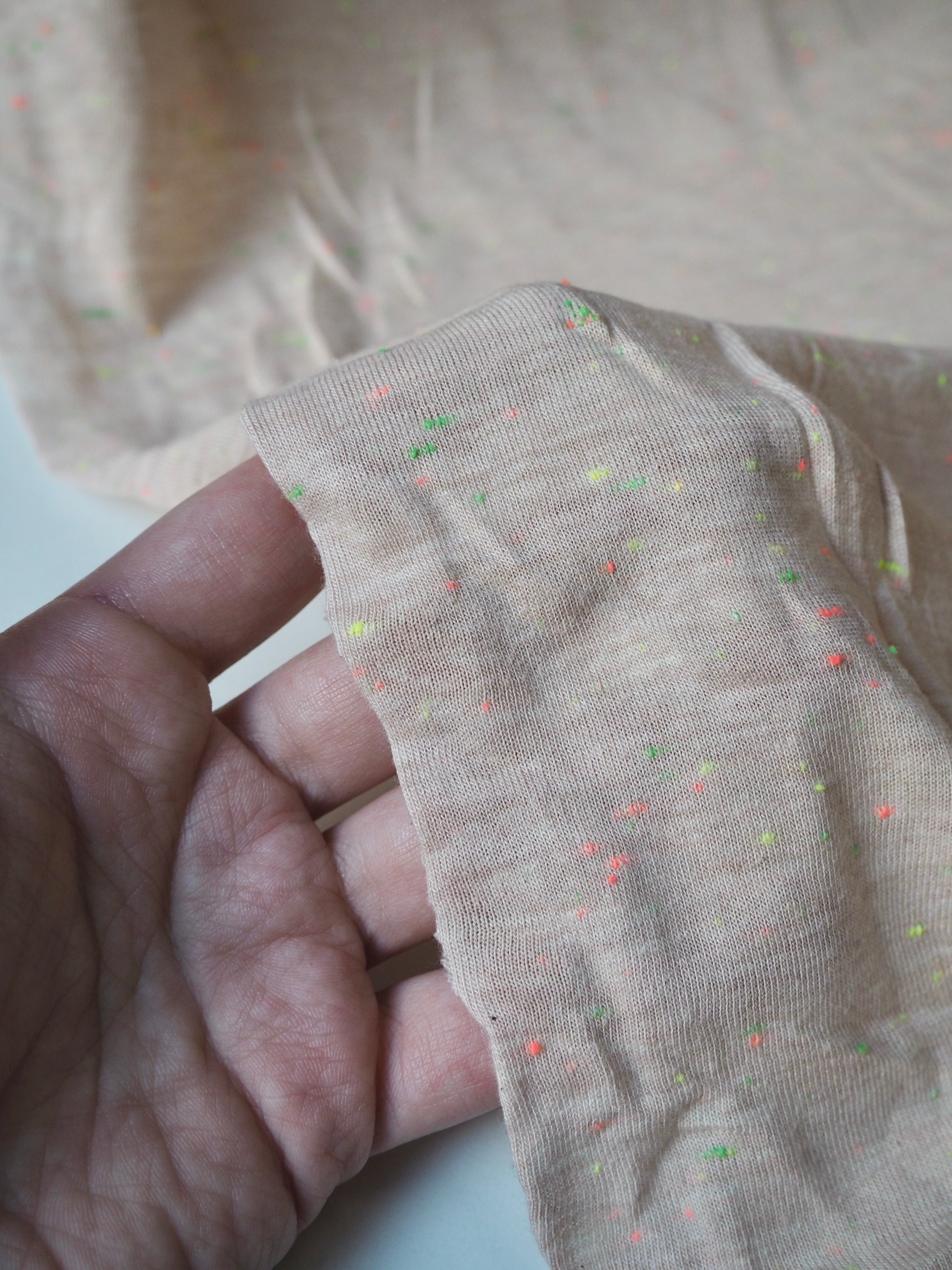 This ex-designer fabric is a cotton jersey. It's in a fun confetti dotted colourway on a blush apricot background. It is lightweight with a soft, gentle drape. It has a single jersey t-shirt weave with a 30-40% stretch width-ways, and about 10% length ways. Mostly opaque but a little sheer due to colour, and ideal for everyday basics, would make a great classic t-shirt! From British designer Stalf Studio.