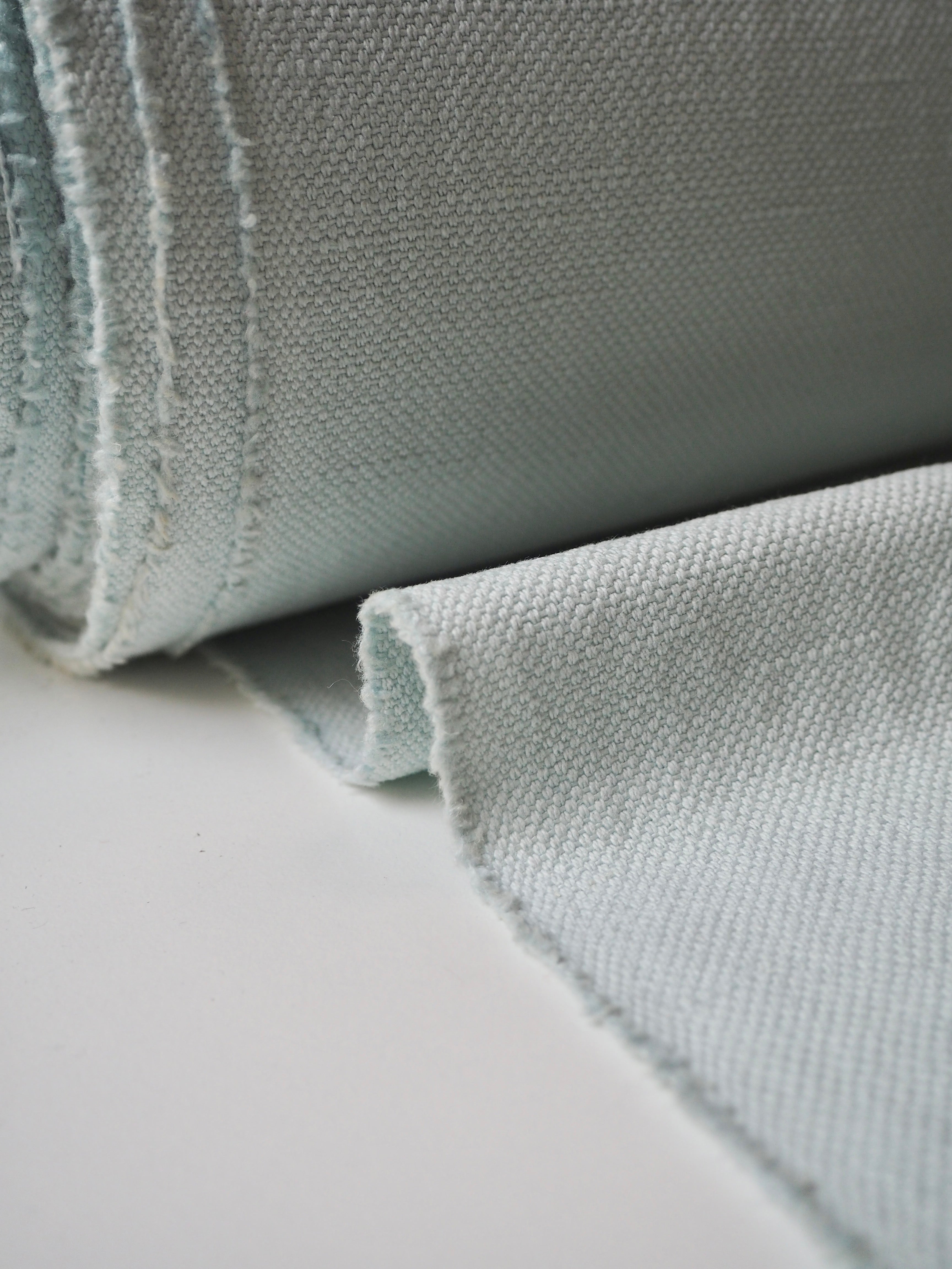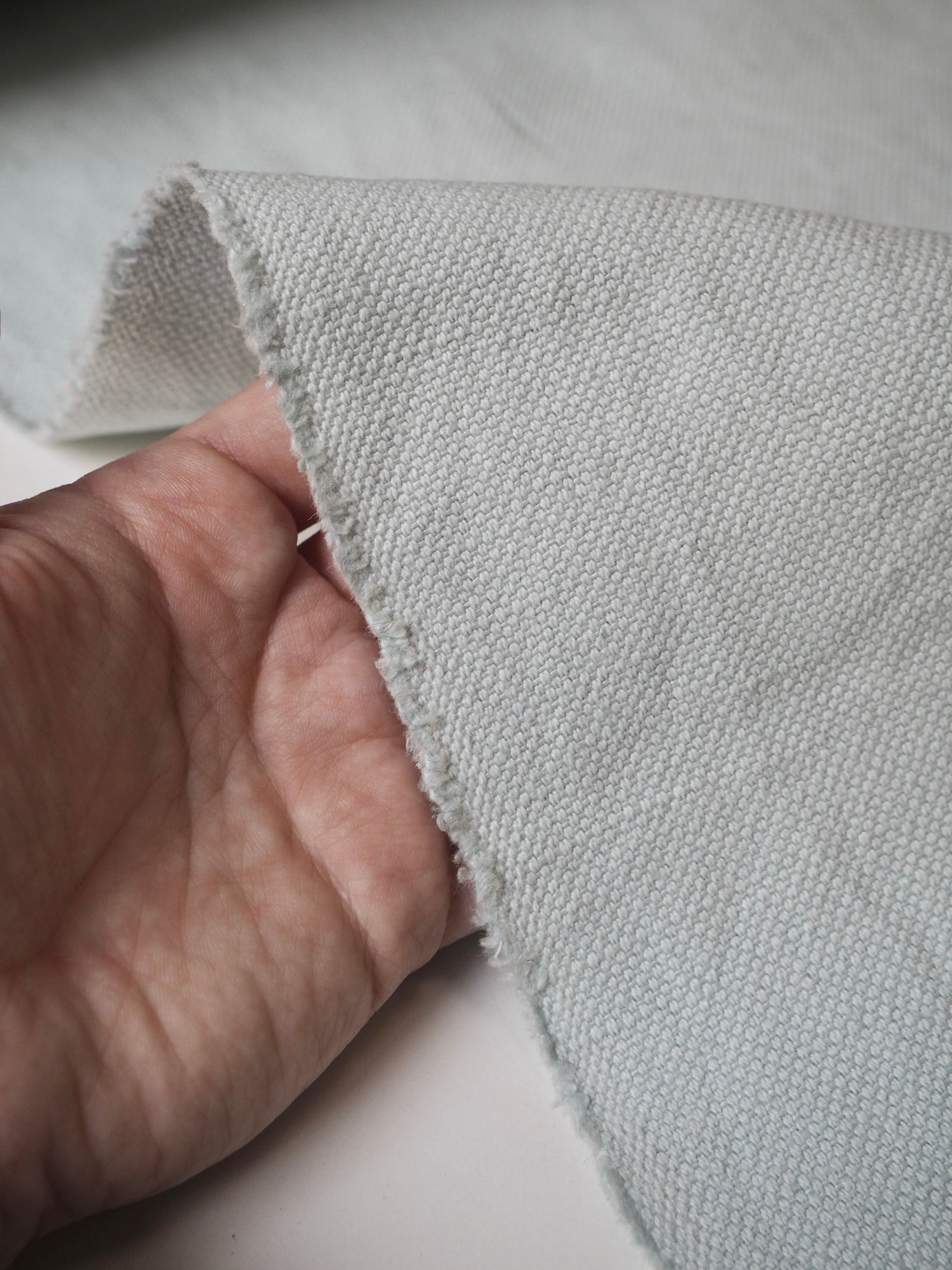 This ex-designer fabric is a linen/cotton. It's a strong basketweave cloth, with a great texture in a medium to heavy weight. It has the same texture and similar weave to a canvas. Made in a balanced cotton and linen blend. Very soft and fully opaque. In an aqua light blue colour. Has a great structure, perfect for a jumpsuit or jacket! The designer, Stalf, use this to make jumpsuits!