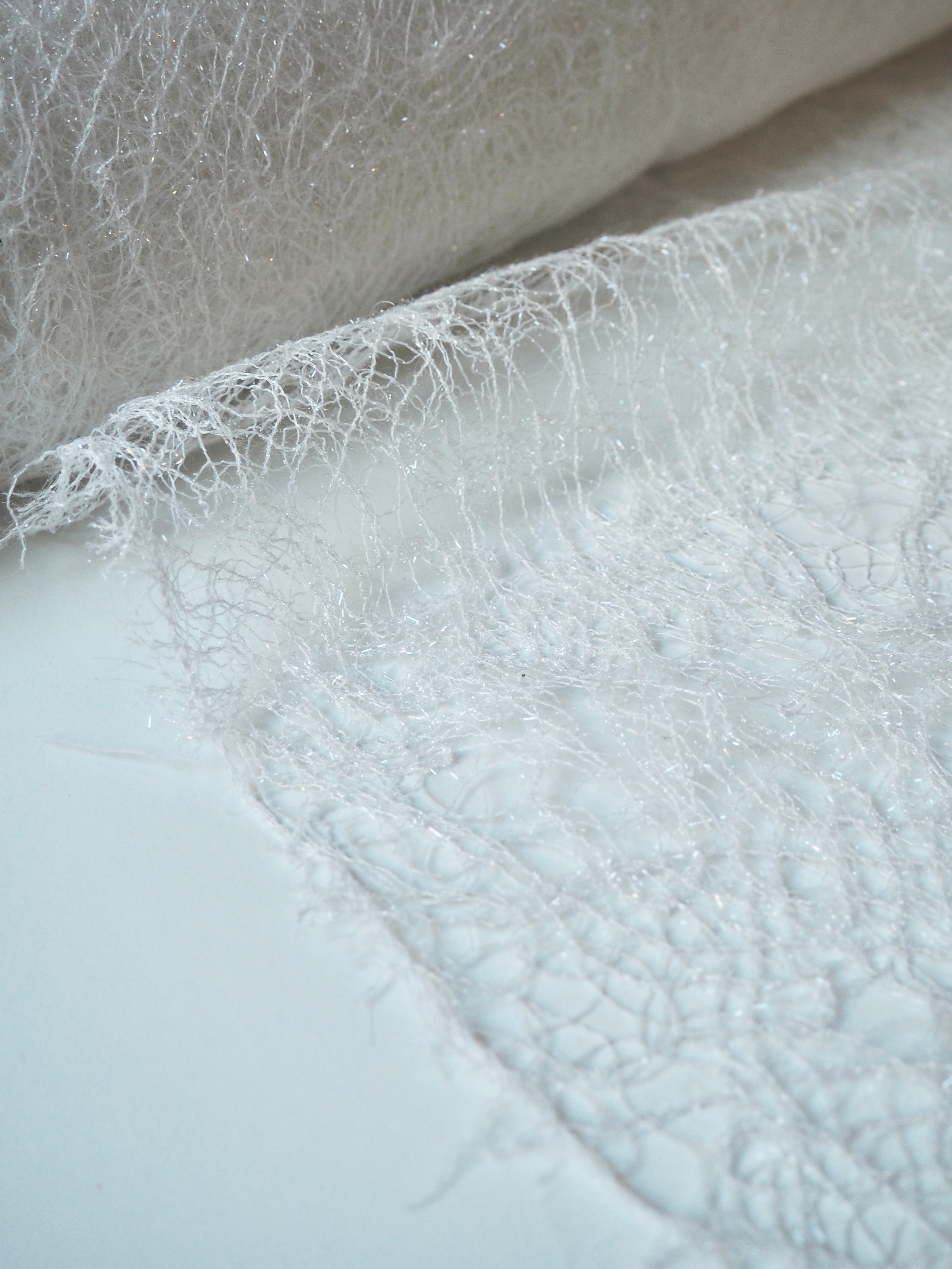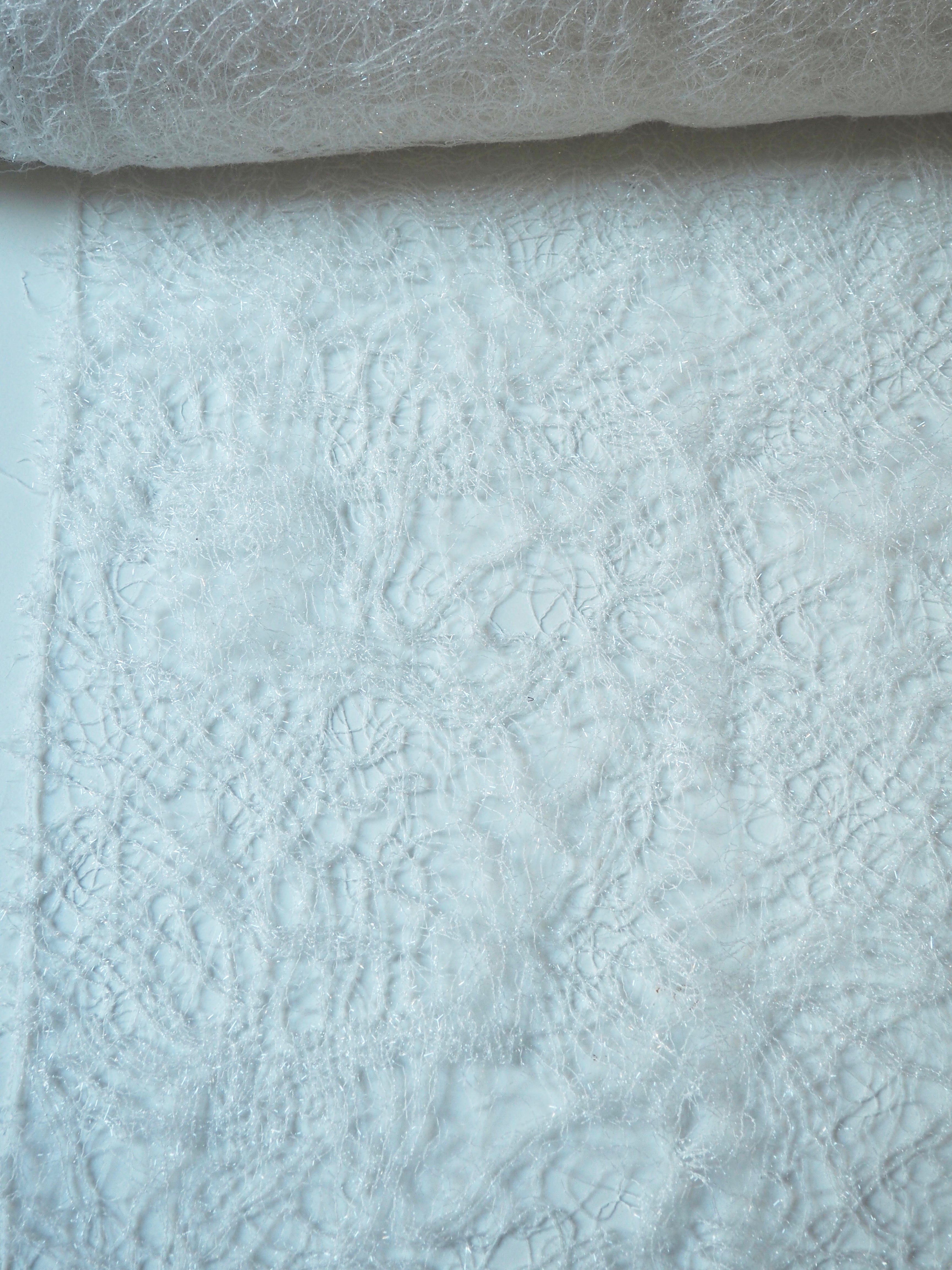 This incredible white lace fabric is made up of fine delicate strands of white and silver. With a subtle sparkle and a pure white colour, this would be perfect for a bodice or skirt overlay on a bridal dress. Amazing quality, unusual fabric. Sourced from a high-end bridal designer.