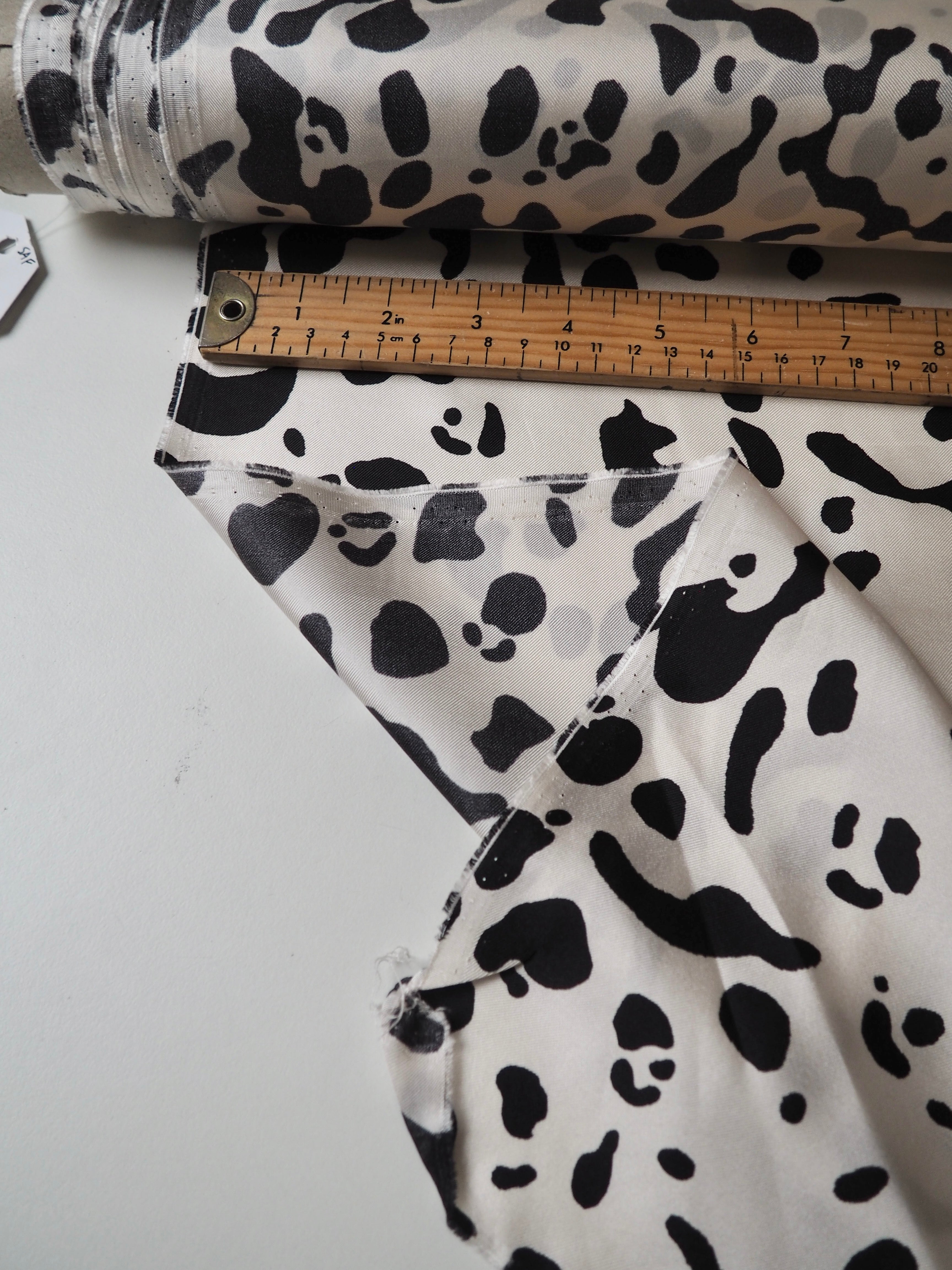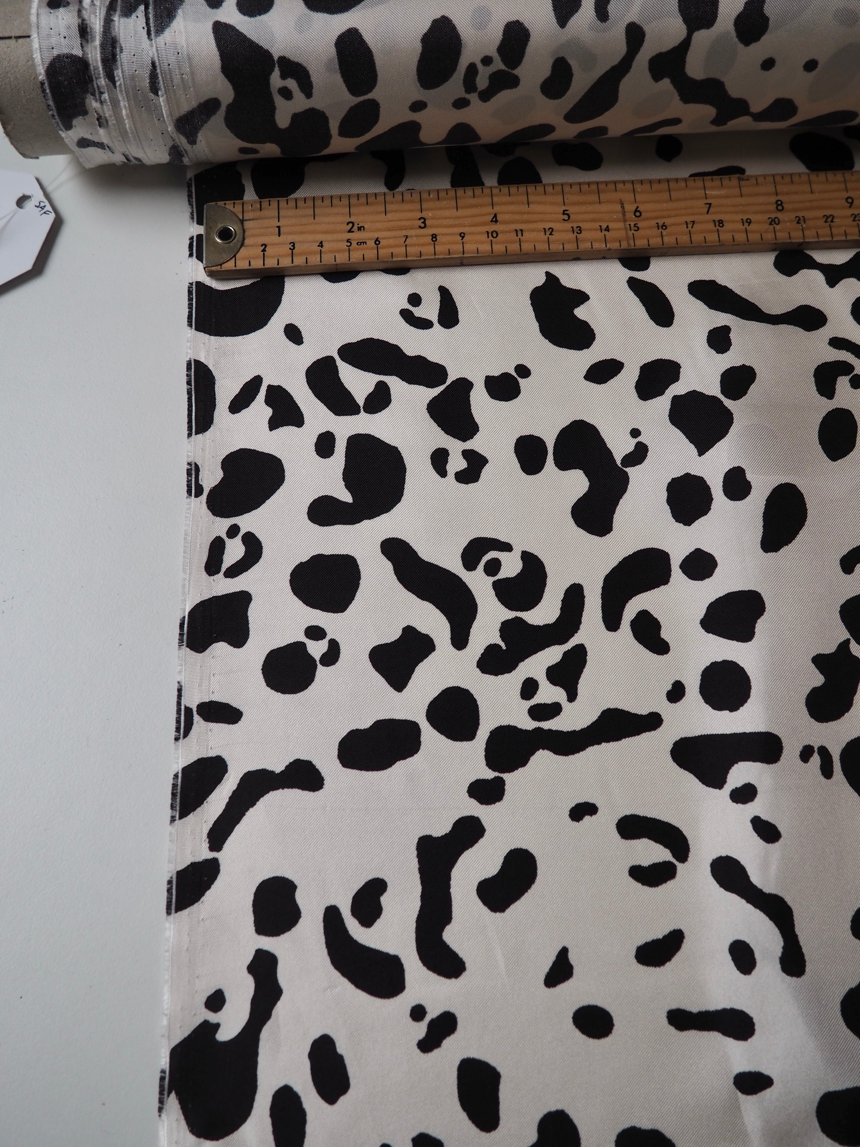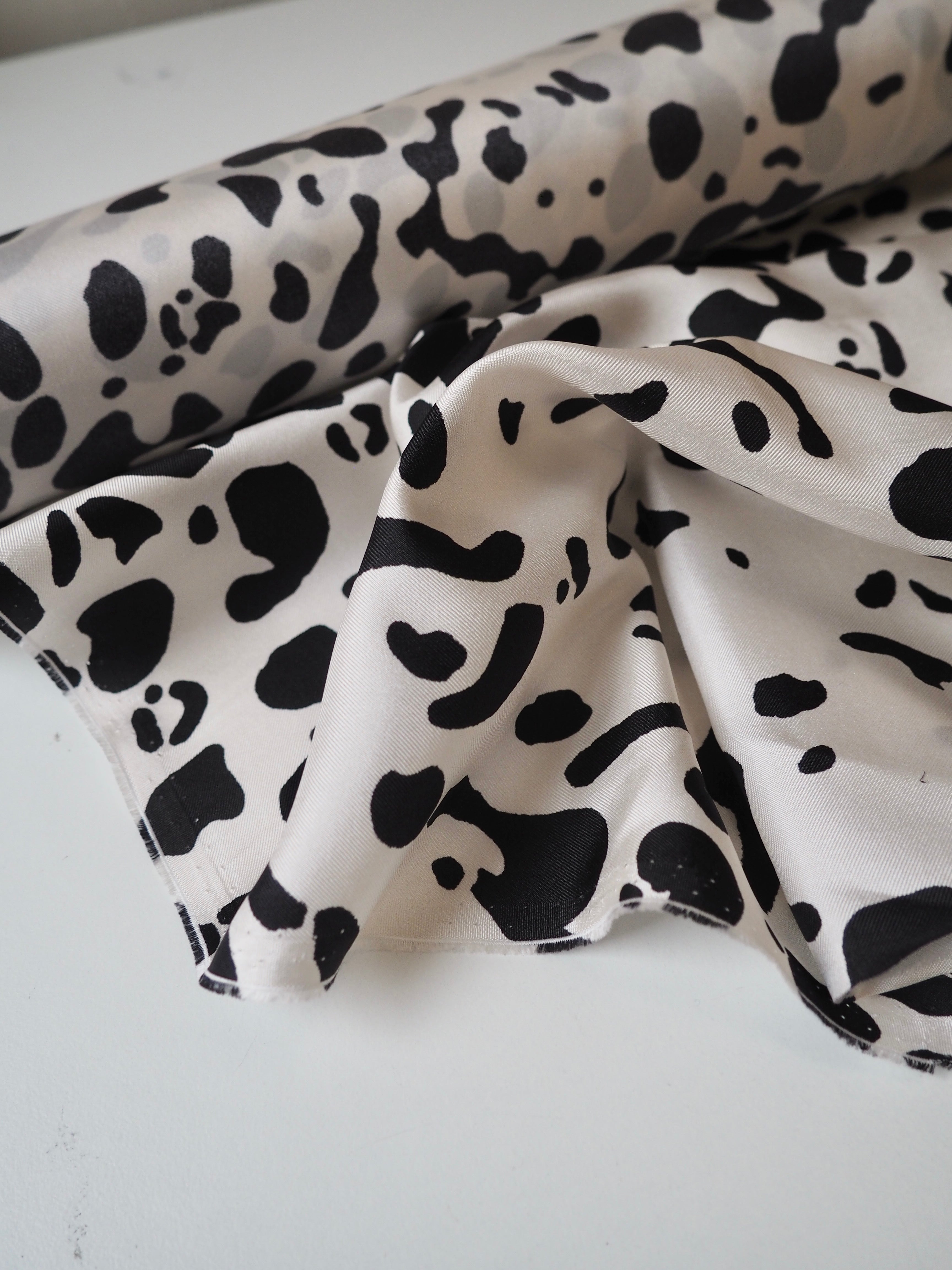 This ex-designer fabric is a silk twill. It's in a lovely white and black animal print. It's bespoke from a London designer. It's slinky, mostly opaque, and very soft. It has an incredible satin sheen and beautiful movement. The twill weave gives it a crisp, strong handle. The perfect drapey silk for blouses or even a special lining!
