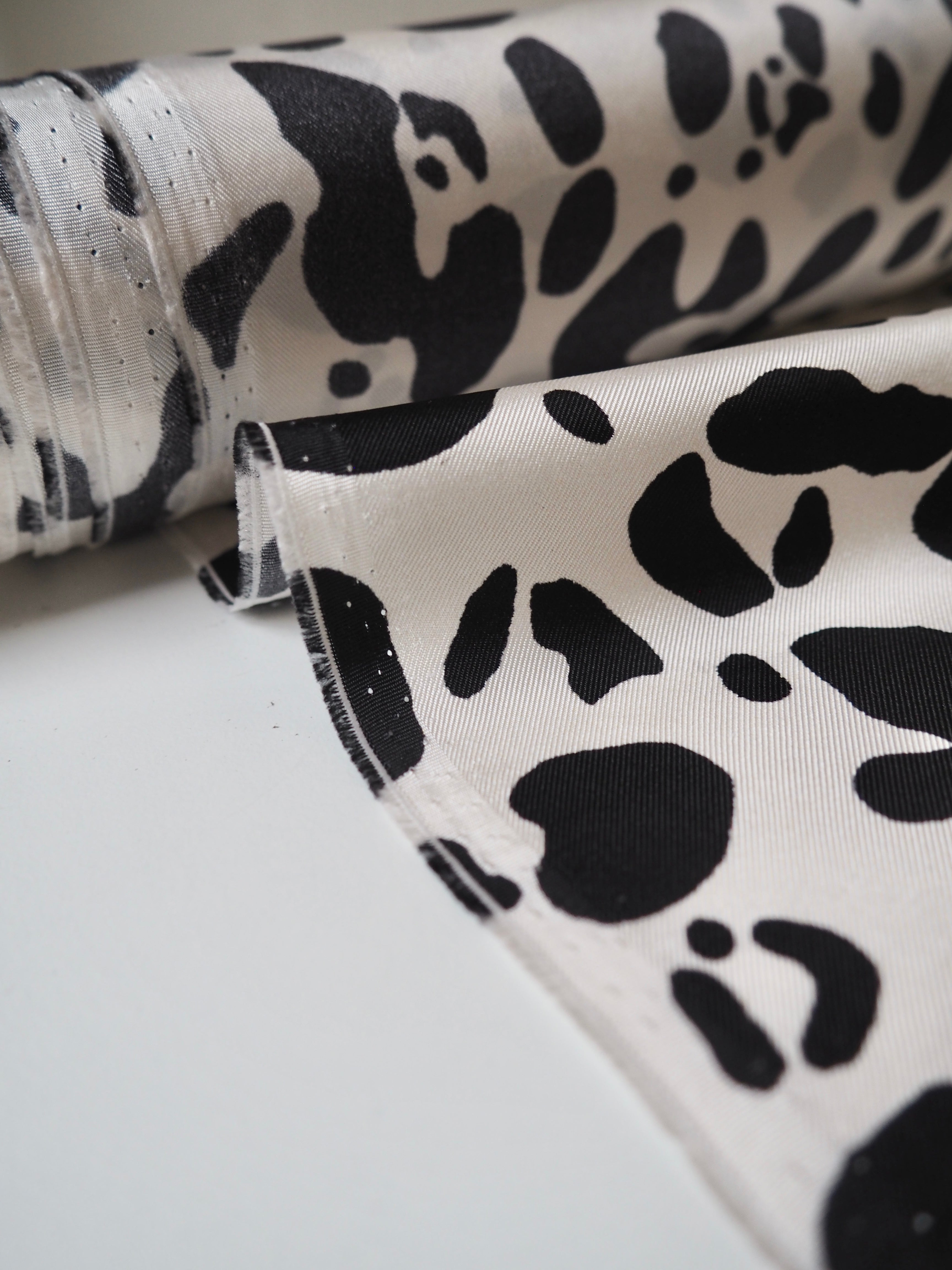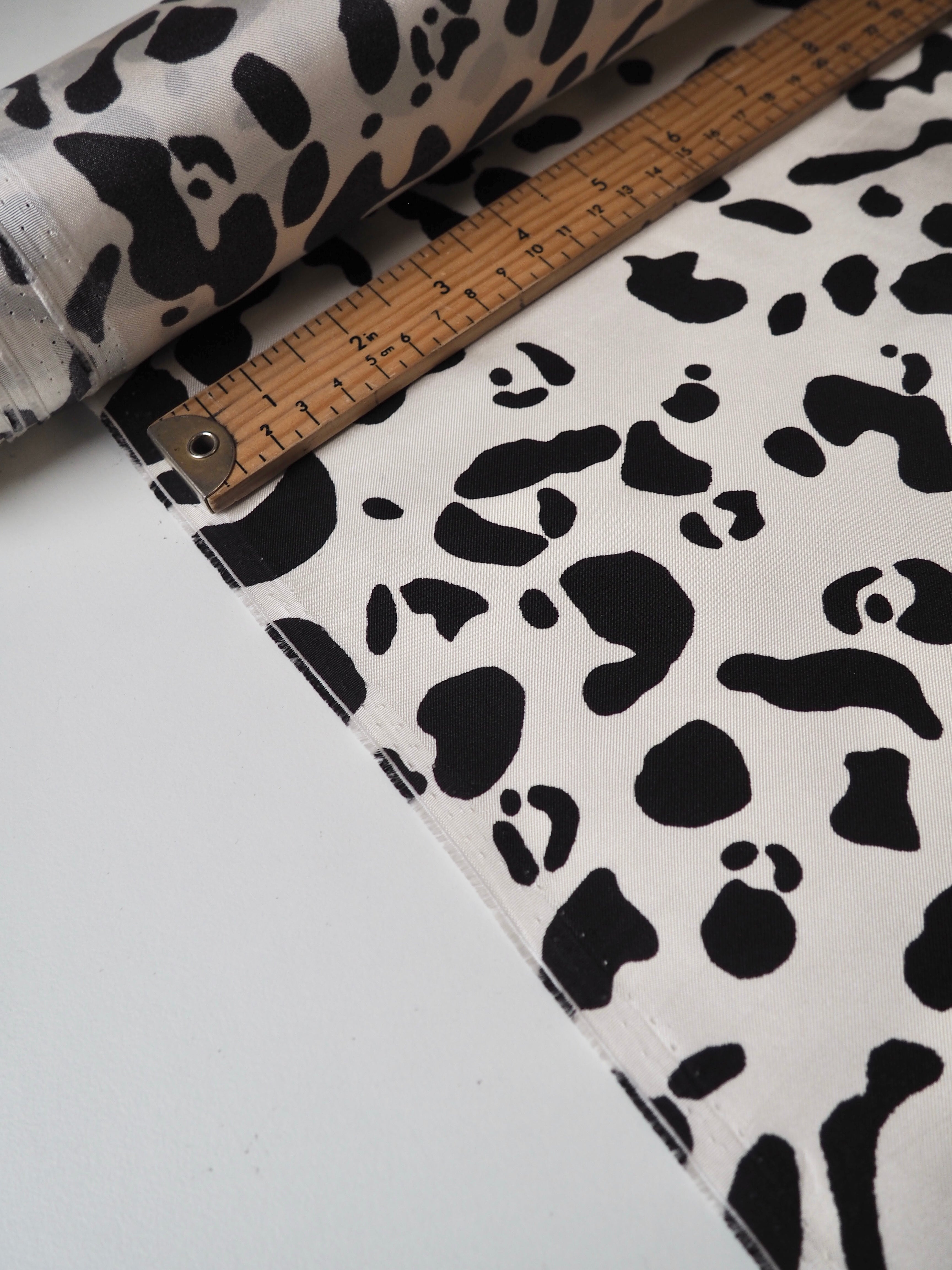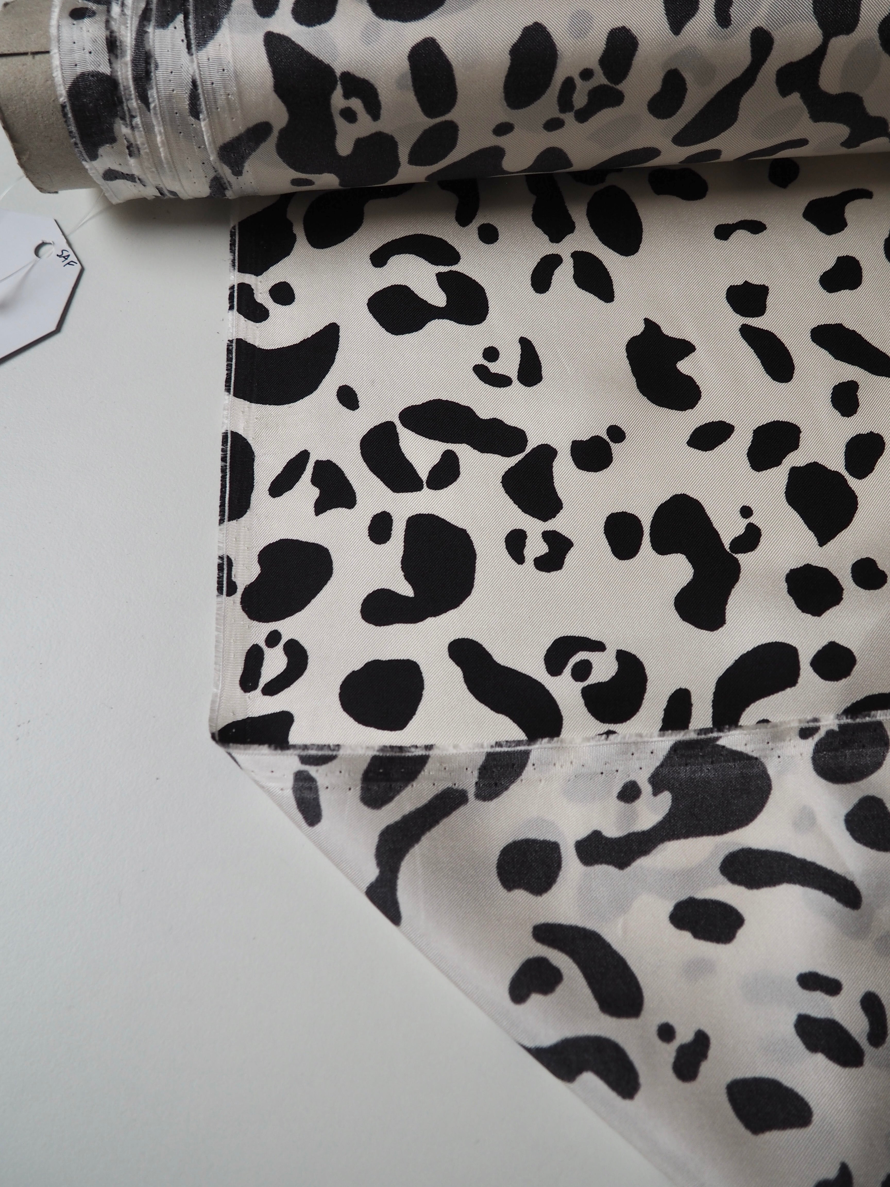 This ex-designer fabric is a silk twill. It's in a lovely white and black animal print. It's bespoke from a London designer. It's slinky, mostly opaque, and very soft. It has an incredible satin sheen and beautiful movement. The twill weave gives it a crisp, strong handle. The perfect drapey silk for blouses or even a special lining!