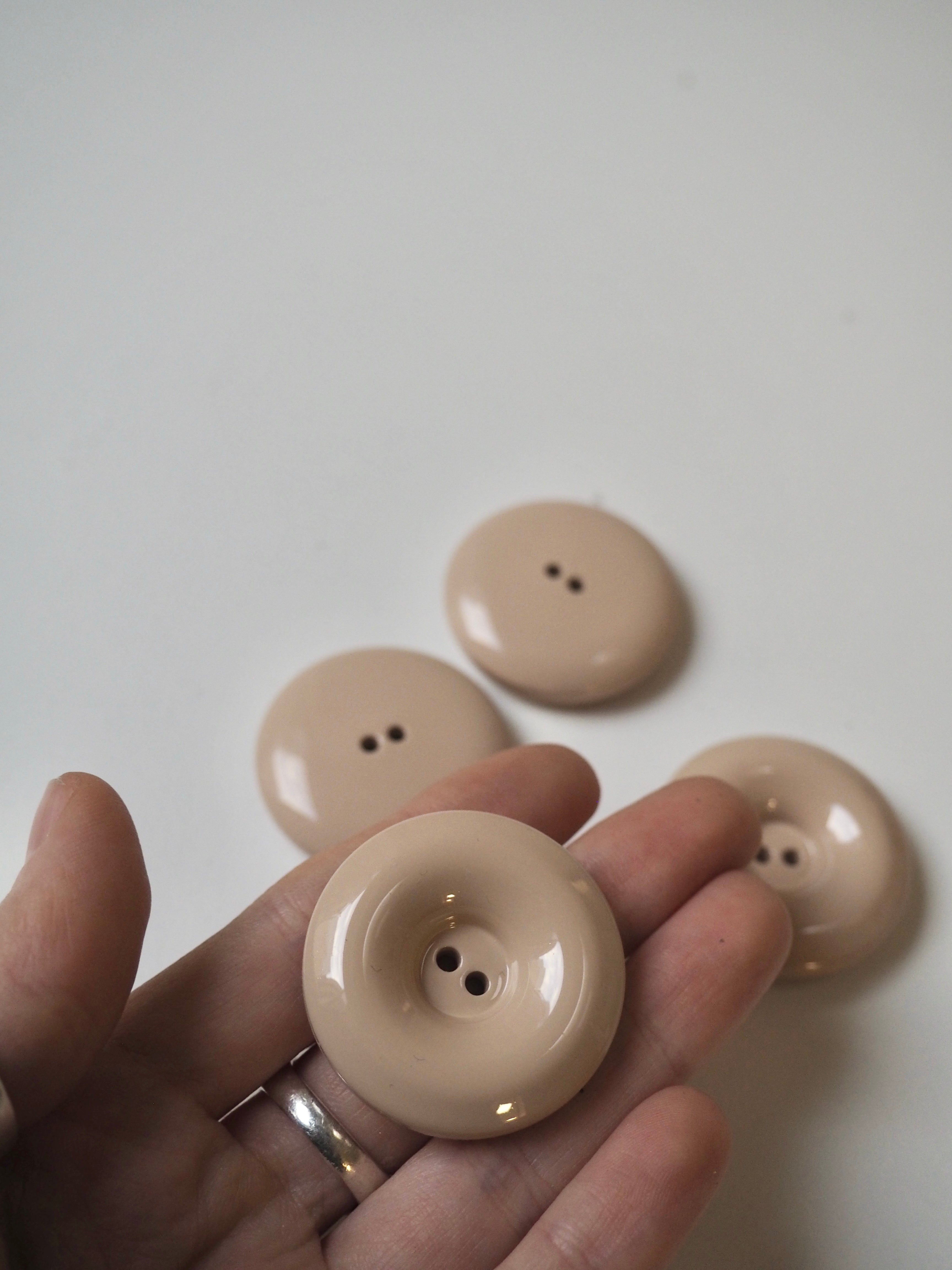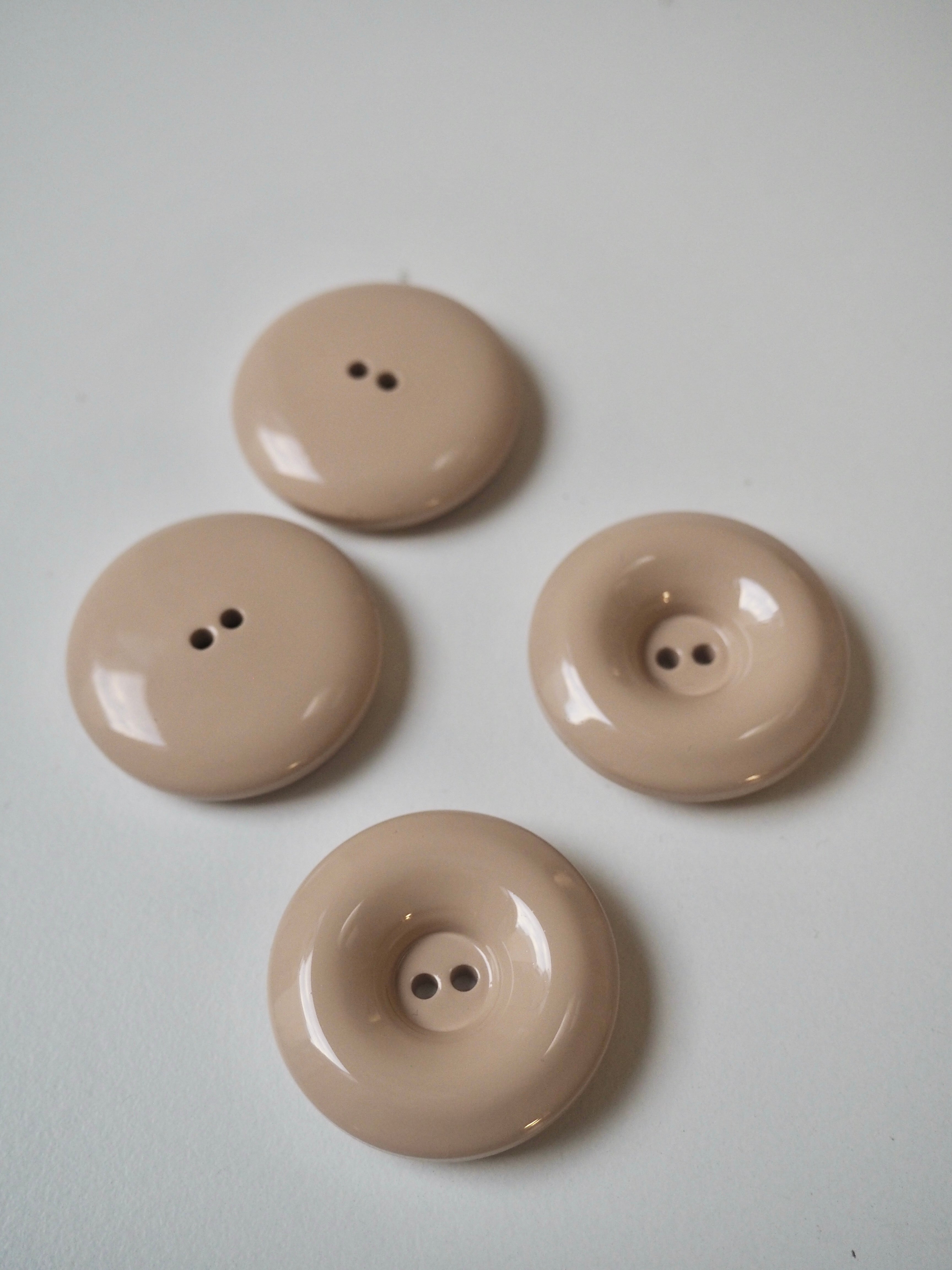 This ex-designer trim is a 2-hole plastic button. It has a shiny smooth finish and a large rounded rim. Perfect size for coats, jackets and cardigans.