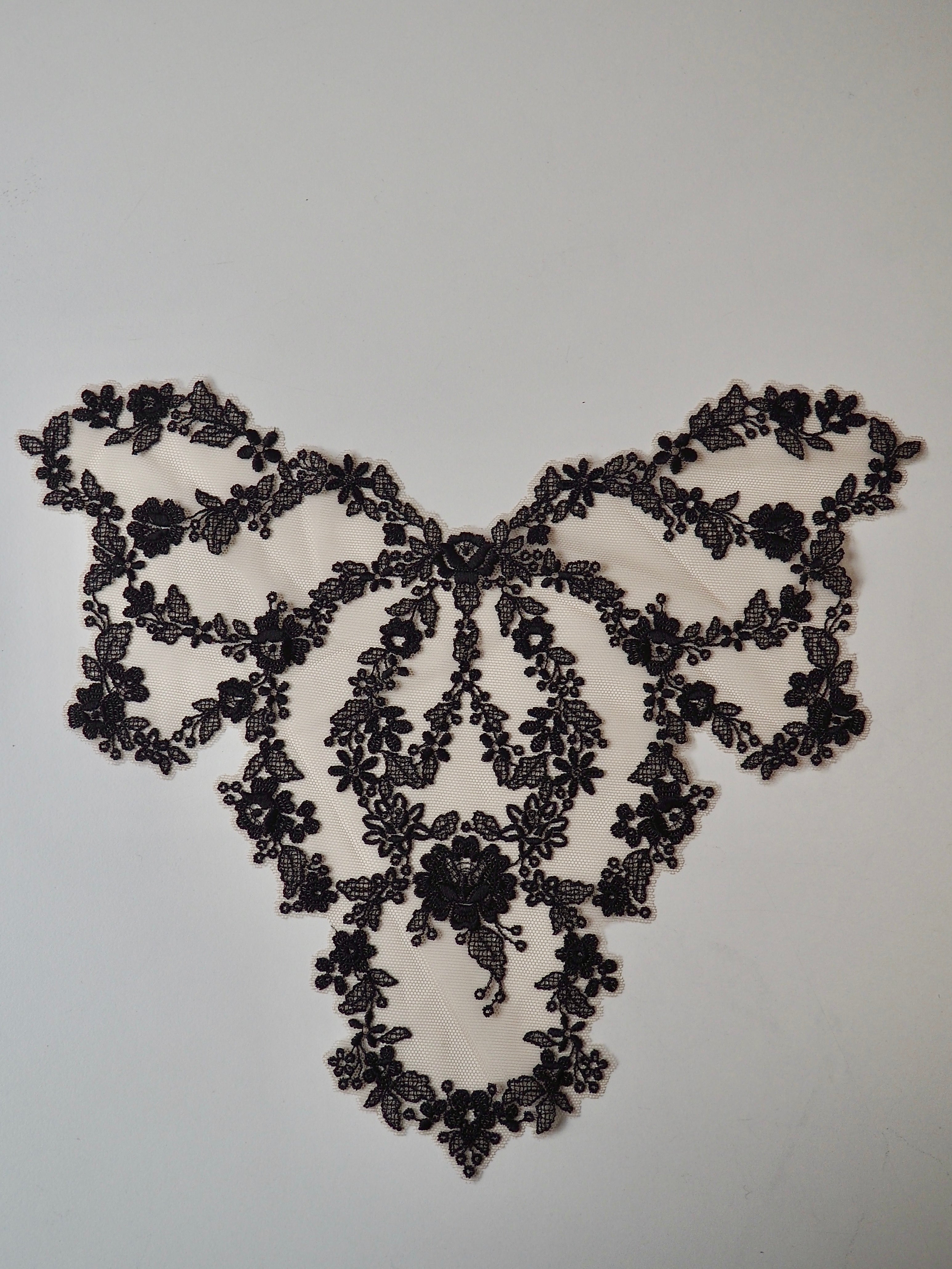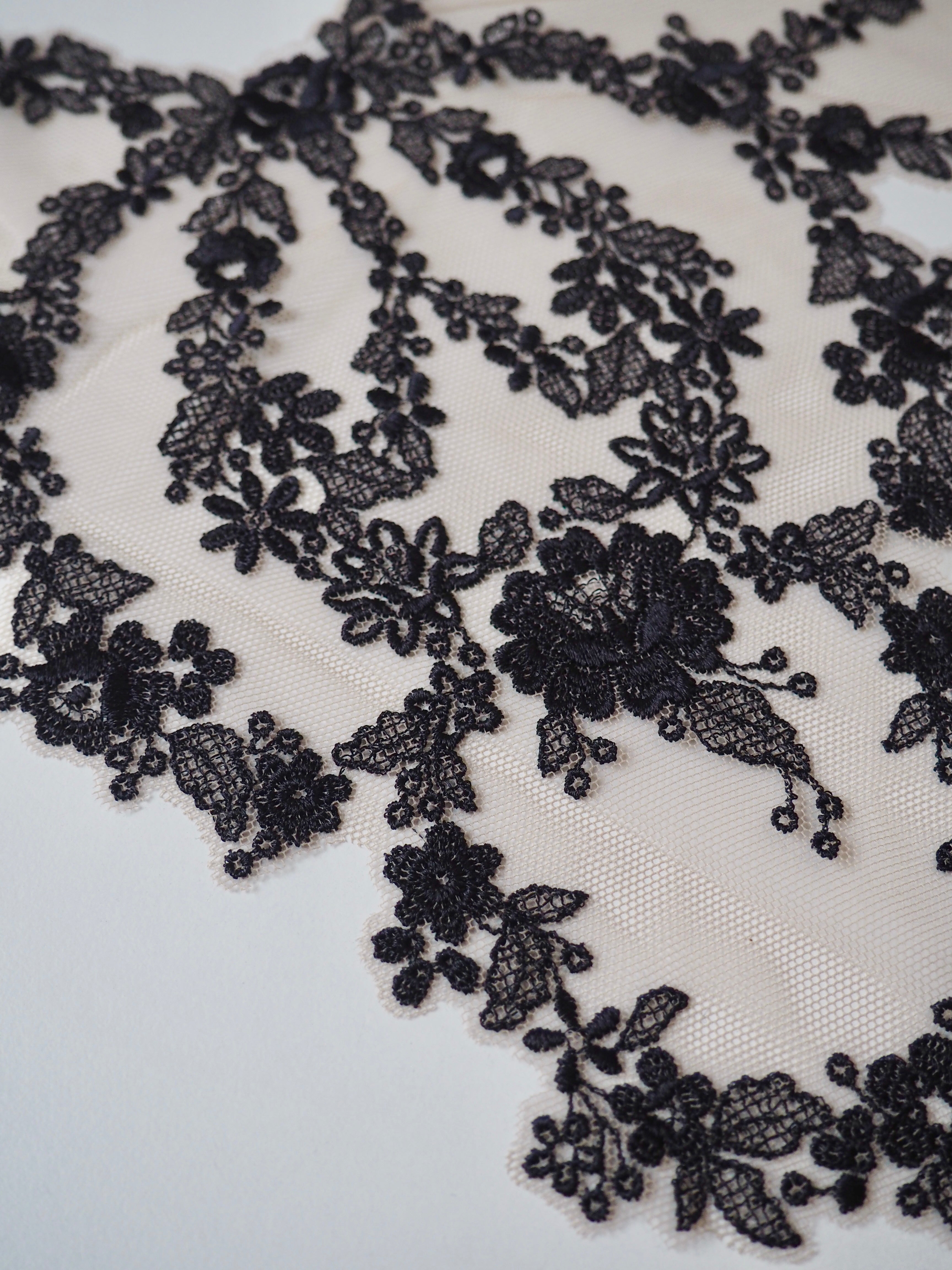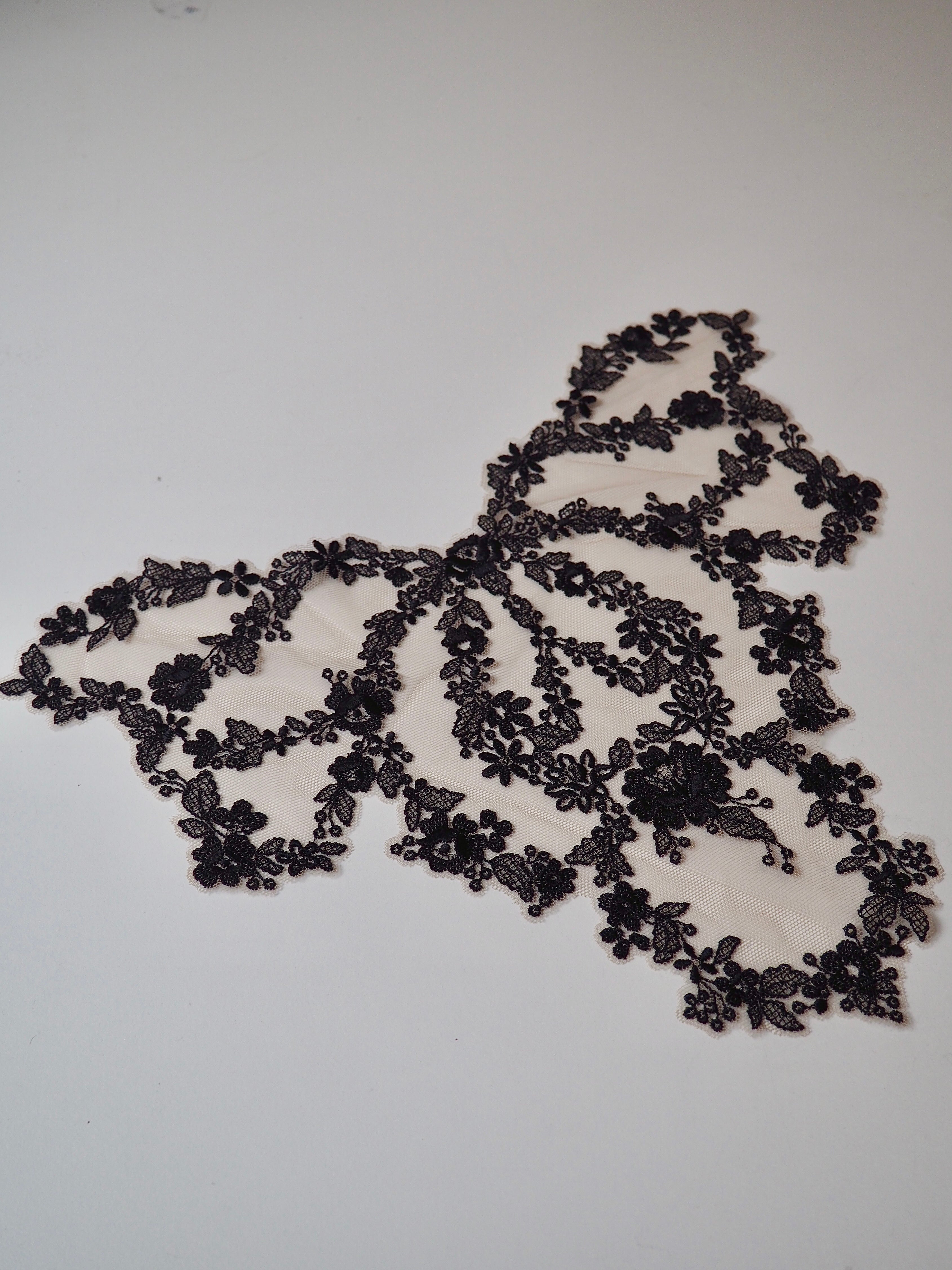 This ex-designer trim is a black floral lace design on a beige soft tulle base. The floral design loops into a sort of bow motif and would look gorgeous applied onto the bodice of a  garment. Perfect for lingerie, brief and bra making, but could also be used as trim on other garments.