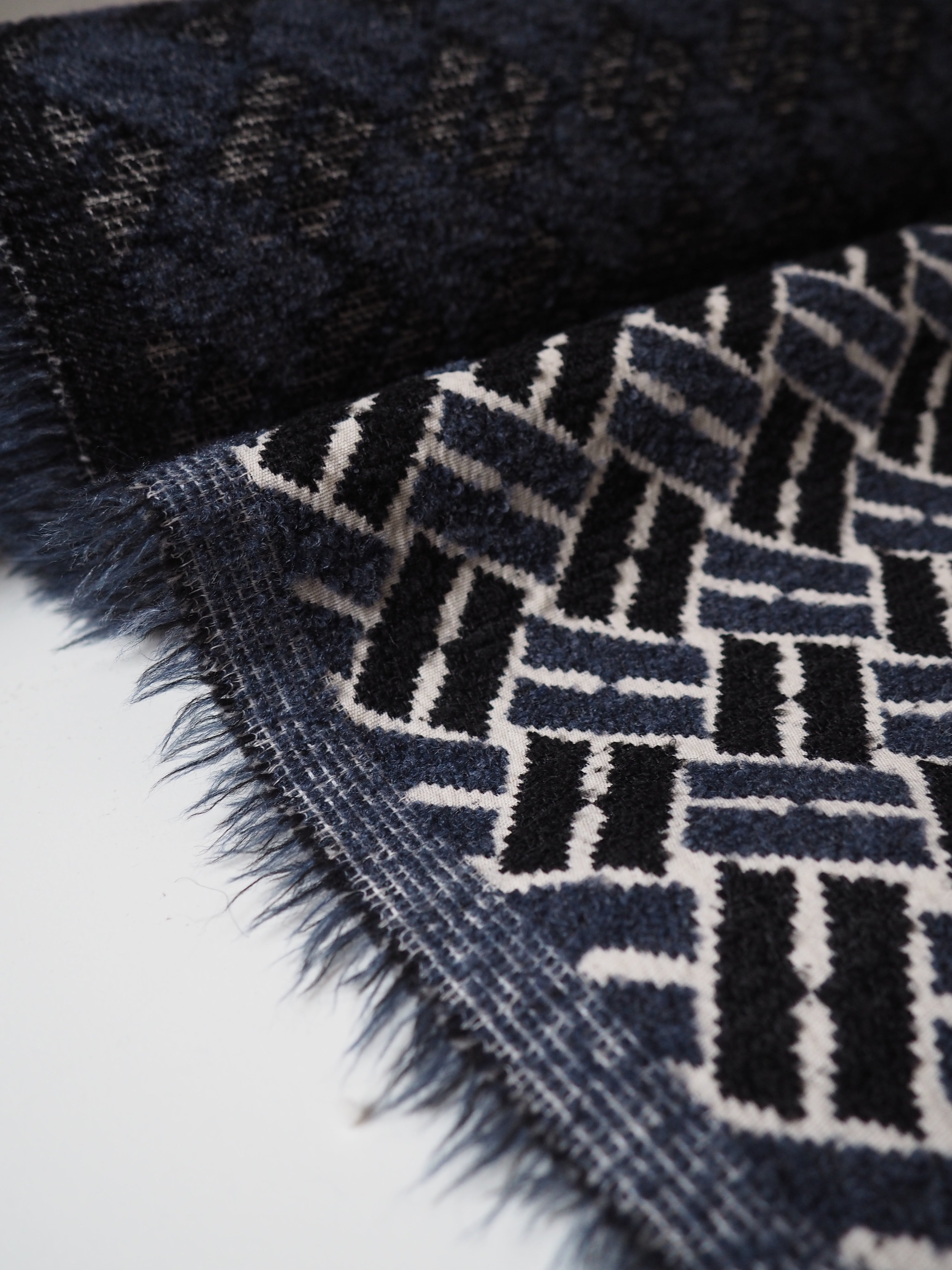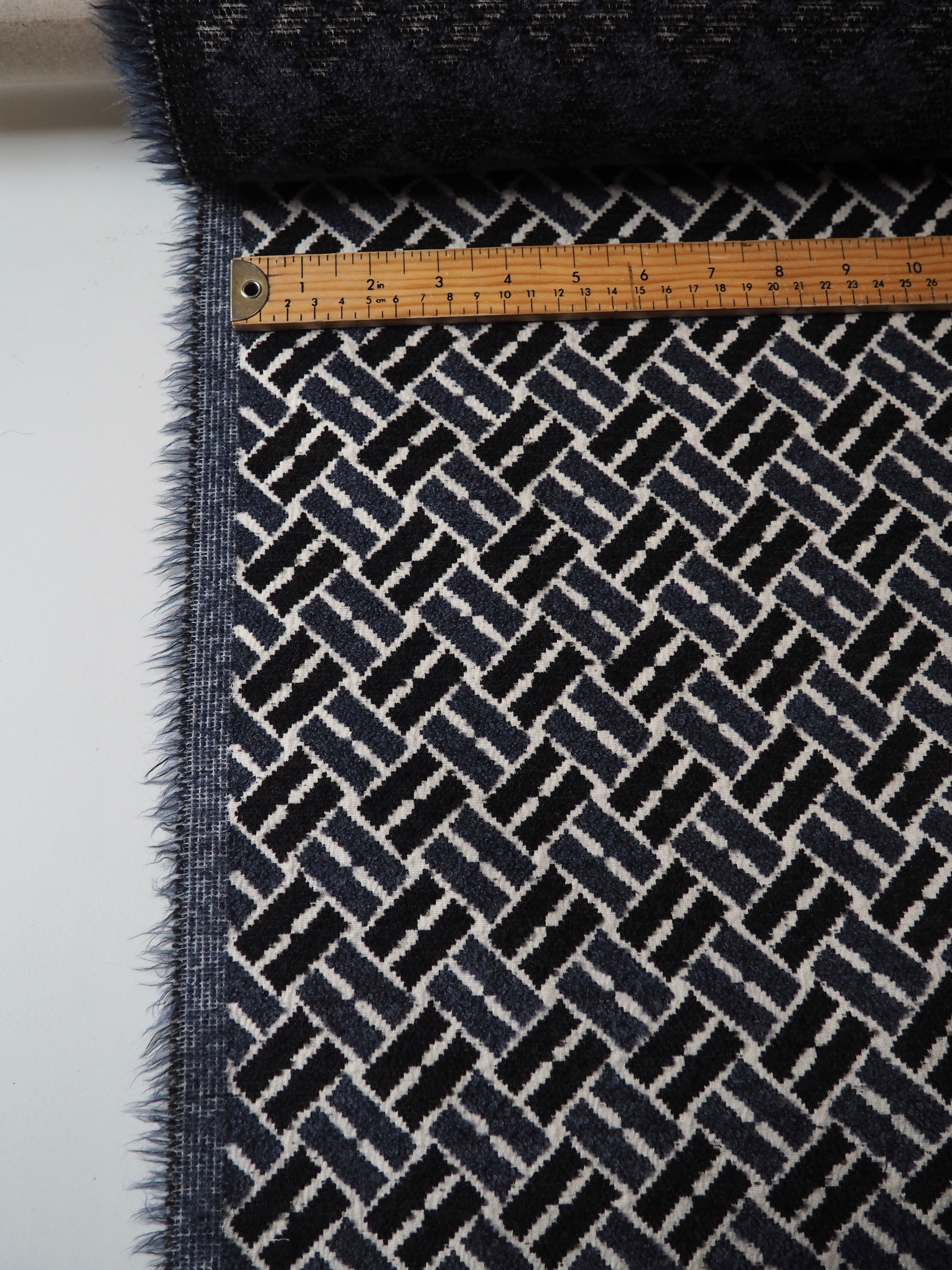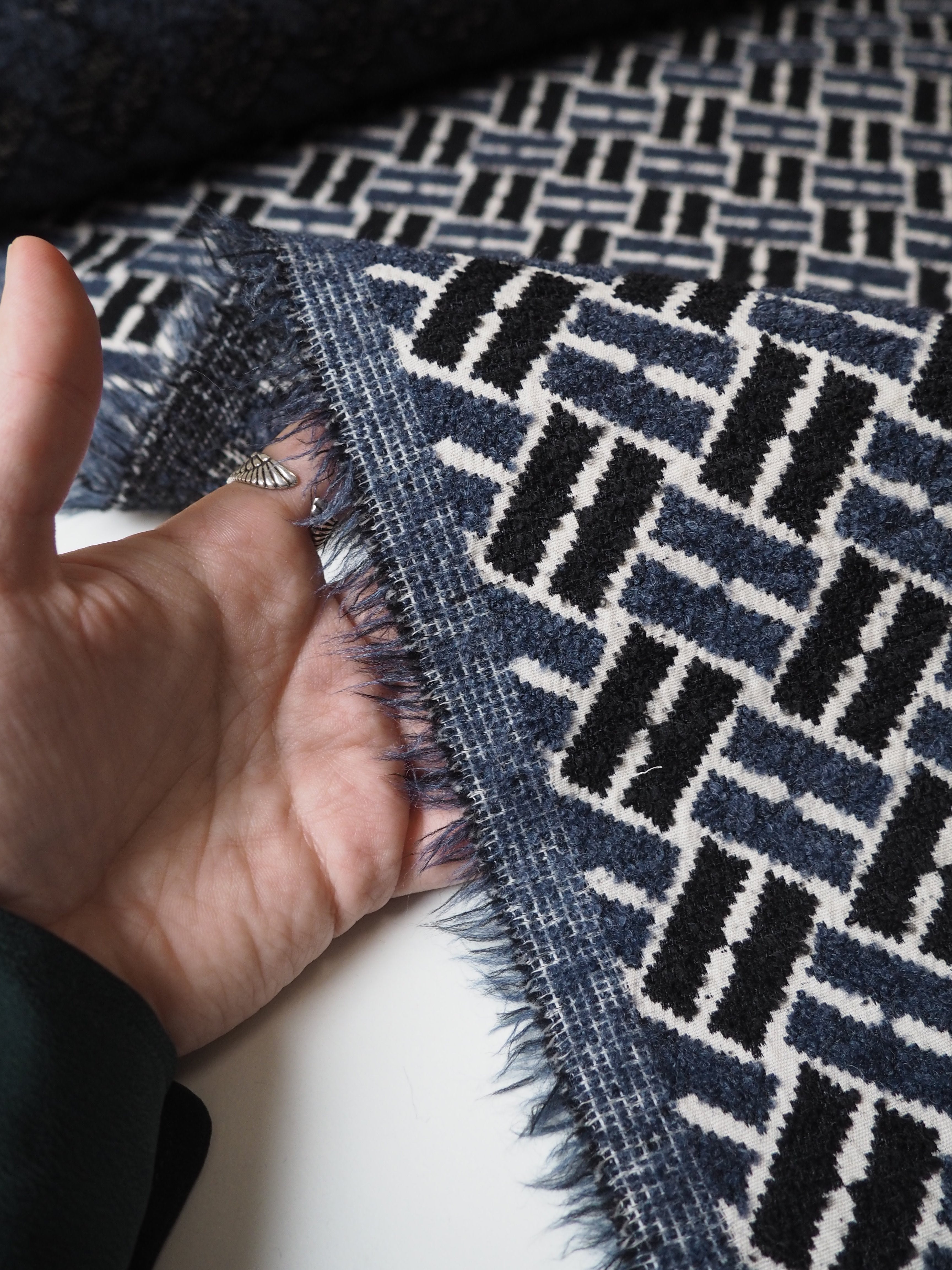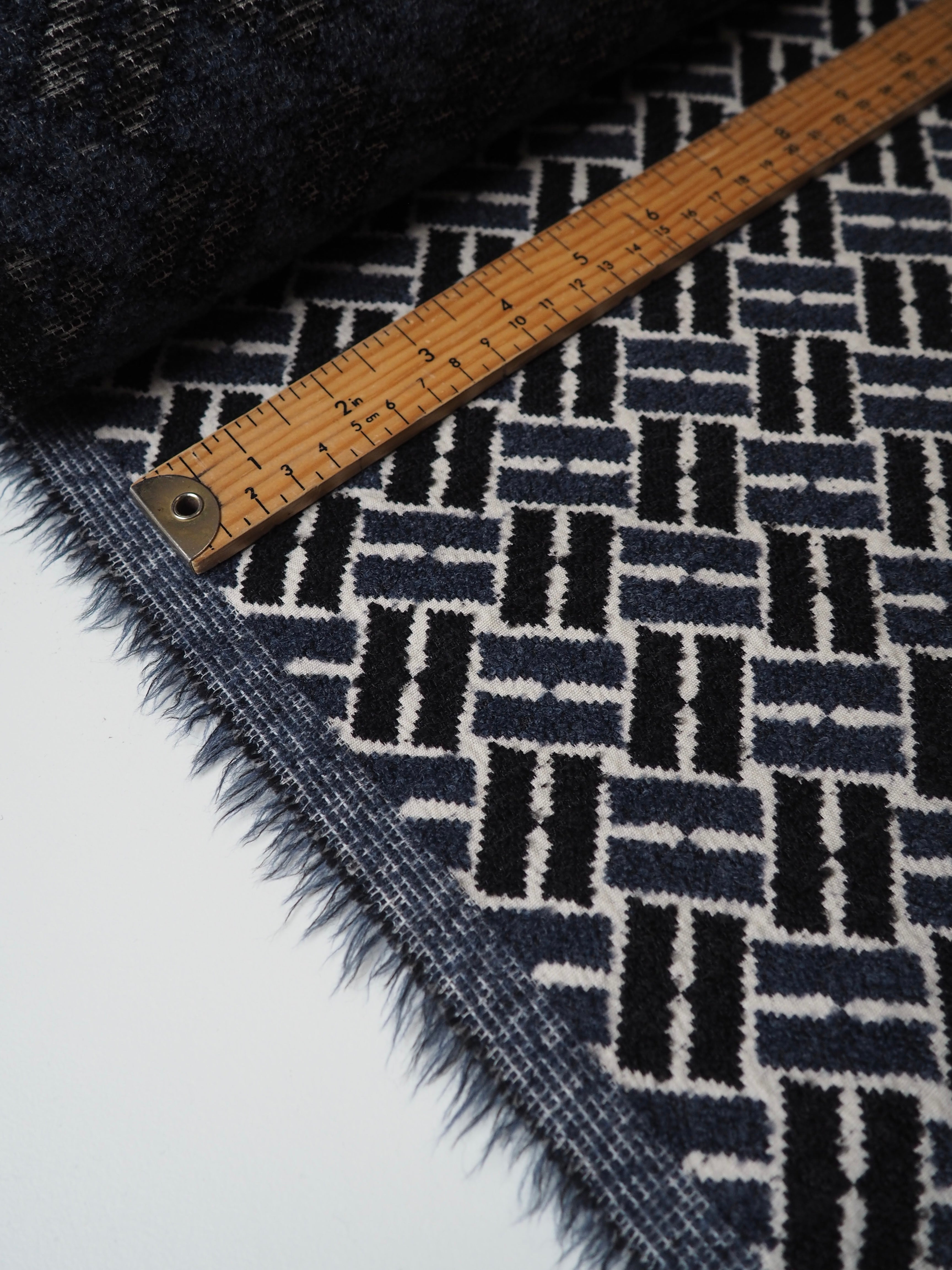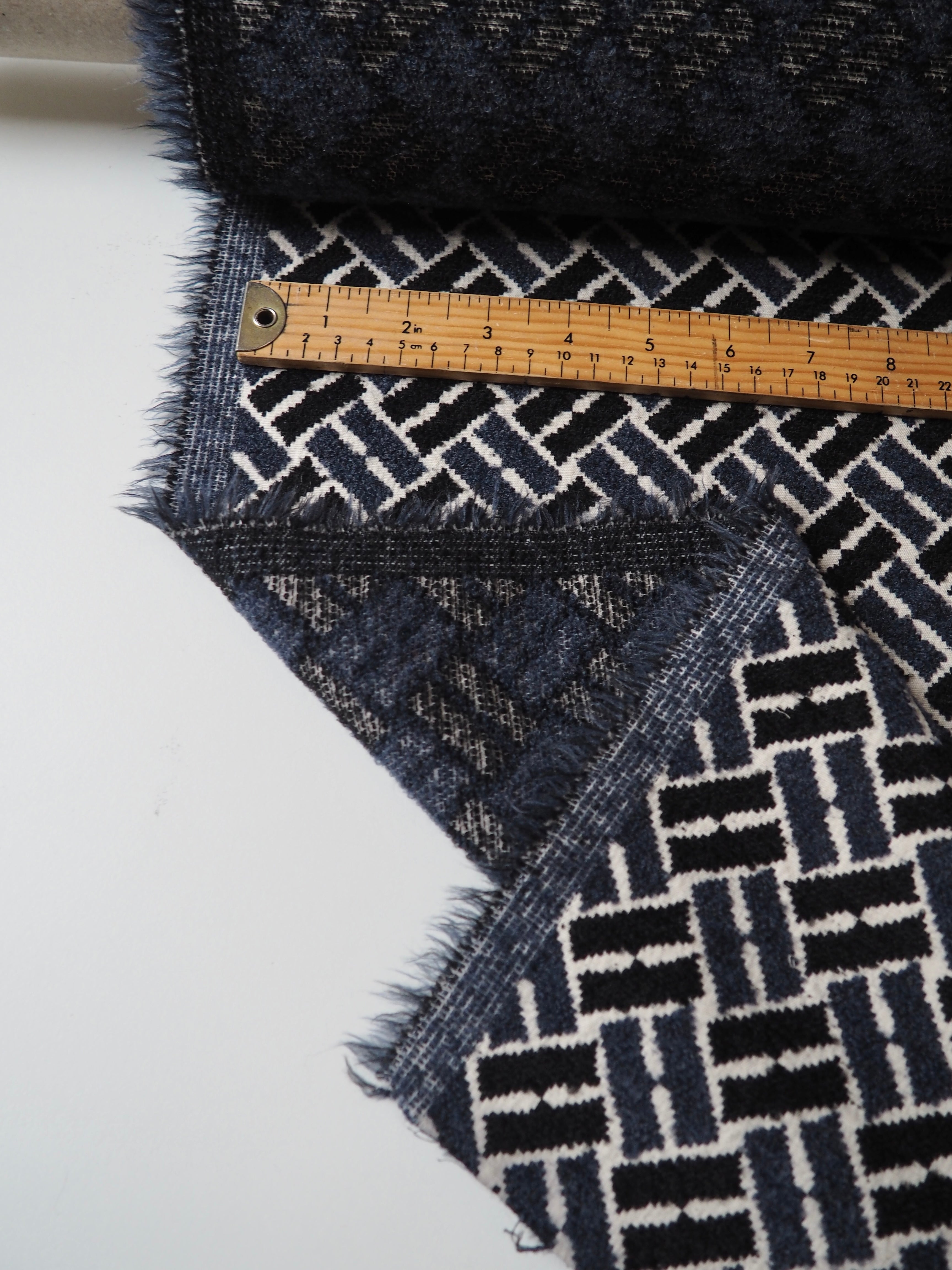 This ex-designer fabric is a jacquard. It's a blue and black block jacquard, almost forming into H's. It's in a soft fibre blend that has a chenille-like finish. It has a great structure that's flexible to play with. Medium weight. Great for a jacket or coat, or even for home projects!