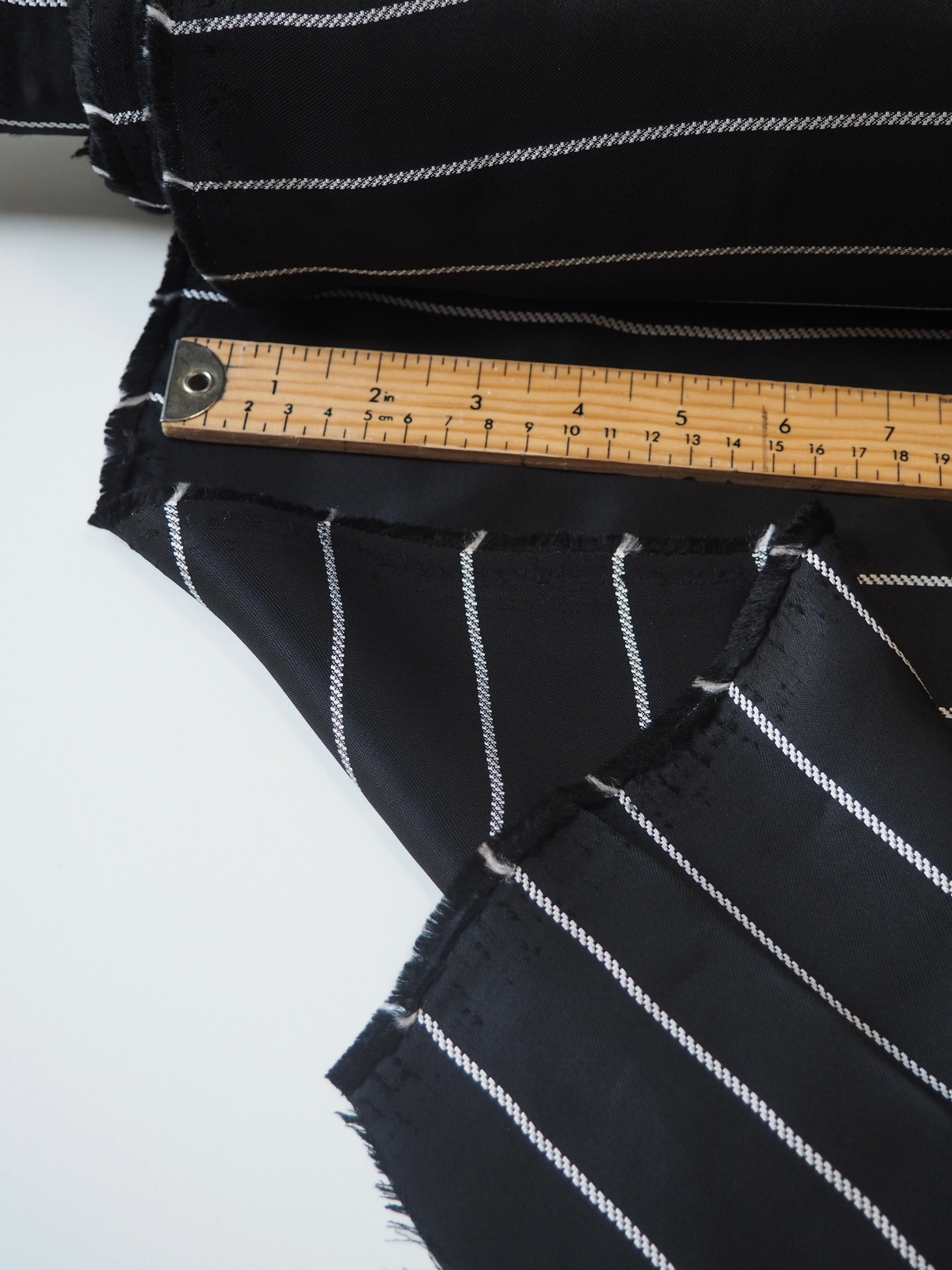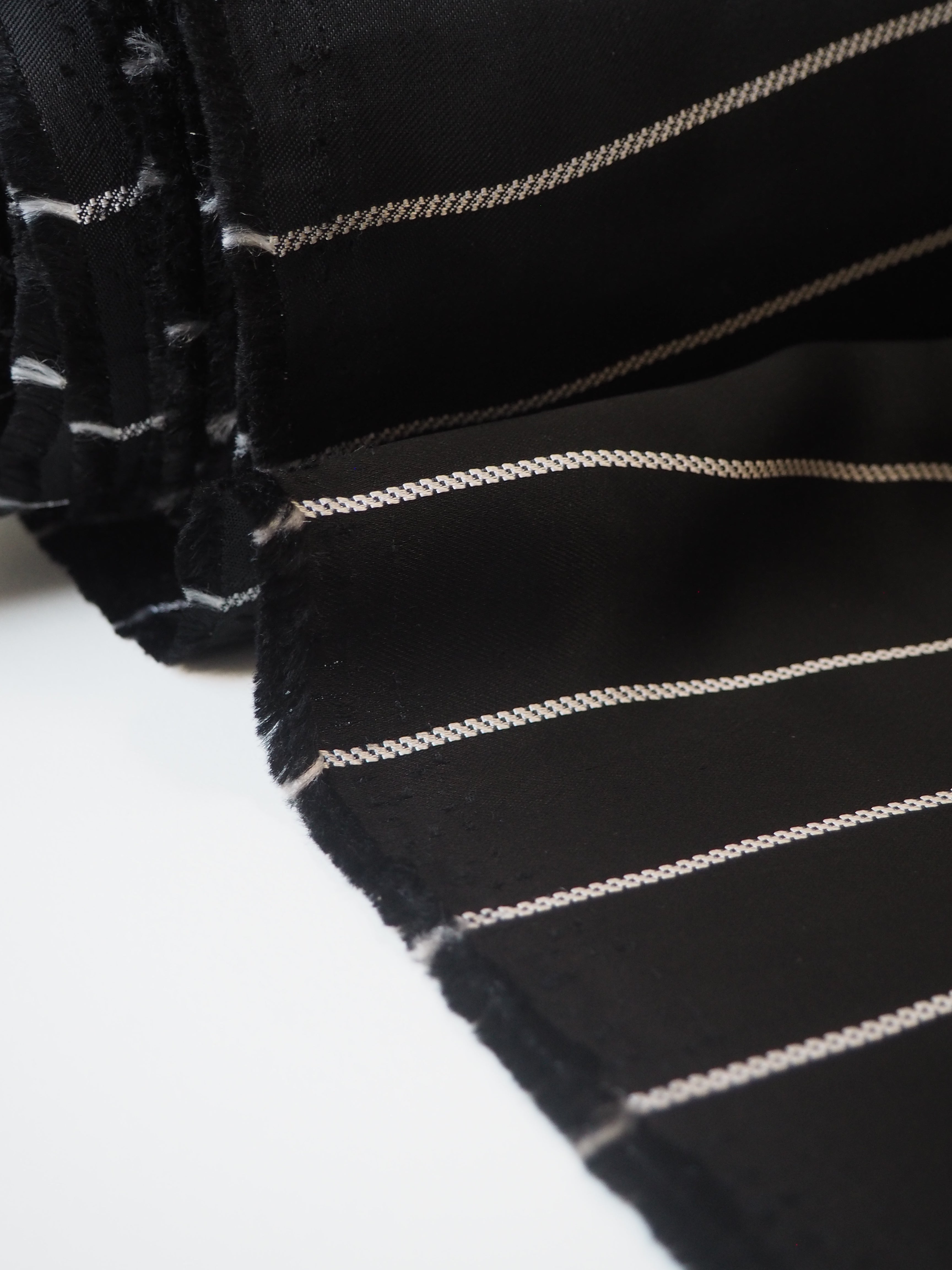 This ex-designer fabric is a gorgeous viscose satin. It's a black cloth with a white braided stripe down the weft. It's opaque, quite slinky and smooth, and lovely against the skin. It has a silky, viscose handle and swishes so well! It's very drapey and lightweight, with such a lovely bright sheen. Perfect for a wrap dress or top!