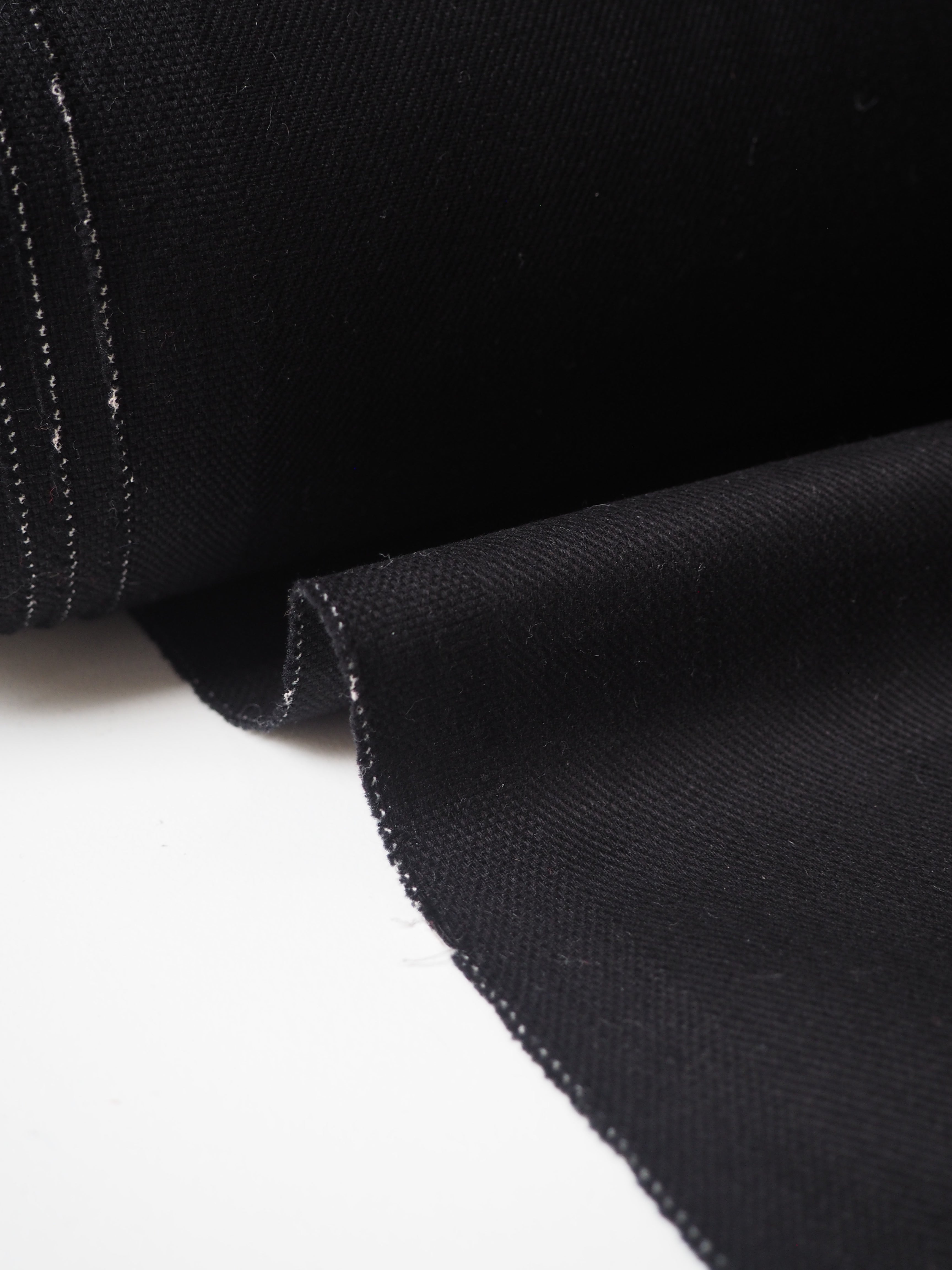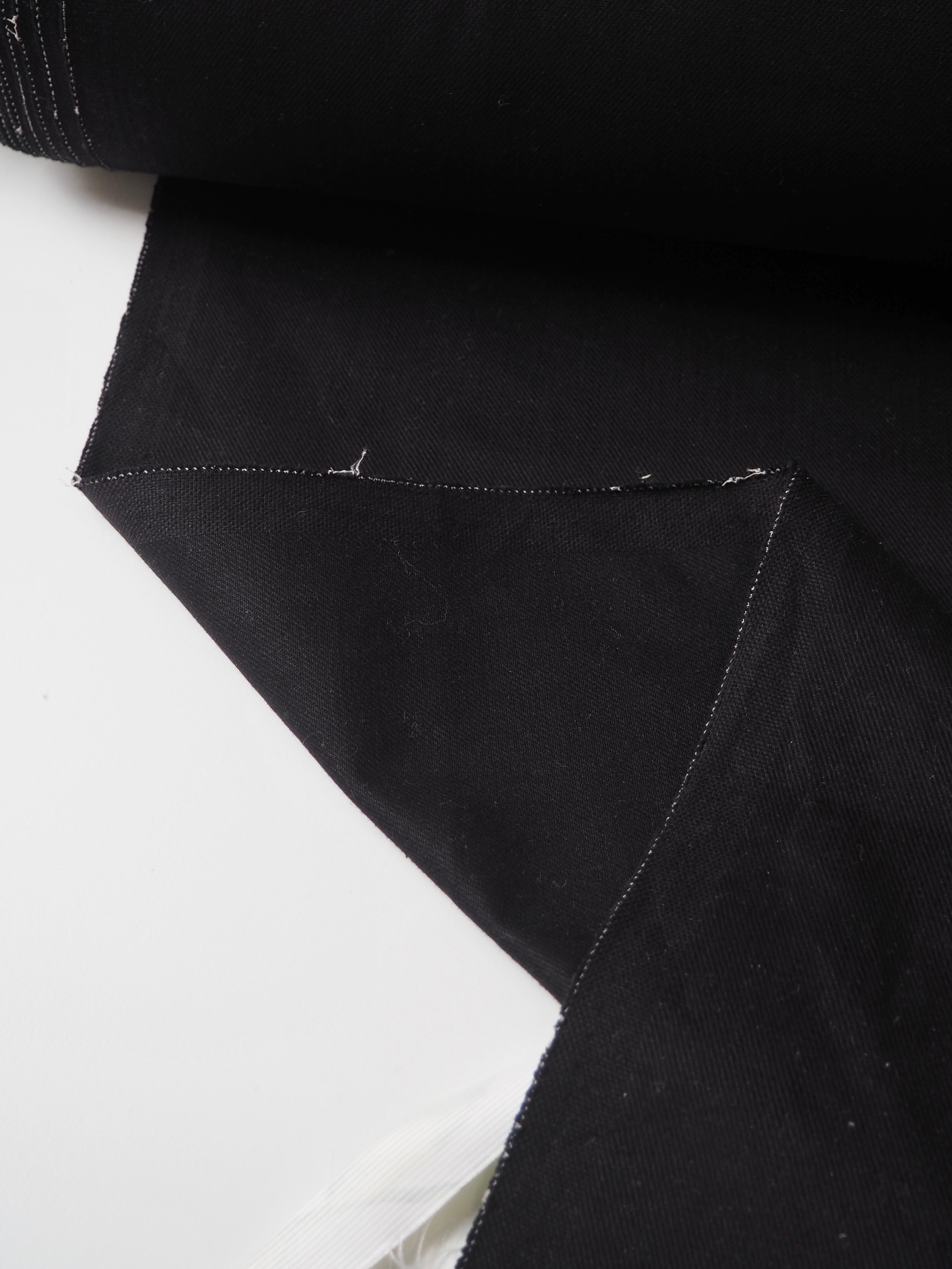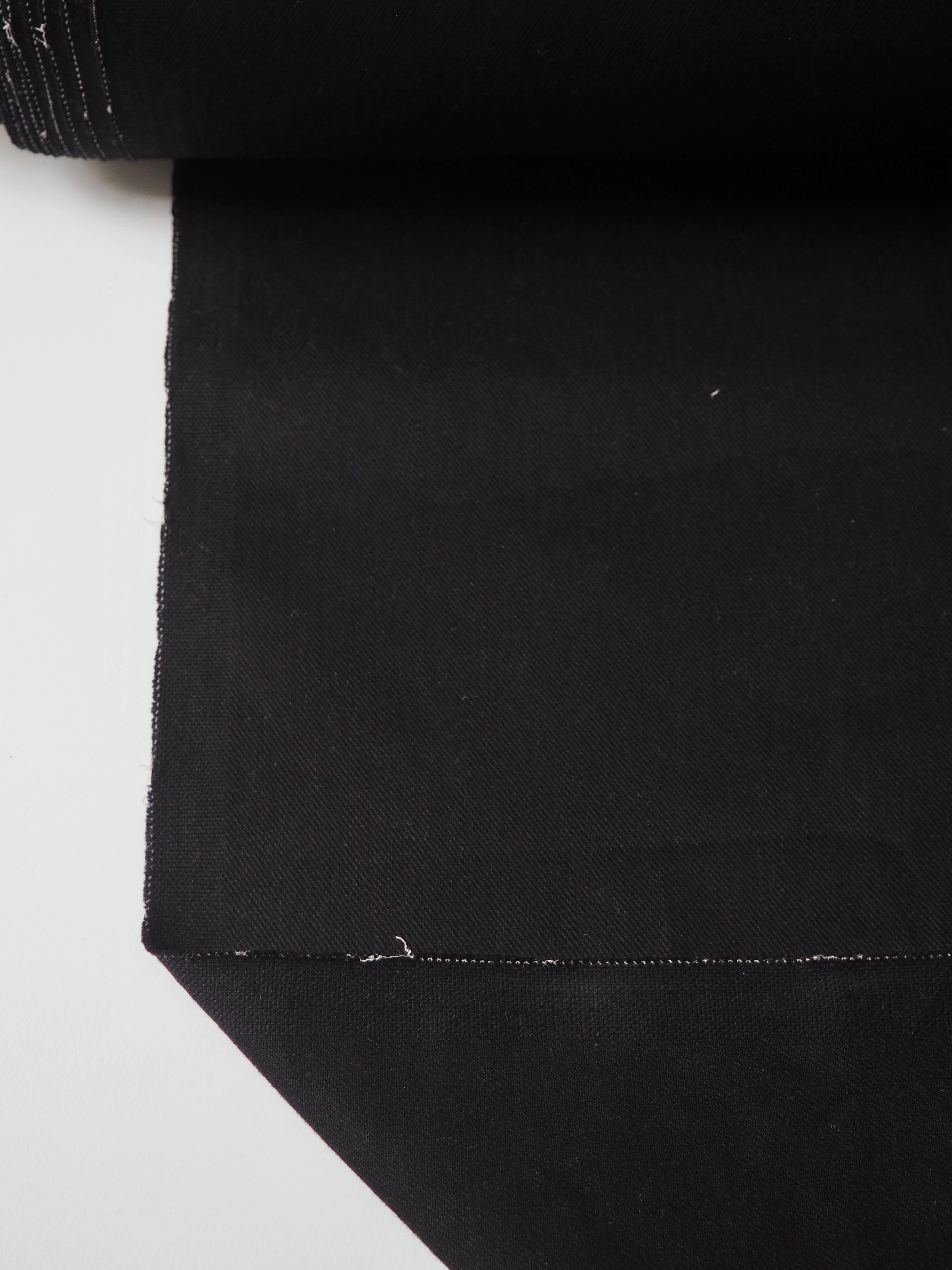 This ex-designer fabric is a cotton twill. Medium weight with a good structure and twill weave. A lovely soft brushed handle in a rich black shade. A sturdy cloth and opaque. Has a slight stretch, about 5% width ways. Perfect for a jacket or trousers!
