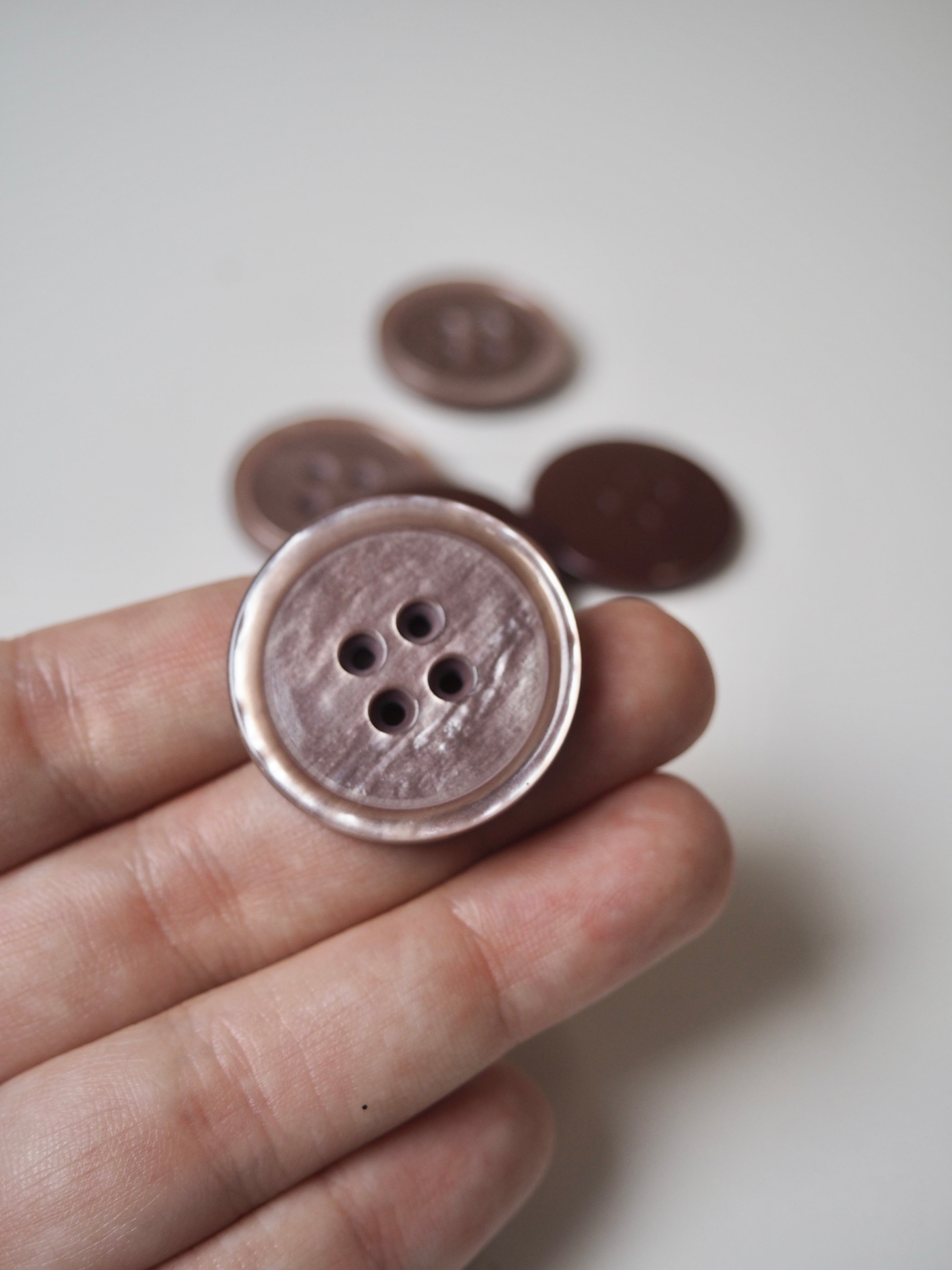 This ex-designer trim is a 4-hole rimmed plastic button. The front has an iridescent shiny multi coloured pink surface to imitate mother of pearl shell buttons. Perfect size for coats and jackets.