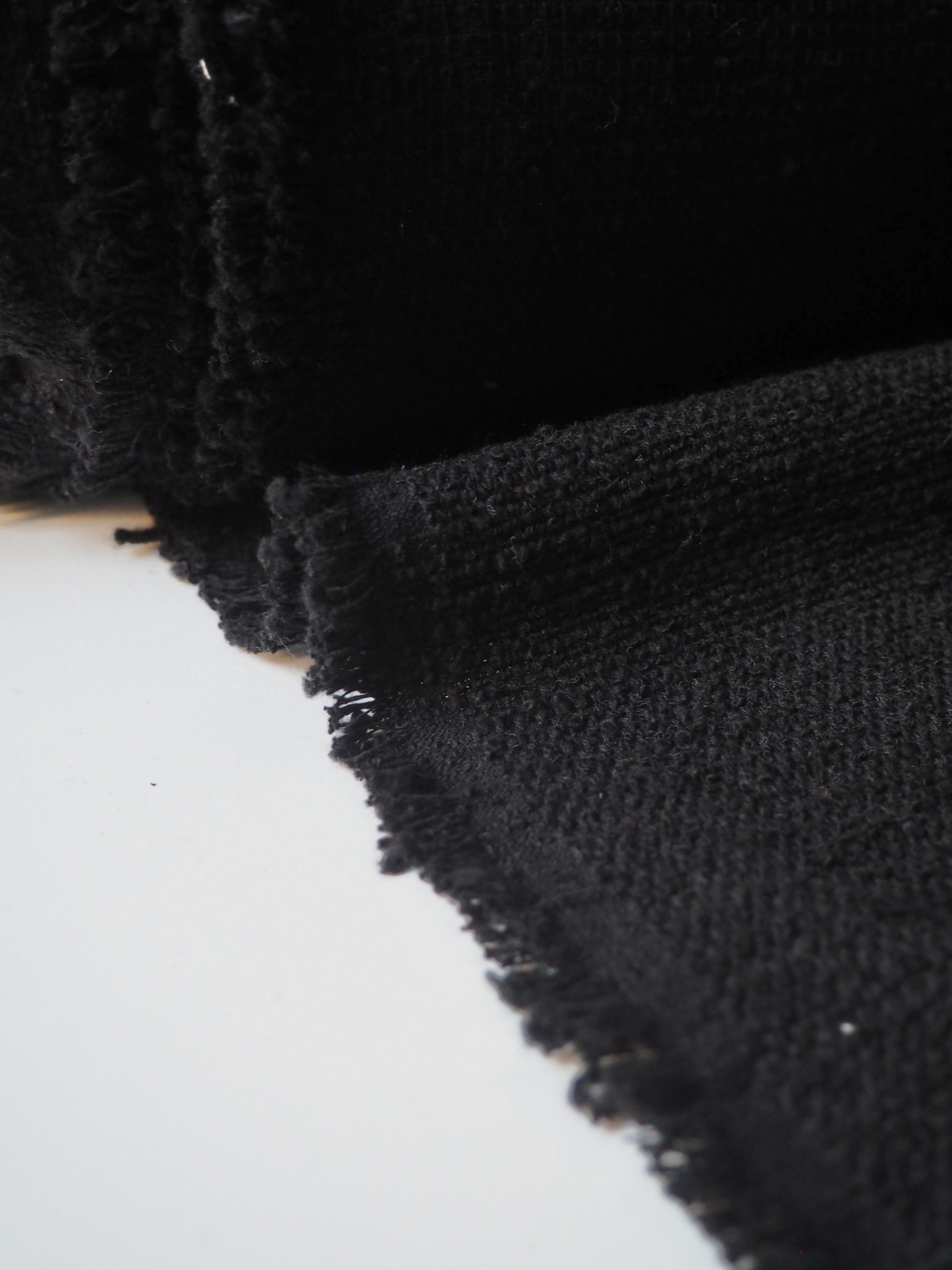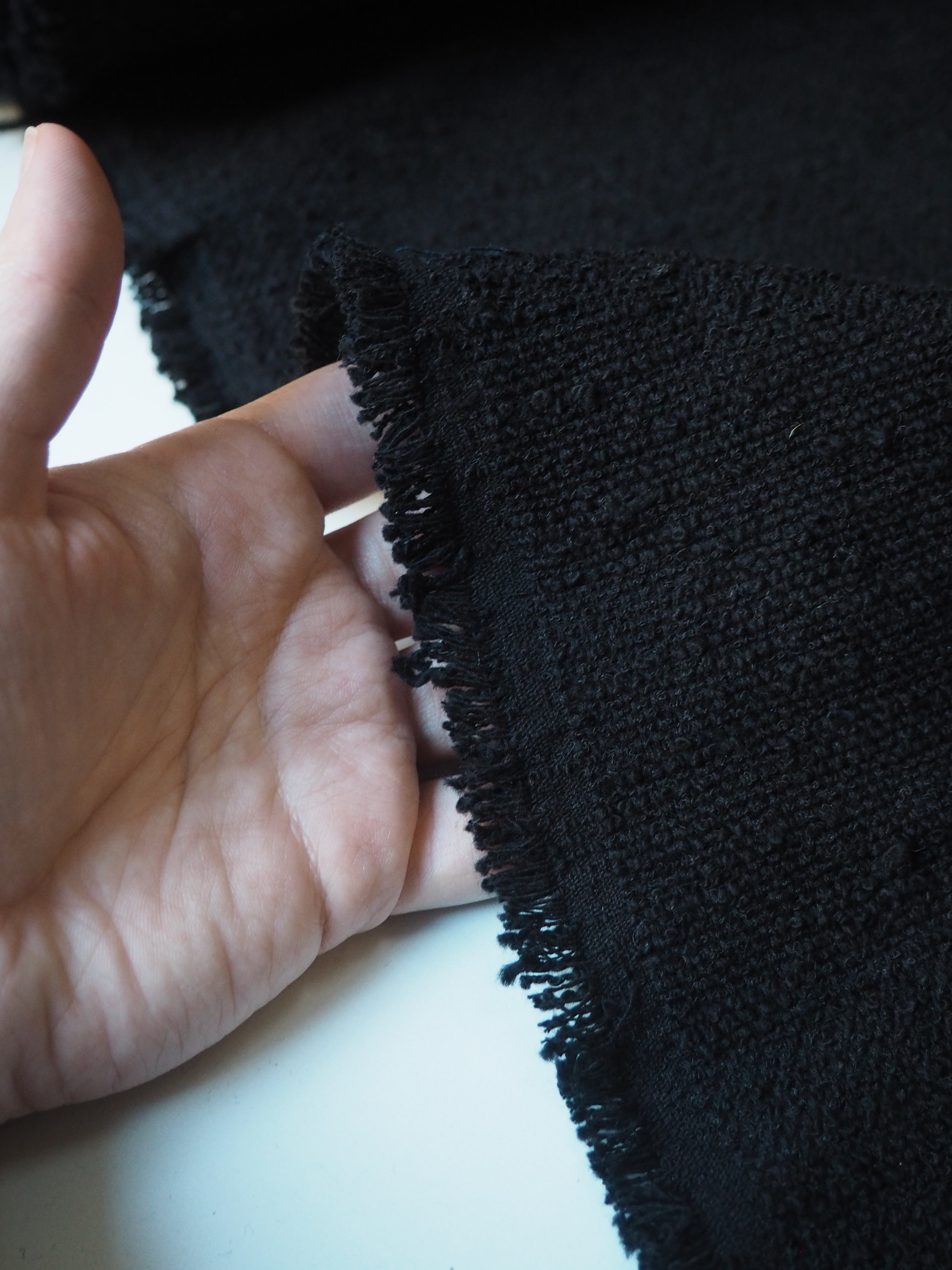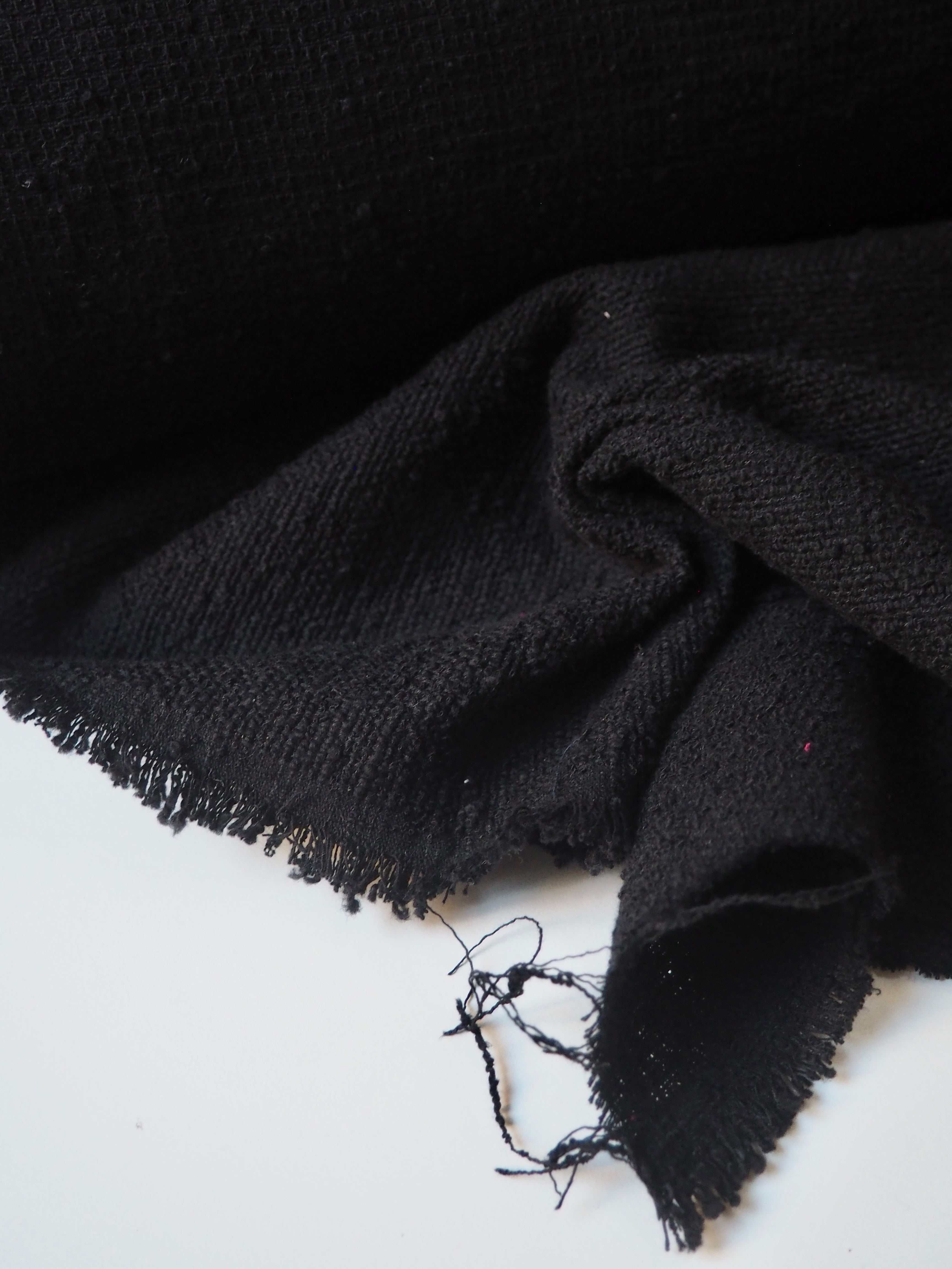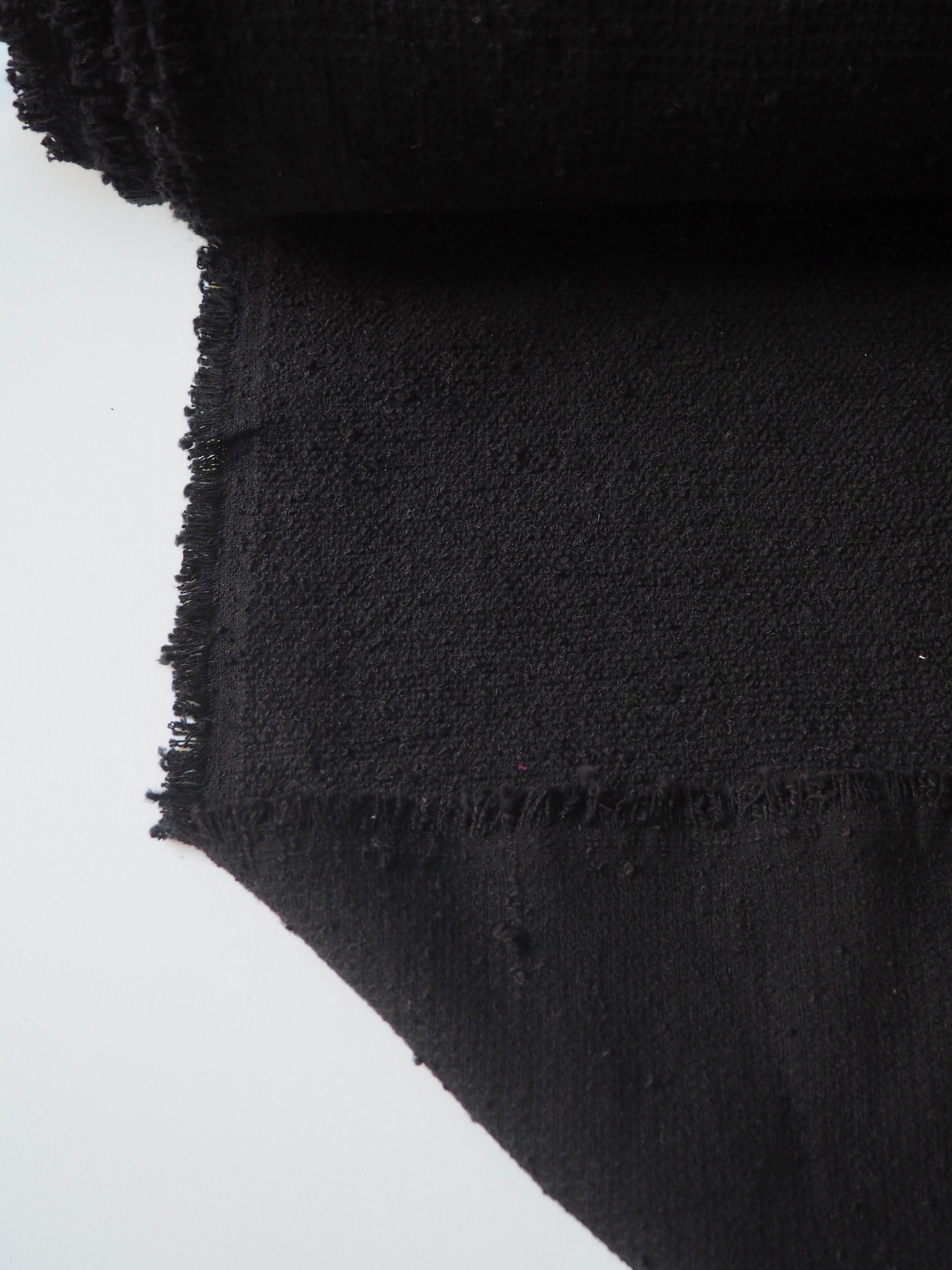 This ex-designer fabric is a cotton tweed. It has a sturdy but very soft and textured bouclé weave. It's opaque, with a gentle structure and lovely drape. Has such a lovely handle that's easy to work with. Light to medium weight and perfect for a jacket or even cushion covers!