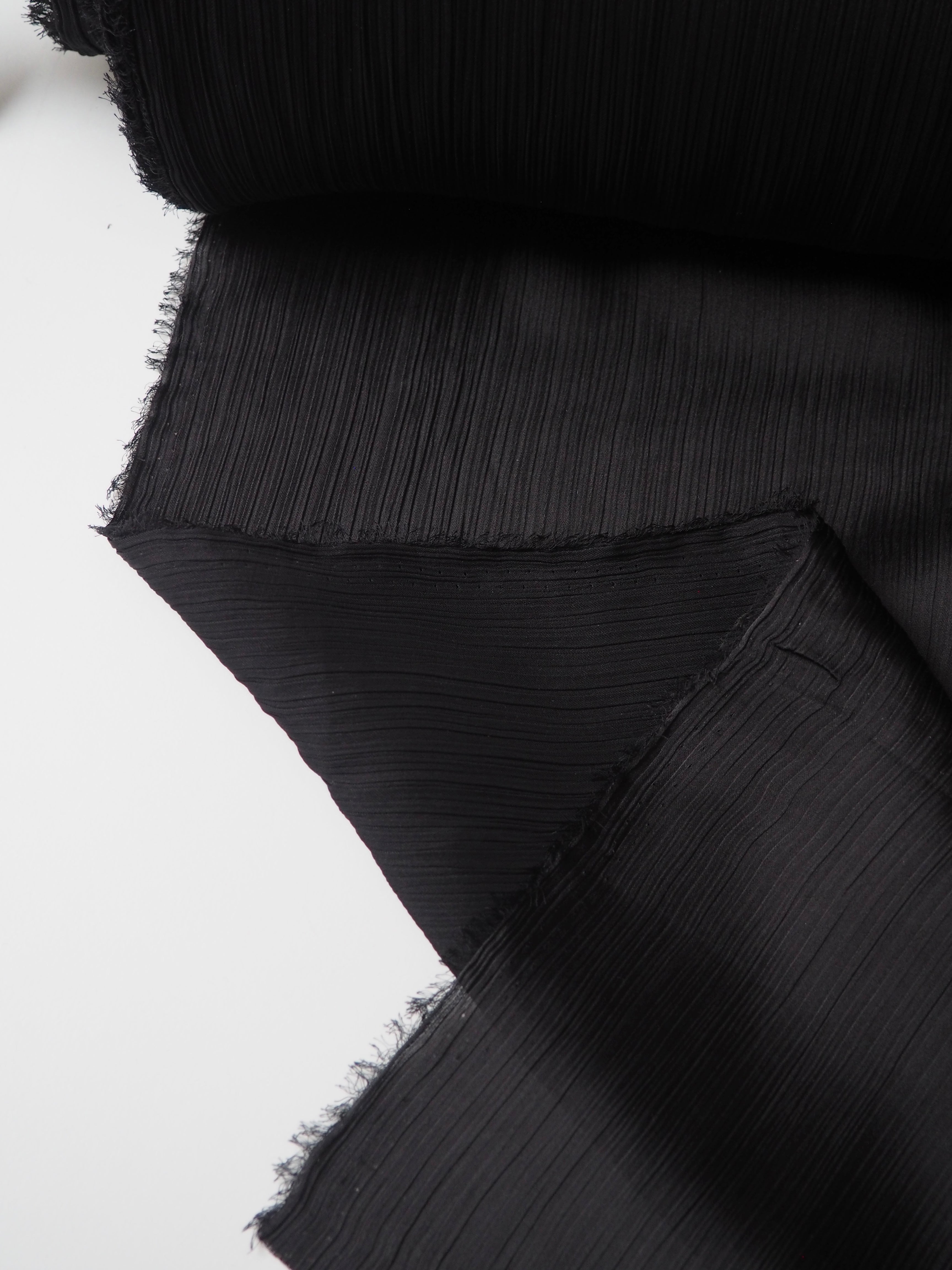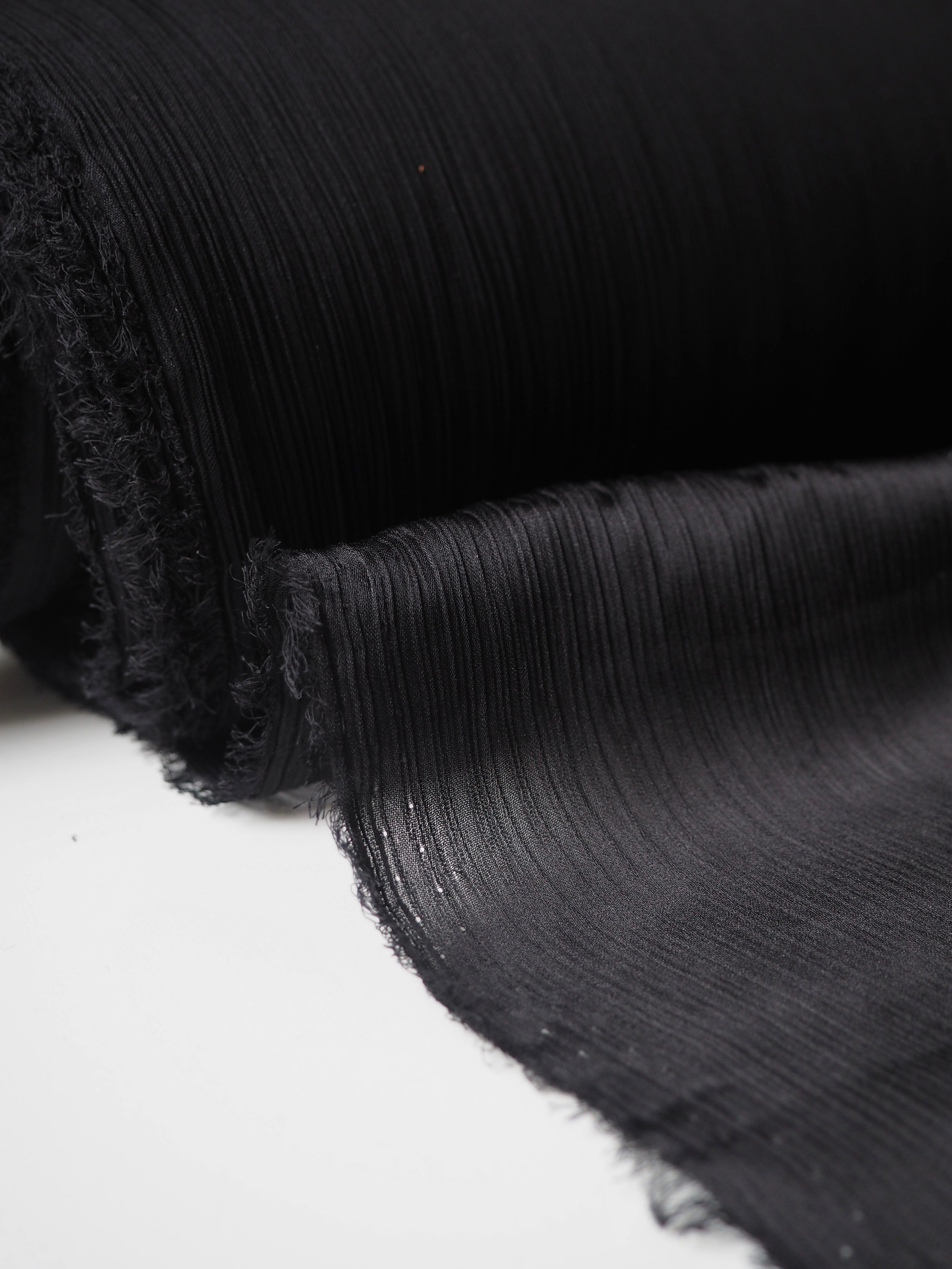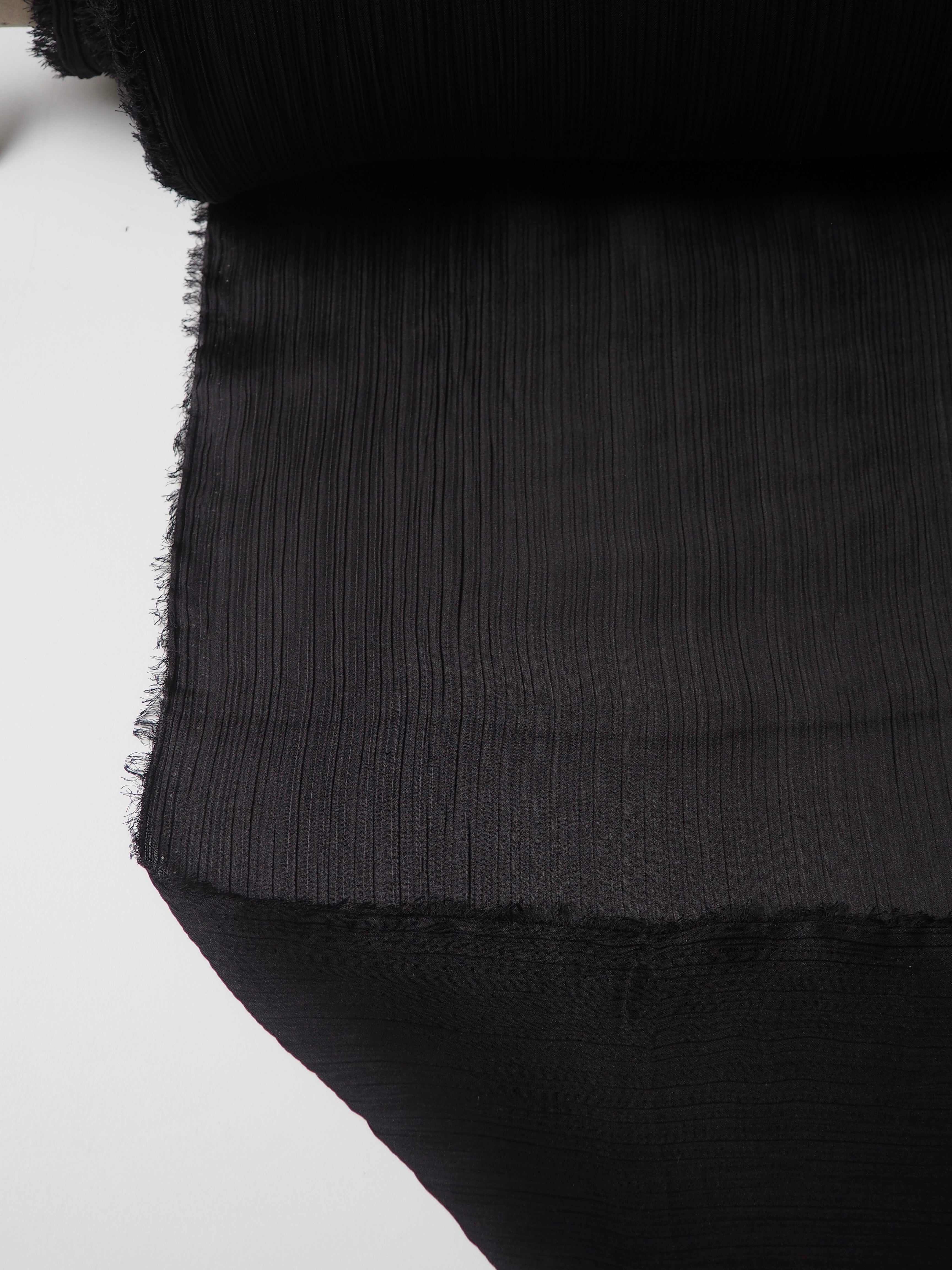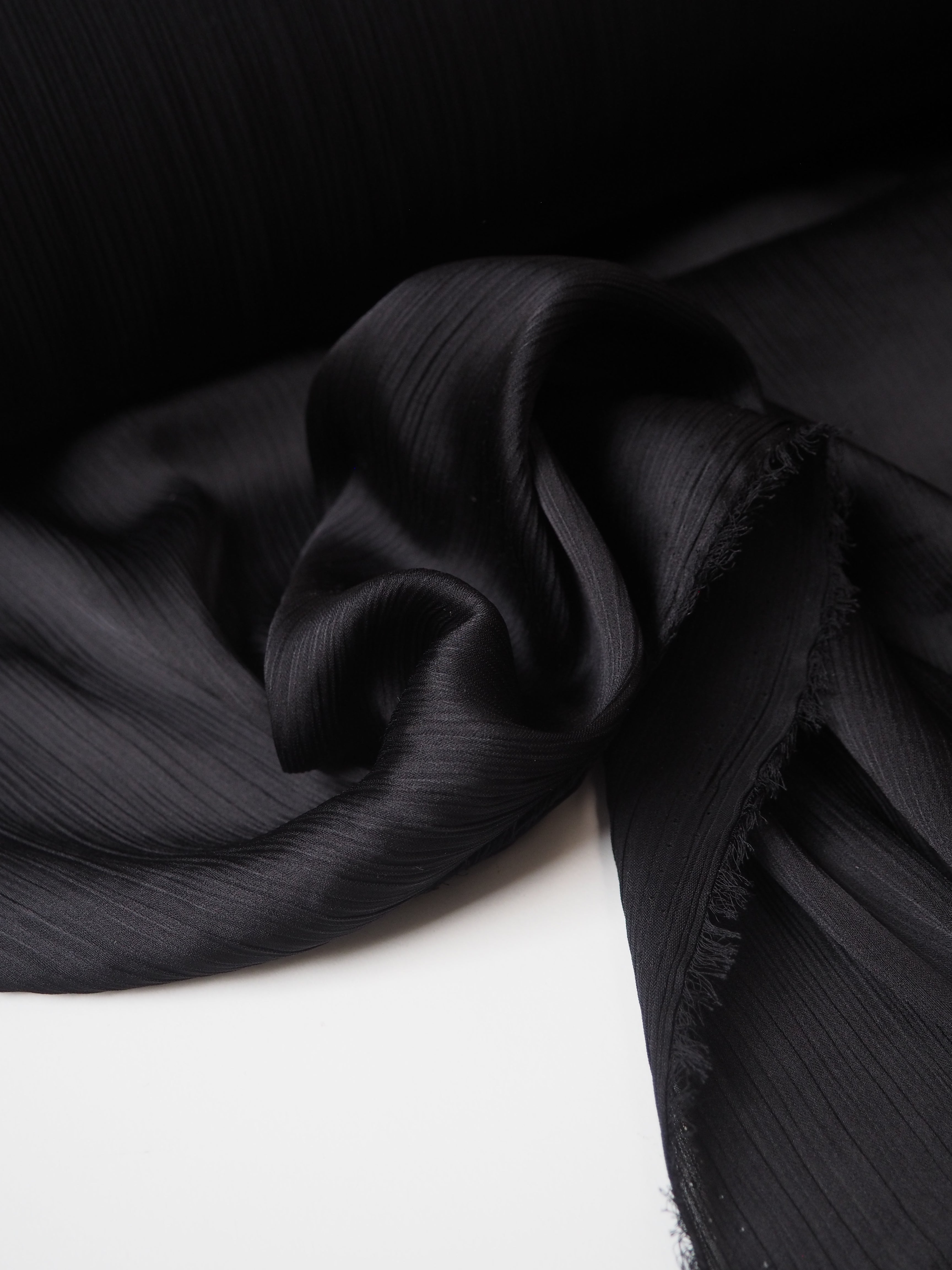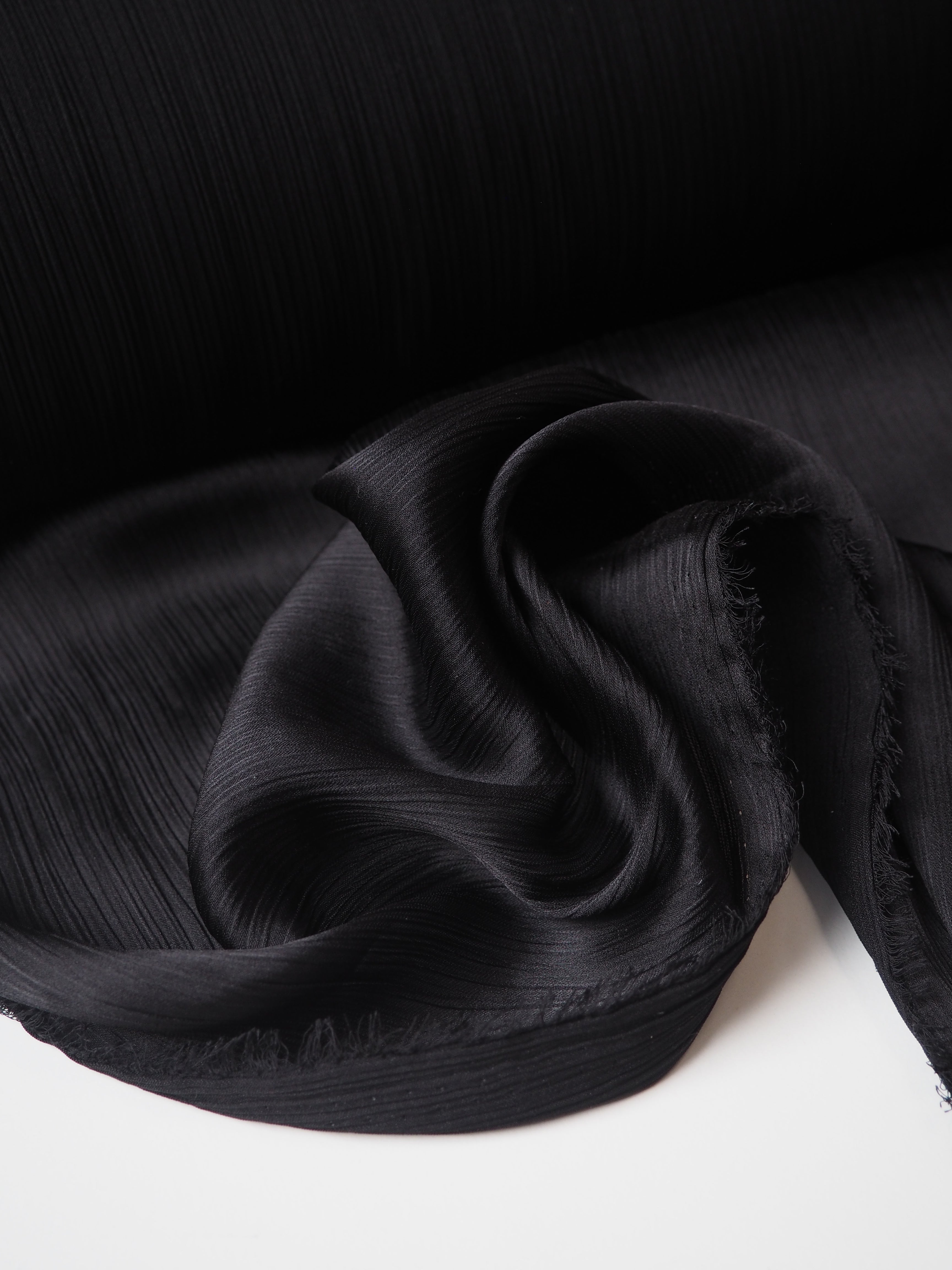 This ex-designer fabric is a satin chiffon. It has such a lovely bright satin sheen, and a crinkled finish down the warp. Has a slinky handle that feels luxurious! Super light and airy, more opaque than a typical chiffon. Very drapey and easy to gather for a voluminous effect. Ideal for a floaty top or dress!