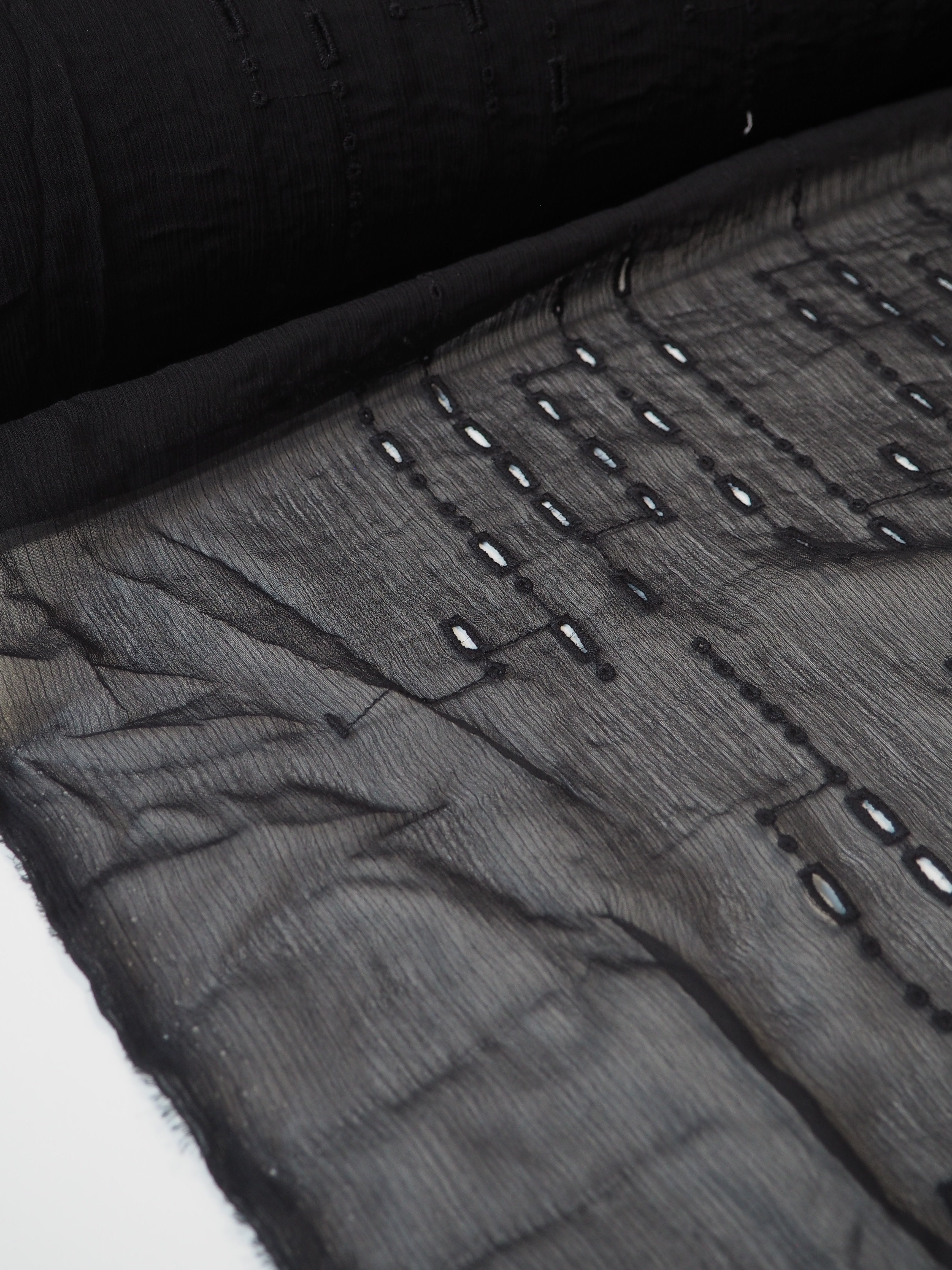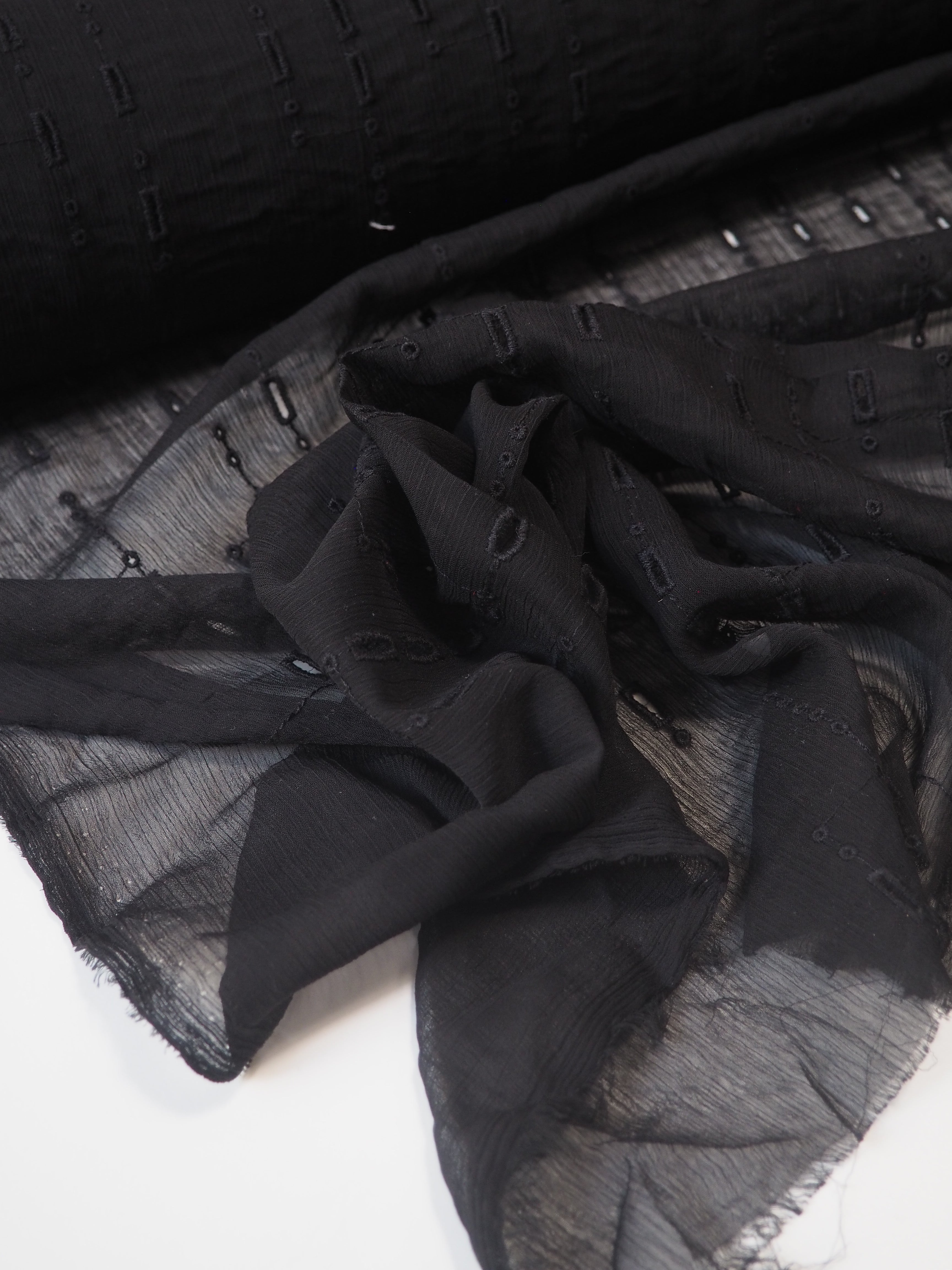 This ex-designer fabric is a unique eyelet chiffon. Open embroidered rectangles and dots form a beautiful staggered line print across a black crinkled chiffon background. It's lightweight and sheer, with wonderful drape. It has such a nice luxurious handle as well. Perfect for a delicate overlay, or even lingerie!