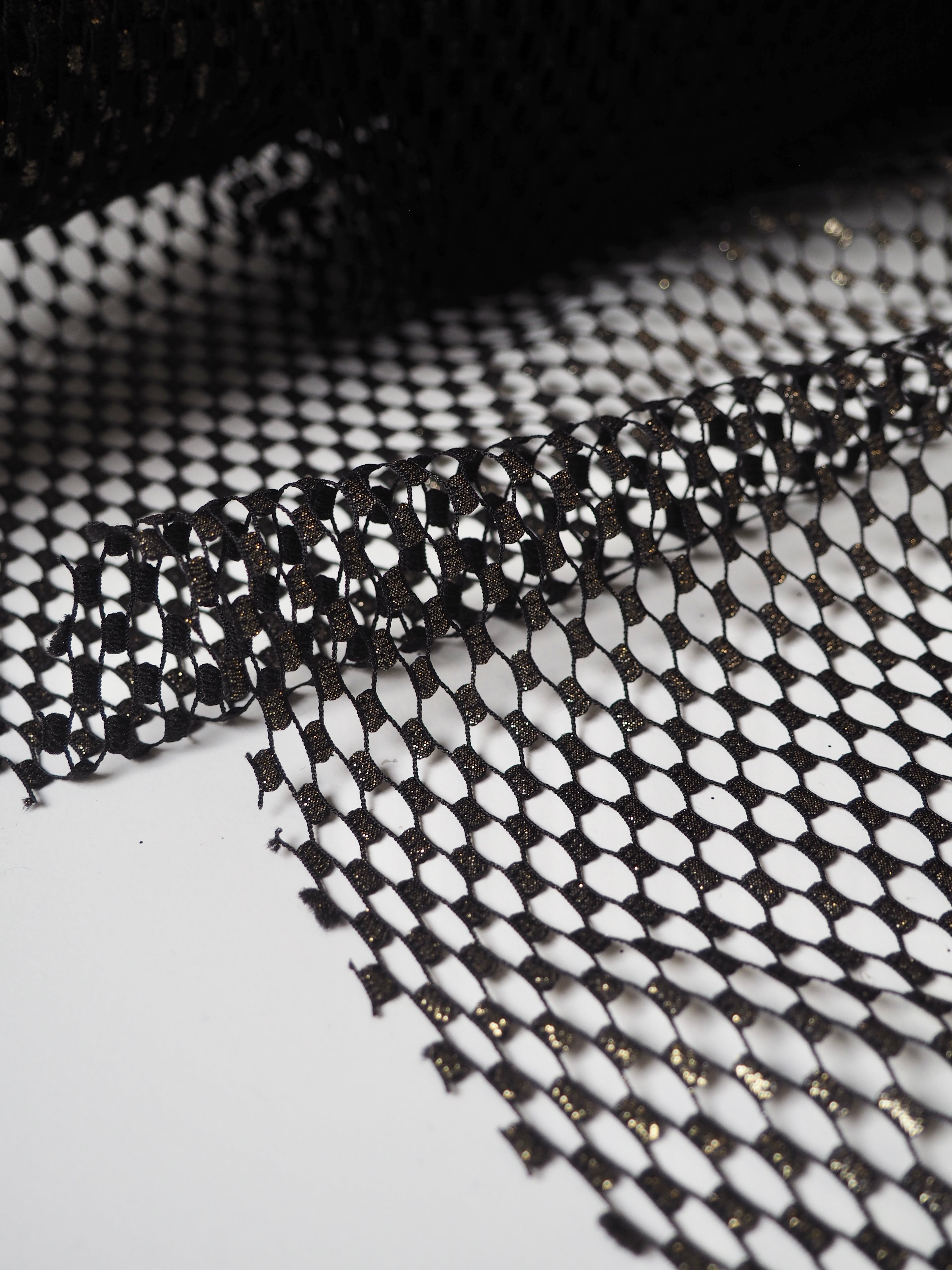 This ex-designer fabric is a fishnet. It's black with a gold metallic finish on the dotted weave. It's sheer and so eye-catching! Drapes well and has a only a little natural ease. It Would look great as an overlay on a garment, and even for hats and veils!