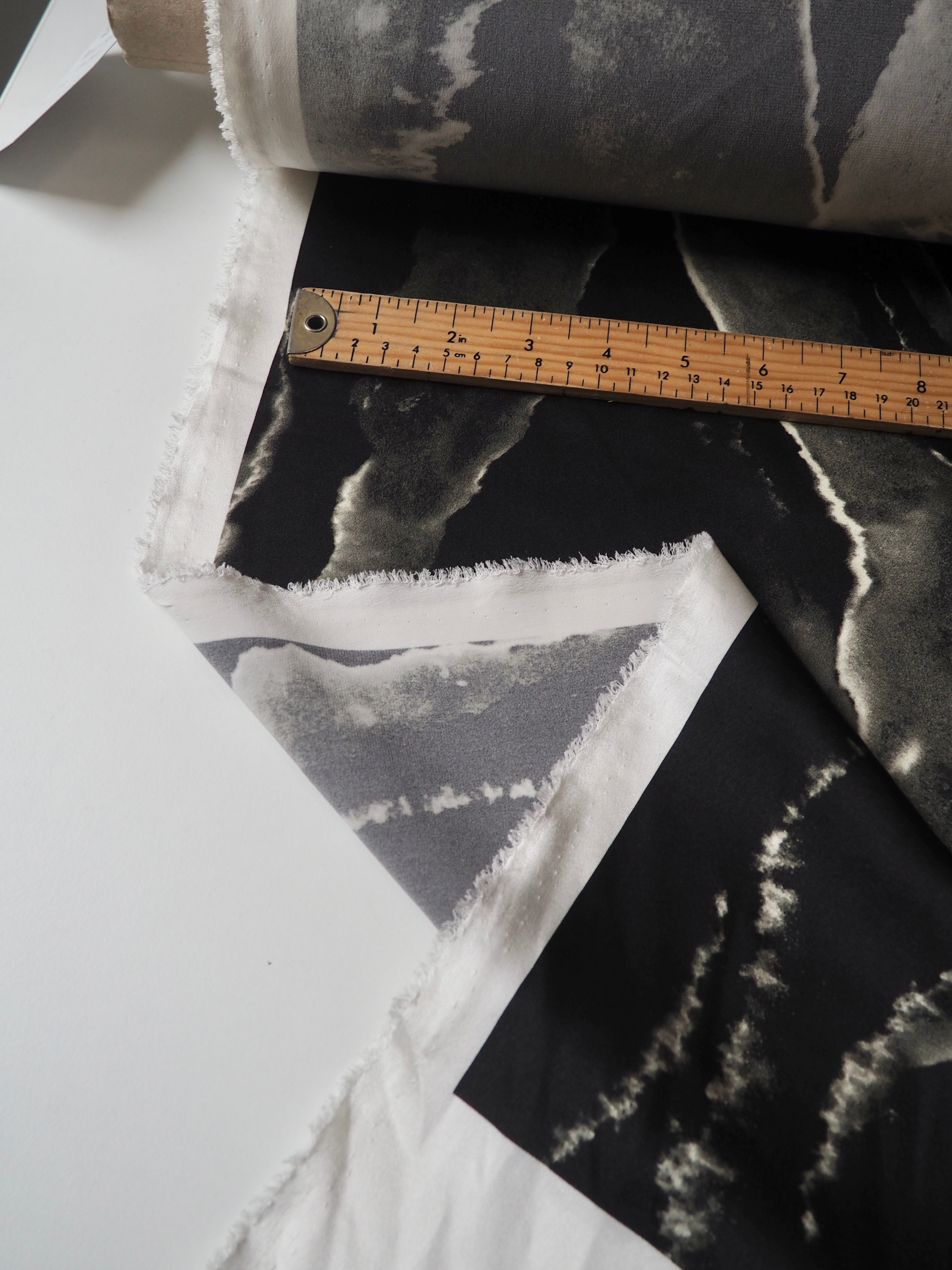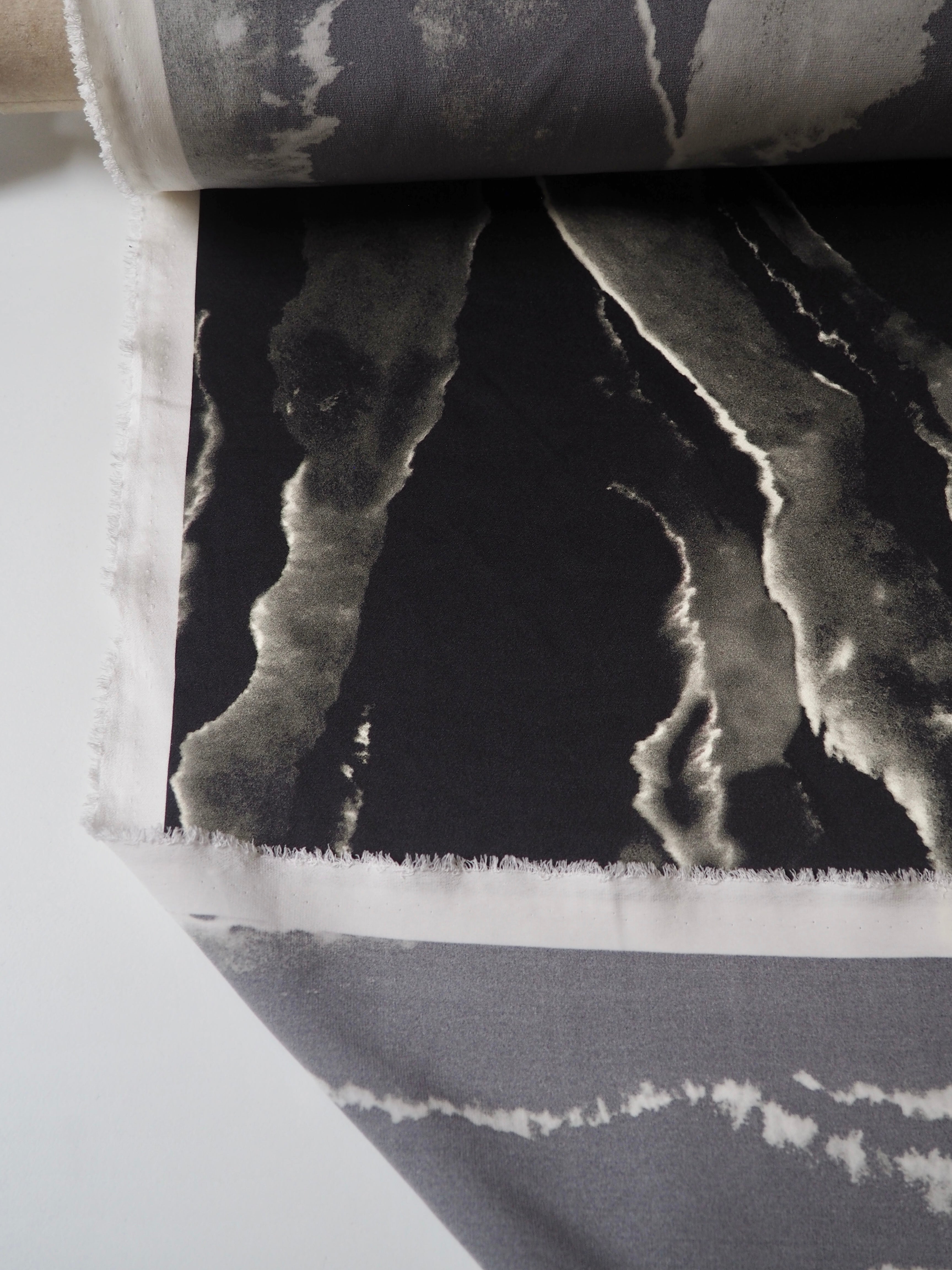 This ex-designer fabric is a silk satin. It's in a fluid marbled print. It's bespoke from a London designer. It's slinky, mostly opaque, and very soft. It has an incredible satin sheen and beautiful movement. Such a smooth and luxurious handle! It's medium weight and not as heavy as a duchess satin, but still heavier than a typical charmeuse. The perfect drapey silk for dresses or button up blouses! This cloth as slight breaks in the printing every few metres, pictures show this.