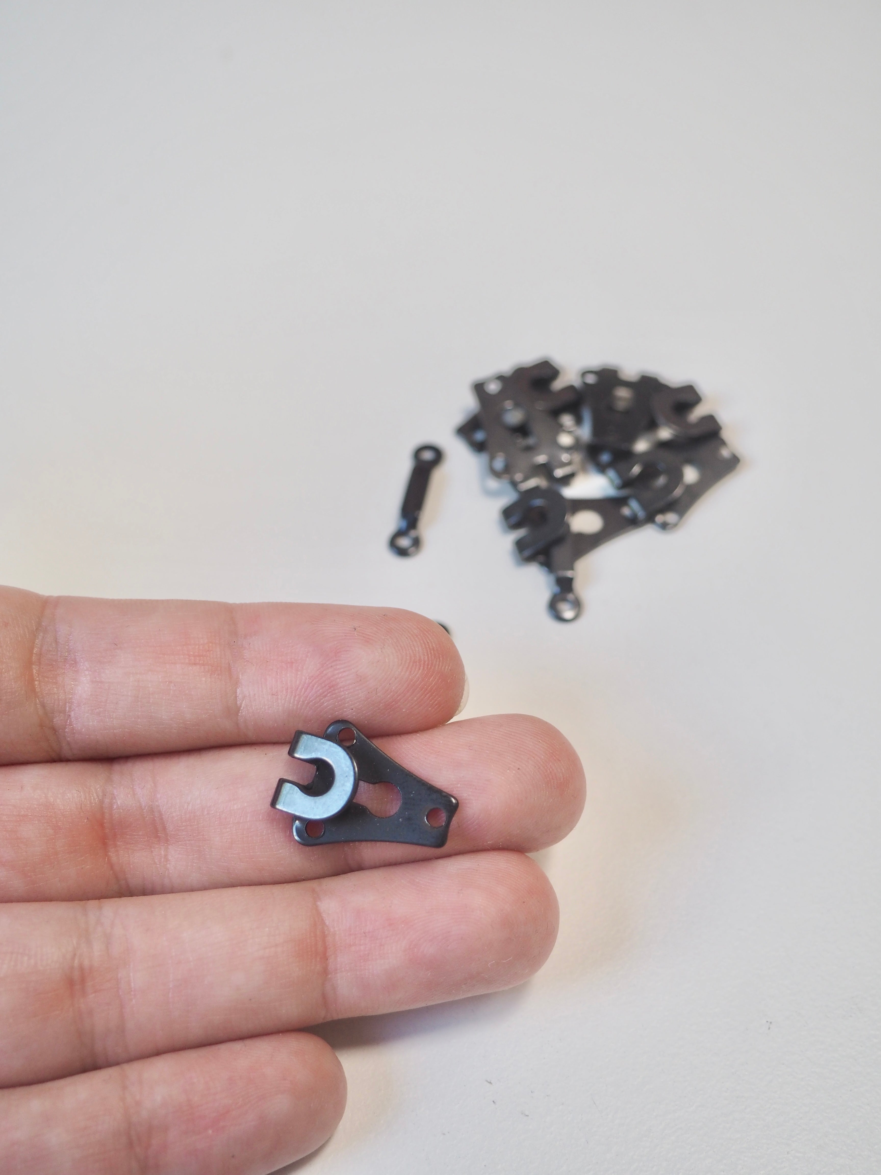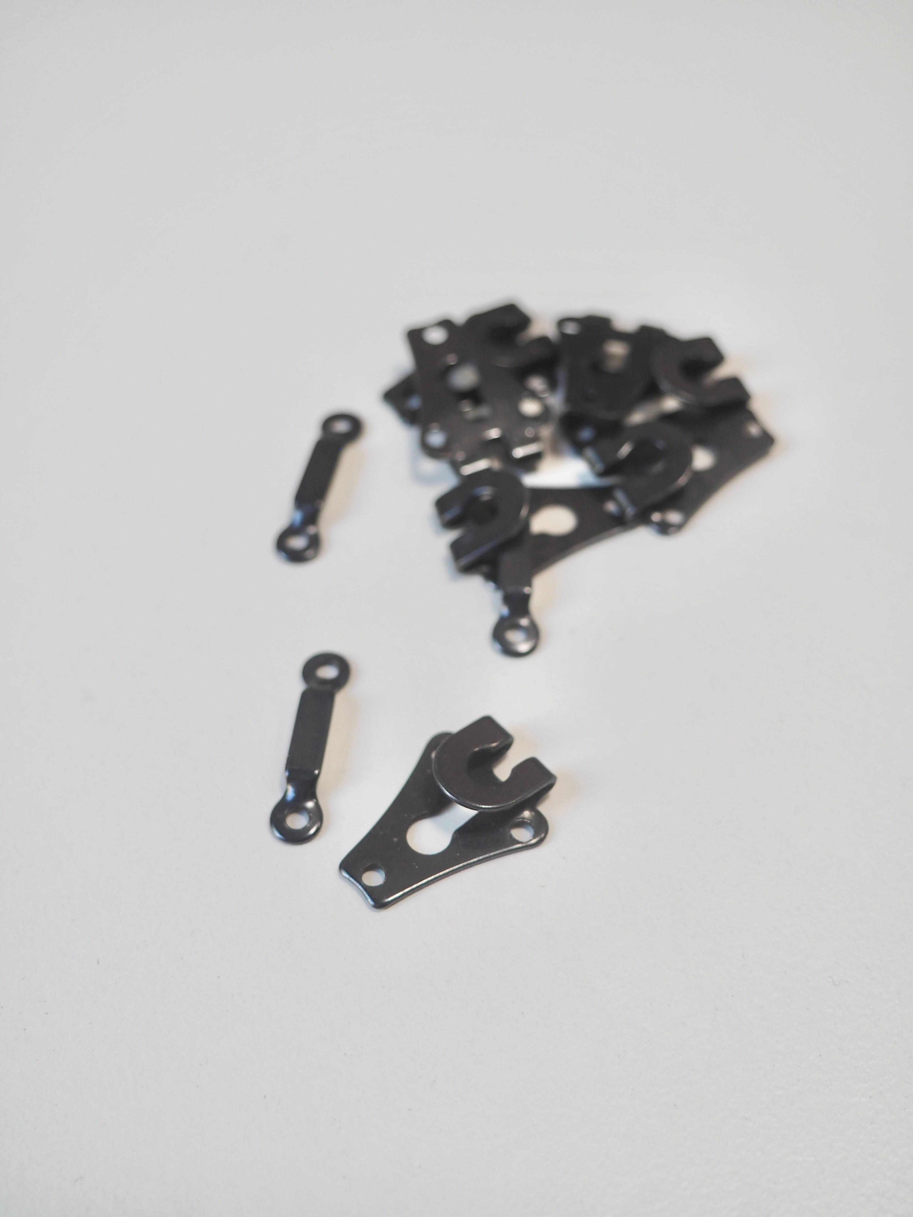 This ex-designer hardware is a hook and bar. This metal hook and bar clasp has a black finish. Perfect for a closure on a pair of trousers, a jacket, or a coat. This is the type of clasp that is typically found at the collar of a trench coat as well.