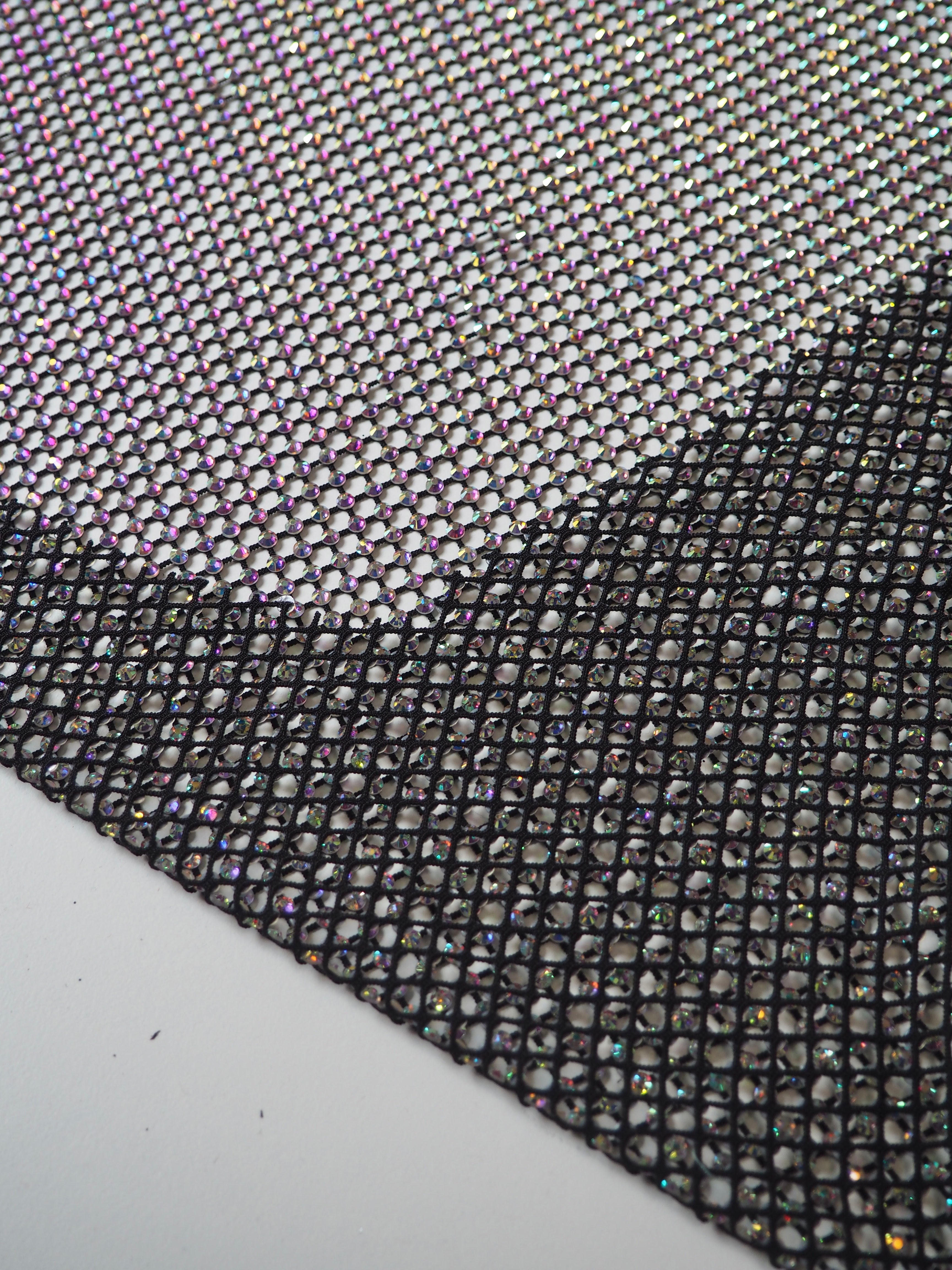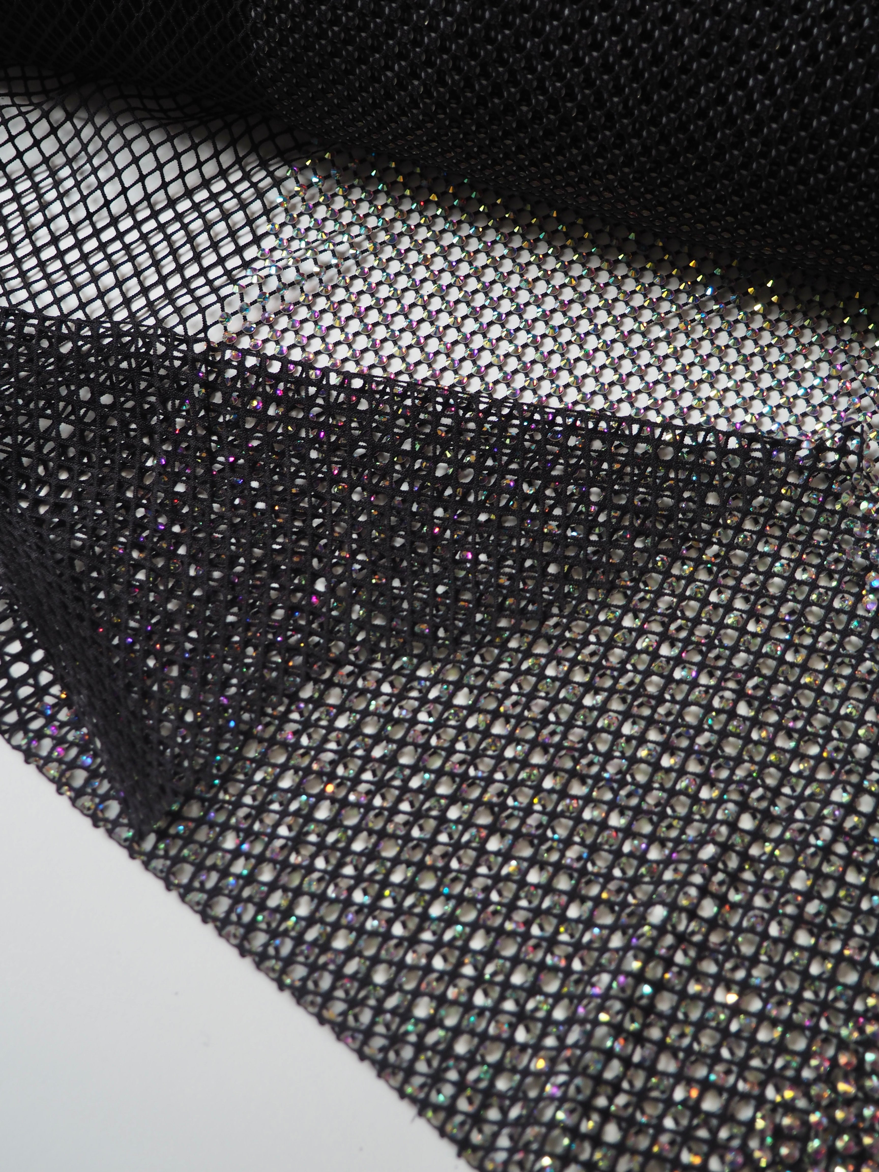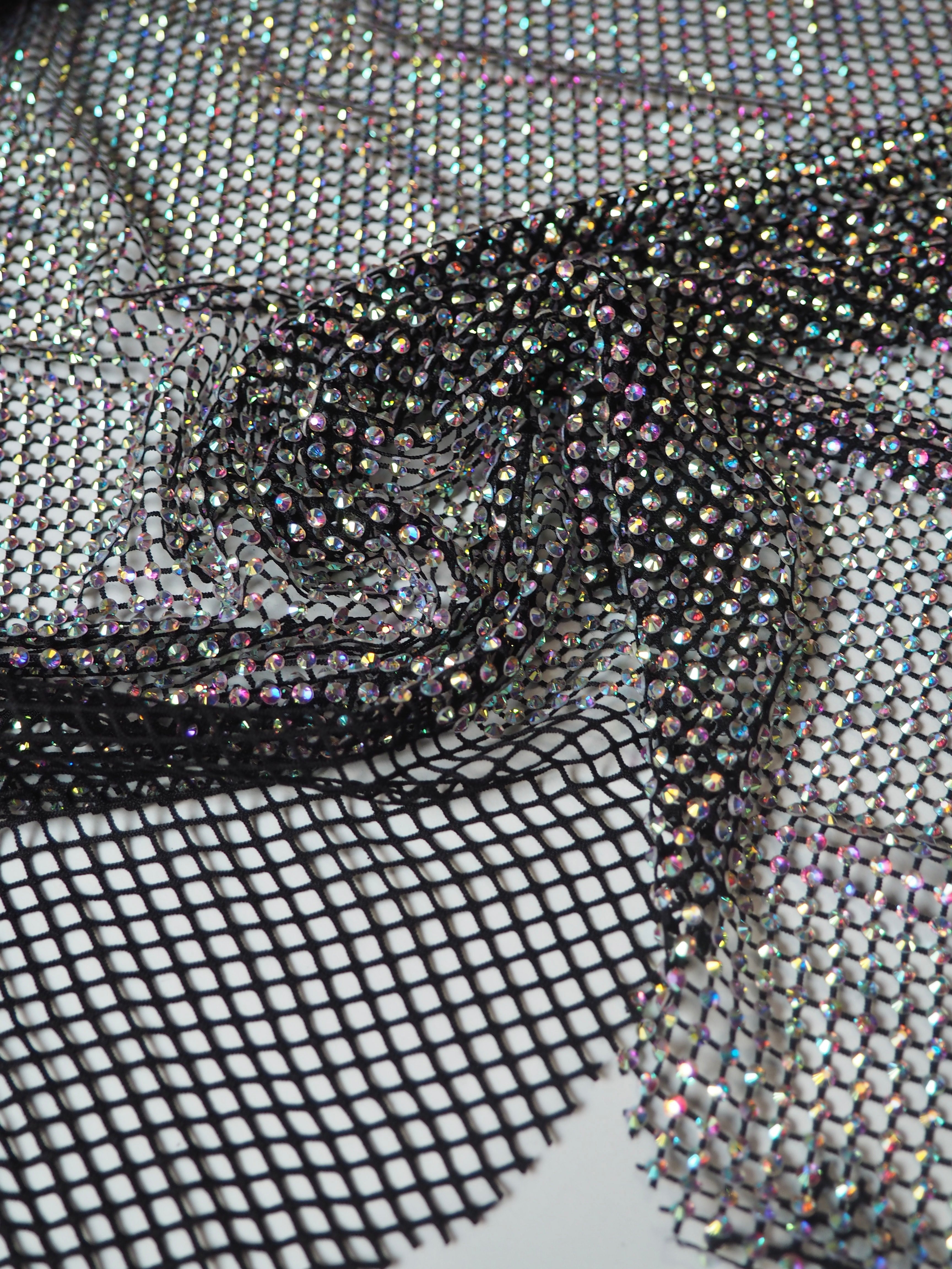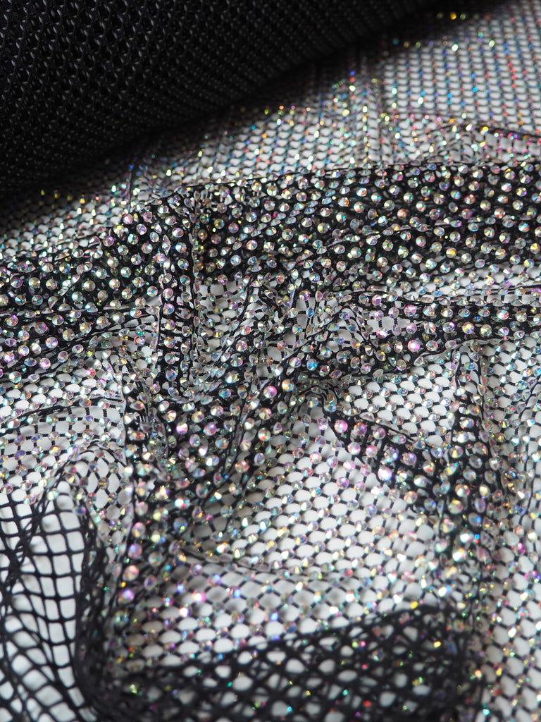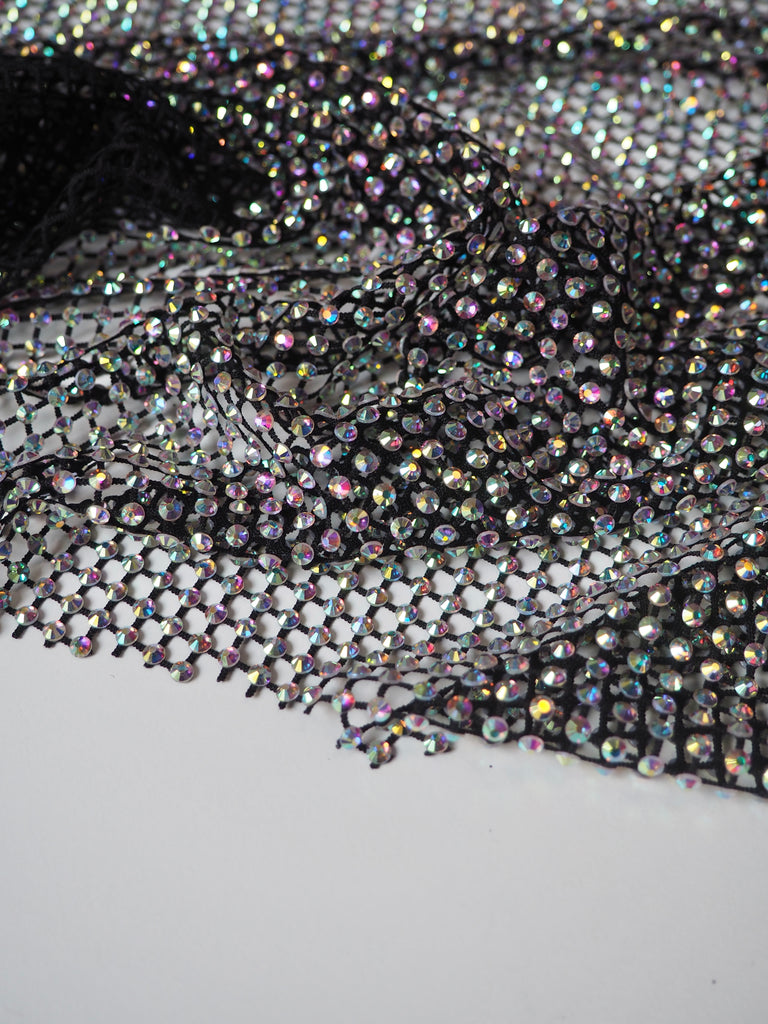 This ex-designer fabric is a special netting. This black netting has heat-bonded crystals attached densely across it's surface, in between the intersections of netting. It's quite heavy weight but still drapey and very eye-catching! Has a bit of stretch 4-way. Would be amazing in for festival wear!