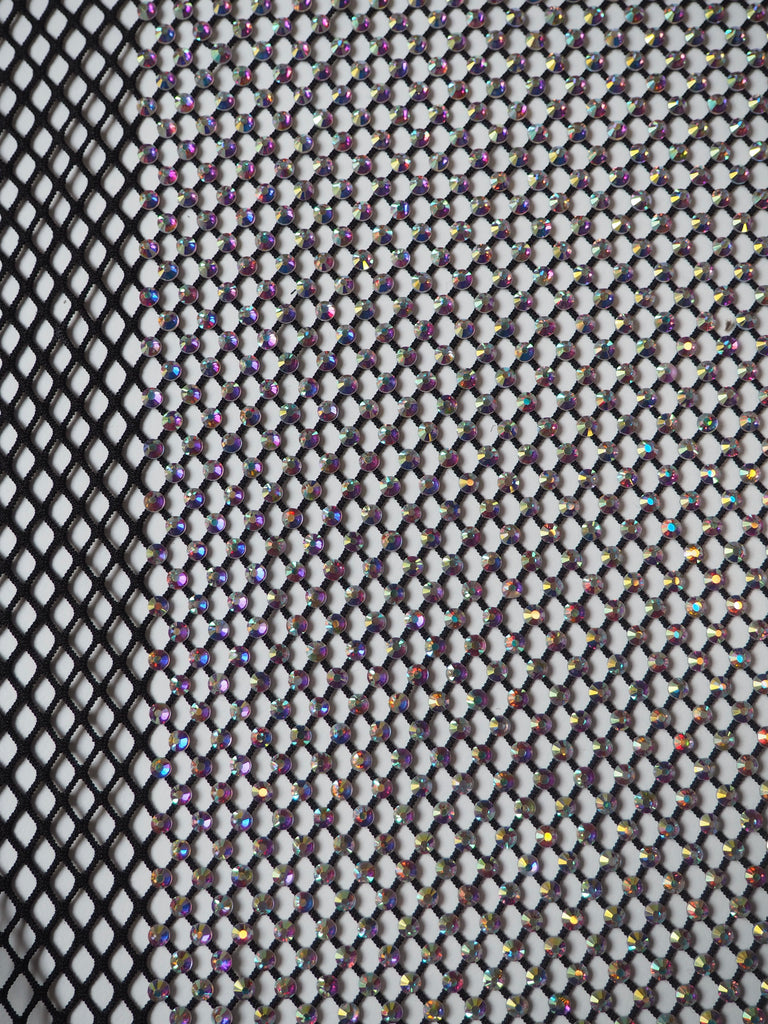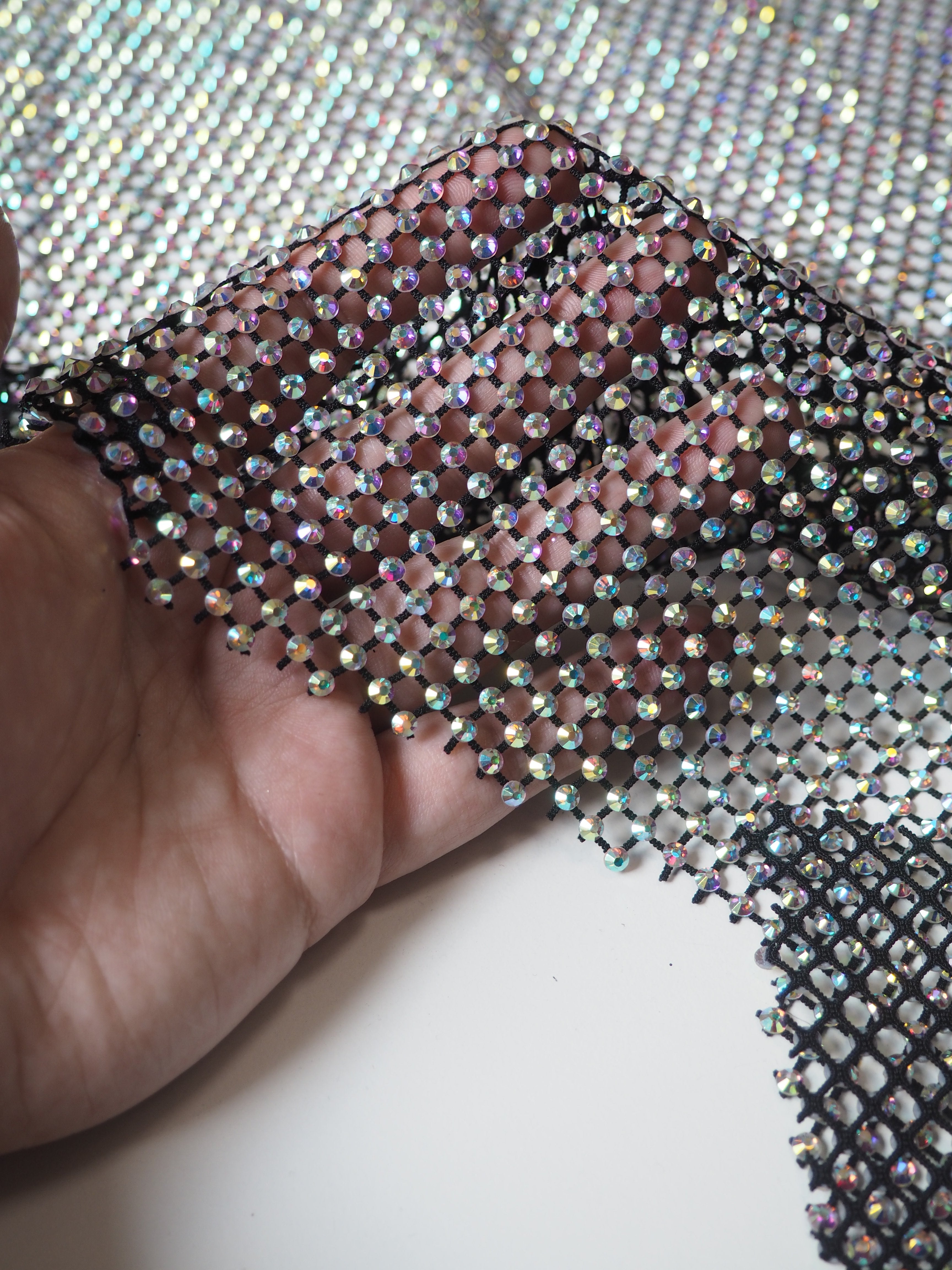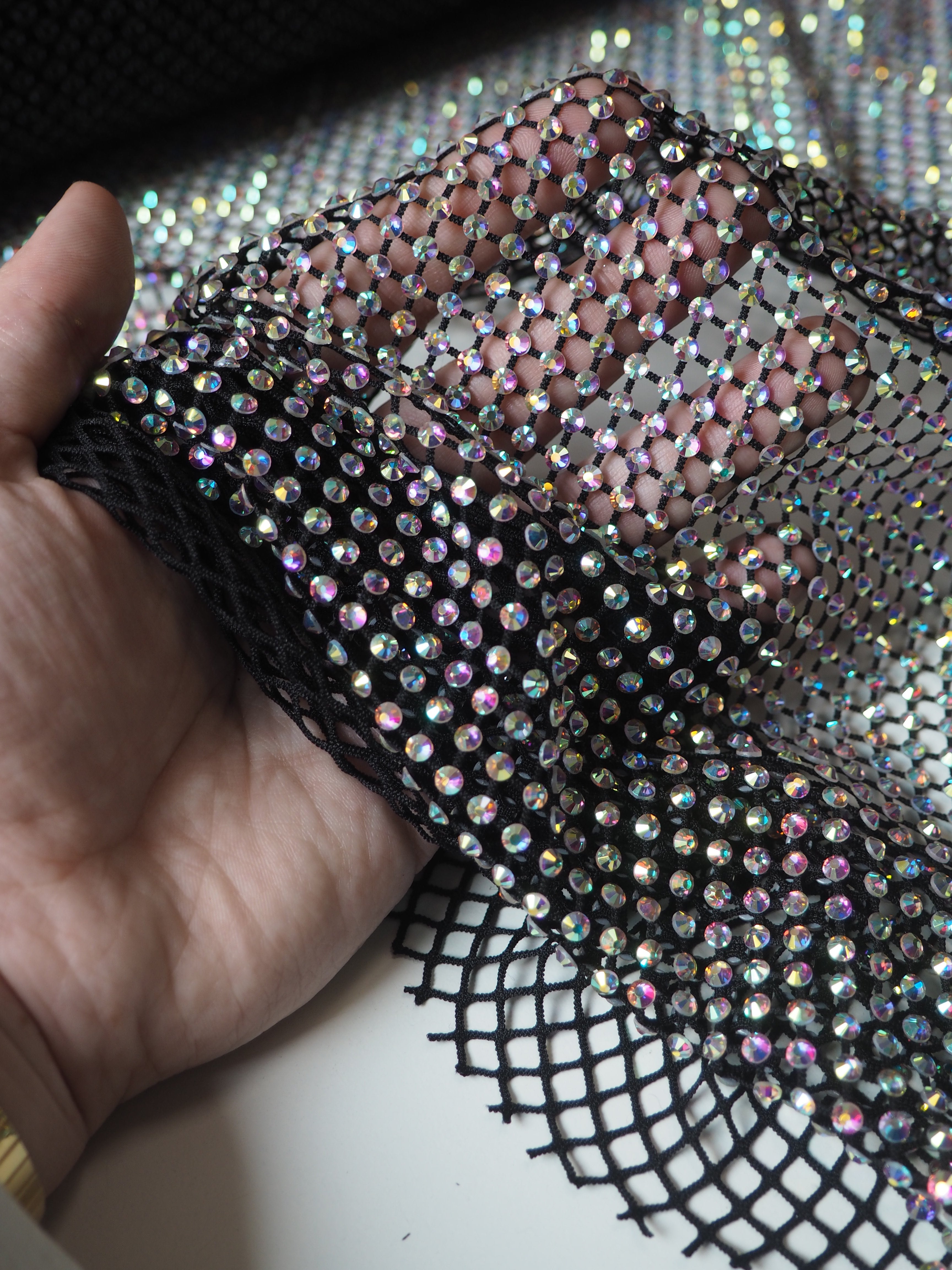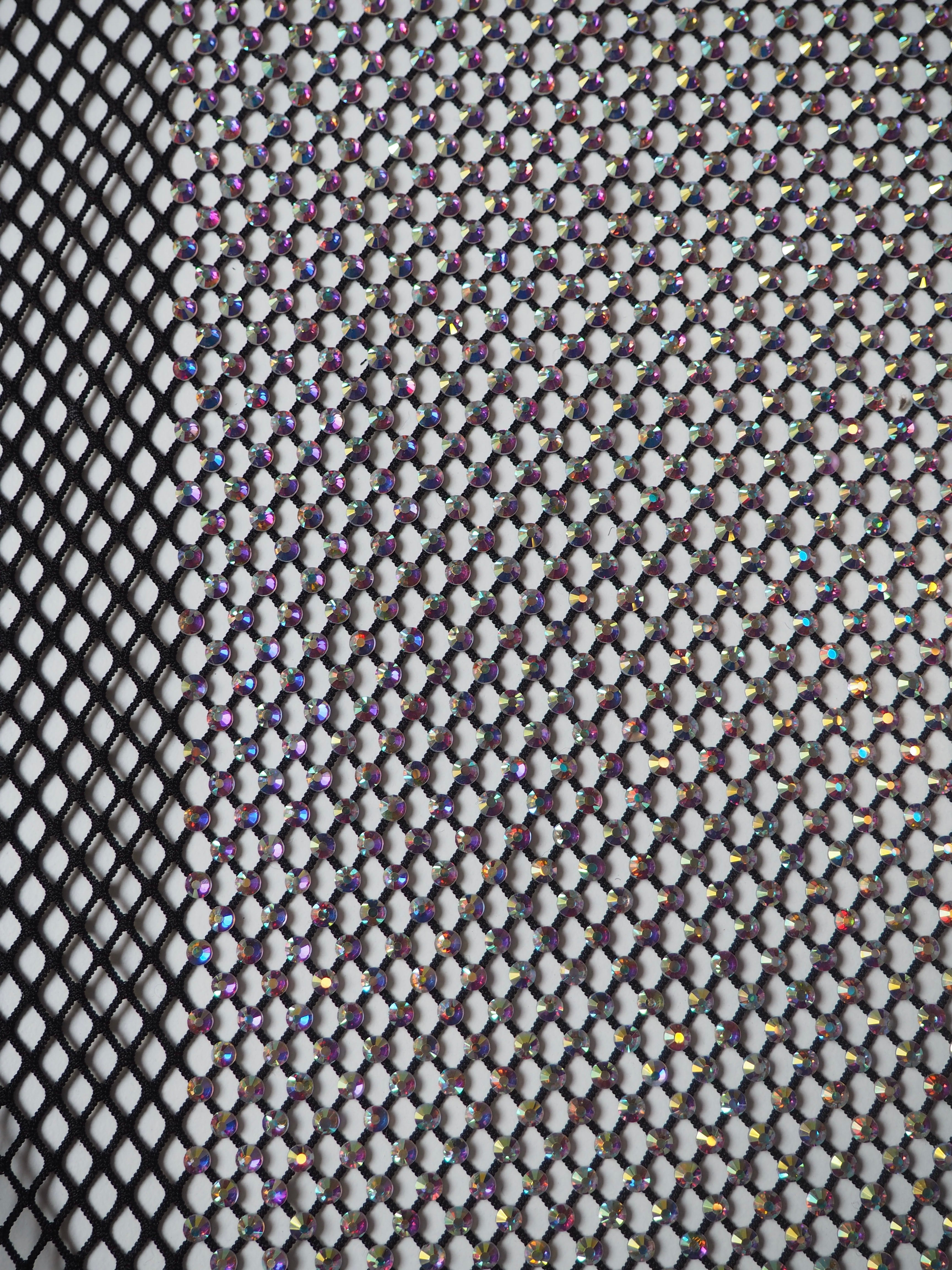 This ex-designer fabric is a special netting. This black netting has heat-bonded crystals attached densely across it's surface, in between the intersections of netting. It's quite heavy weight but still drapey and very eye-catching! Has a bit of stretch 4-way. Would be amazing in for festival wear!