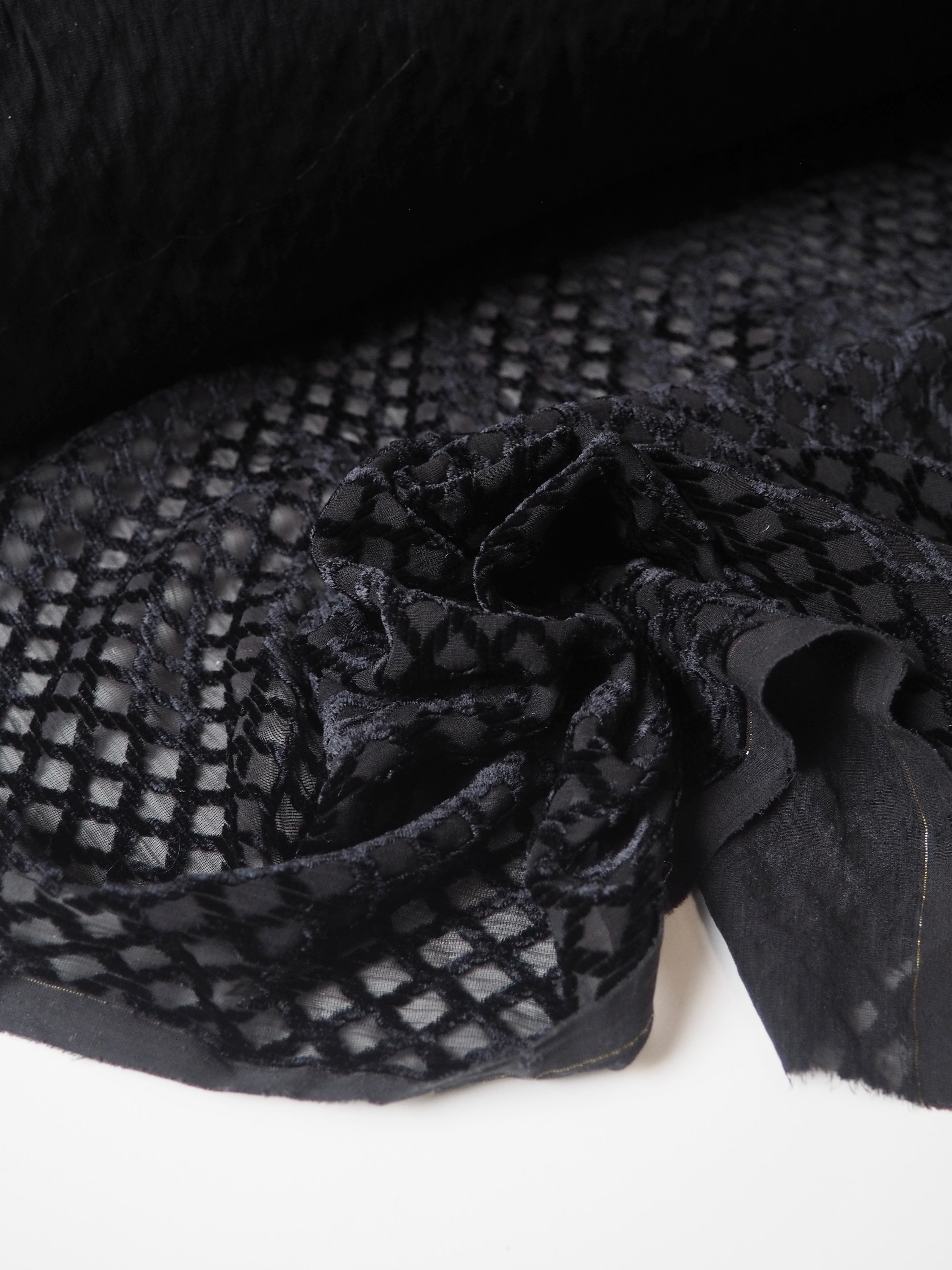 This ex-designer fabric is a beautiful chiffon. Black velvet diamond lattices cover the cloth, with a sheer chiffon opposite. It has such a luxurious silk/viscose handle! Very slinky and semi-sheer, with an incredible drape and fantastic movement. It has a lovely shine to finish off. Would look amazing as a blouse or as the overlay of a fancy dress!