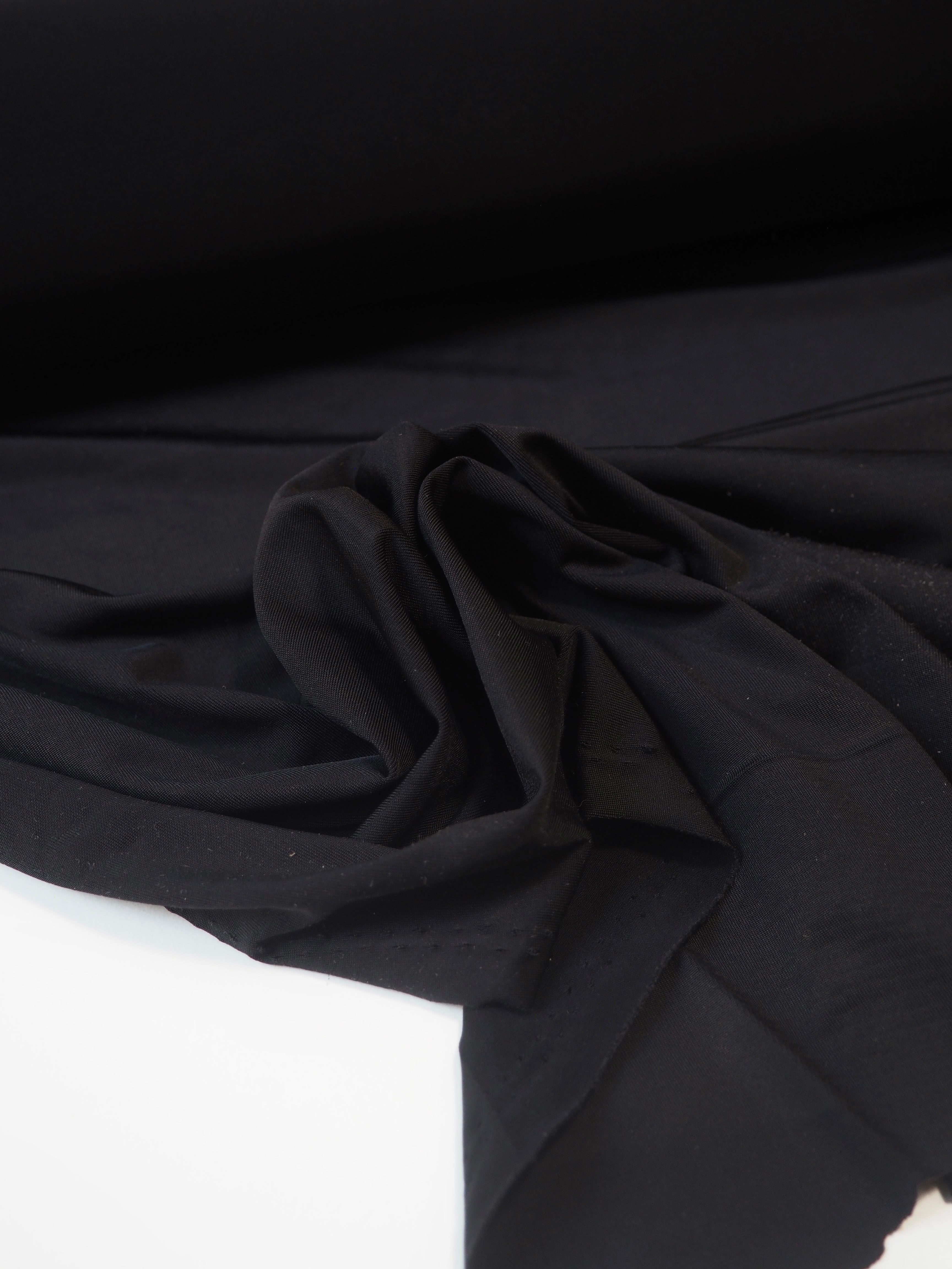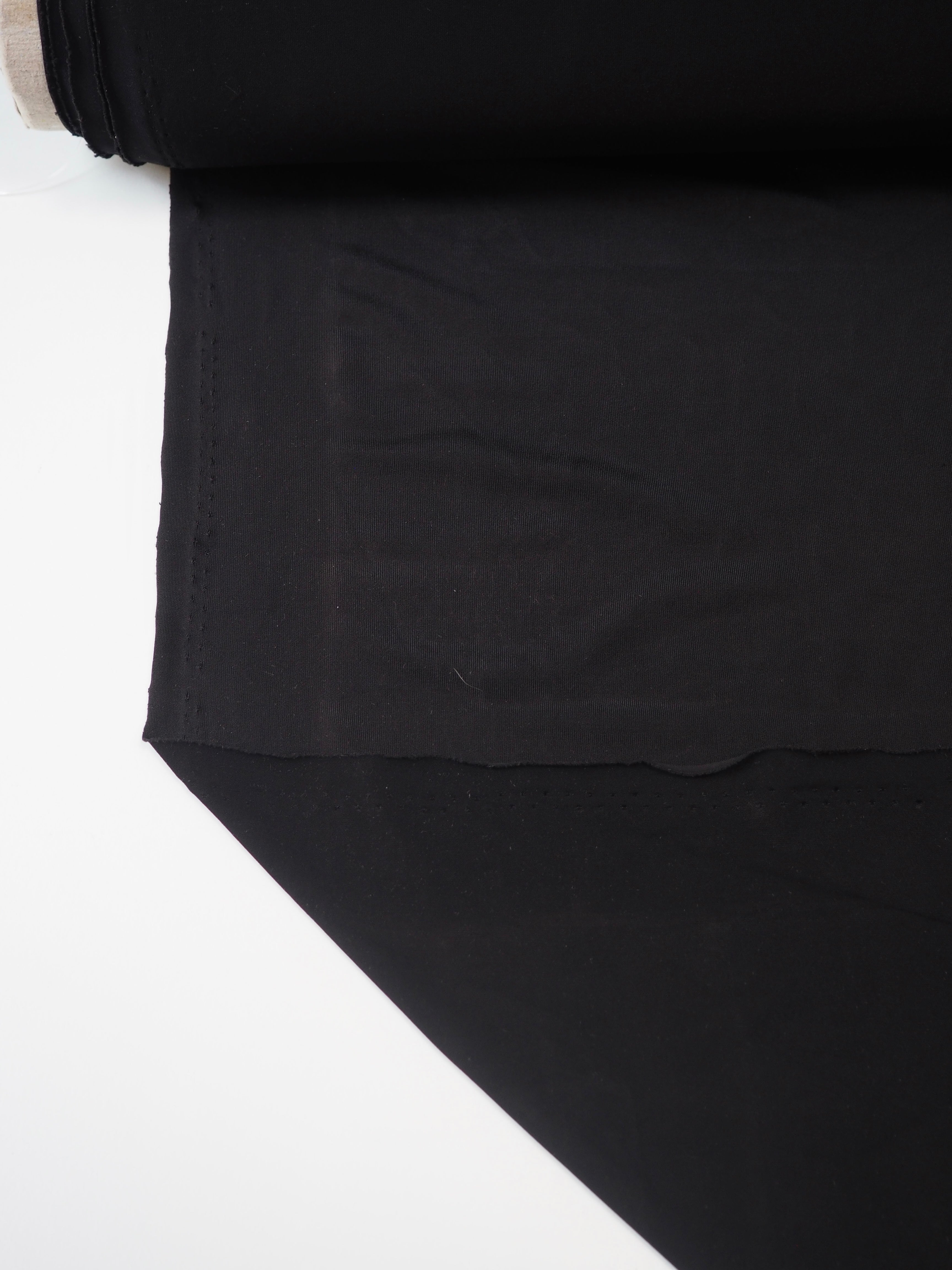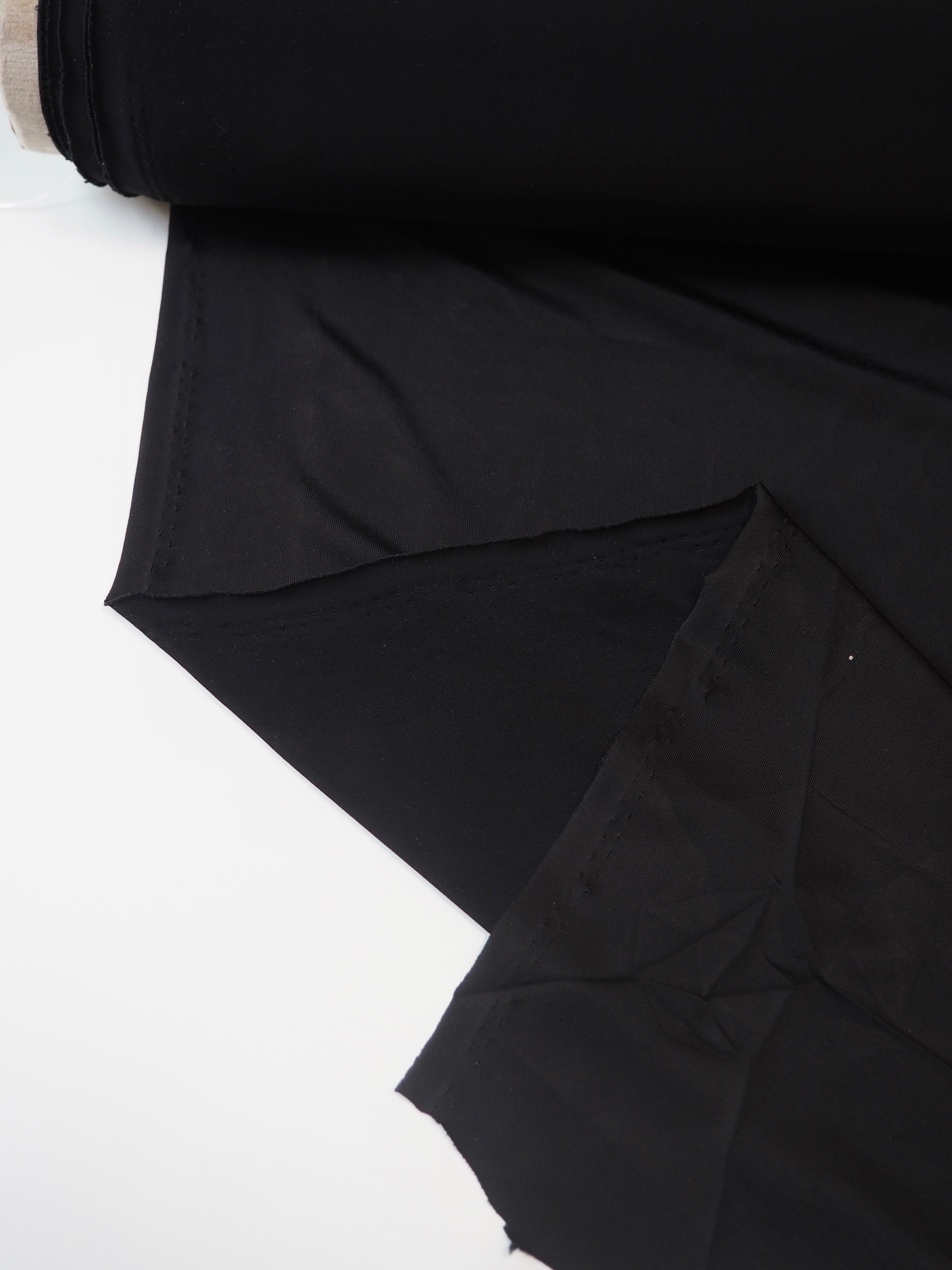 This ex-designer fabric is a single jersey. It's opaque and lightweight. It has a slight sheen finish and very soft, slinky handle. About 50% stretch each way and great recovery. Super drapey and lovely movement. Great for everyday basics, fitted dresses, and perfect for dress linings!
