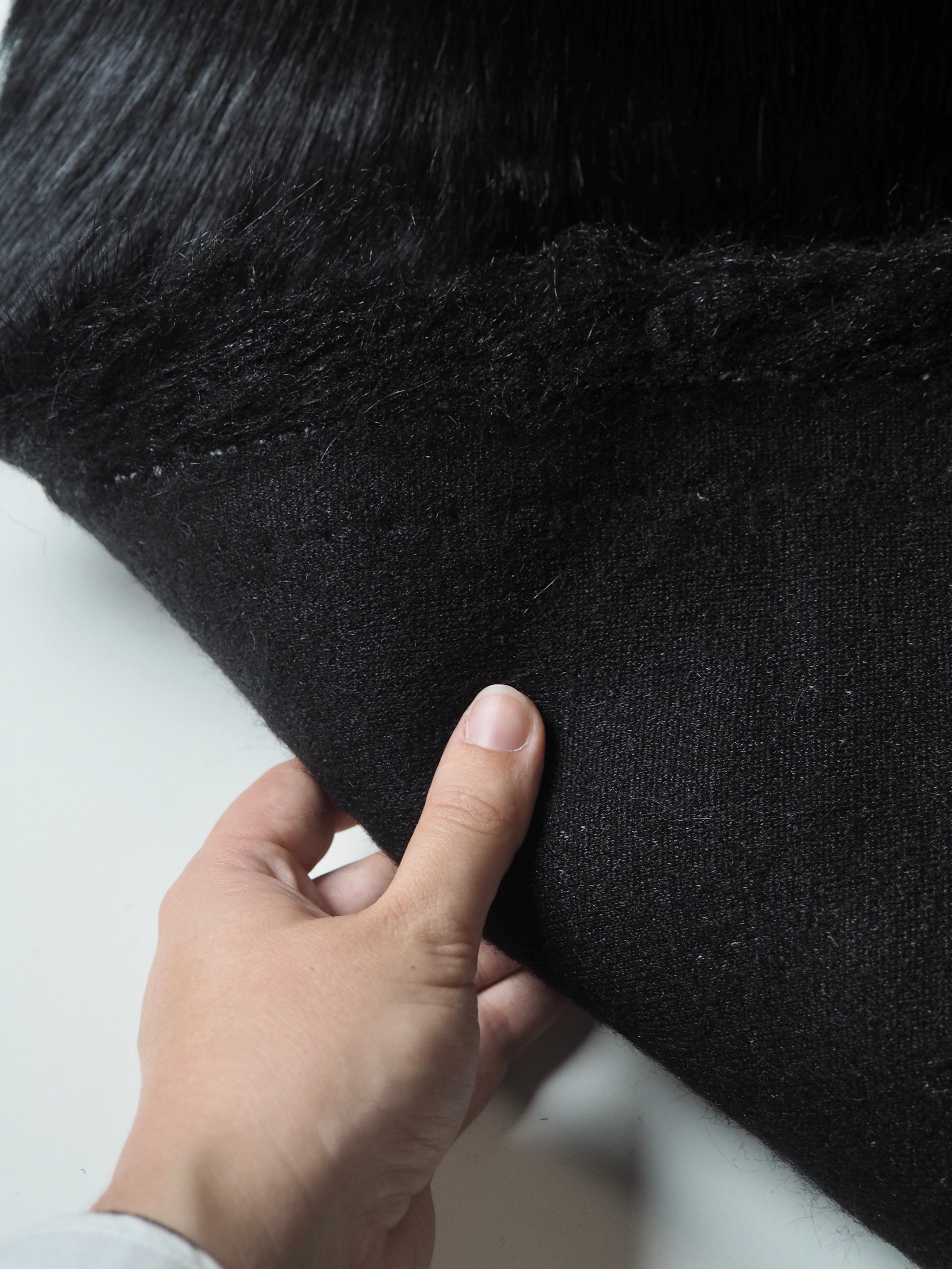 This ex-designer fabric is a faux fur. It's a knit jersey on the reverse with long, black imitation-fur hairs, about 6cm long, on the topside. It's such a statement cloth! So smooth and soft, with a sateen sheen. Mid to heavyweight, with a nice thick pile that's so warm and cozy. It's perfect for bold coats or even cushions!