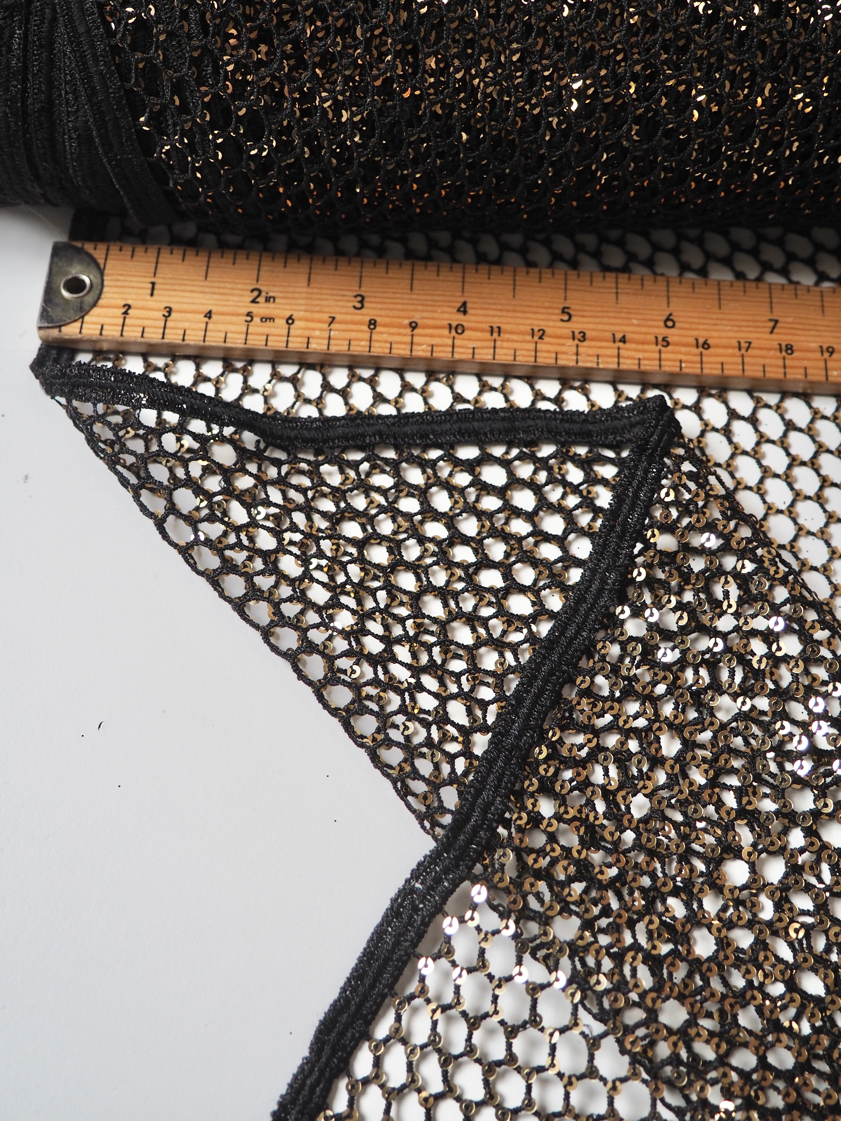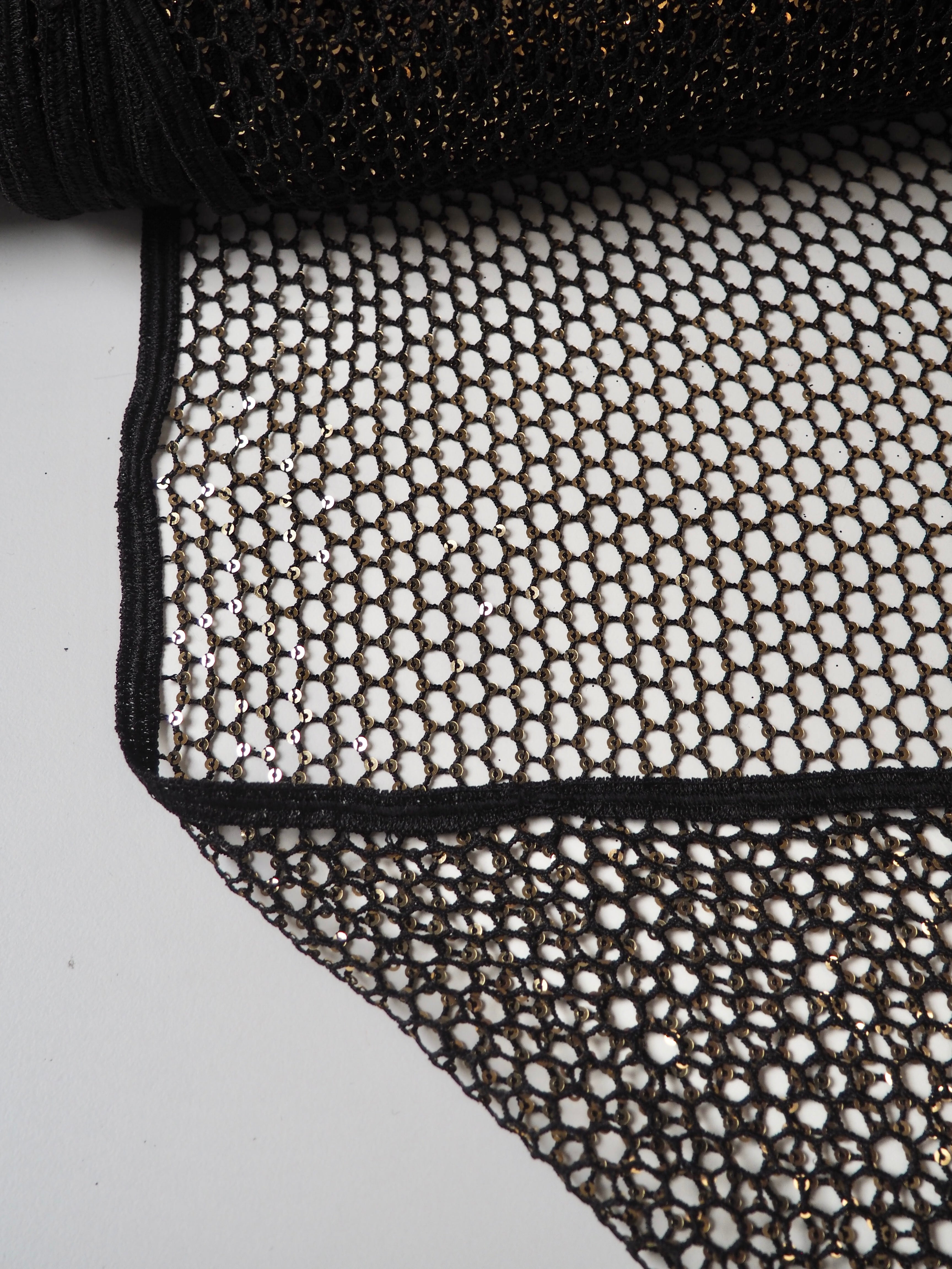 This ex-designer fabric is an exquisite lace. It is a guipure-like fishnet lace, with little gold sequins stitched on throughout. It's very delicate and drapey, and so spangly! Lightweight with a nice softness and lush handle. Such a beautiful finish and movement! Would make a gorgeous sheer top or overlay!