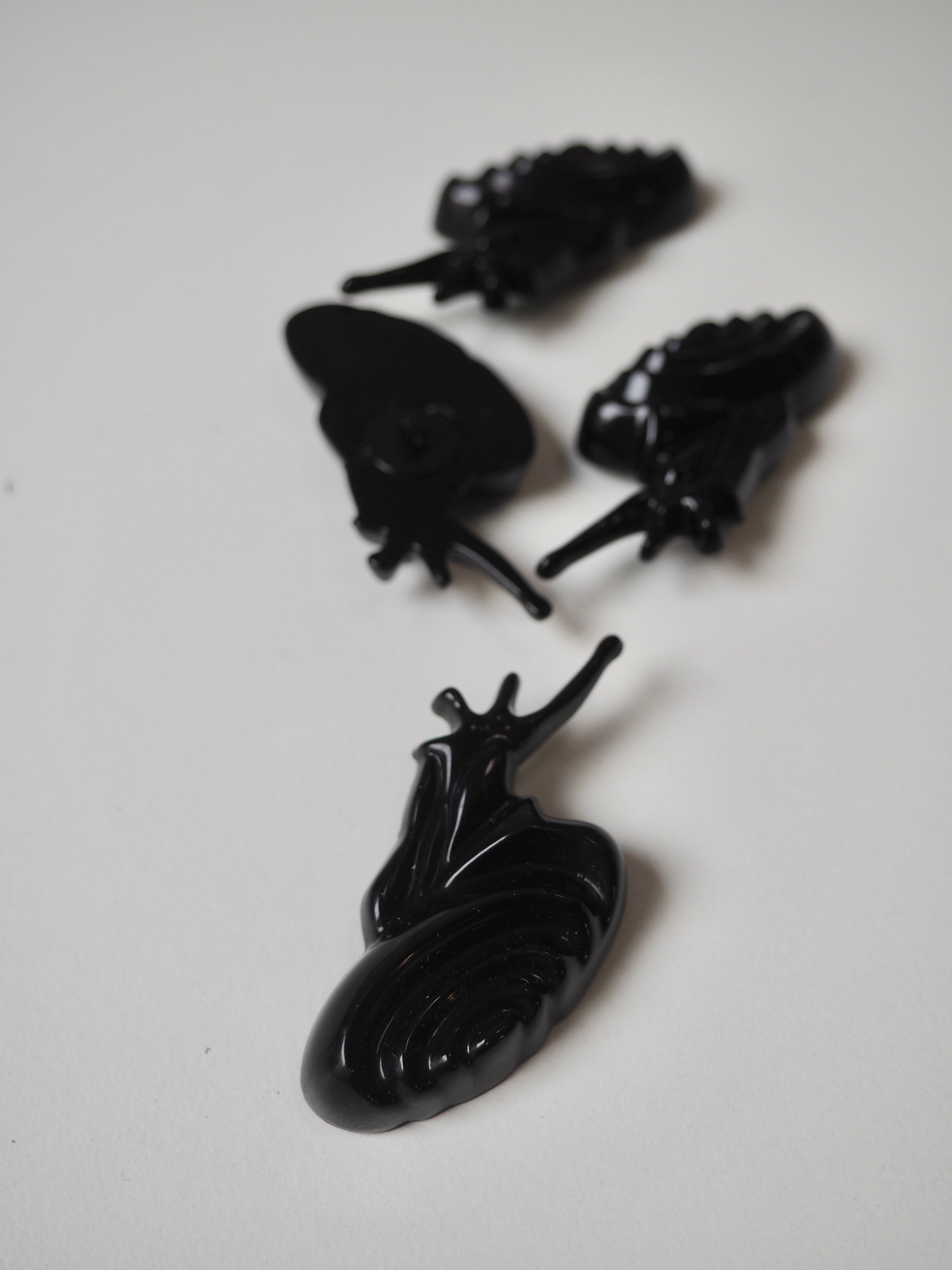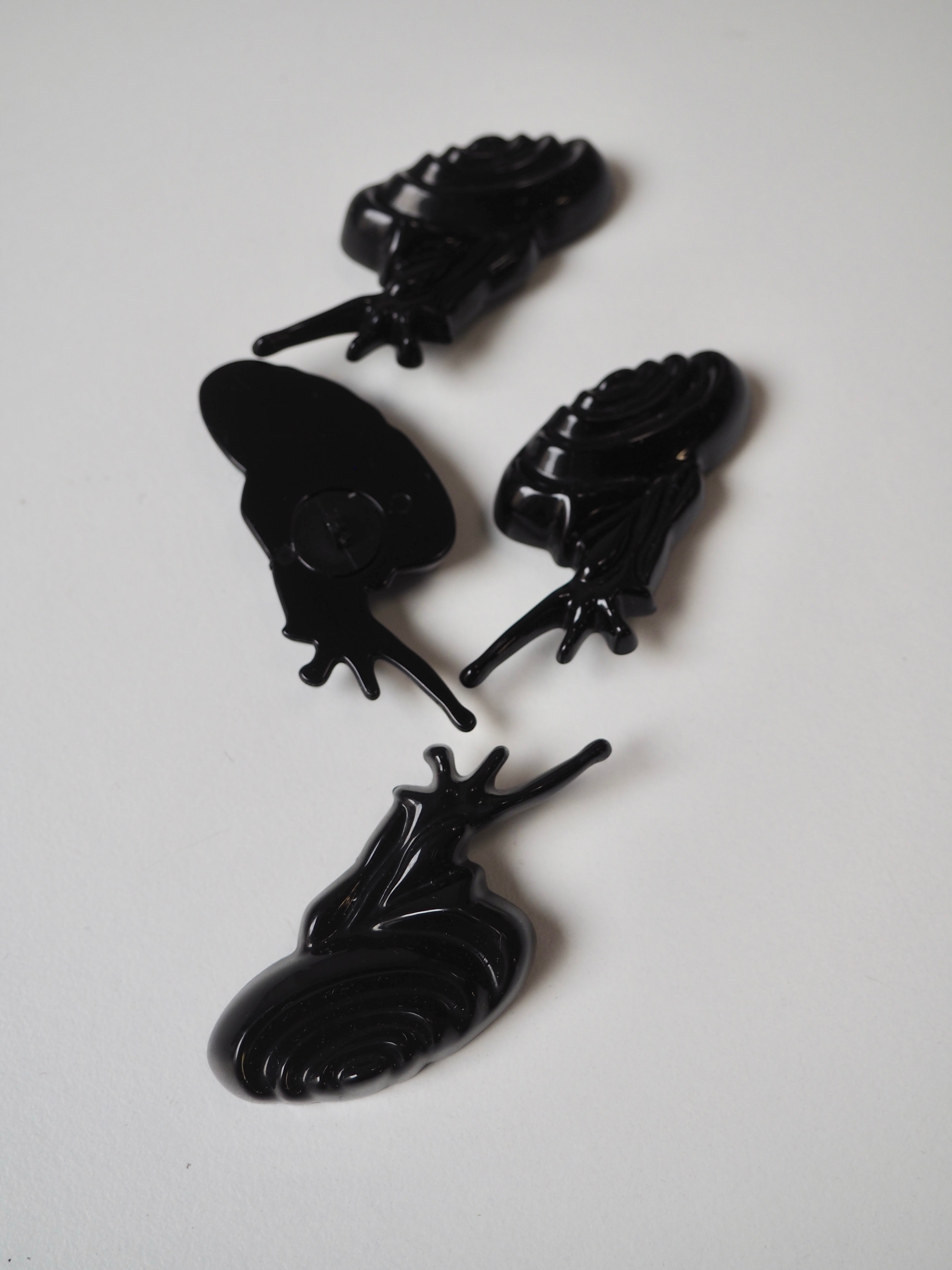 This ex-designer trim is a plastic shank button. They are a 3D snail design with a shiny finish. The dimensions are 25mm x 60mm and the perfect size for cardigans, coats and jackets.
