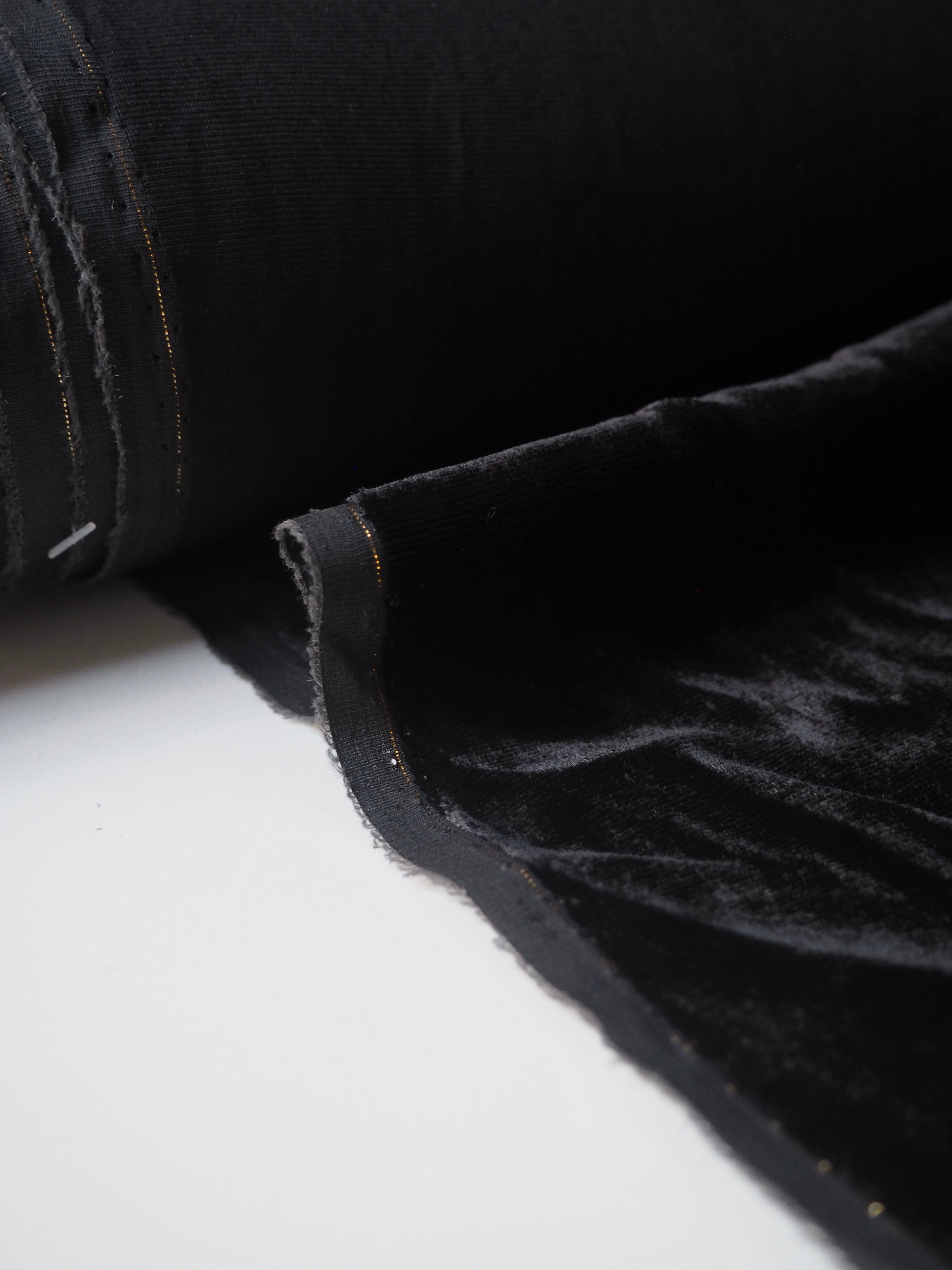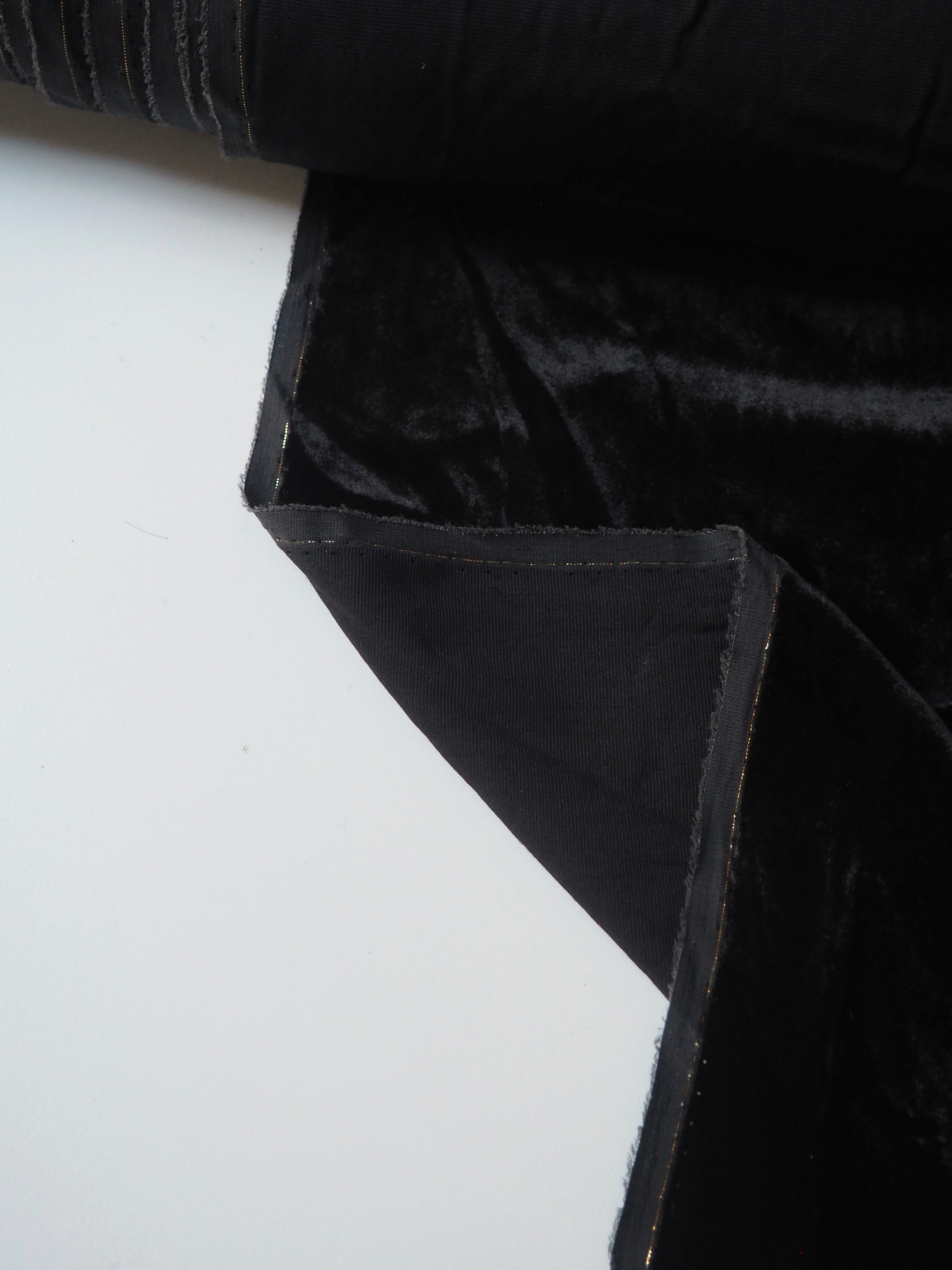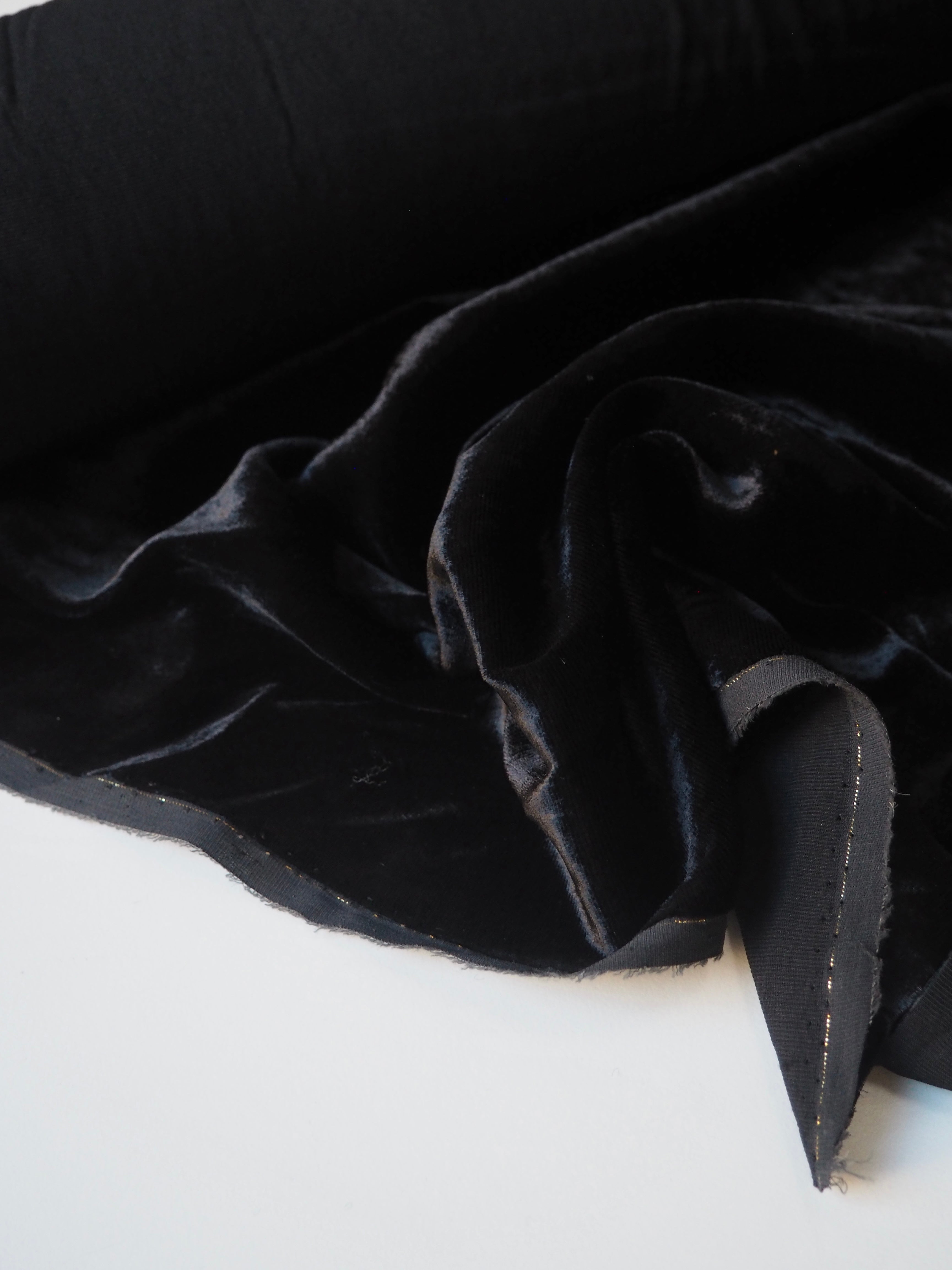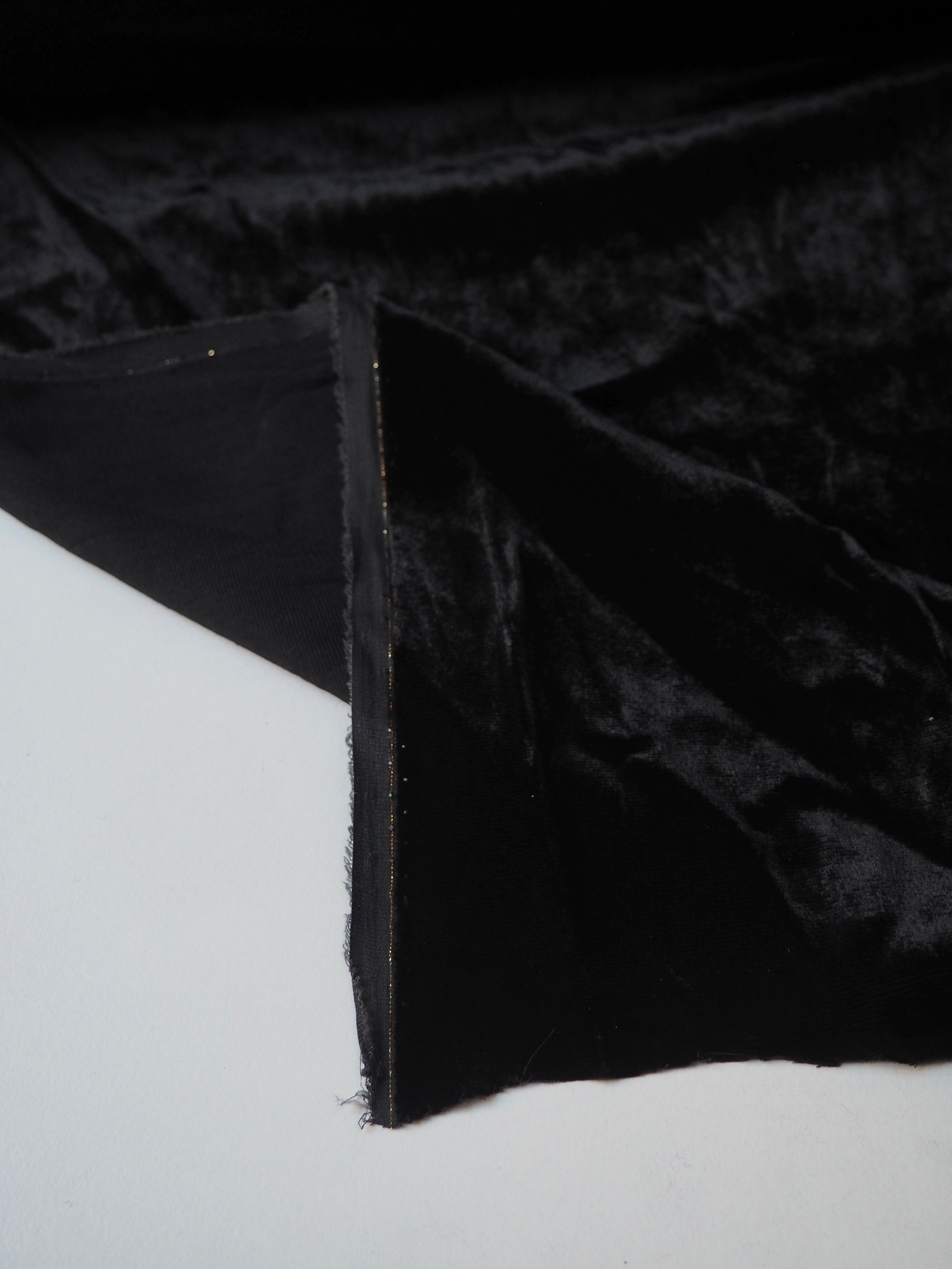 This ex-designer fabric is a sumptuous velvet. It's a fibre blend of viscose and silk, which makes it incredibly soft and luxurious. Has a 5% stretch for ease, width-ways. Has a slightly crushed looking finish from delivery, but steam and brushing can revive the pile if desired. It's opaque, with such a beautiful sheen as well. Has a light to medium pile that is wonderful to handle. Lightweight and with a beautiful drape and lovely movement. Perfect for a dress or even a blouse!