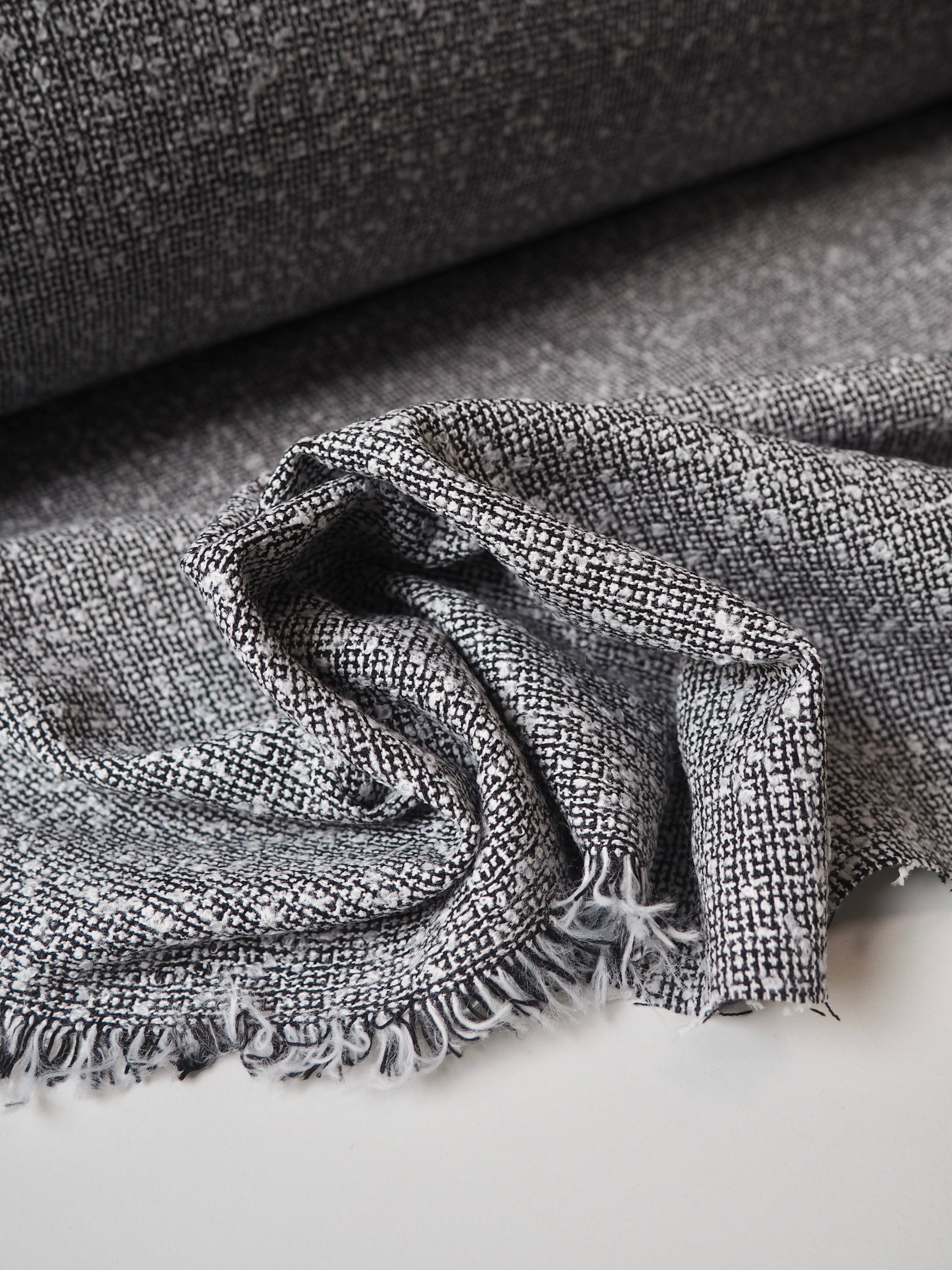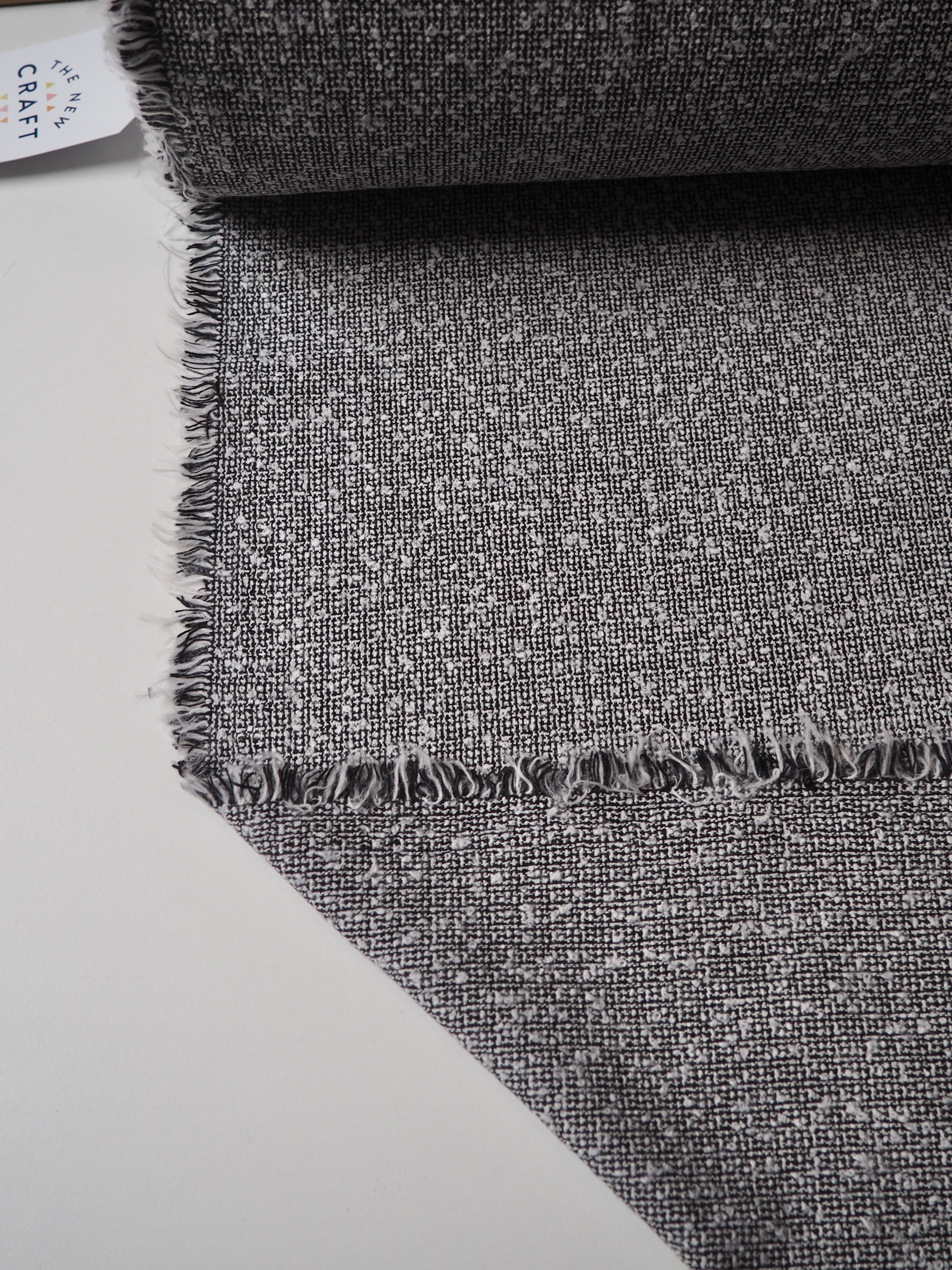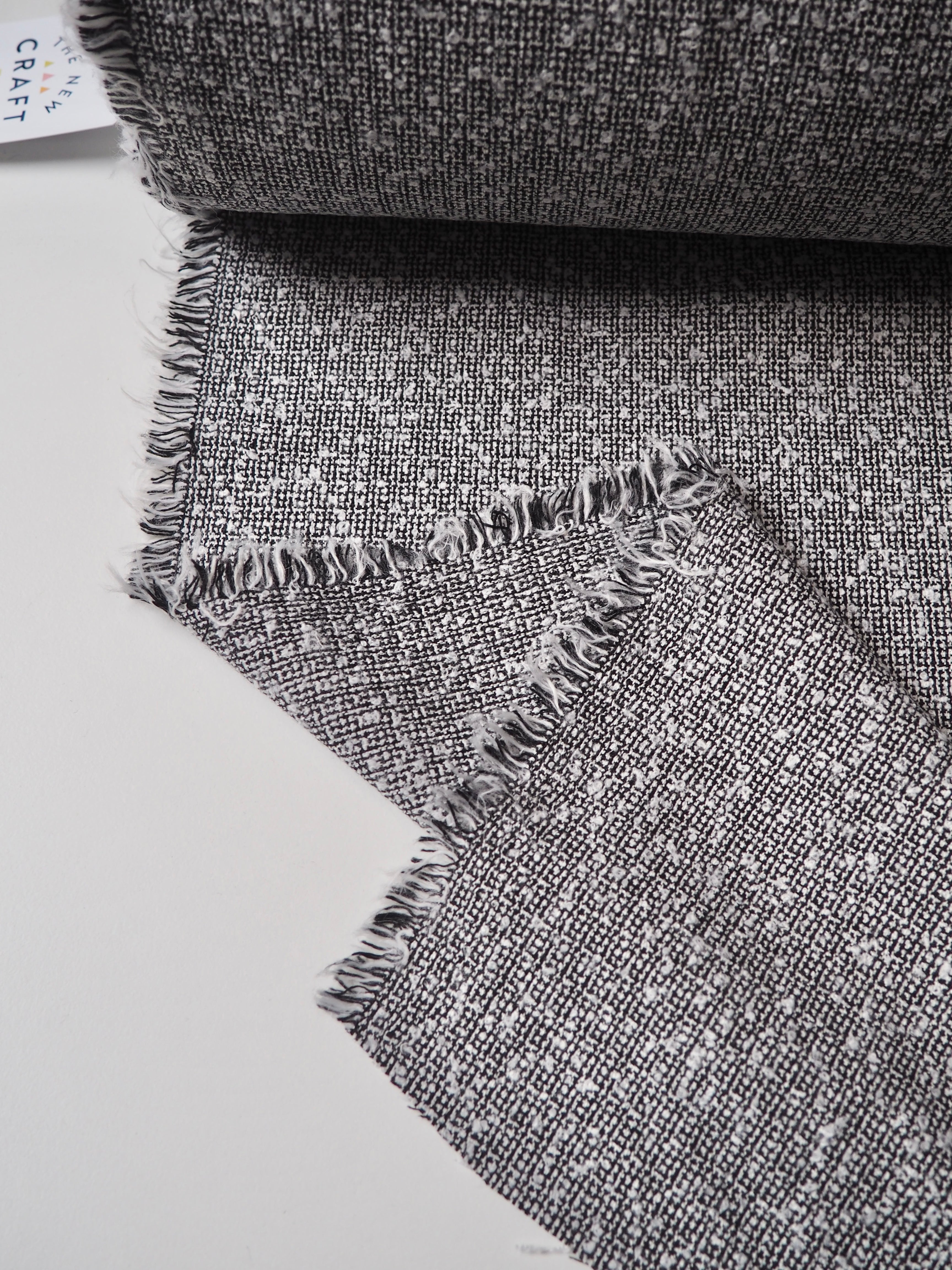 This ex-designer fabric is a bouclé. It's a black and white colourway, with a sturdy but lighter weight weave. It has a typical bobbly bouclé texture, and is very soft! It has a gentle structure and nice drape. Light to medium weight, with a lovely handle that feels like a blanket! Great for a light jacket that could be interfaced, or even a co-ord set!