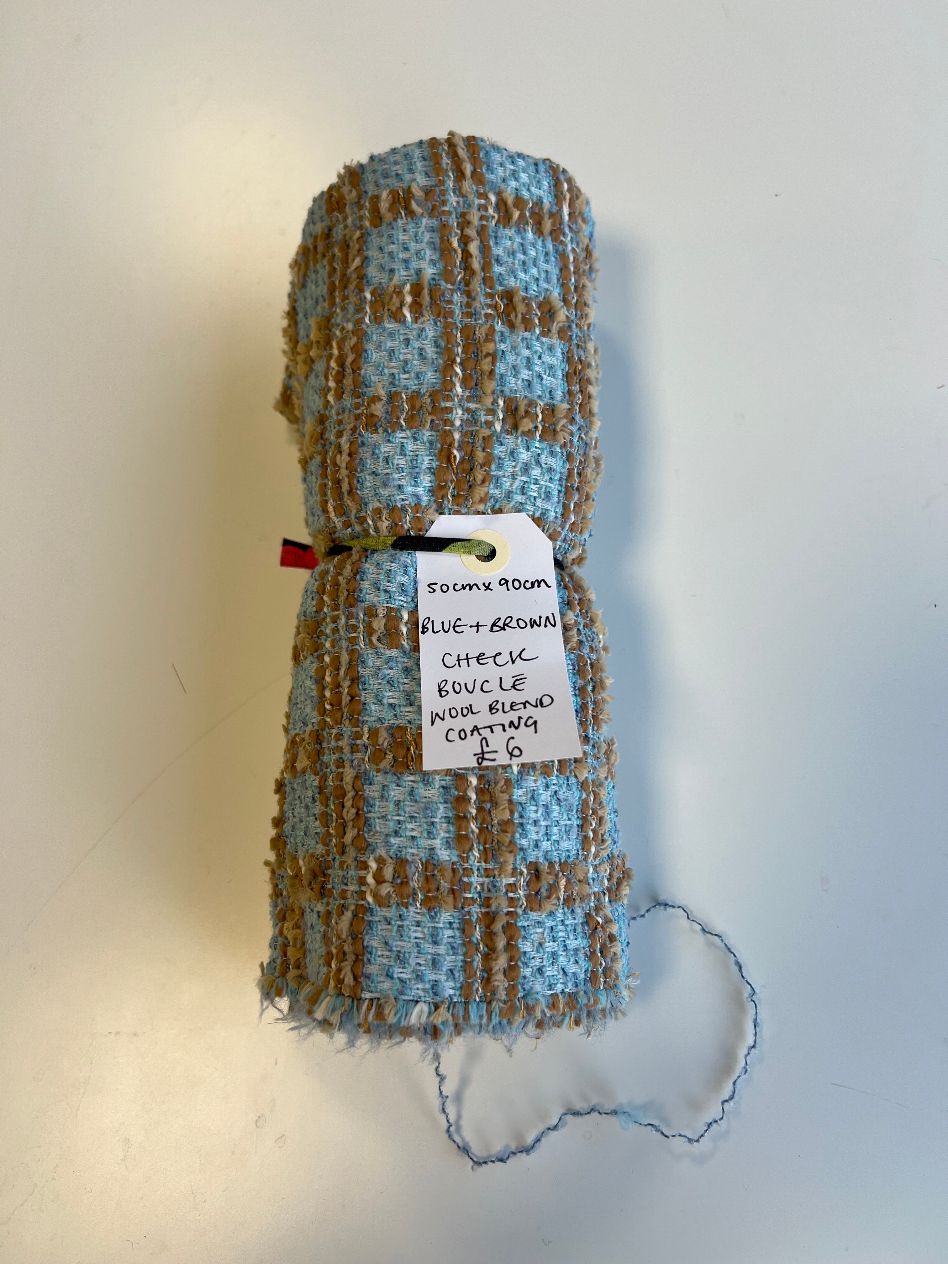 Blue + Brown Check Boucle Wool Blend Coating Remnant