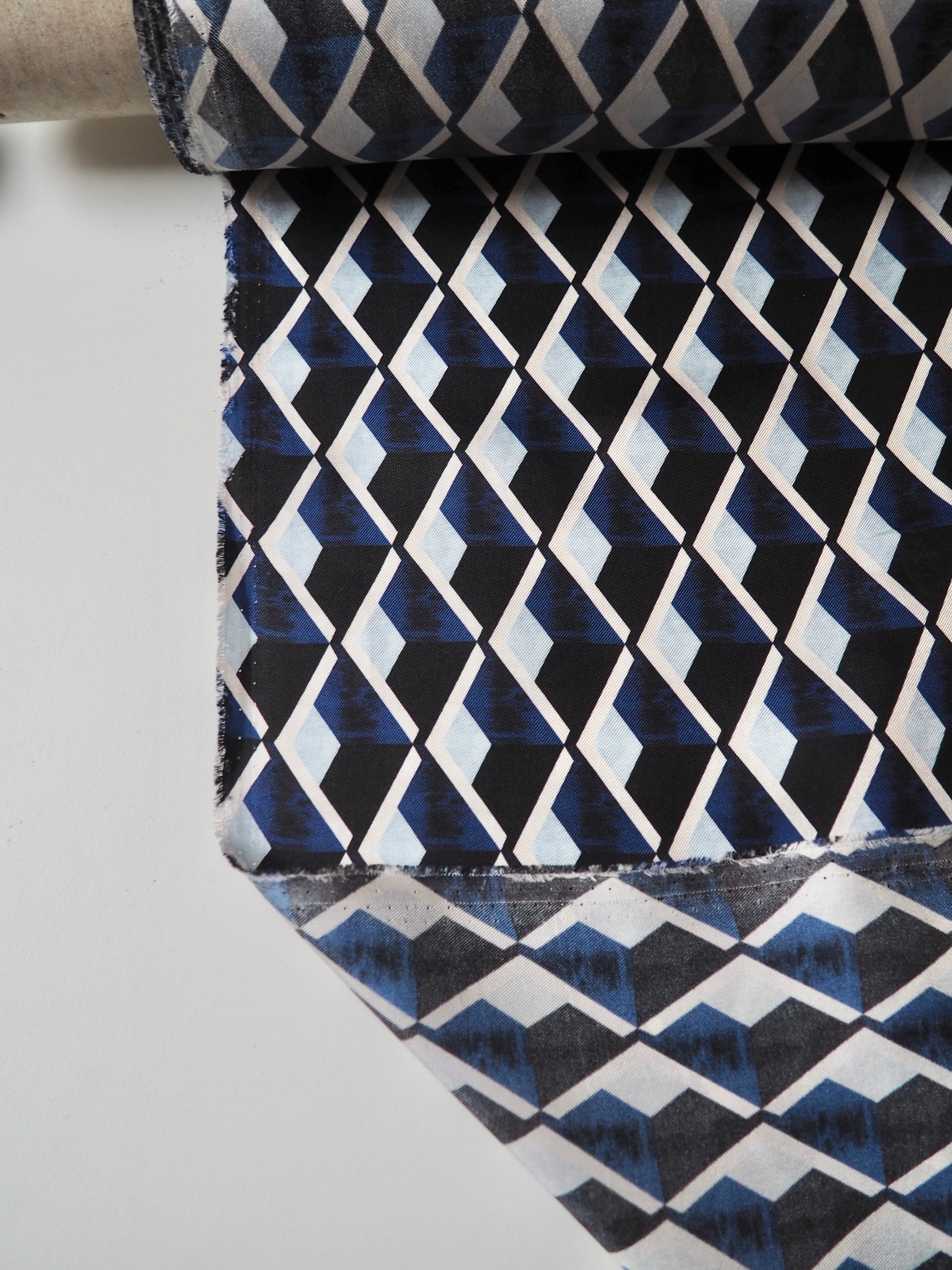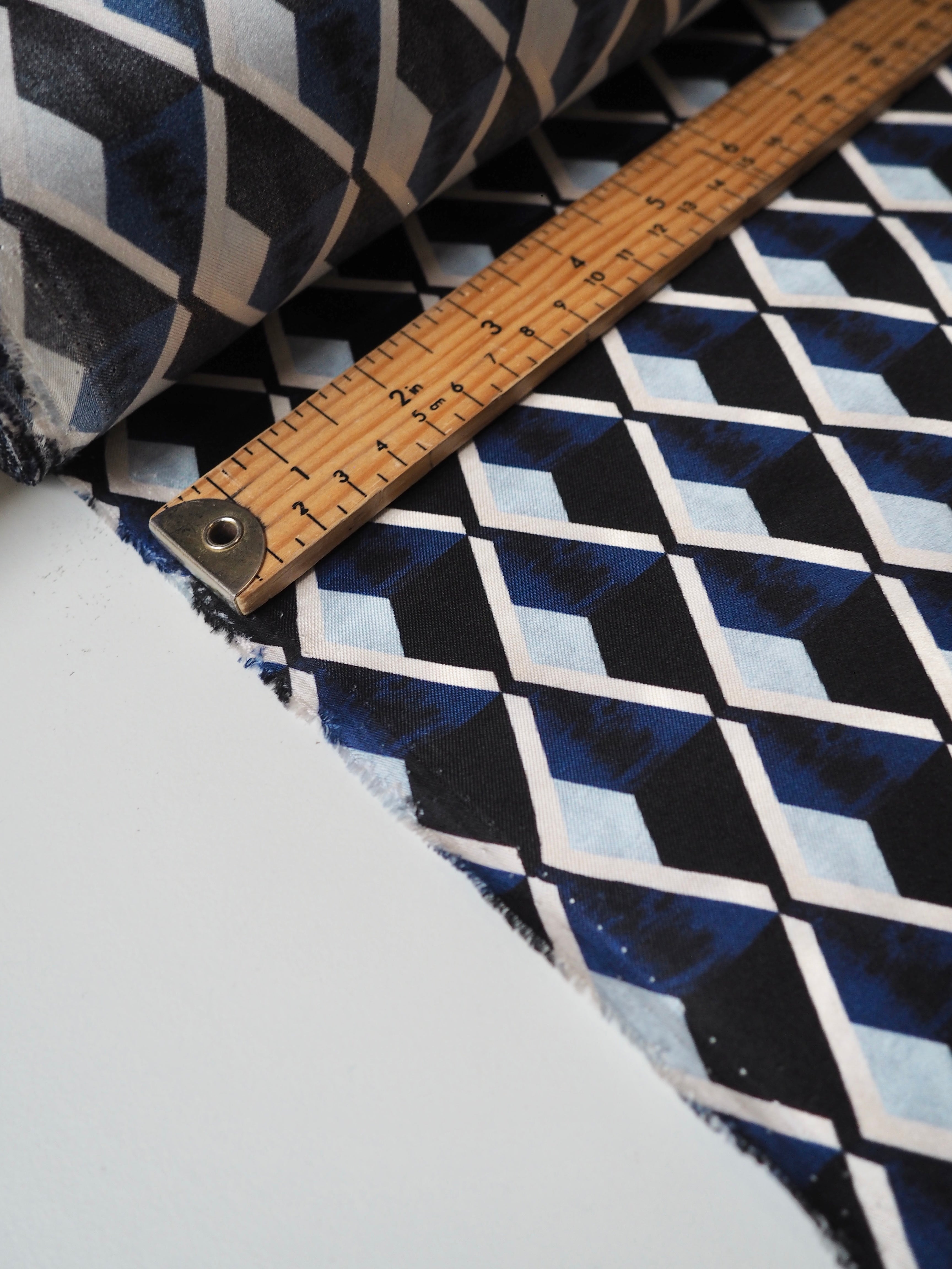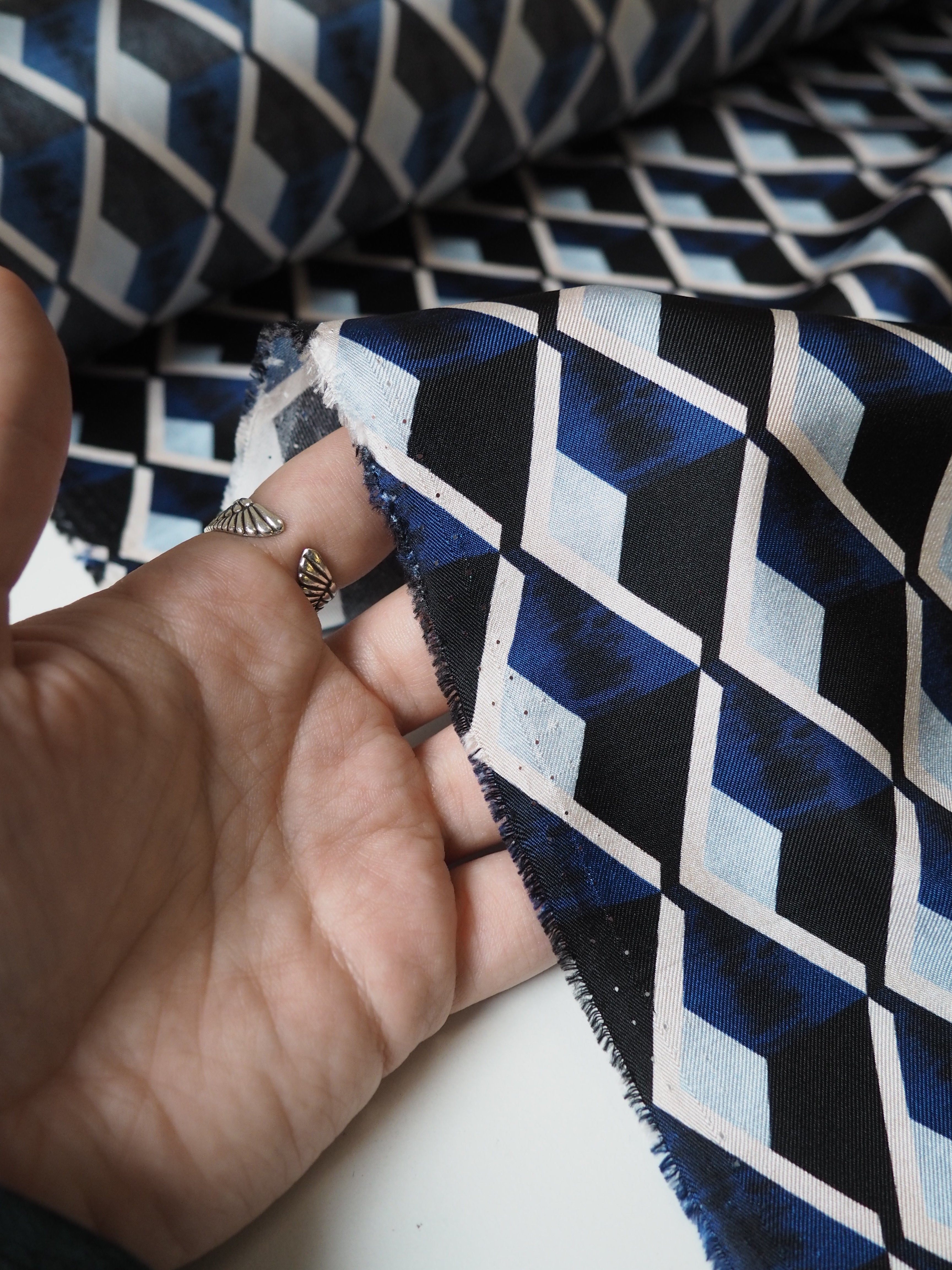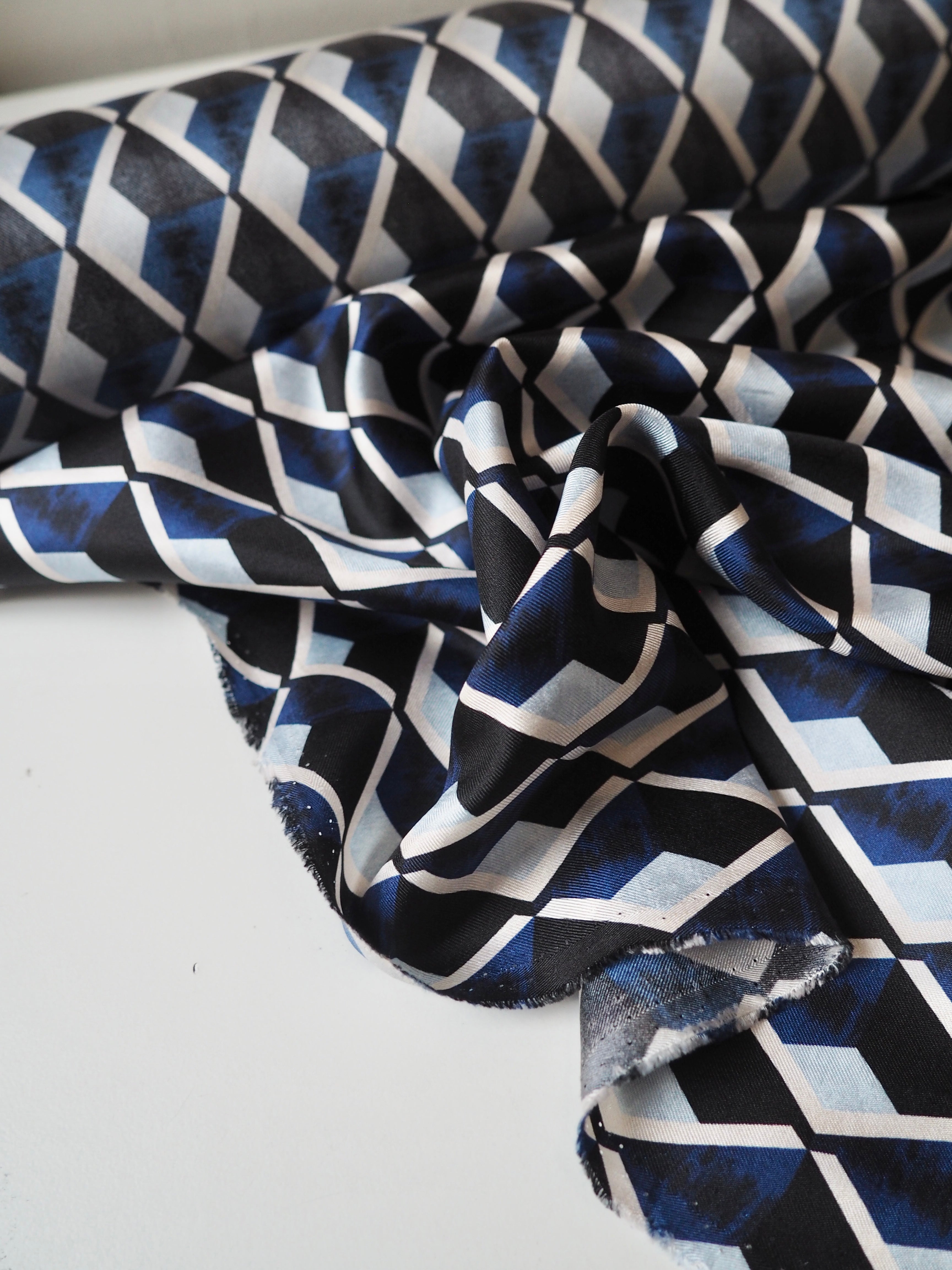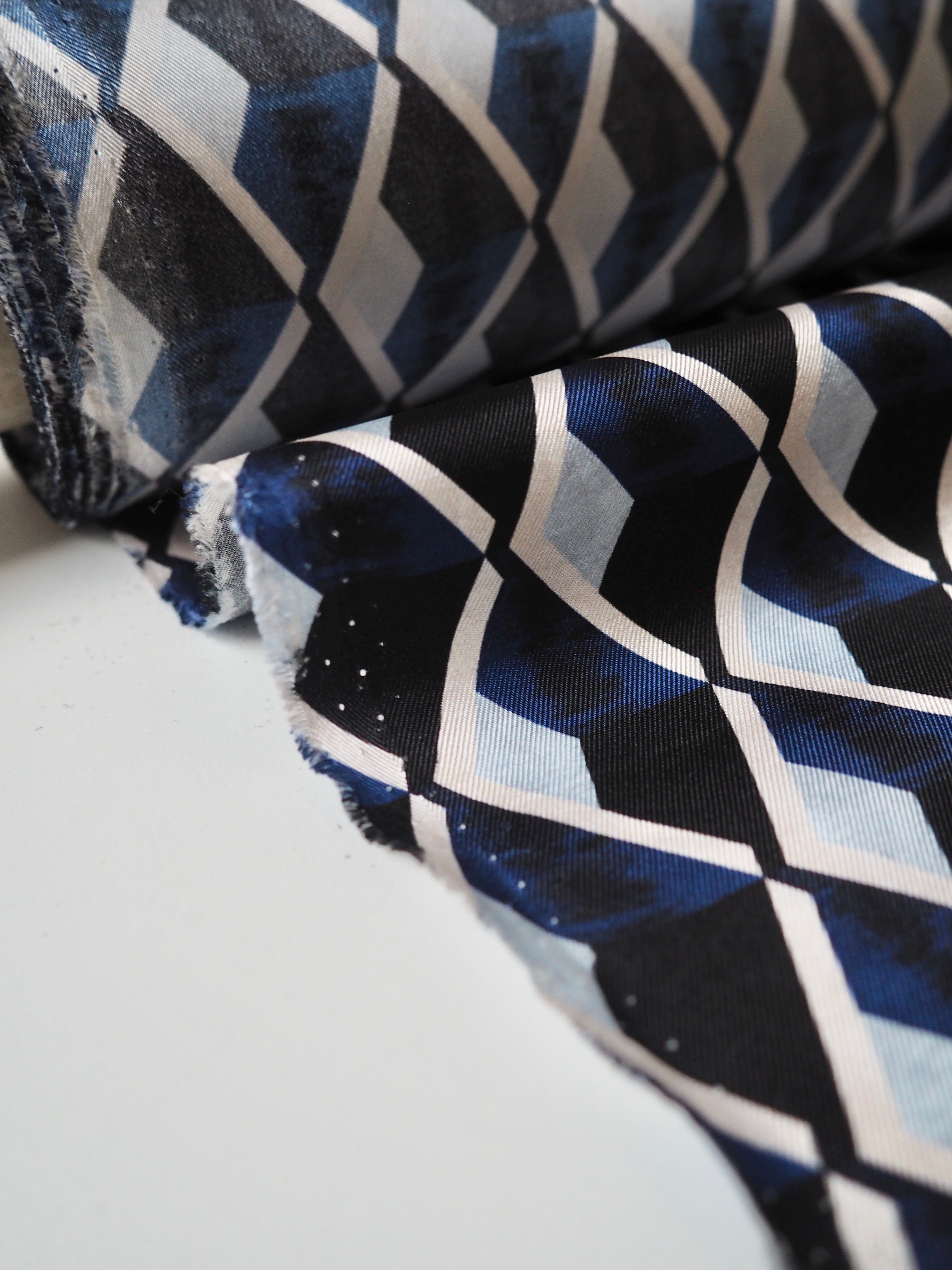 This ex-designer fabric is a silk twill. It's in a lovely blue and white diamond print. It's bespoke from a London designer. It's slinky, opaque, and very soft. It has an incredible satin sheen and beautiful movement. The twill weave gives it a crisp, strong handle. The perfect drapey silk for blouses or even a special lining!