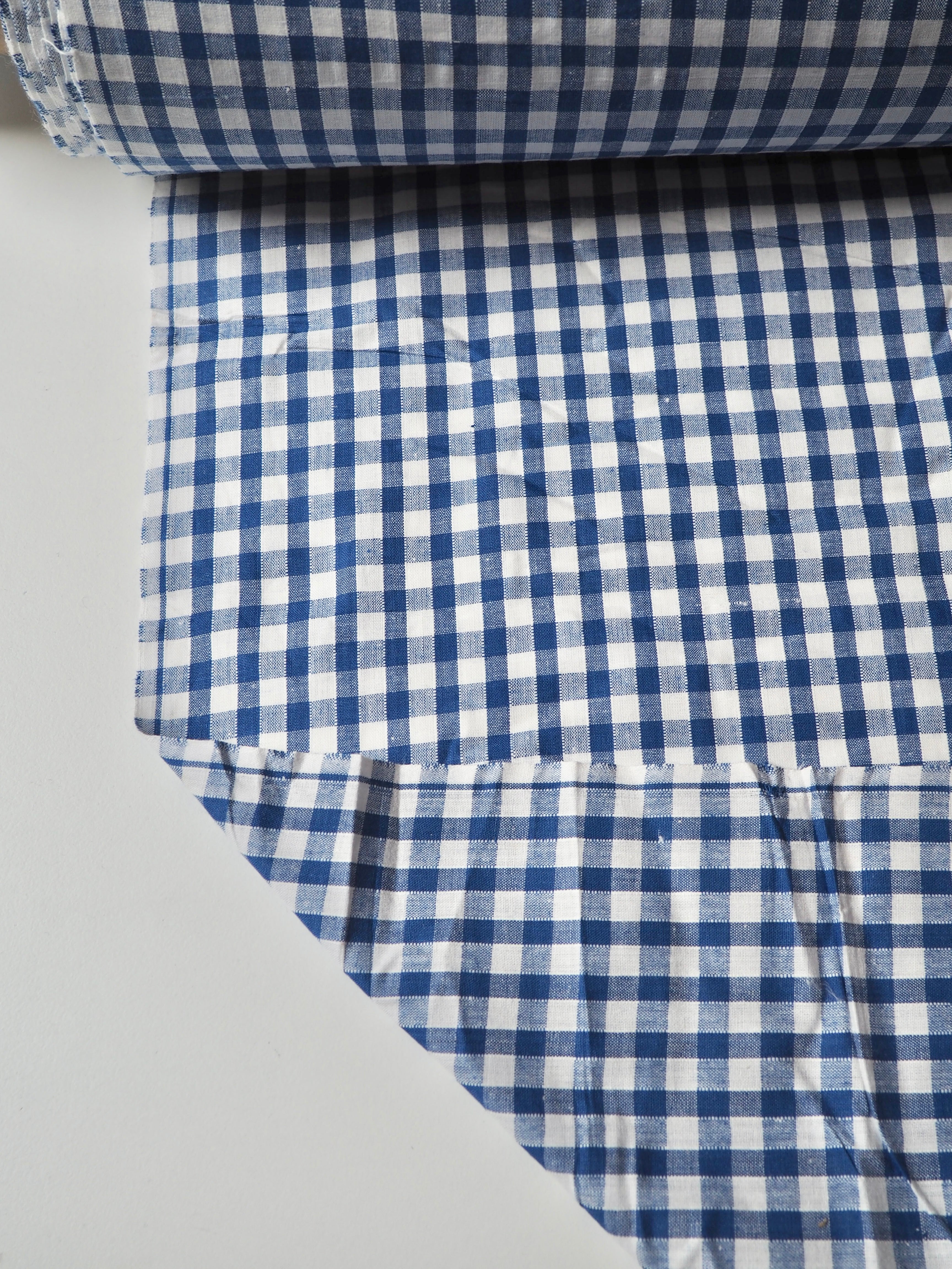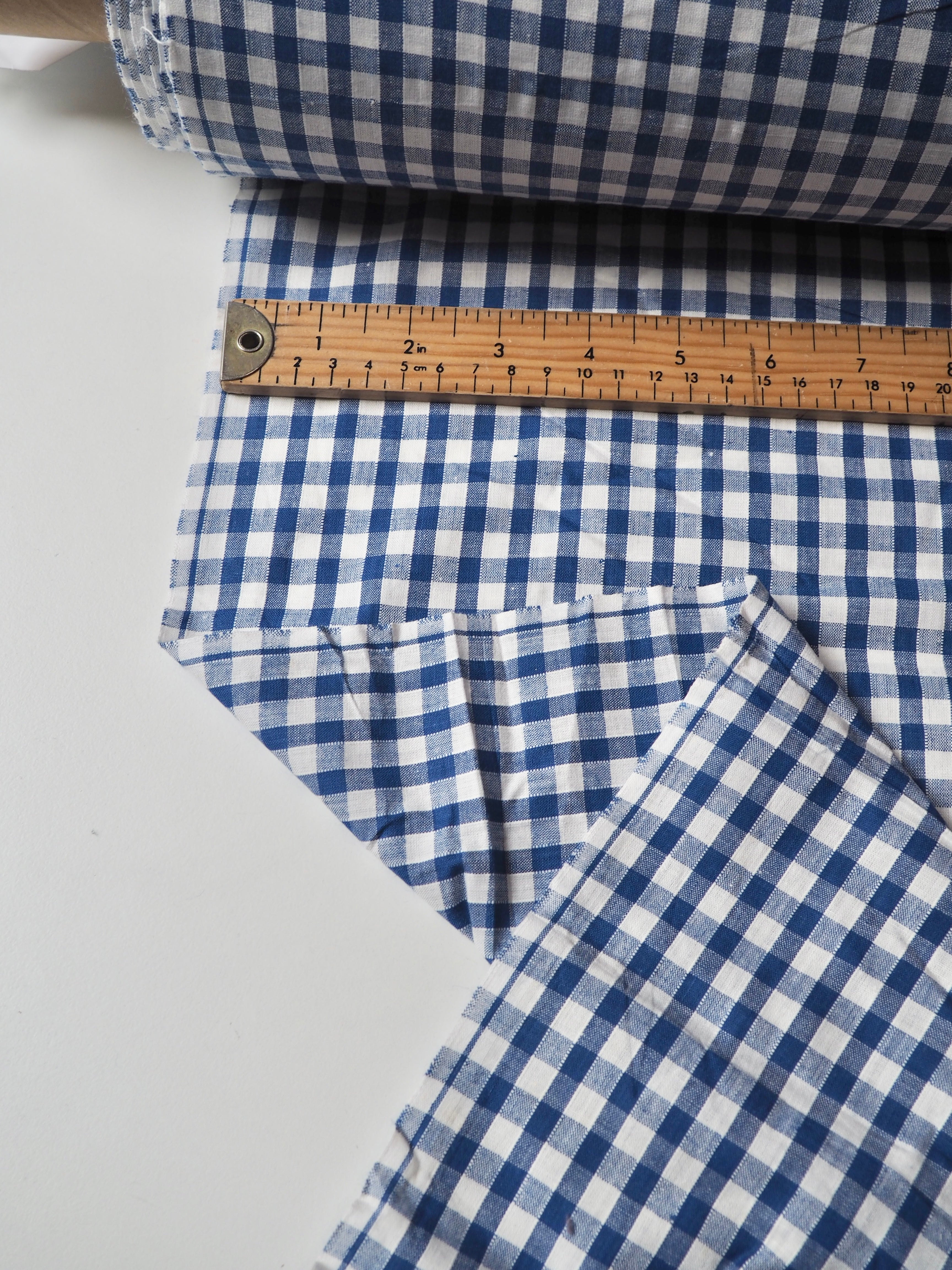 This ex-designer fabric is a cotton. It's a blue and white gingham check made in Japan. It has crisp drape and lovely soft handle. It has a sturdier weave that is typical of Japanese cottons. Lightweight and opaque. Great for a dress or top! This would be so cute with the tie front hack of our Everyday Top!