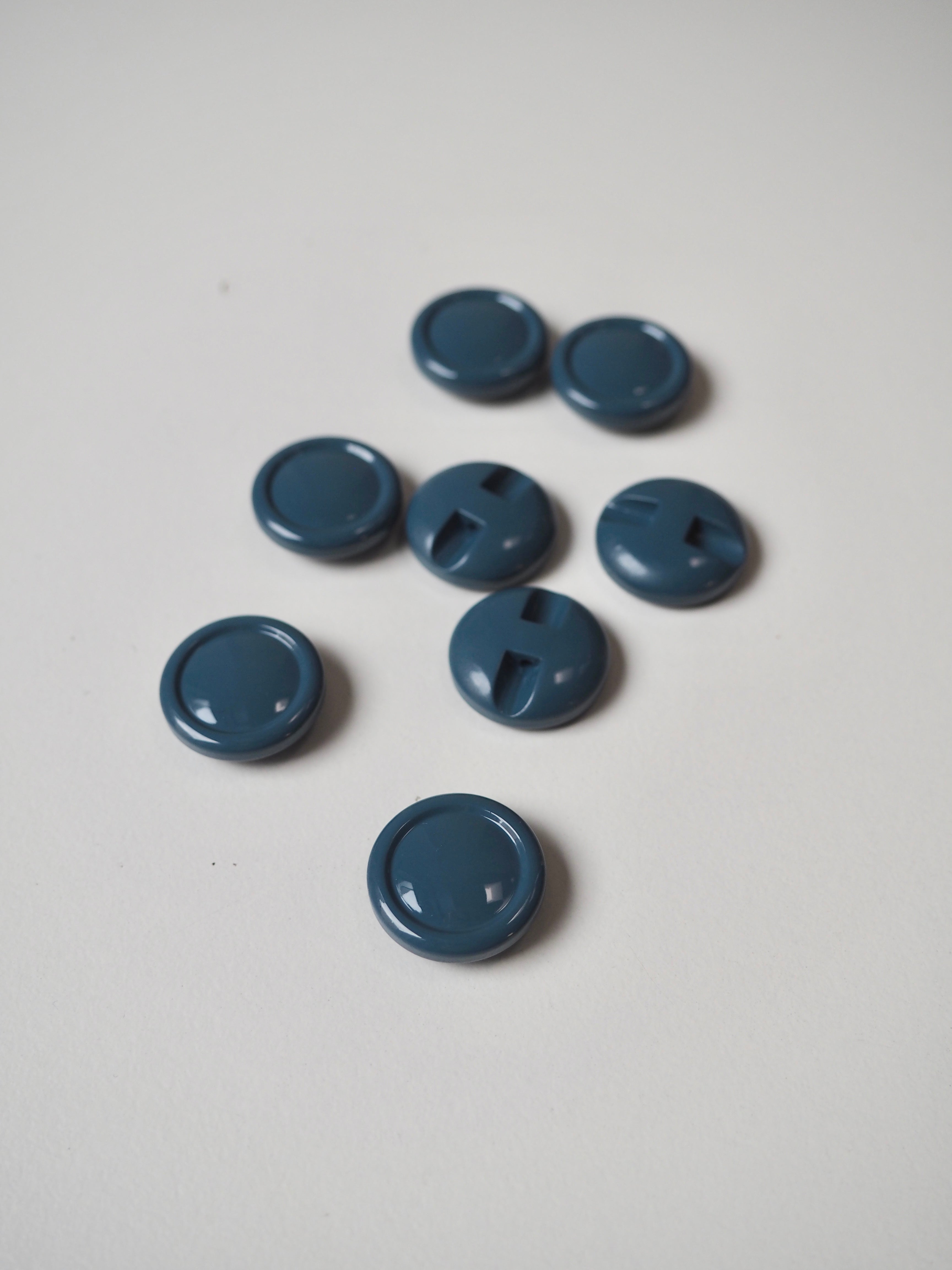 This ex-designer trim is a channel hole plastic button. They are shiny and a dark vintage cornflower faded blue colour. Perfect size for shirts and jackets.