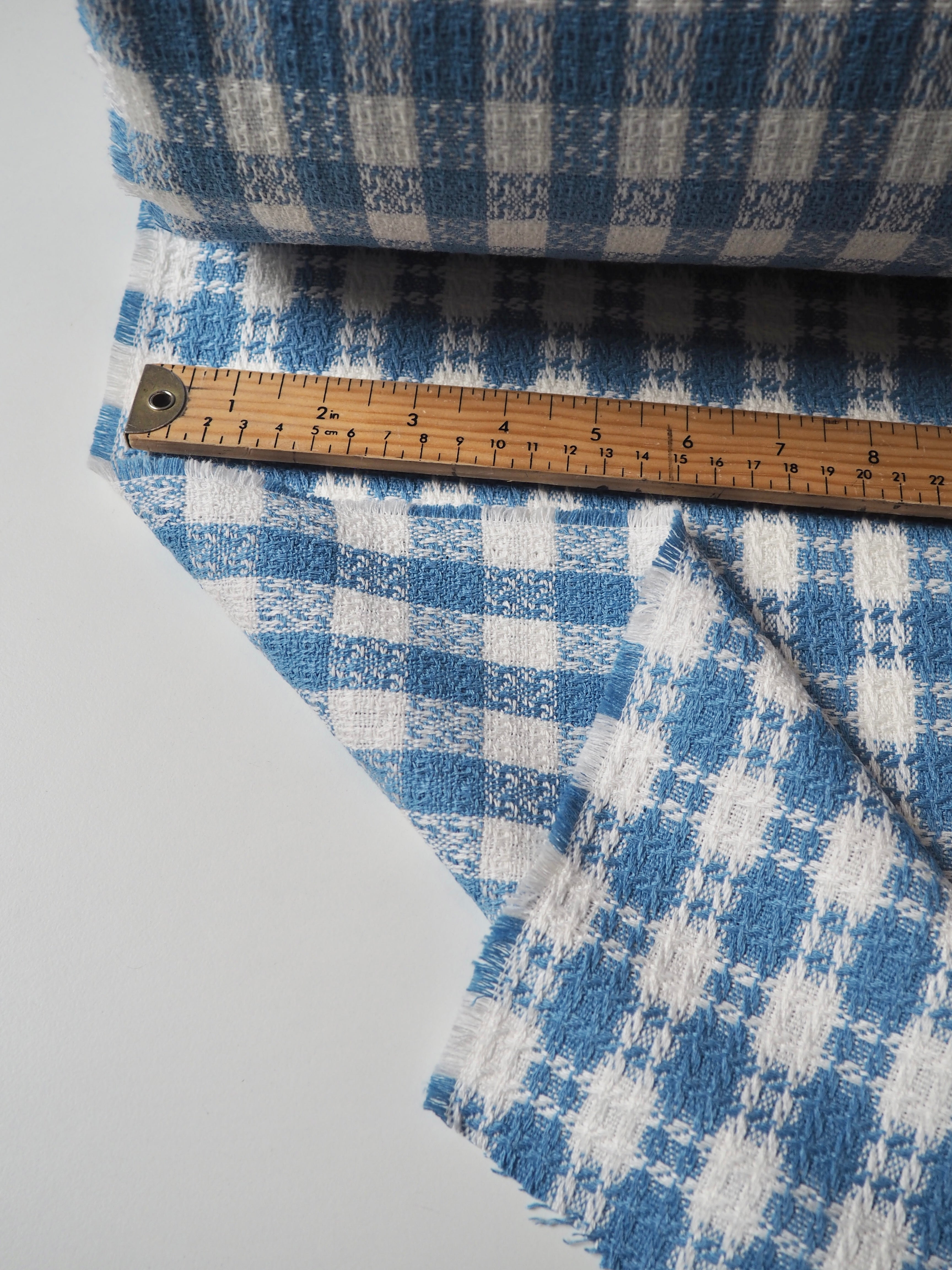 This ex-designer fabric is a jacquard. It's a blue and white gingham check, with a looser weave that still is sturdy and is very soft! It has a more pronounced textured weave on the topside, and a flatter reverse. Either side can be used!  It has a gentle structure and nice drape. Light to medium weight, with a lovely handle that feels like a blanket! Great for a light jacket that could be interfaced, or even a co-ord set!