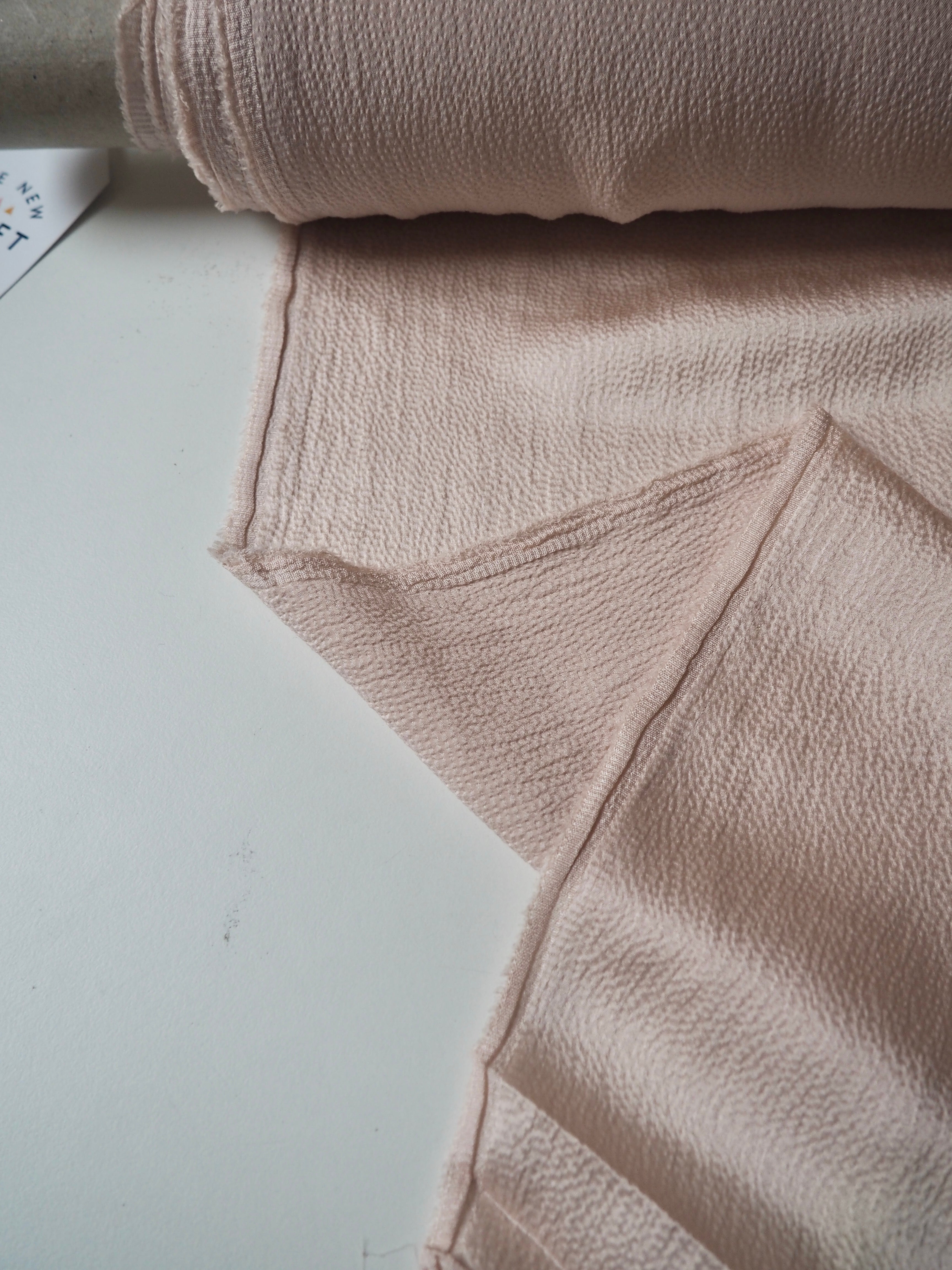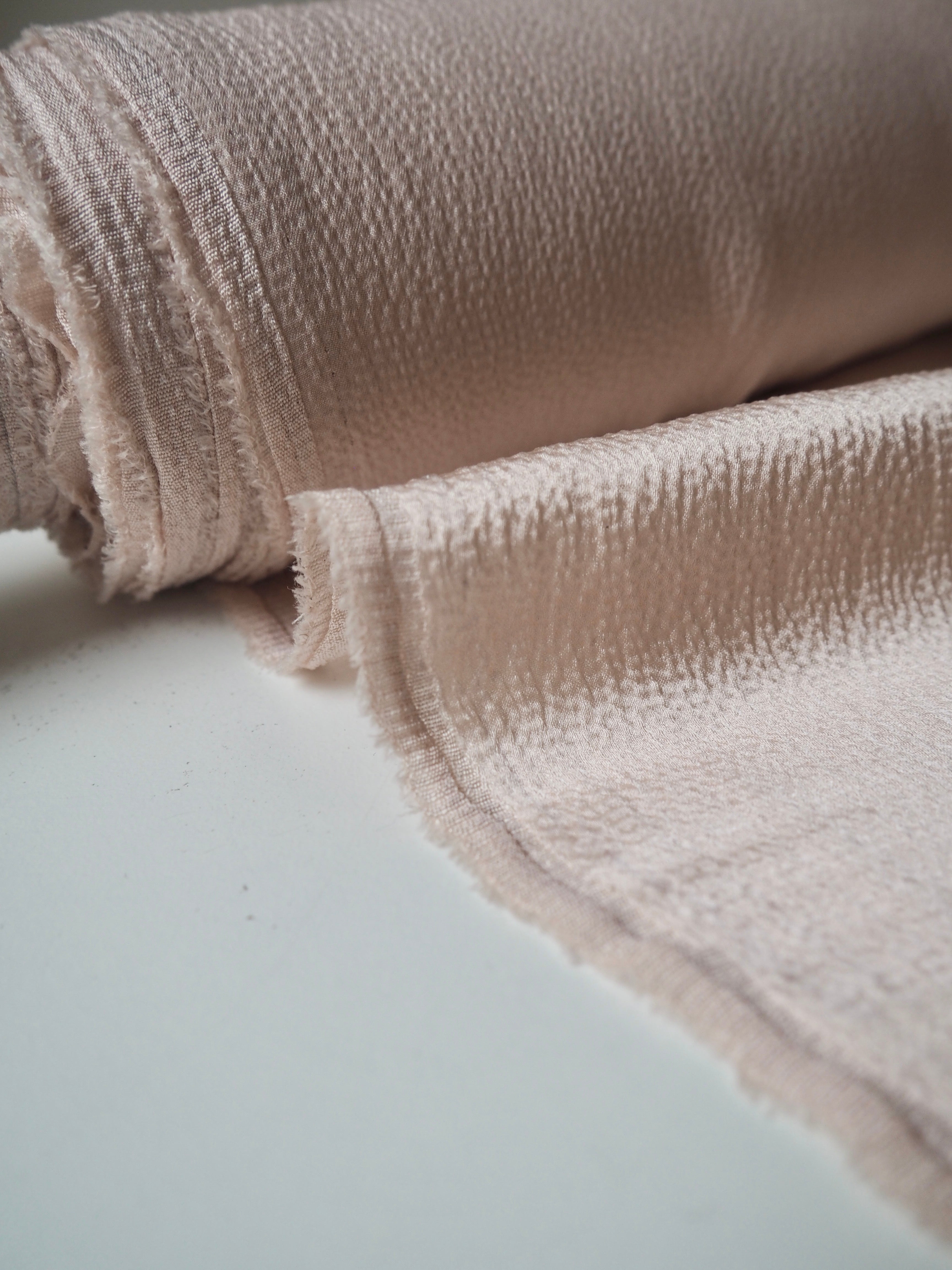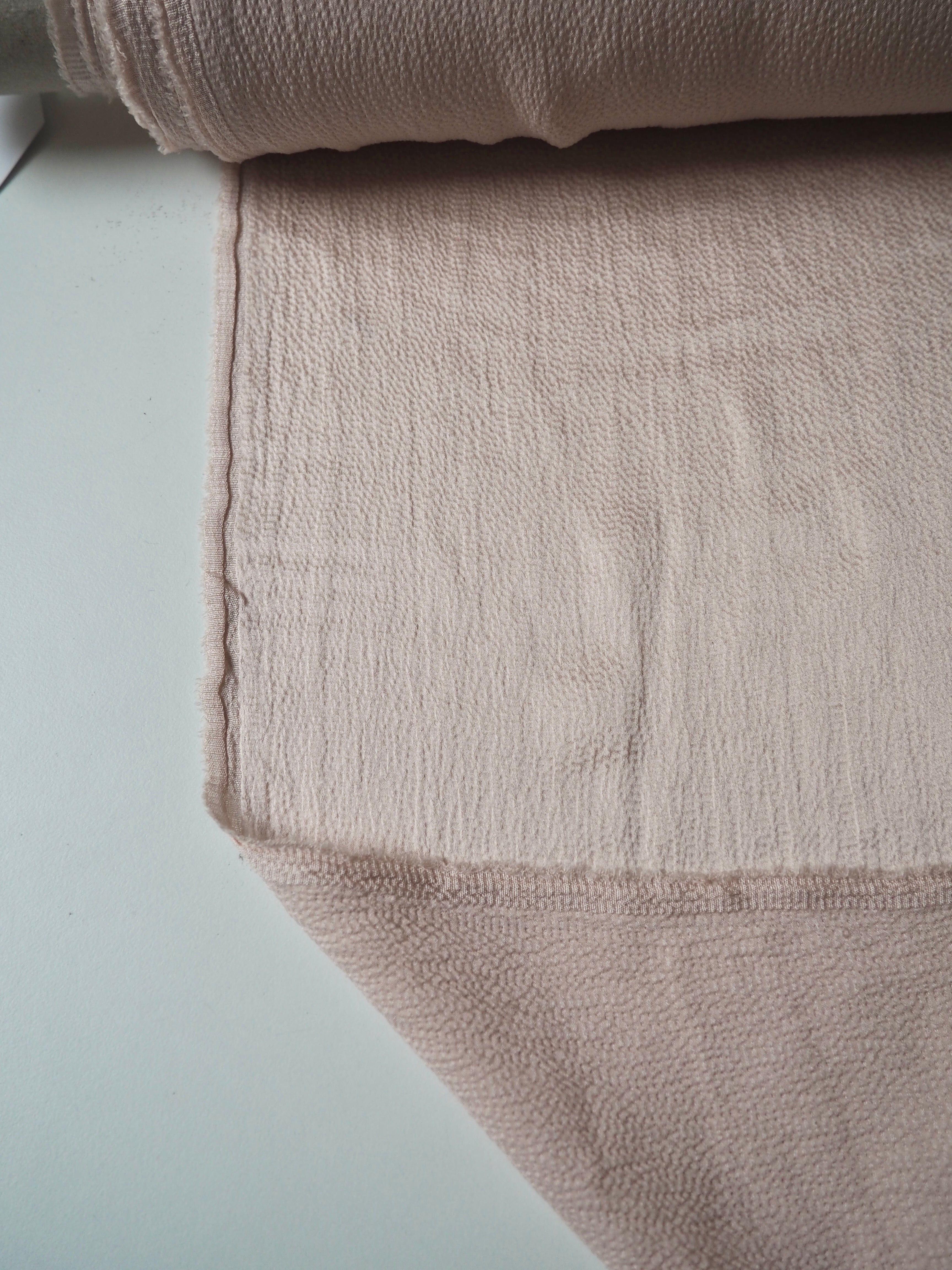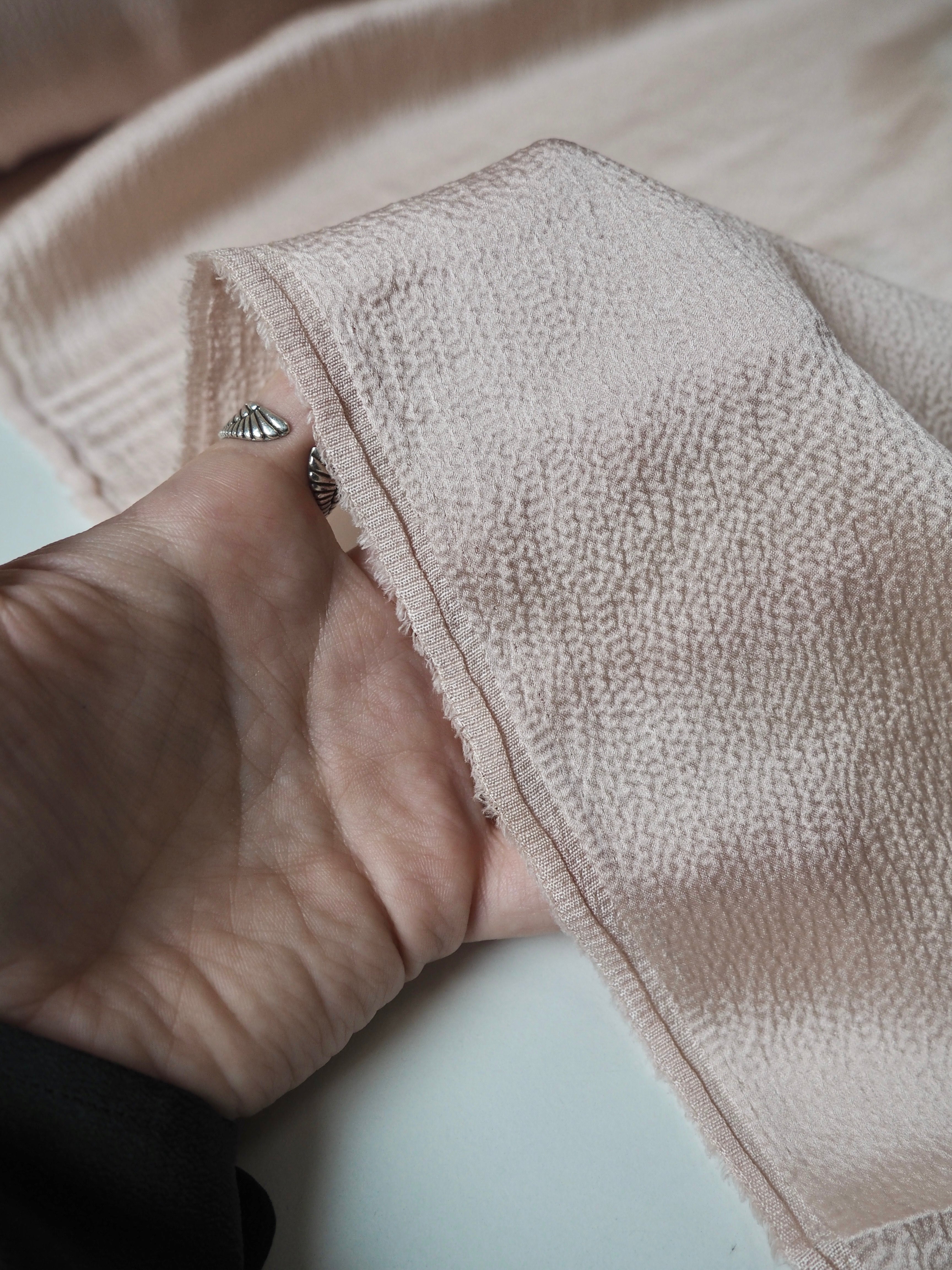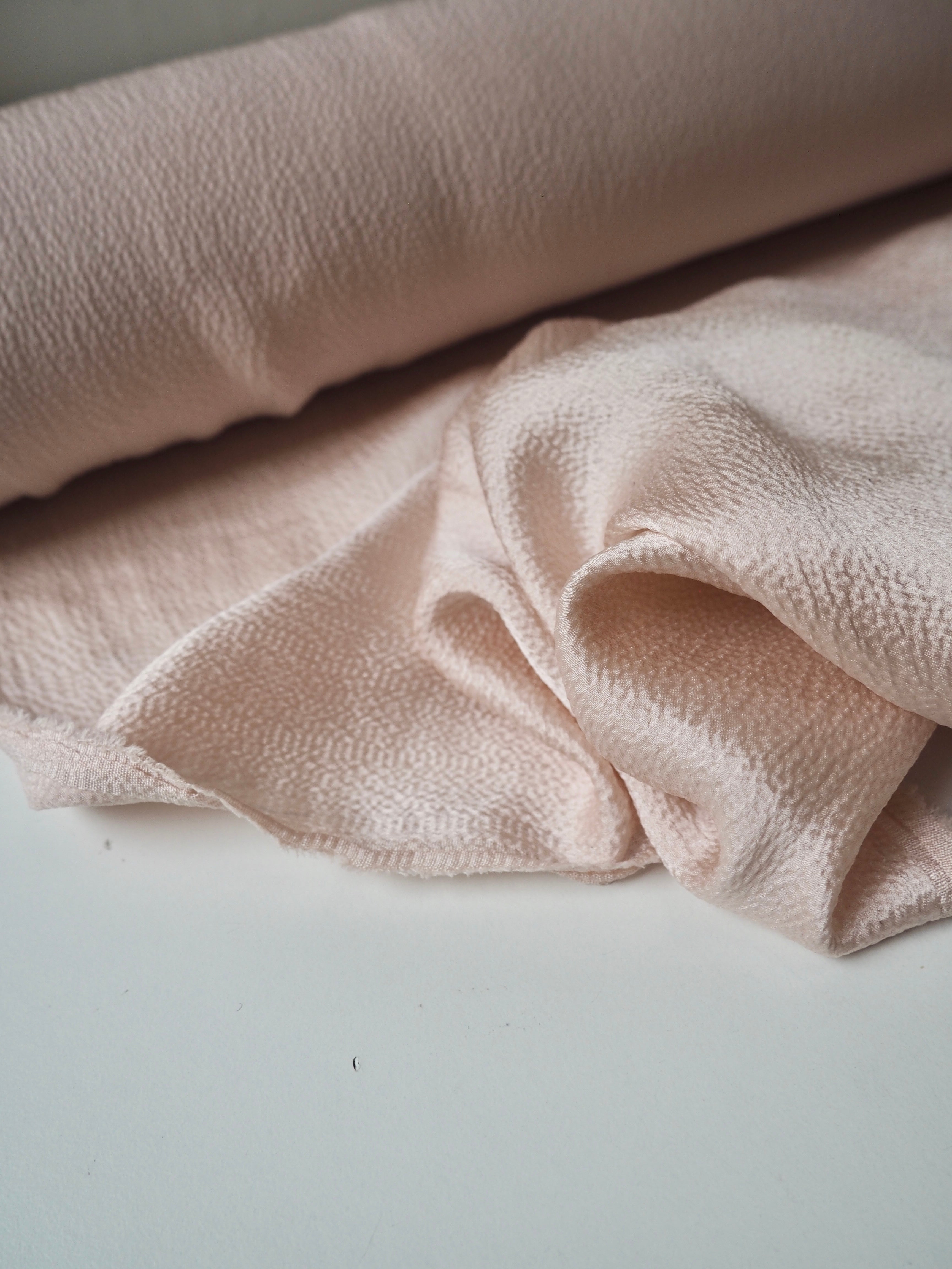 This ex-designer fabric is a hammered silk. It's lightweight and hangs beautifully! The hammered finish gives it an eye-catching texture, and it has a lovely medium sheen. Wonderful movement, and so soft and silky against the skin! Fantastic handle and fully opaque. It would make a beautiful Everyday Dress/Top!