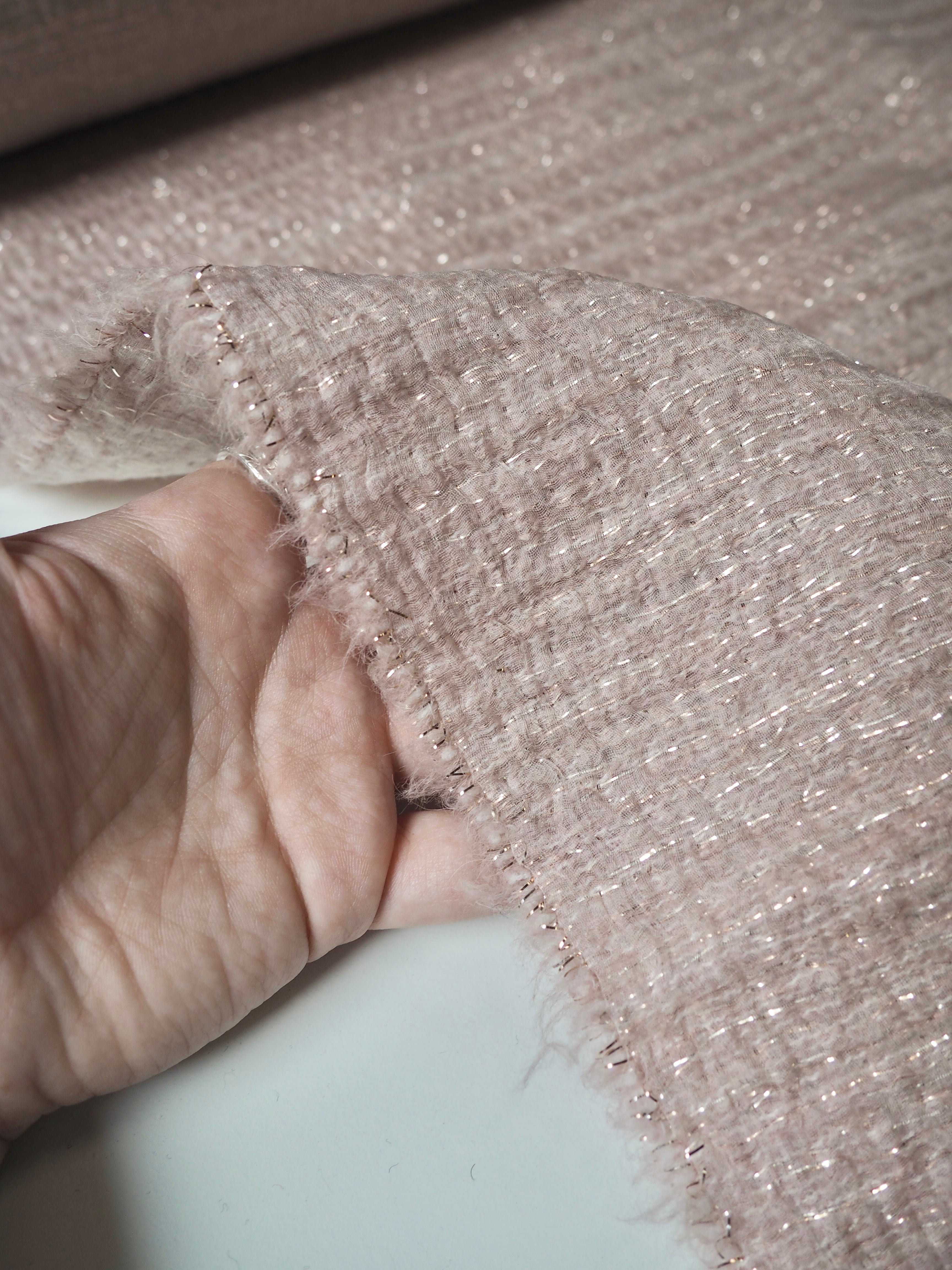 This ex-designer fabric is a unique cloth. Two silk organza's sandwich lurex and wool blend threads into this very soft and interesting coating. It's a little sheer, but still warm and catches the light beautifully. It has a very luxurious visual texture and lovely plush handle. It's quite lightweight and has a gentle structure that could create a great volume. Could make super cool unlined or lined jacket or even circle skirt!