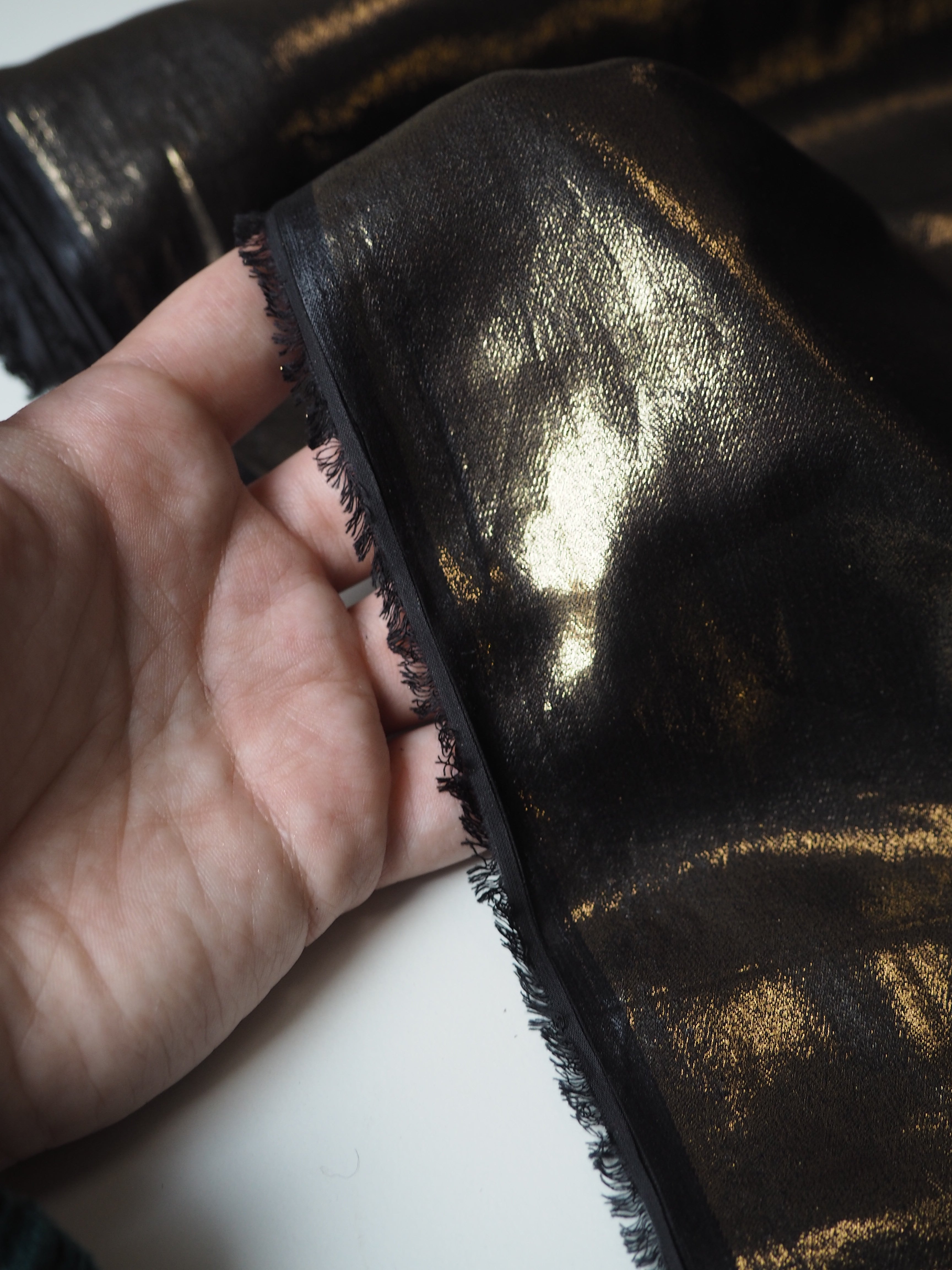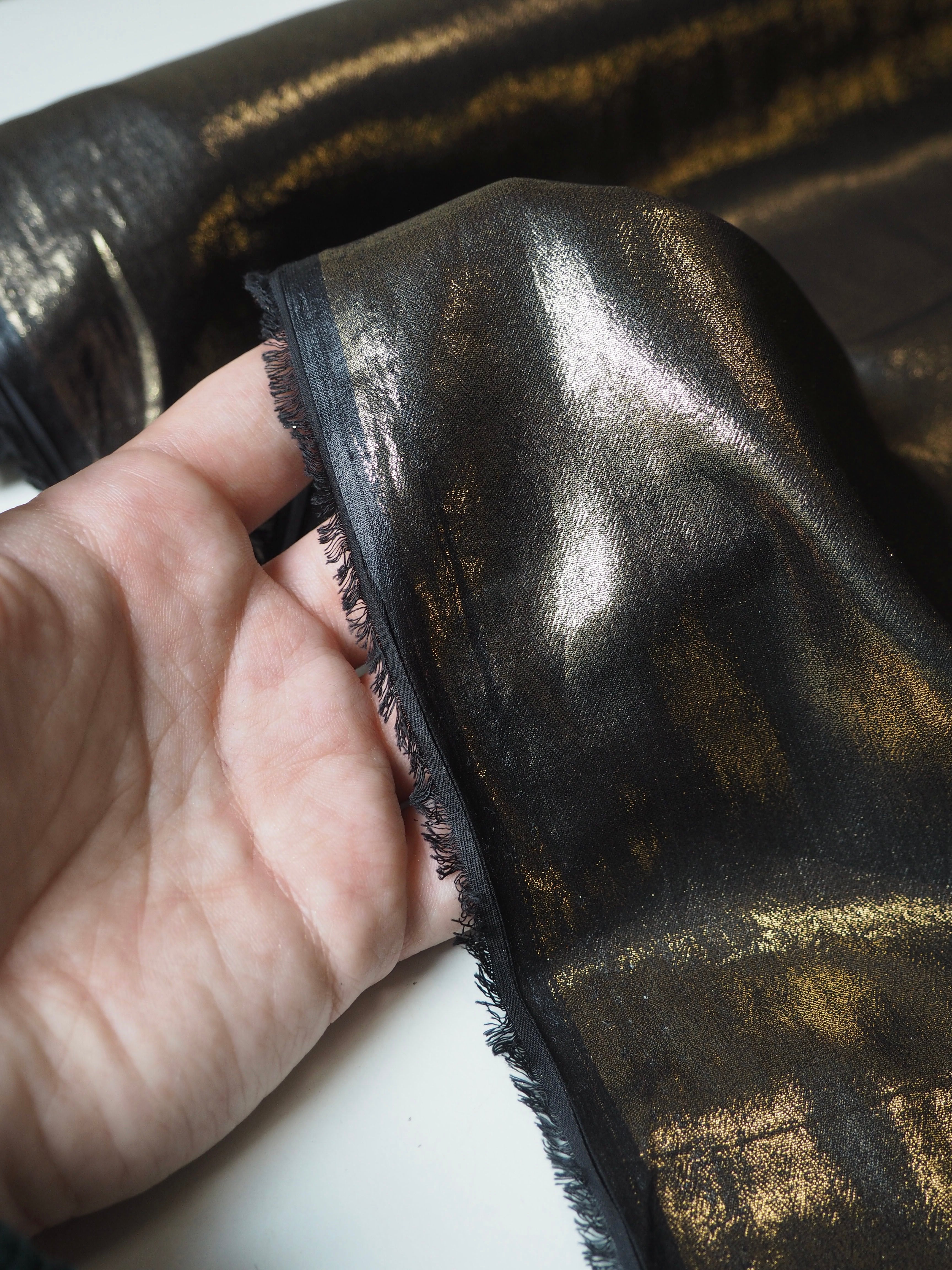 This ex-designer fabric is a shimmery chiffon. It has a beautiful bronze foiled metallic finish on the topside that catches light beautifully. Foiled onto a black chiffon, and semi-sheer. Has a smooth handle. Super light and airy, and perfect for a stunner dress overlay or floaty shawl!