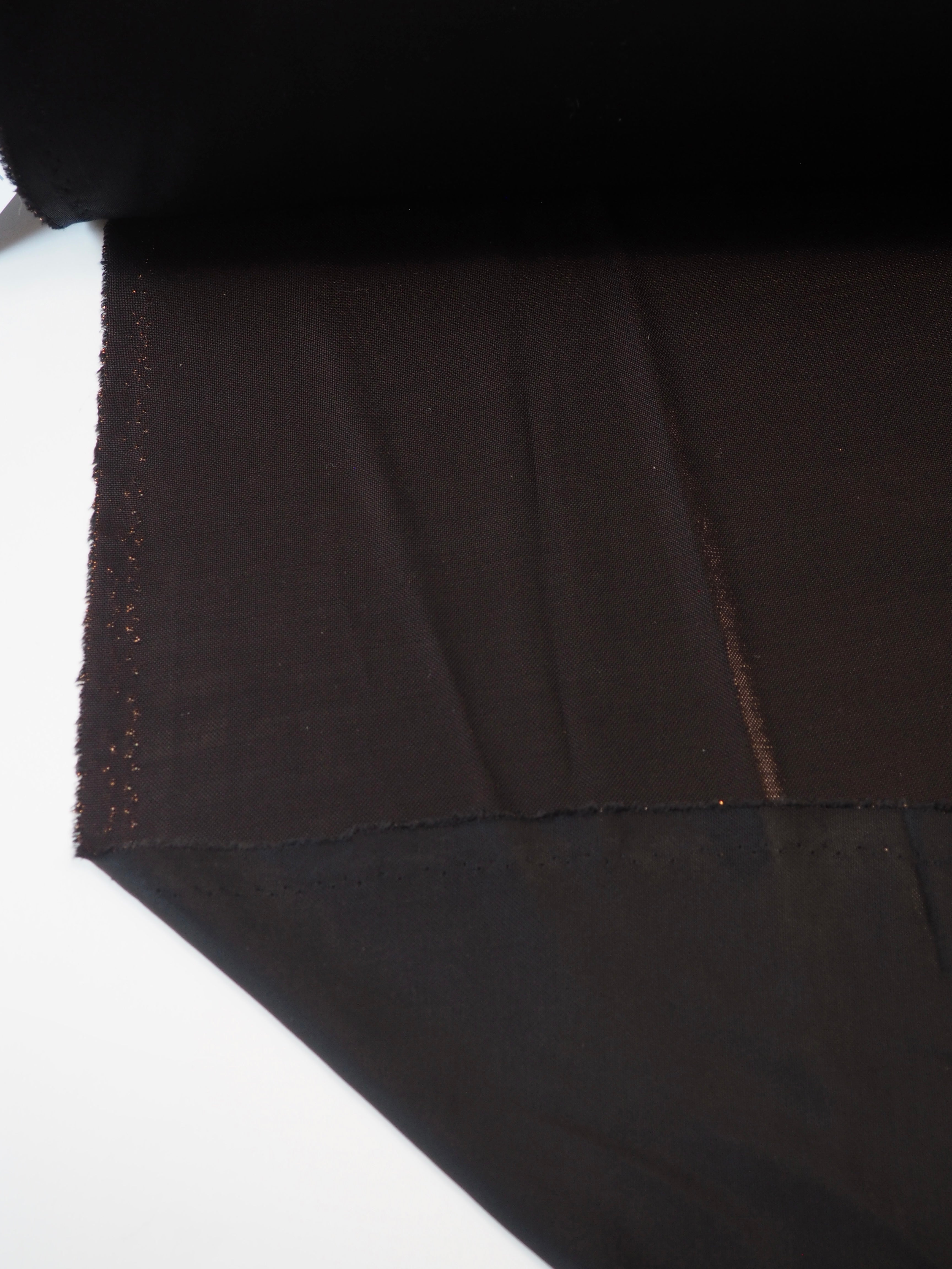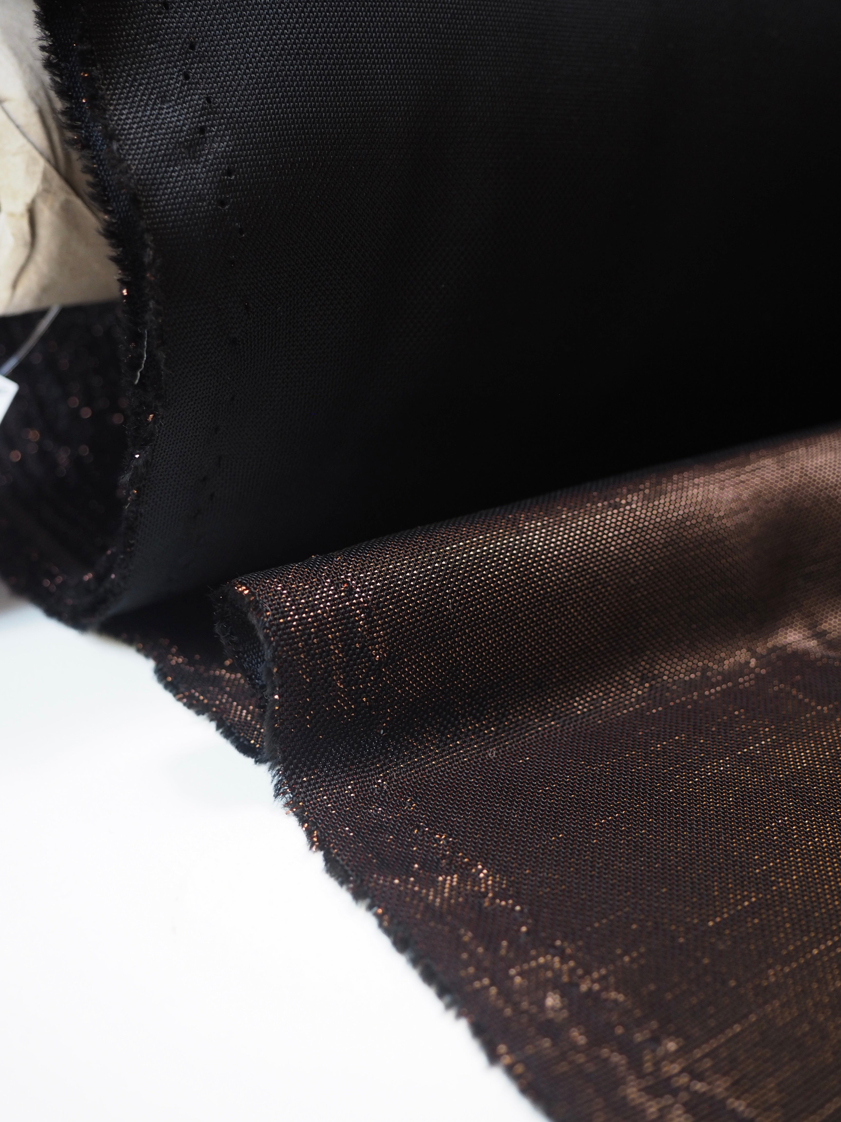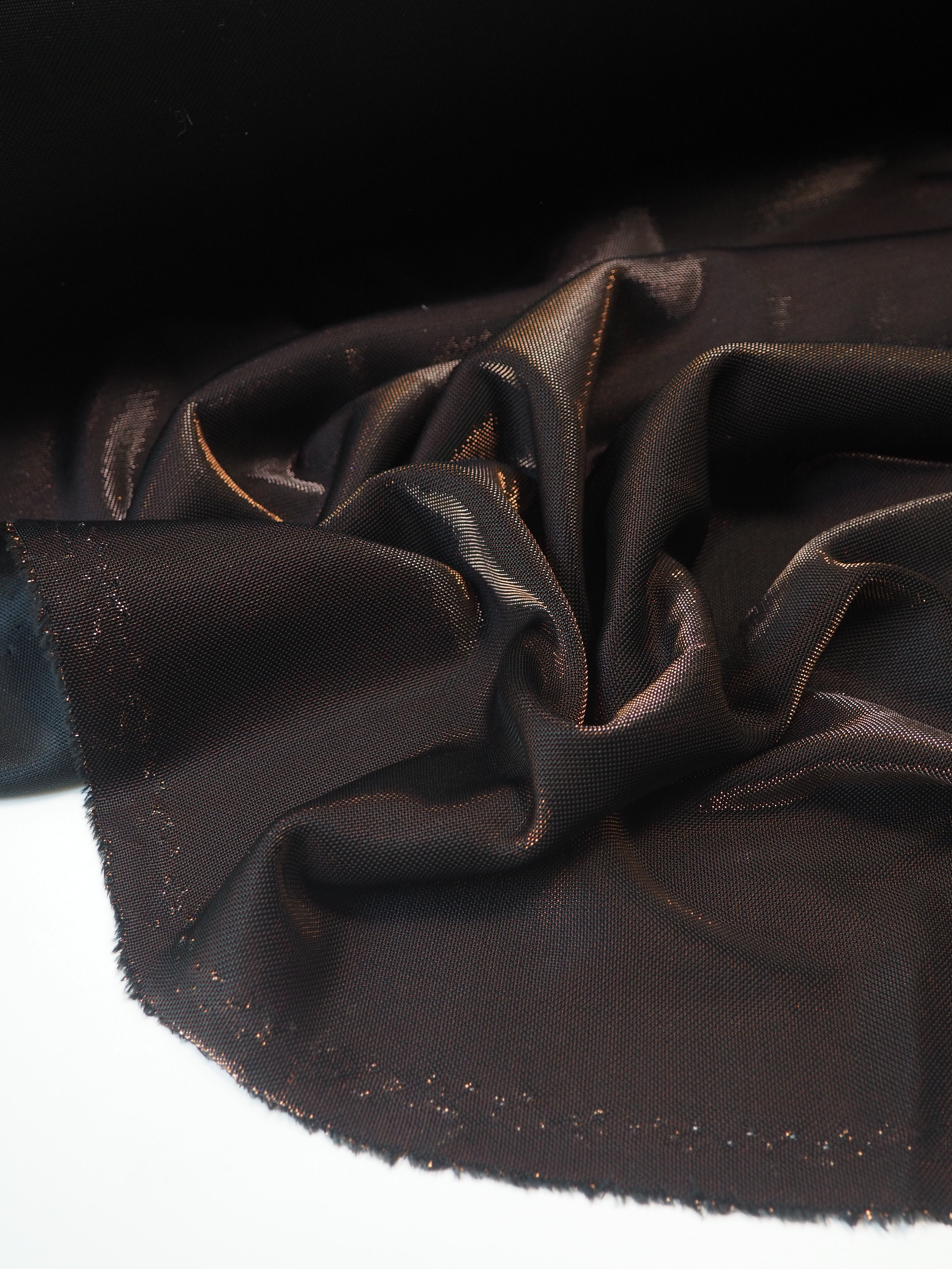 This ex-designer fabric is a unique jersey. This eye-catching jersey has a black base offset with bronze metallic threads. It has a great 20% widths-way stretch. Light to medium weight, with a great drape, and a comfortable, slinky handle. Is quite bouncy and so fun! It shifts in the light very well, its hard to capture in photographs! Would make the perfect party dress or top!