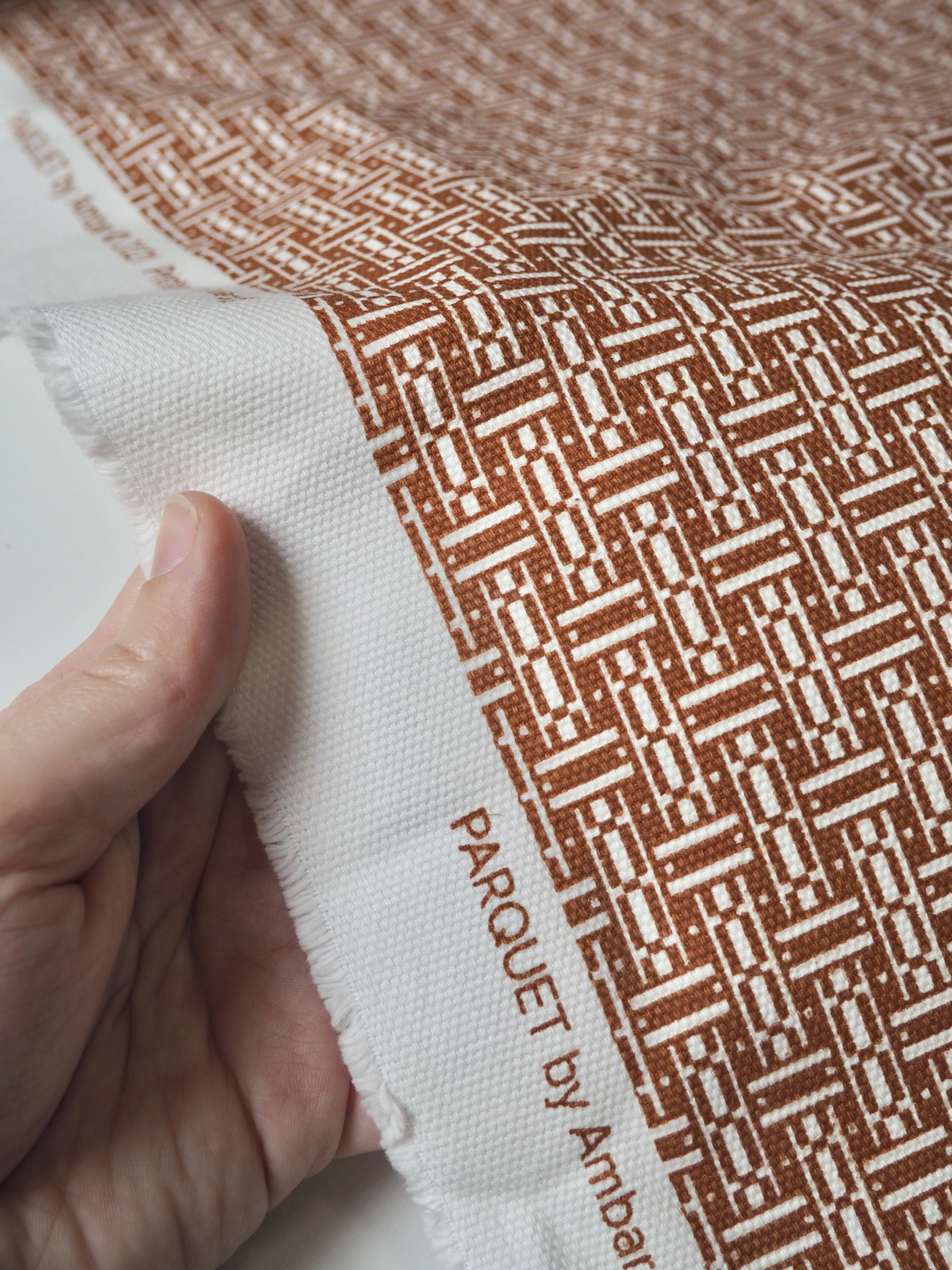 This ex-designer fabric is a cotton canvas. It's in a parquet floor-esque print in brown and white on this medium weight cotton canvas. It's a bespoke print from the designer. Has a great structure and pronounced plain canvas weave. Sturdy and lovely quality, in a typical cotton handle. Perfect for jackets, heavier-wearing trousers, totes, and even outdoor cushions!